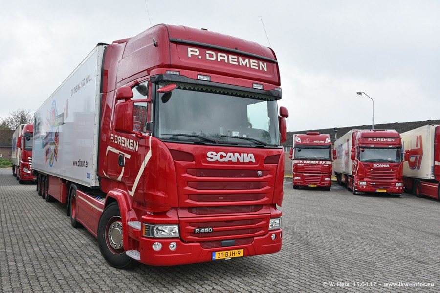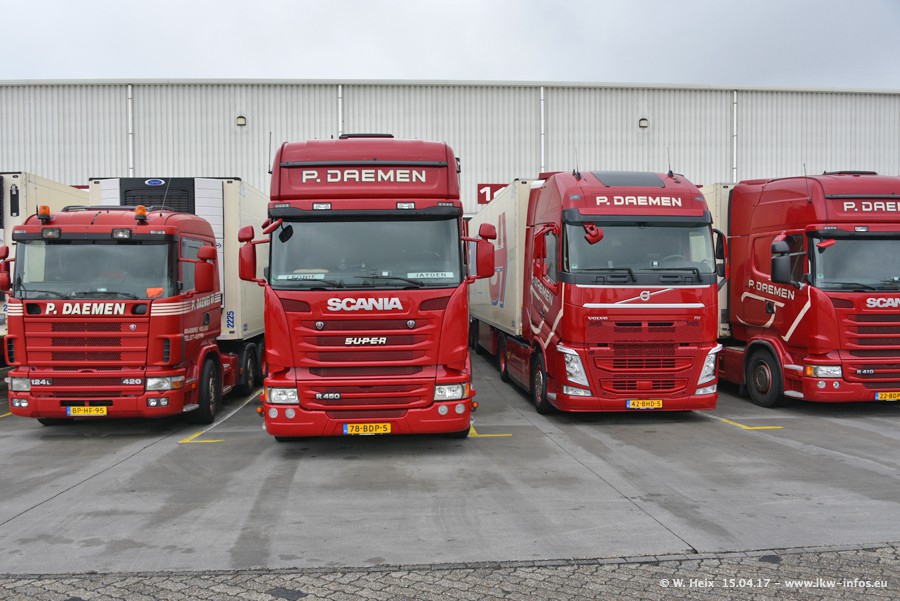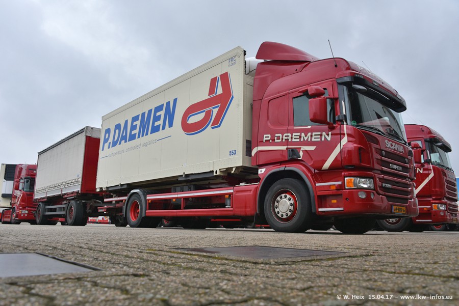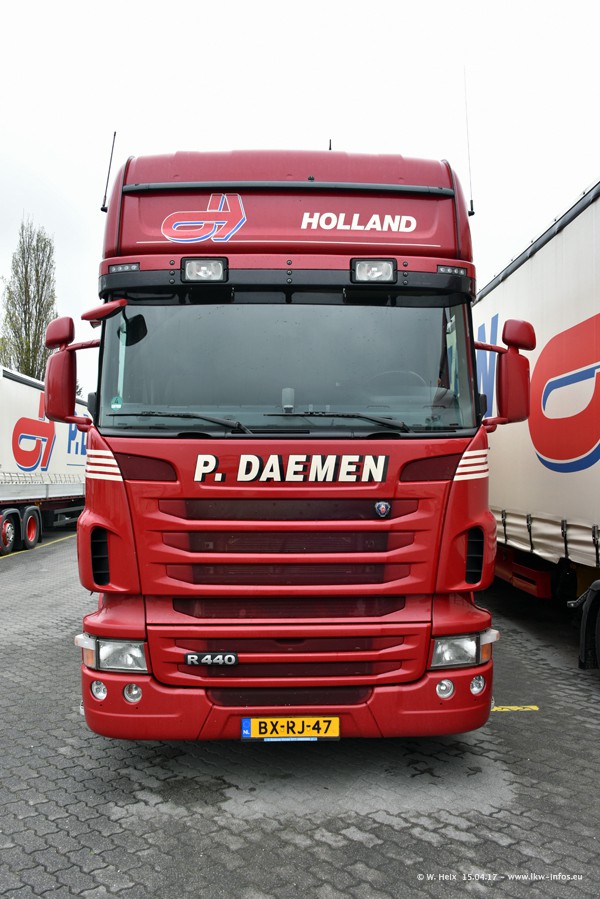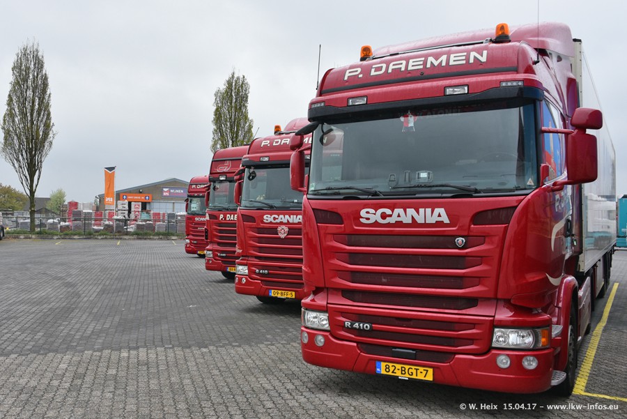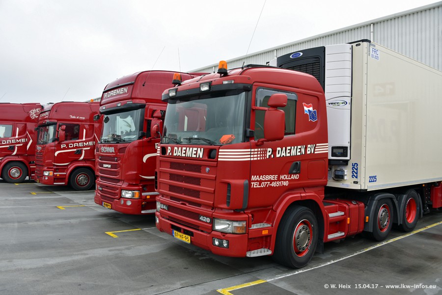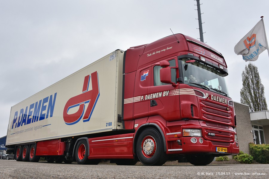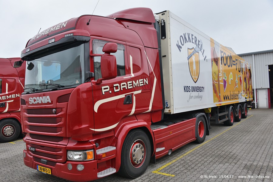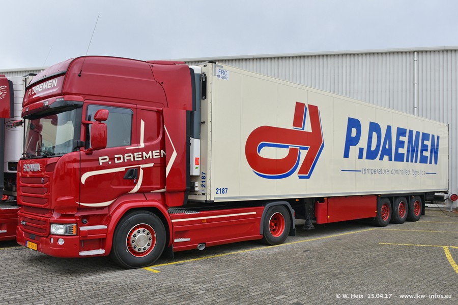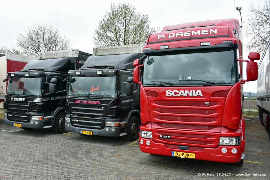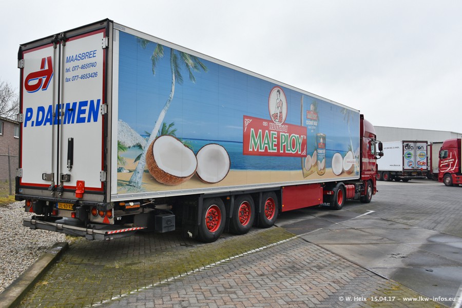 In den letzten Wochen wurde der Furhpark bei Daemen weiter modernisiert. Neu sind zwei DAF XF Euro 6 und mehrere Scania R 410 und R 450 Streamline (alte Baureihe). Und ich konnte einen neuen Auflieger entdecken, der wieder im Design eines Kunden gestaltet ist. Alle neuen Zugmaschinen sind an denn Kennzeichen mit den Buchstabenkombinationen "BJ" zu erkennen.