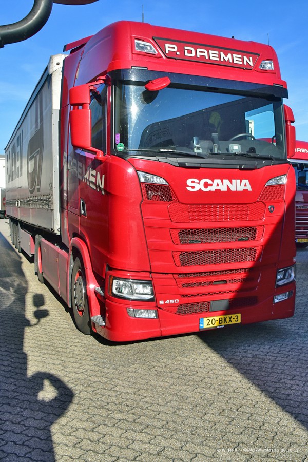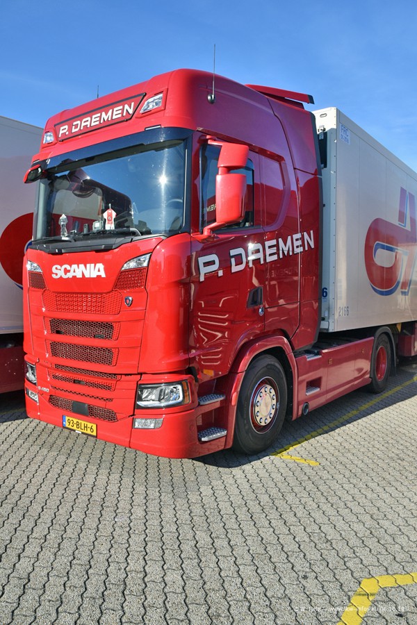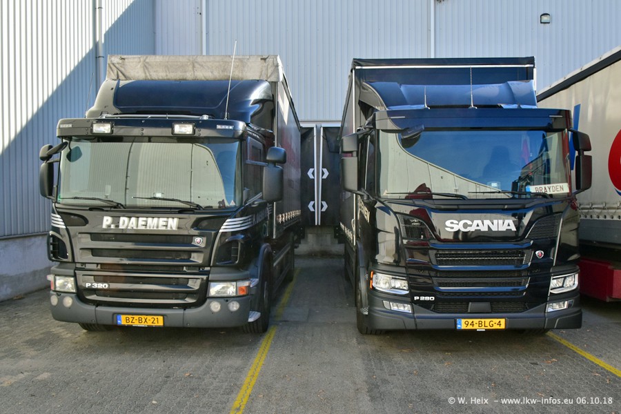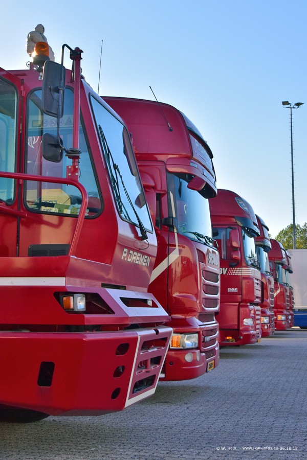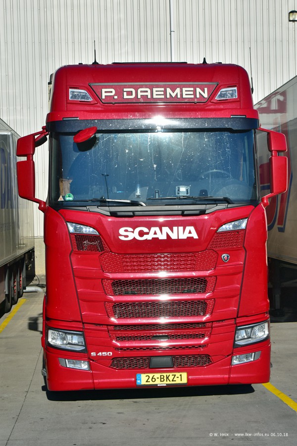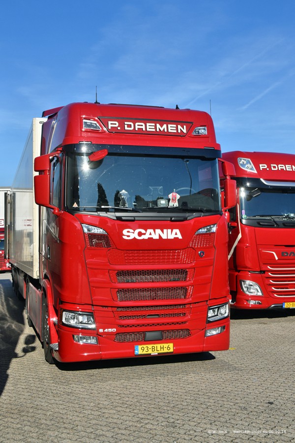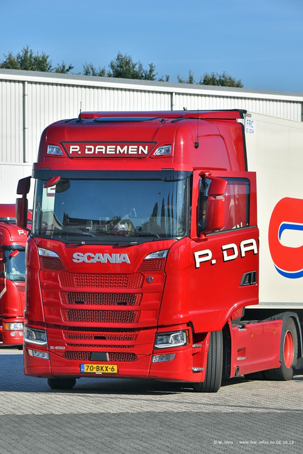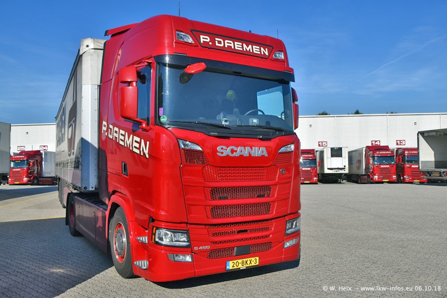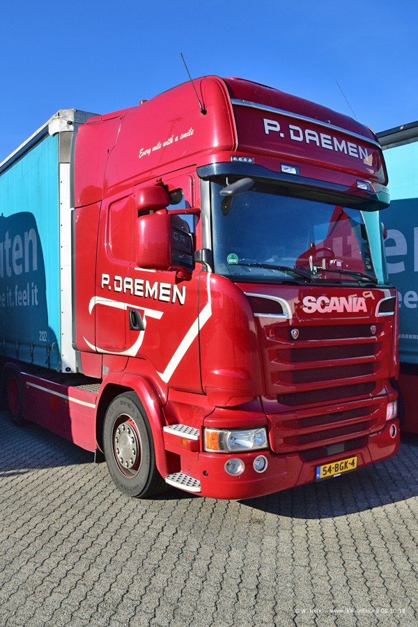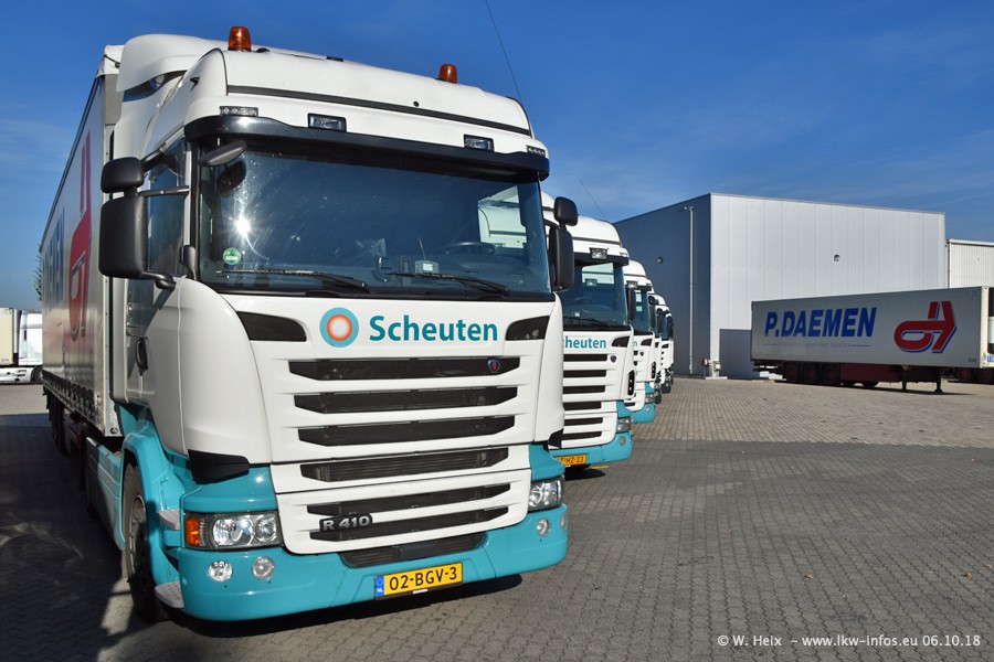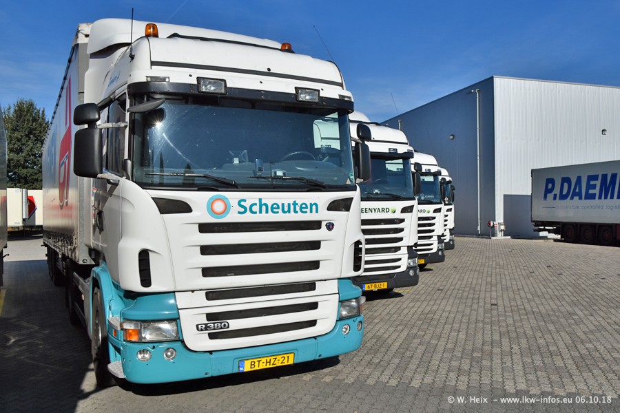 Inzwischen gibt es mehrere neue SCANIA S NextGen, einen schwarznen SCANIA P 280 NextGen und einige neue DAF New XF Euro 6. Bei diesem Besuch war ein sehr großer Teil der LKW zuhause und somit konnte ich auch viele der neuen DAF und SCANIA fotografieren. Die sechs SCANIA R 410 Streamline sind inzwischen auch fertig beschriftet (Greenyard). Diesmal habe ich die Bilder sortiert nach P. Daemen, Greenyard und Scheuten.