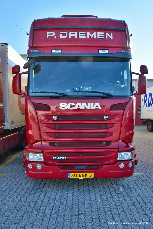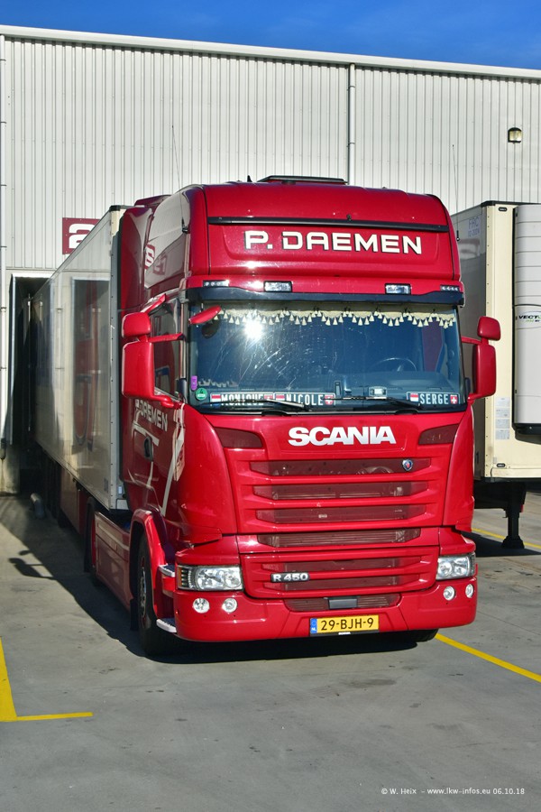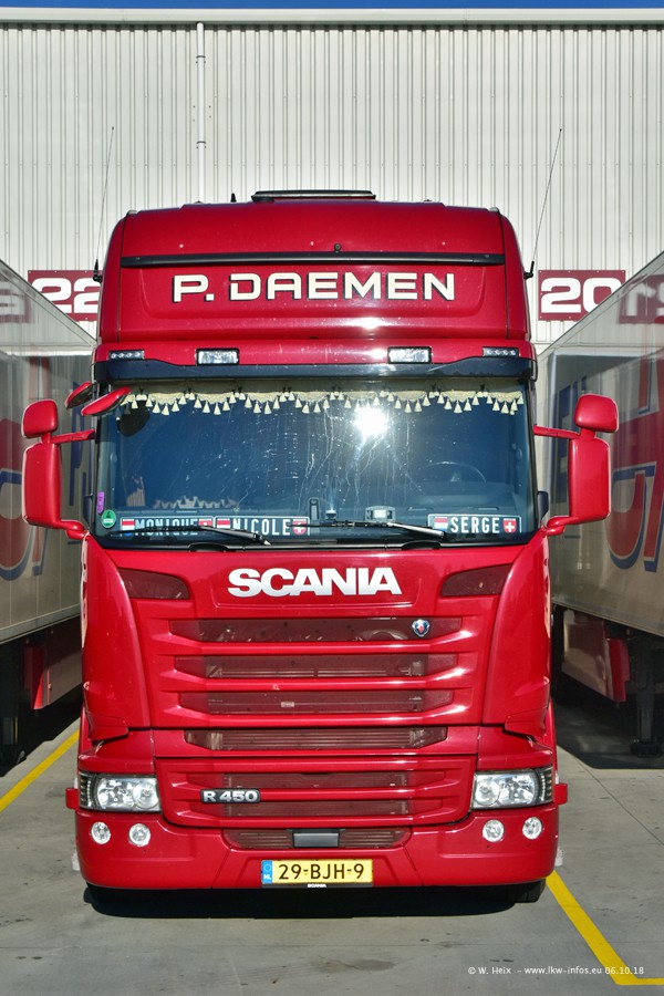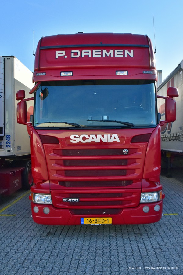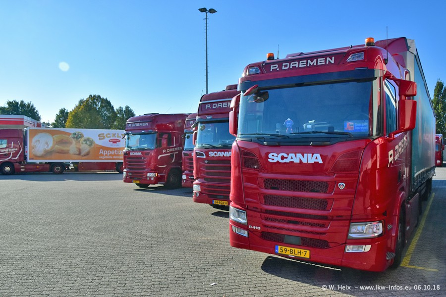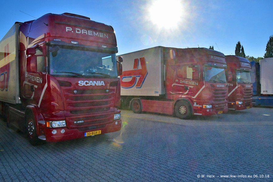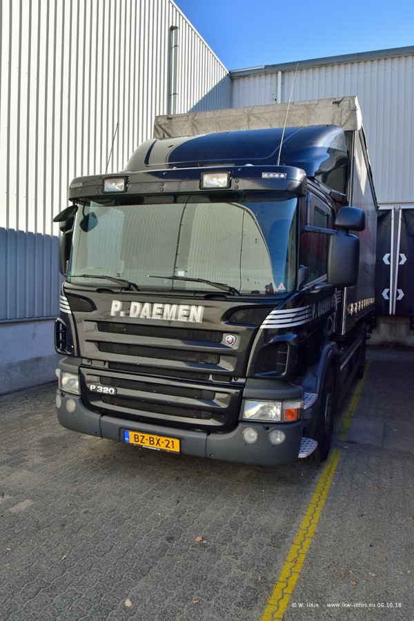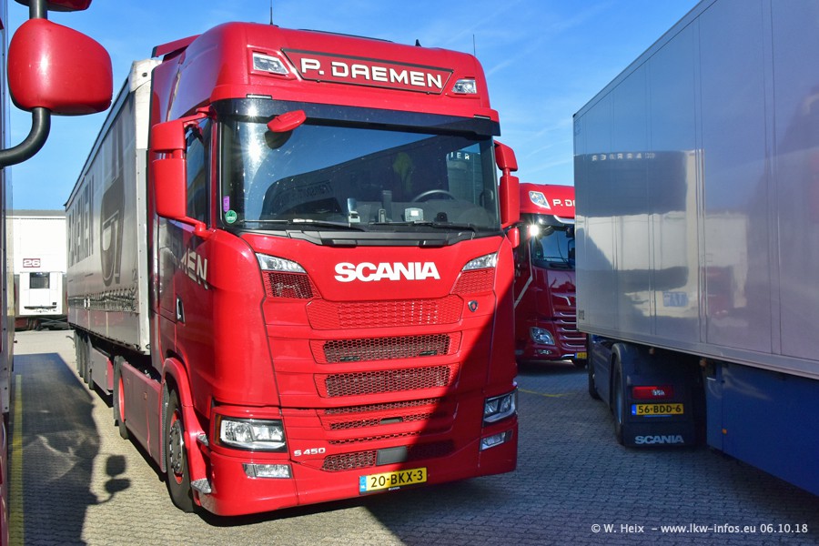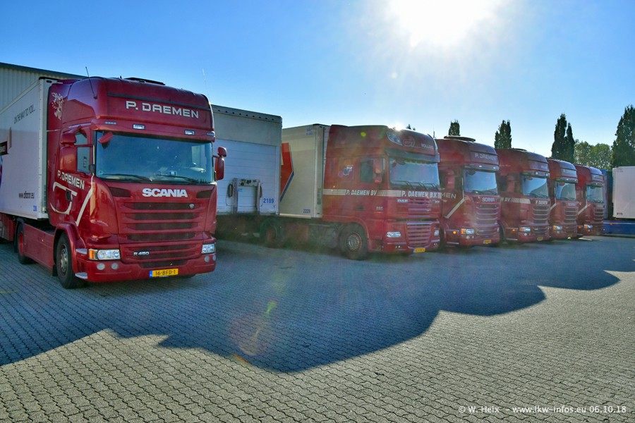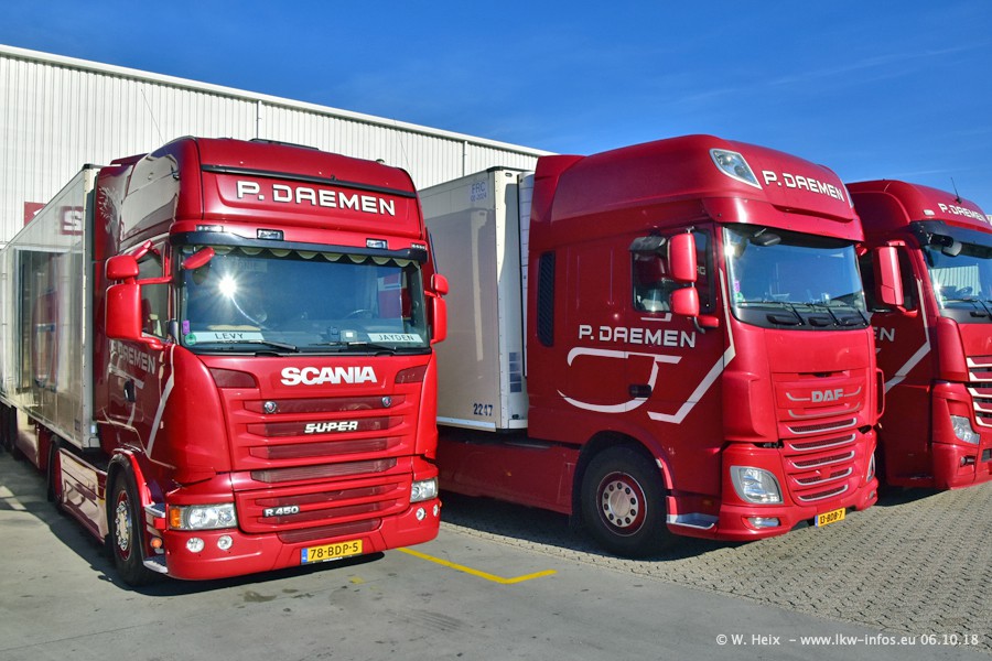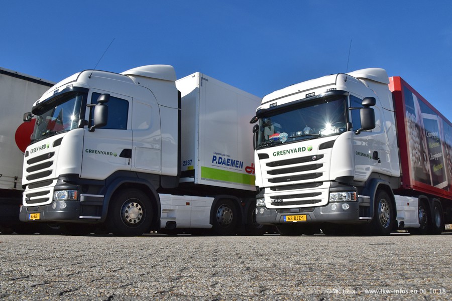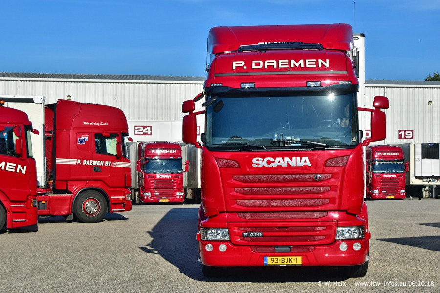 Inzwischen gibt es mehrere neue SCANIA S NextGen, einen schwarznen SCANIA P 280 NextGen und einige neue DAF New XF Euro 6. Bei diesem Besuch war ein sehr großer Teil der LKW zuhause und somit konnte ich auch viele der neuen DAF und SCANIA fotografieren. Die sechs SCANIA R 410 Streamline sind inzwischen auch fertig beschriftet (Greenyard). Diesmal habe ich die Bilder sortiert nach P. Daemen, Greenyard und Scheuten.