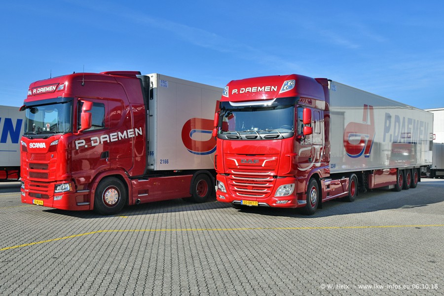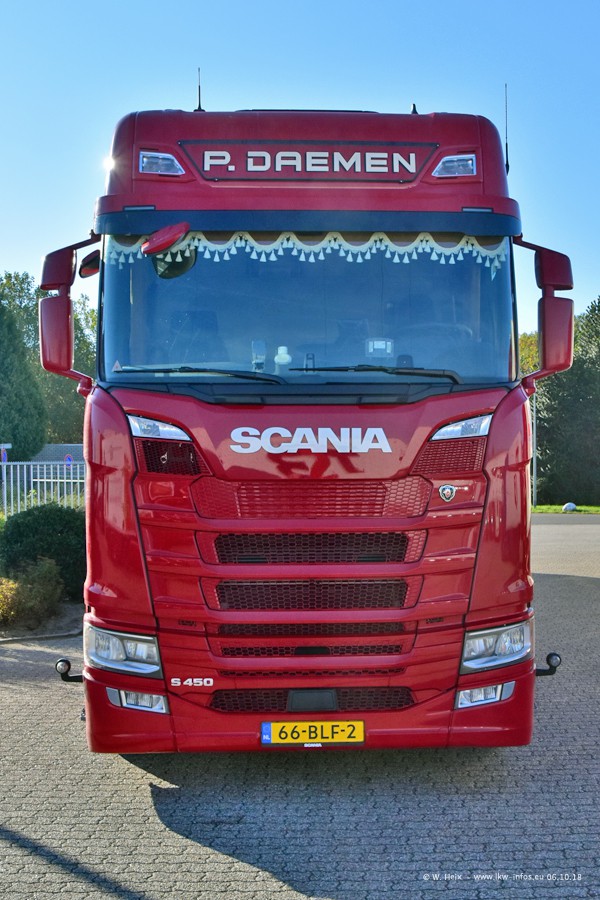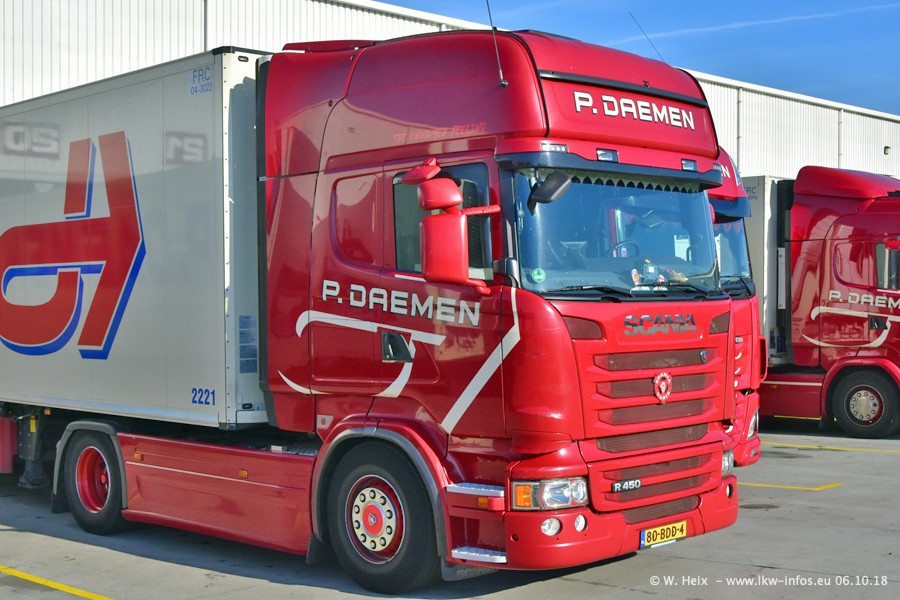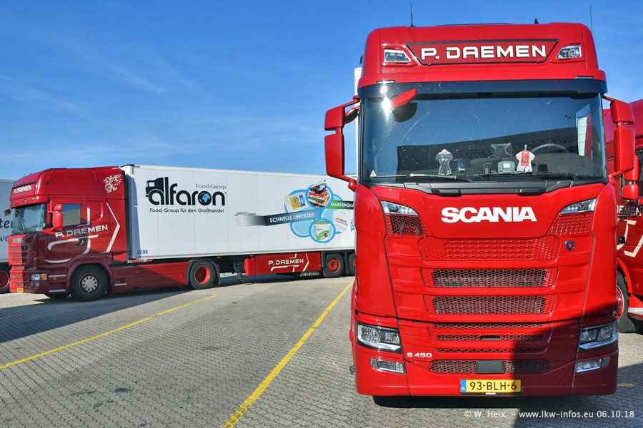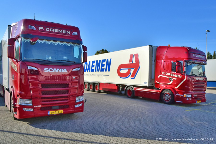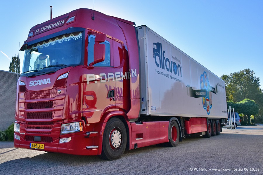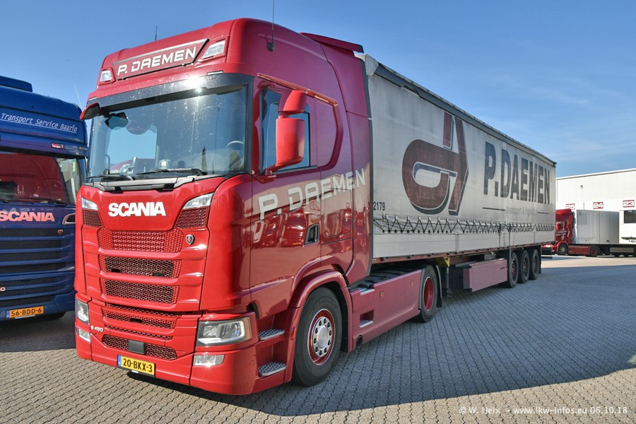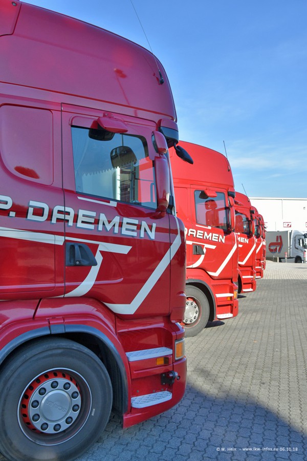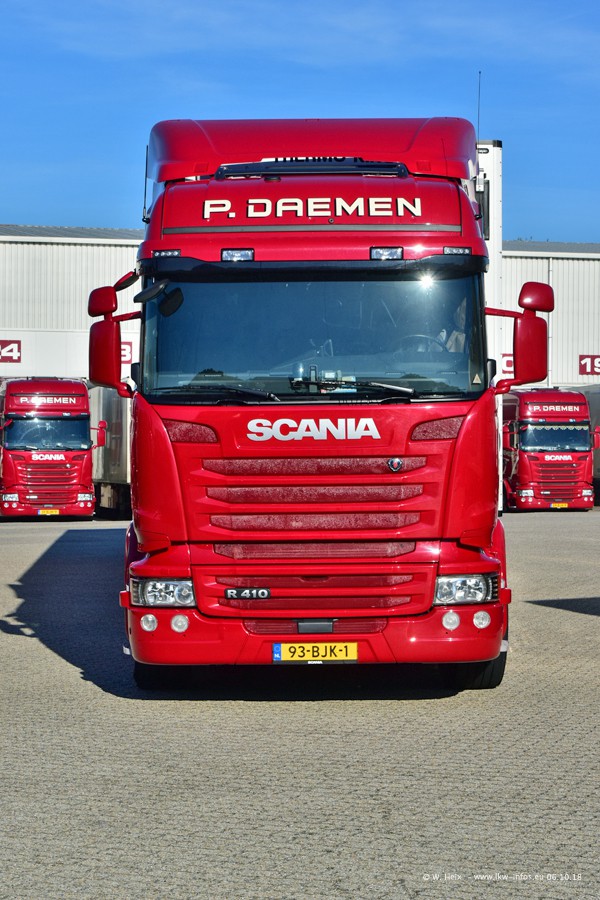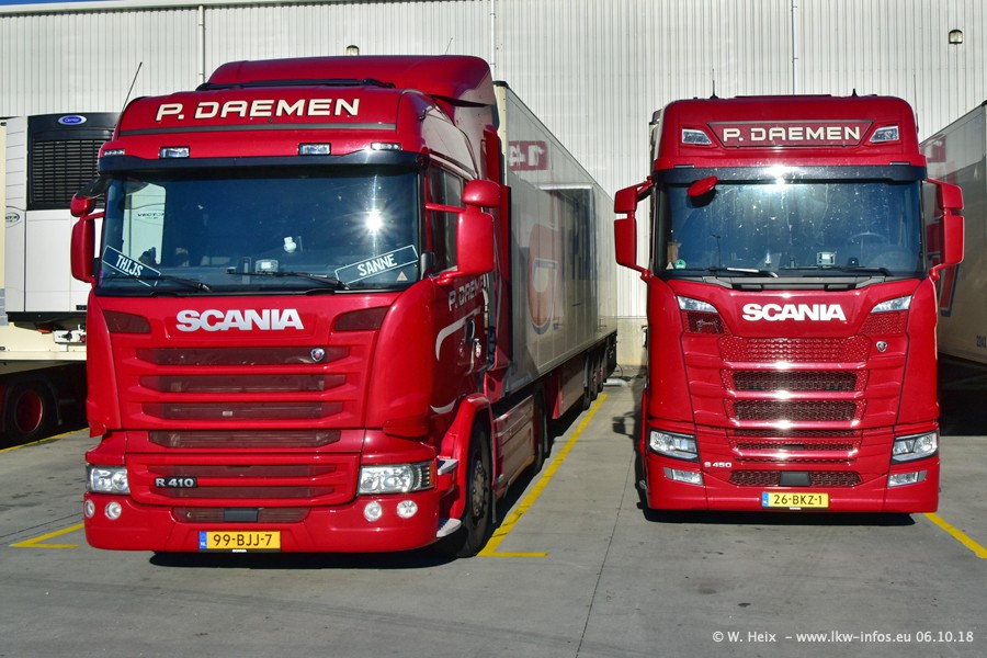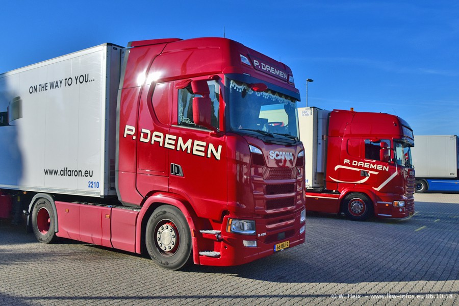 Inzwischen gibt es mehrere neue SCANIA S NextGen, einen schwarznen SCANIA P 280 NextGen und einige neue DAF New XF Euro 6. Bei diesem Besuch war ein sehr großer Teil der LKW zuhause und somit konnte ich auch viele der neuen DAF und SCANIA fotografieren. Die sechs SCANIA R 410 Streamline sind inzwischen auch fertig beschriftet (Greenyard). Diesmal habe ich die Bilder sortiert nach P. Daemen, Greenyard und Scheuten.