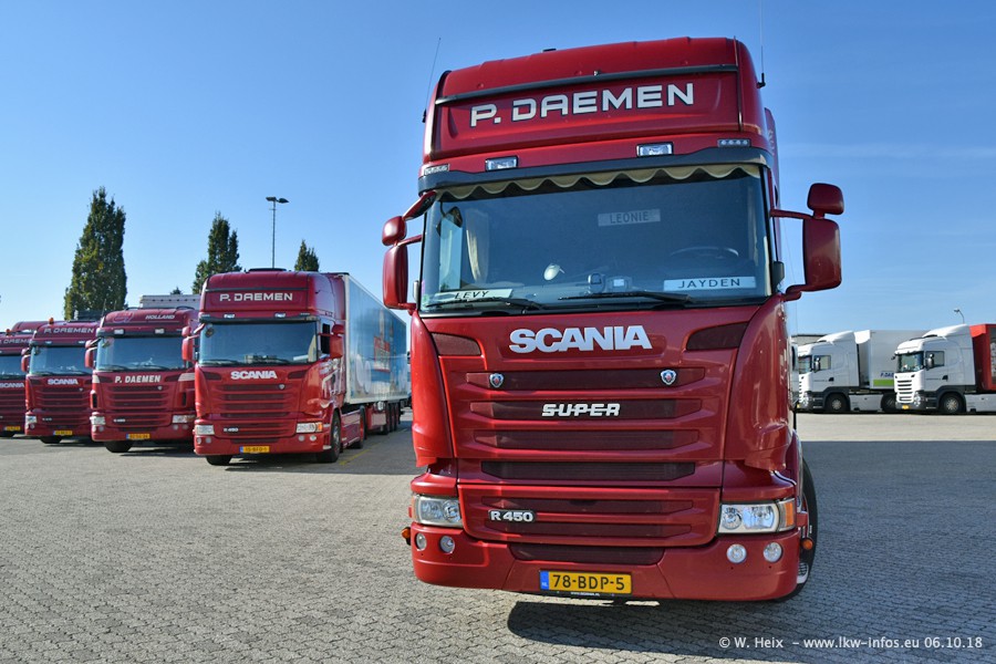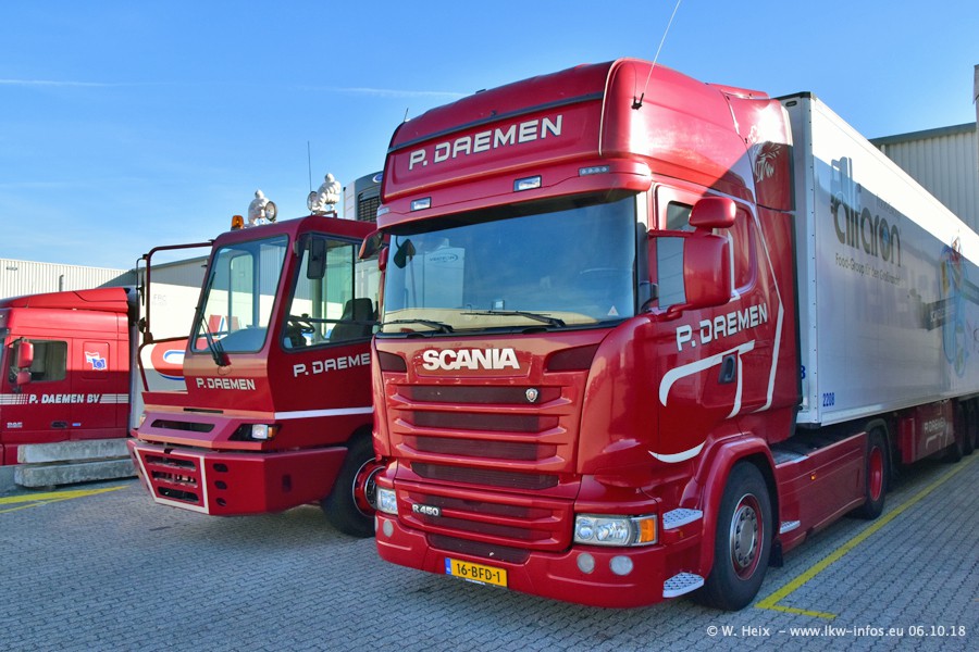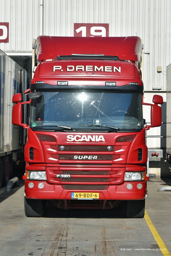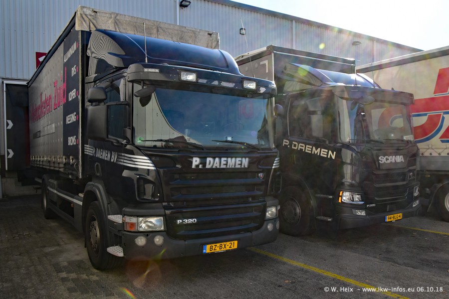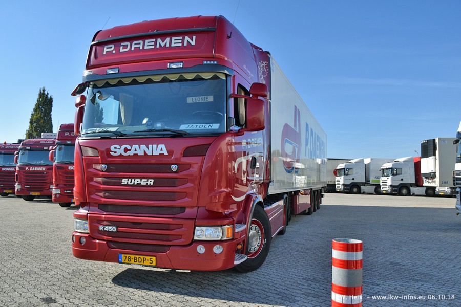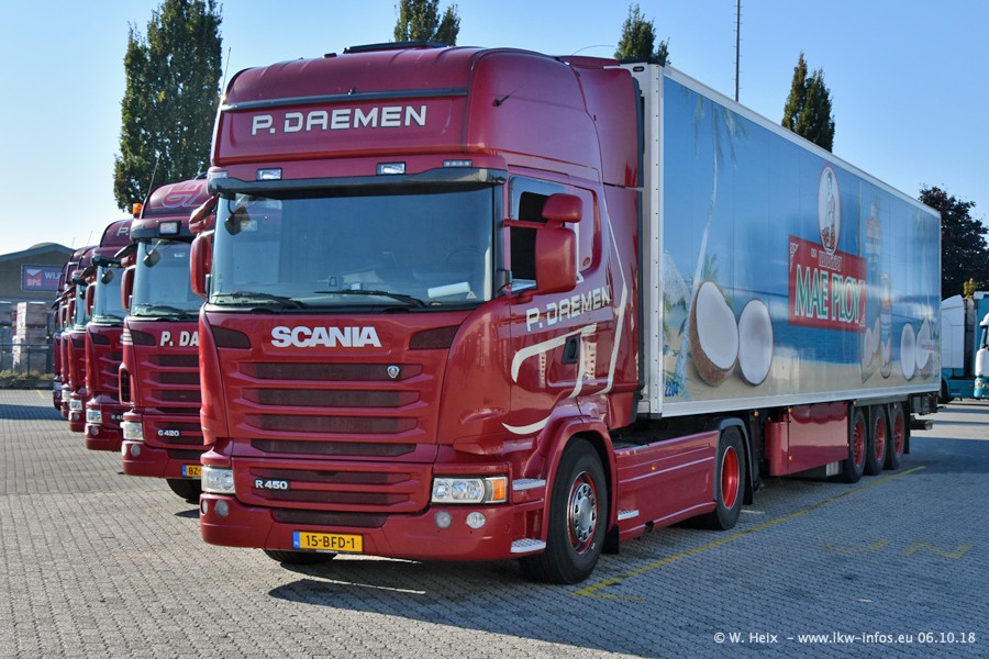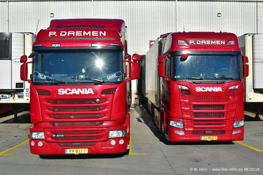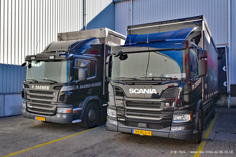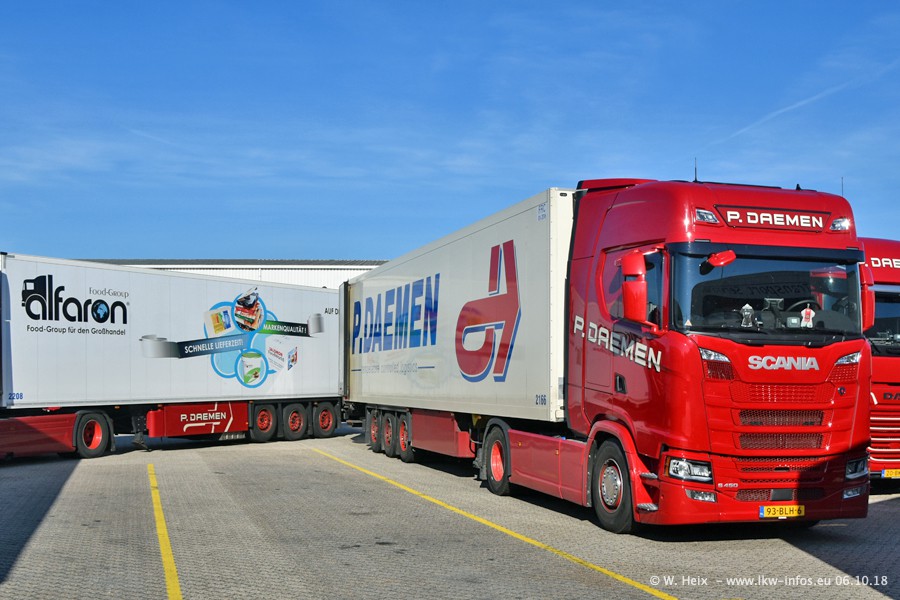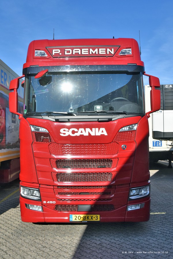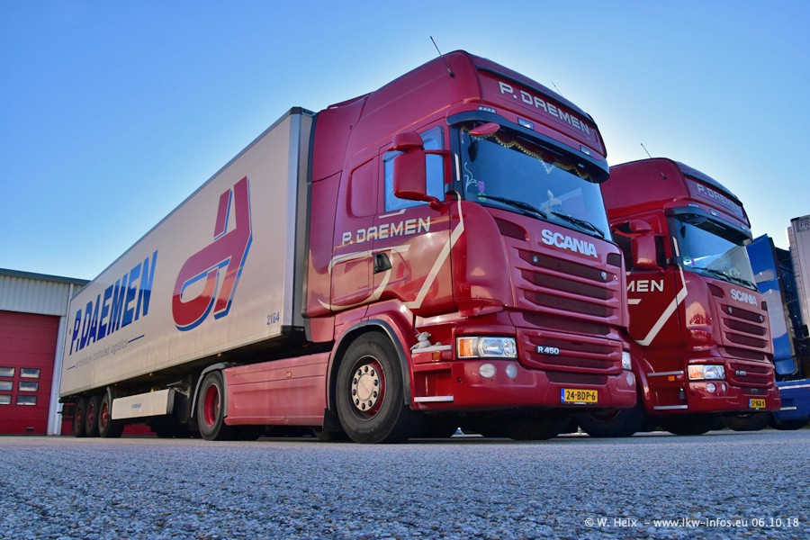 Inzwischen gibt es mehrere neue SCANIA S NextGen, einen schwarznen SCANIA P 280 NextGen und einige neue DAF New XF Euro 6. Bei diesem Besuch war ein sehr großer Teil der LKW zuhause und somit konnte ich auch viele der neuen DAF und SCANIA fotografieren. Die sechs SCANIA R 410 Streamline sind inzwischen auch fertig beschriftet (Greenyard). Diesmal habe ich die Bilder sortiert nach P. Daemen, Greenyard und Scheuten.