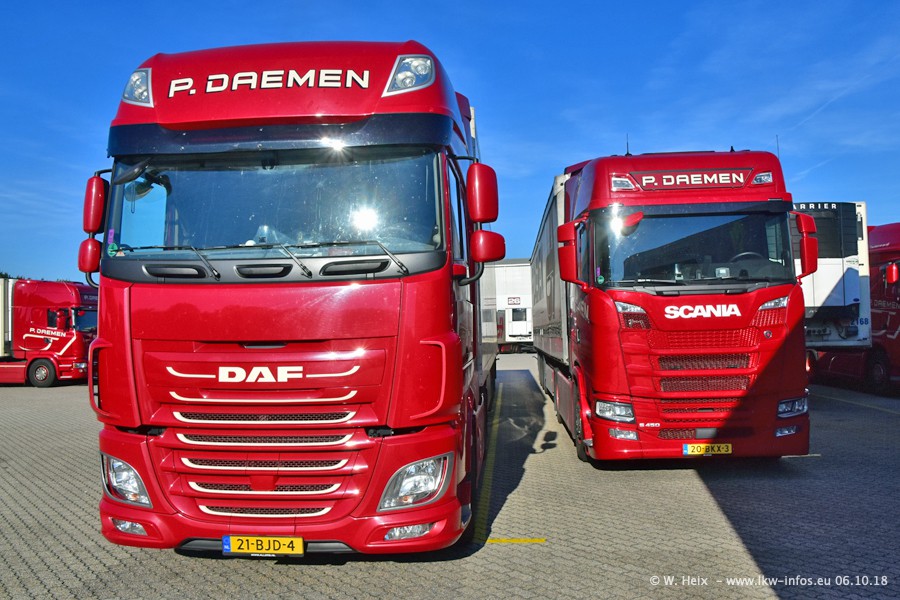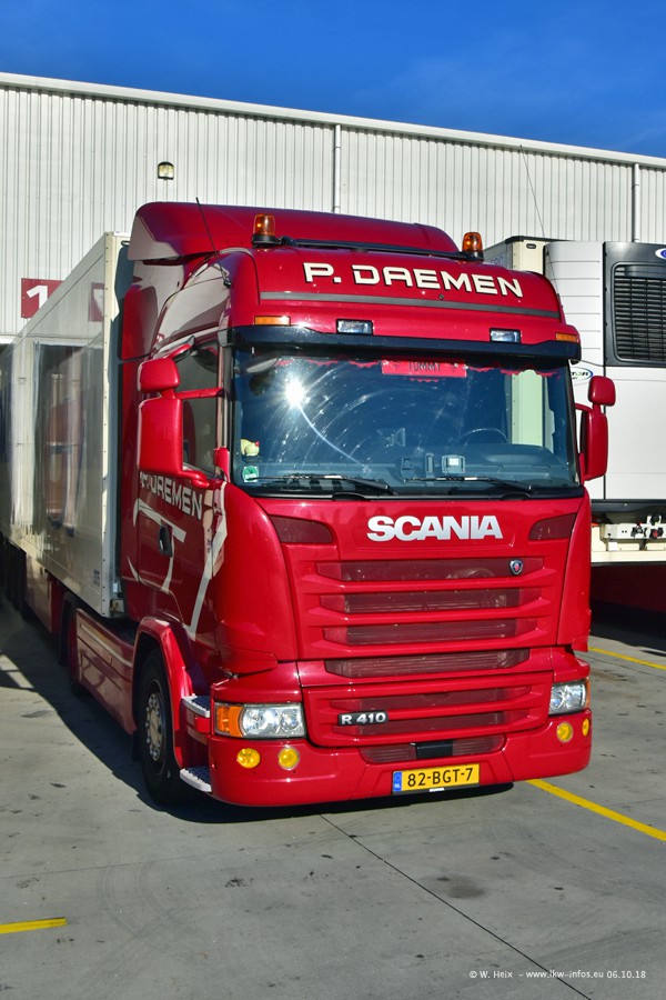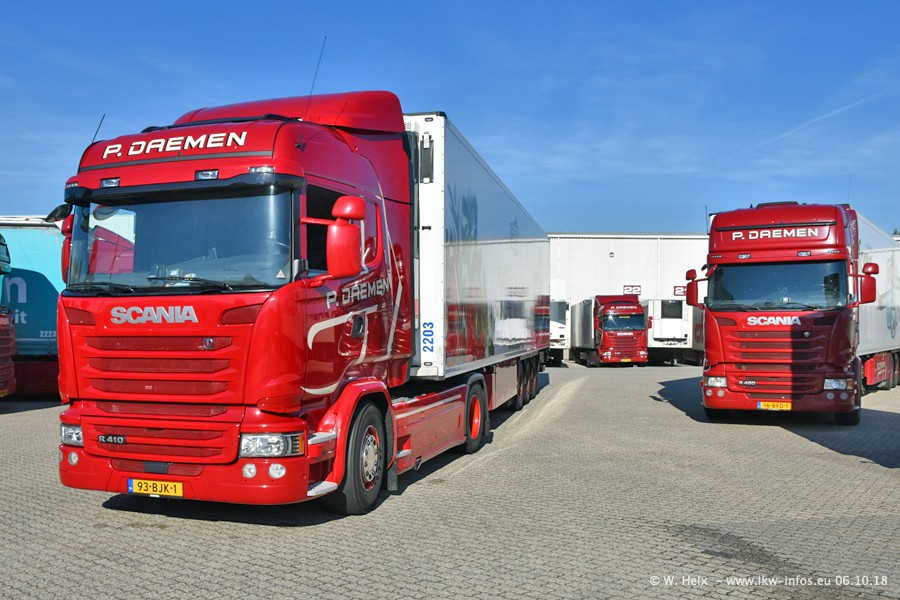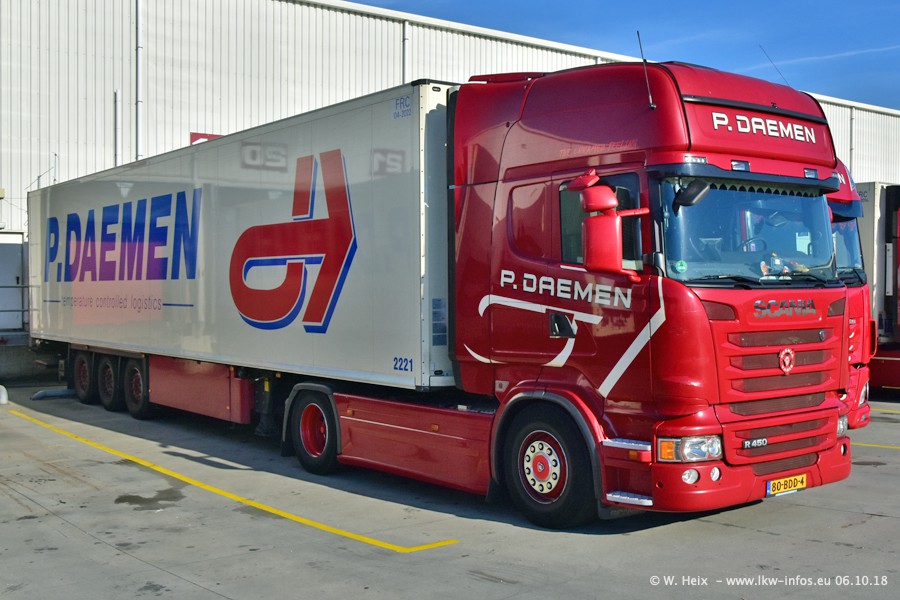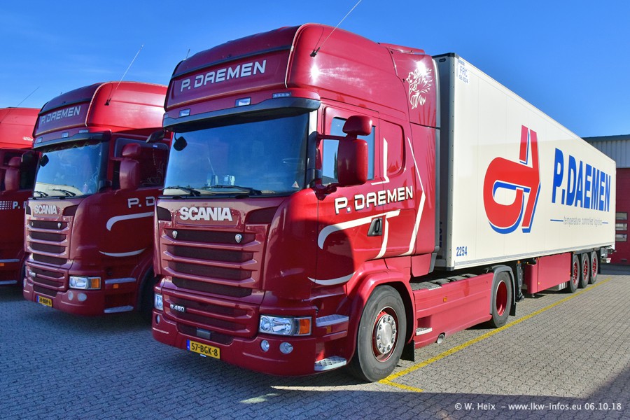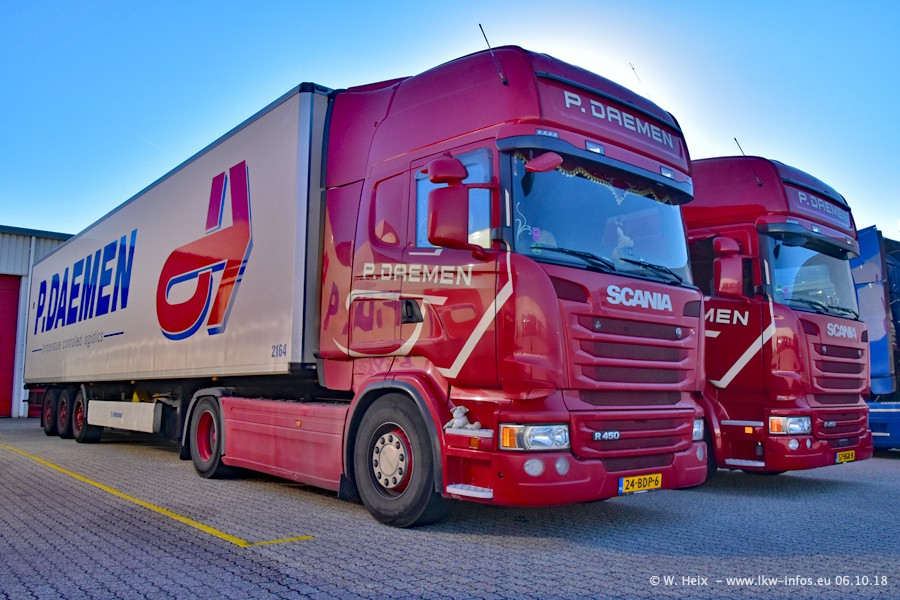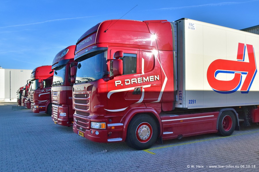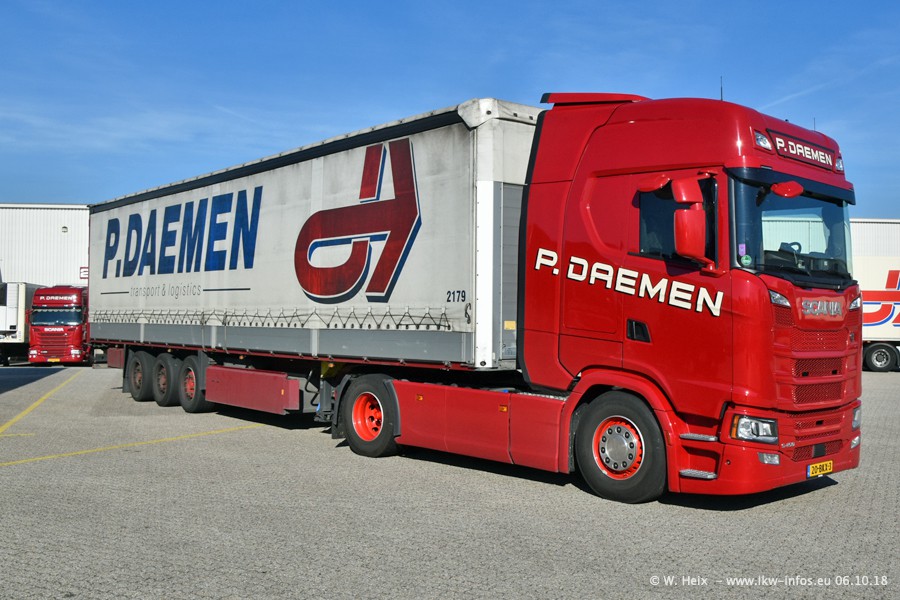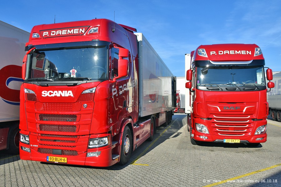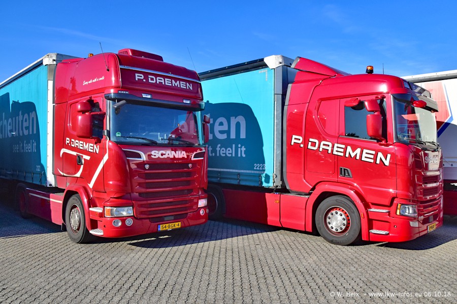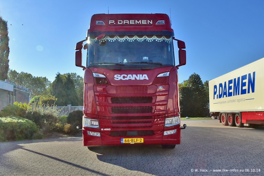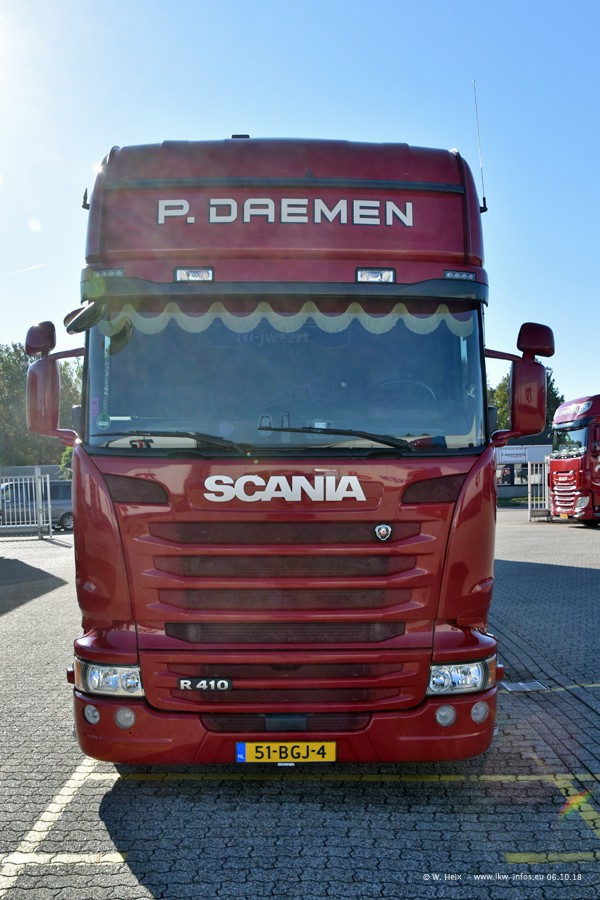 Inzwischen gibt es mehrere neue SCANIA S NextGen, einen schwarznen SCANIA P 280 NextGen und einige neue DAF New XF Euro 6. Bei diesem Besuch war ein sehr großer Teil der LKW zuhause und somit konnte ich auch viele der neuen DAF und SCANIA fotografieren. Die sechs SCANIA R 410 Streamline sind inzwischen auch fertig beschriftet (Greenyard). Diesmal habe ich die Bilder sortiert nach P. Daemen, Greenyard und Scheuten.
