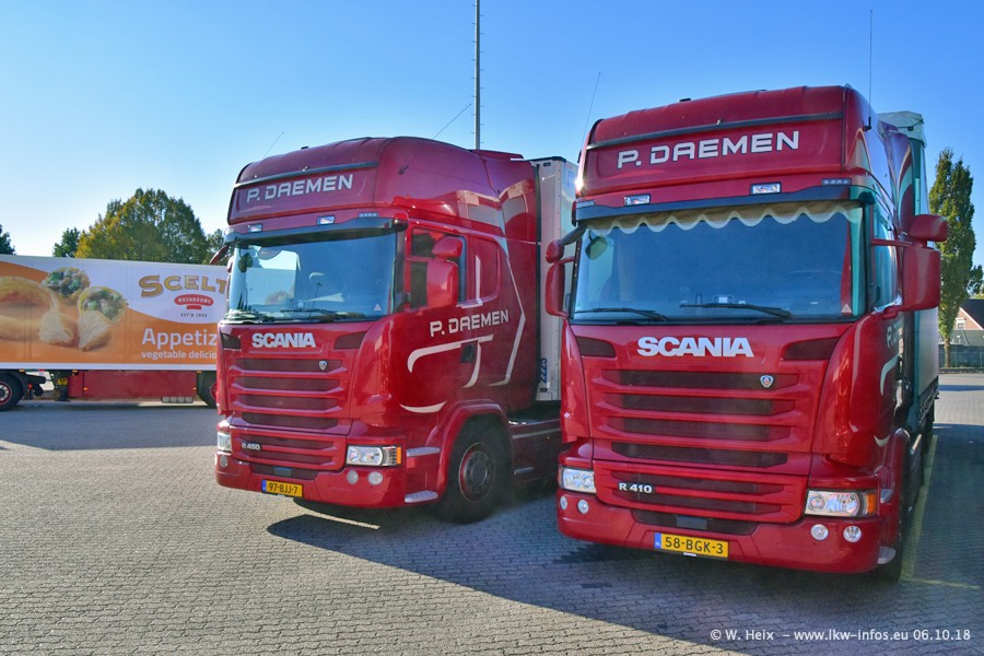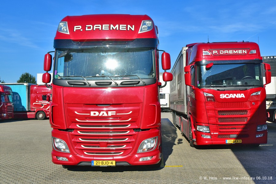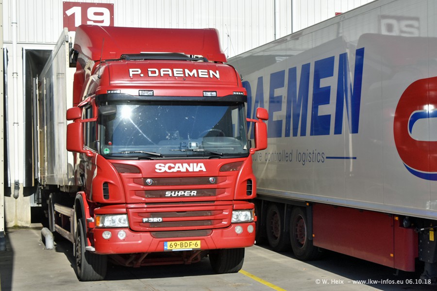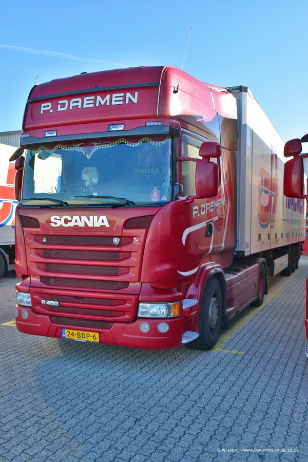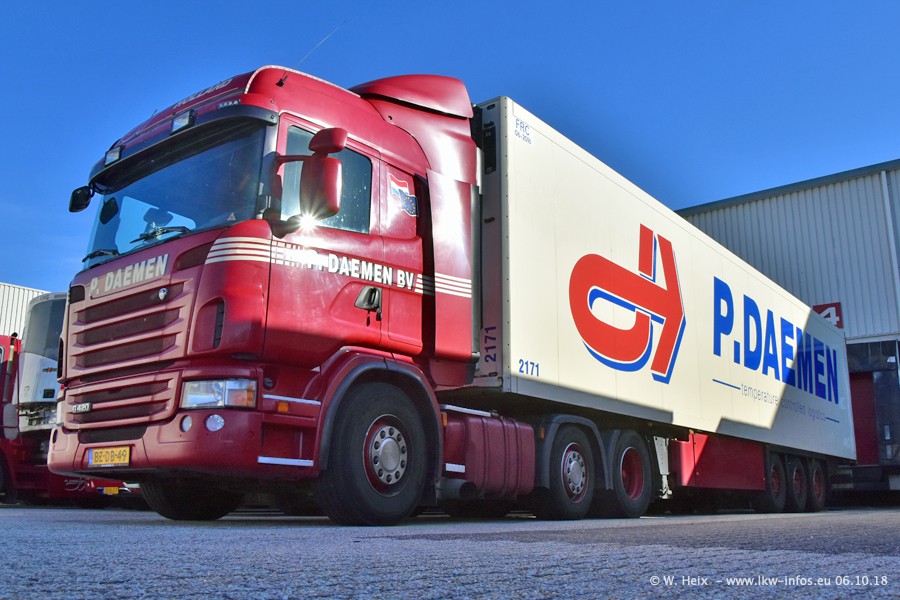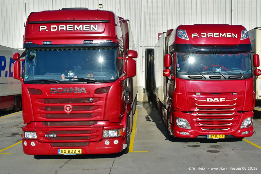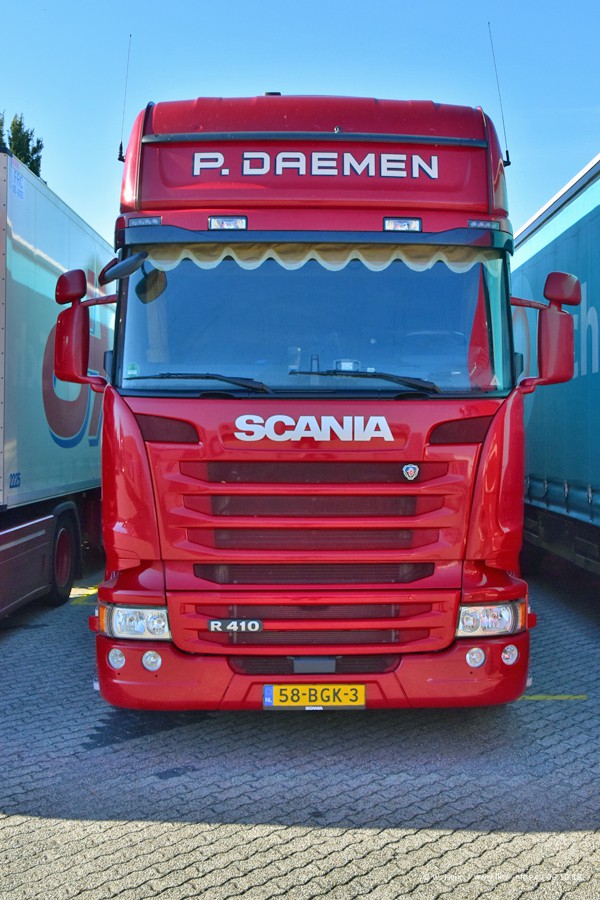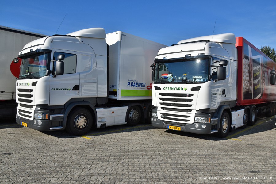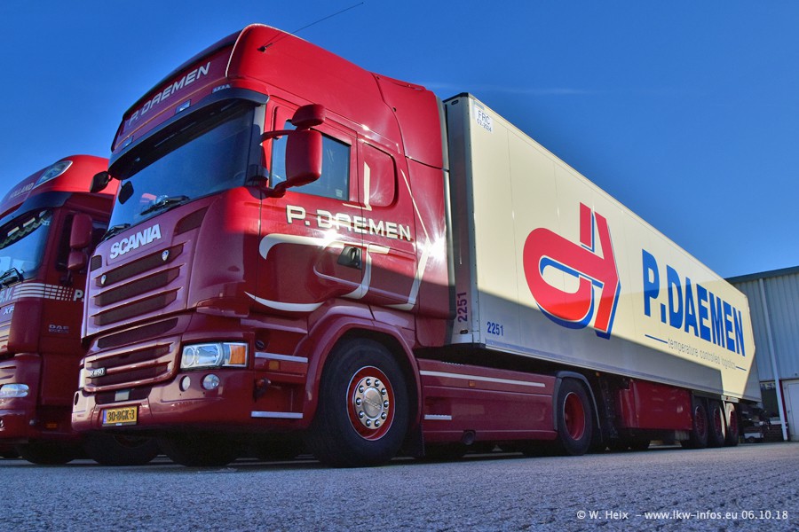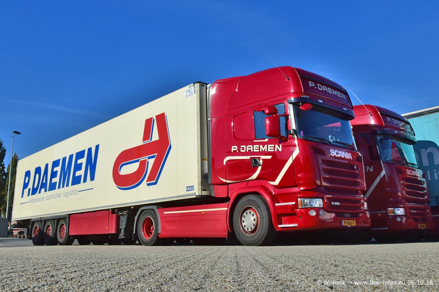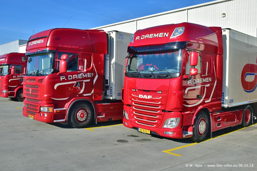 Inzwischen gibt es mehrere neue SCANIA S NextGen, einen schwarznen SCANIA P 280 NextGen und einige neue DAF New XF Euro 6. Bei diesem Besuch war ein sehr großer Teil der LKW zuhause und somit konnte ich auch viele der neuen DAF und SCANIA fotografieren. Die sechs SCANIA R 410 Streamline sind inzwischen auch fertig beschriftet (Greenyard). Diesmal habe ich die Bilder sortiert nach P. Daemen, Greenyard und Scheuten.