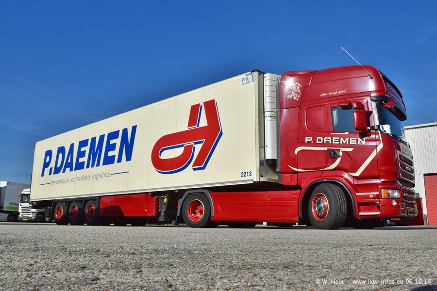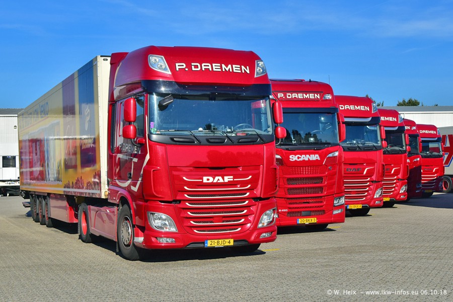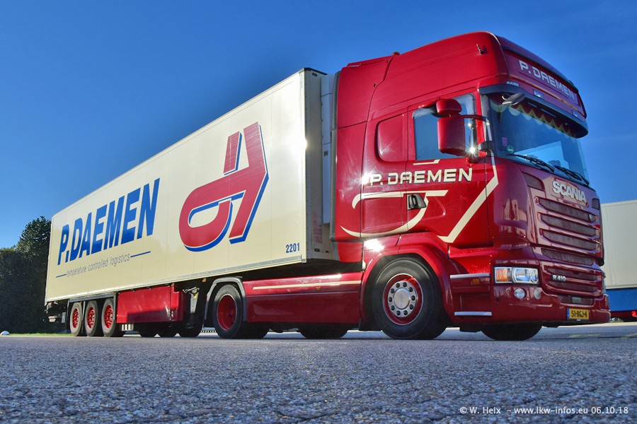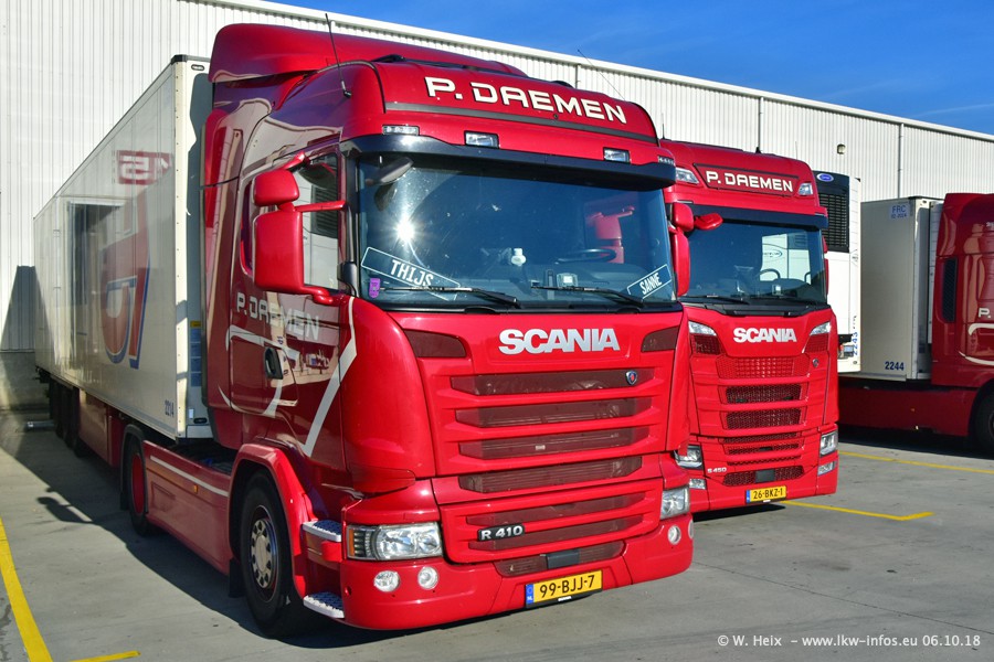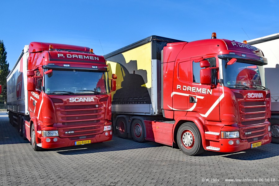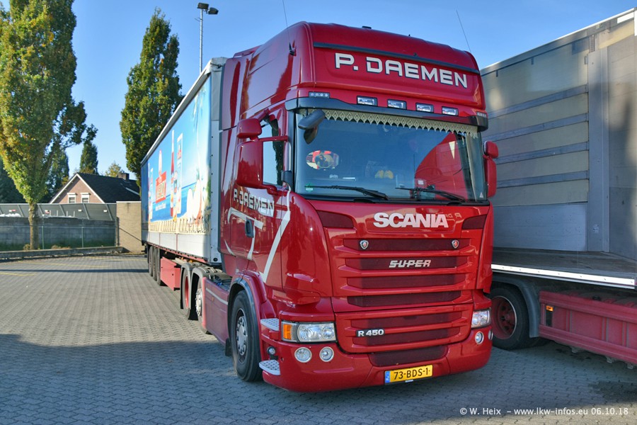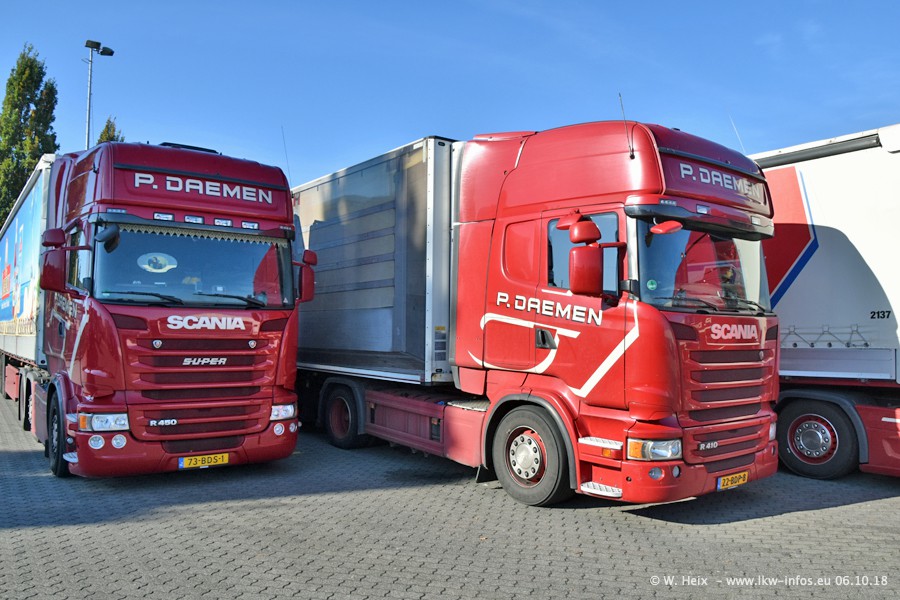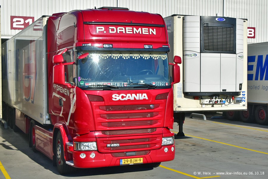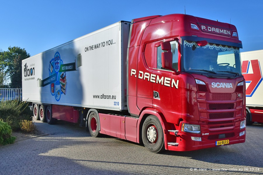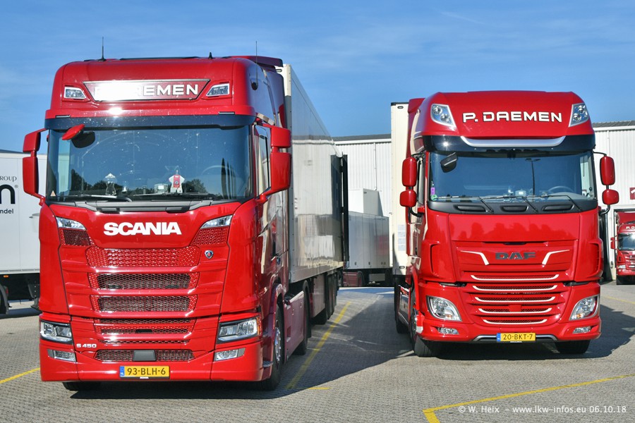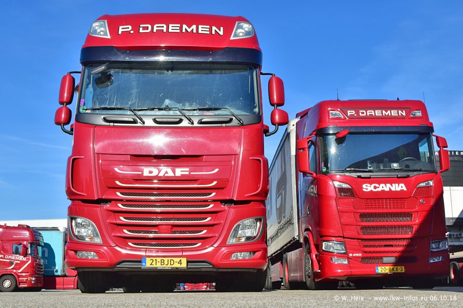 Inzwischen gibt es mehrere neue SCANIA S NextGen, einen schwarznen SCANIA P 280 NextGen und einige neue DAF New XF Euro 6. Bei diesem Besuch war ein sehr großer Teil der LKW zuhause und somit konnte ich auch viele der neuen DAF und SCANIA fotografieren. Die sechs SCANIA R 410 Streamline sind inzwischen auch fertig beschriftet (Greenyard). Diesmal habe ich die Bilder sortiert nach P. Daemen, Greenyard und Scheuten.