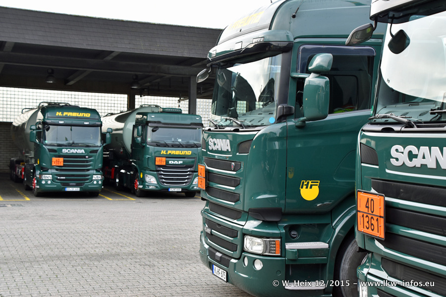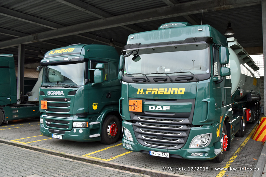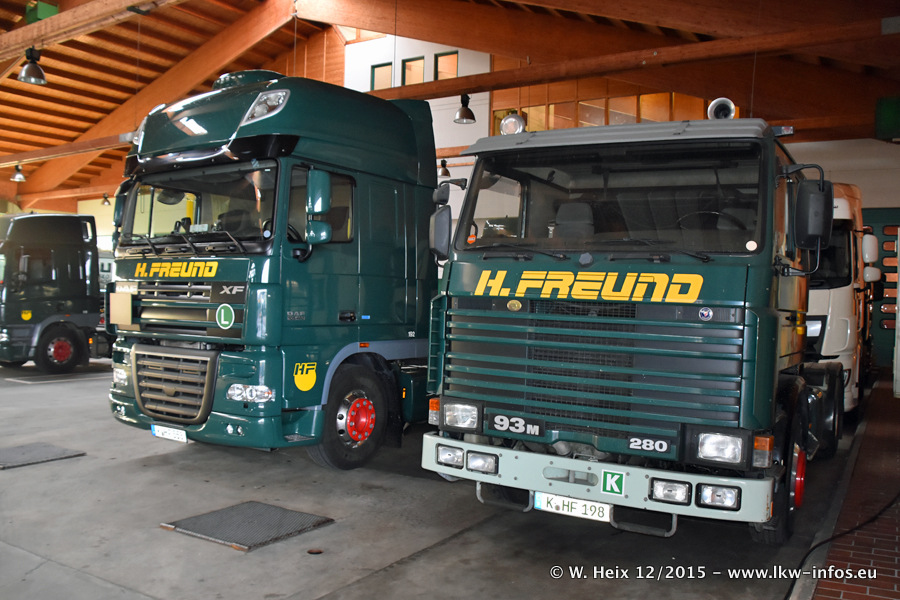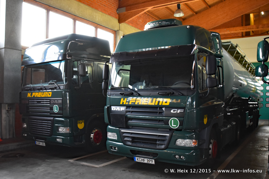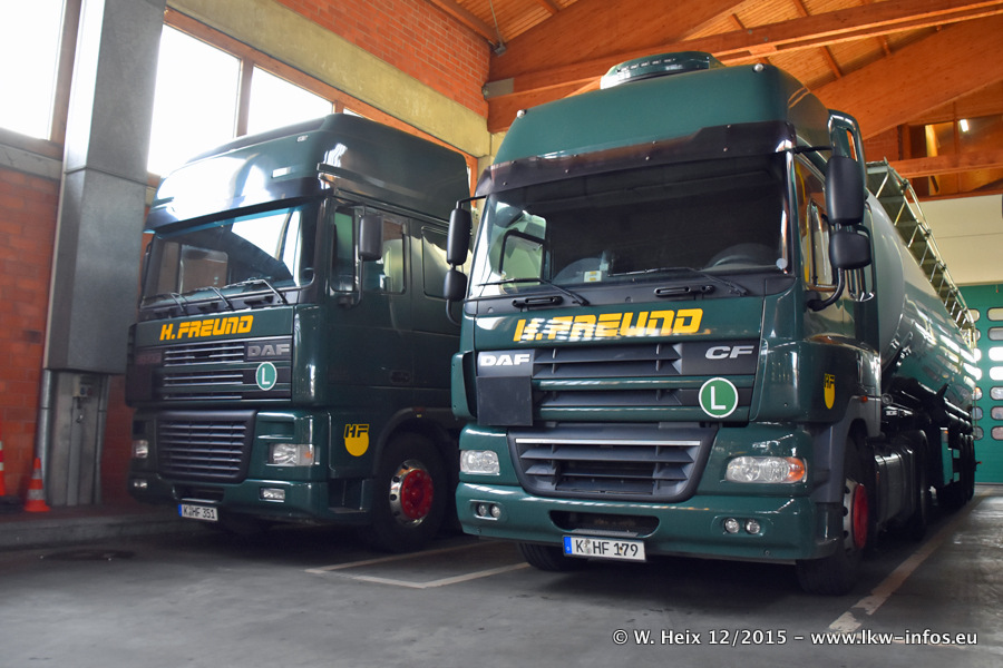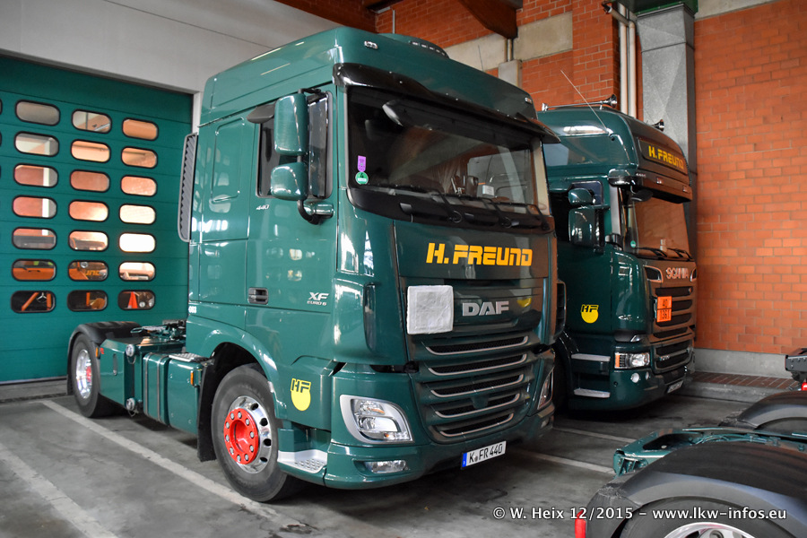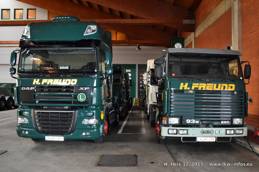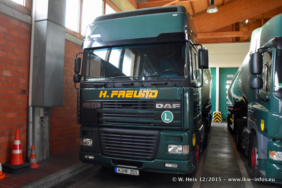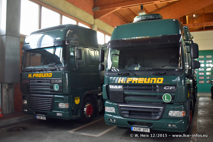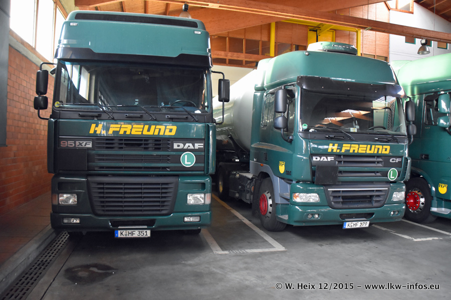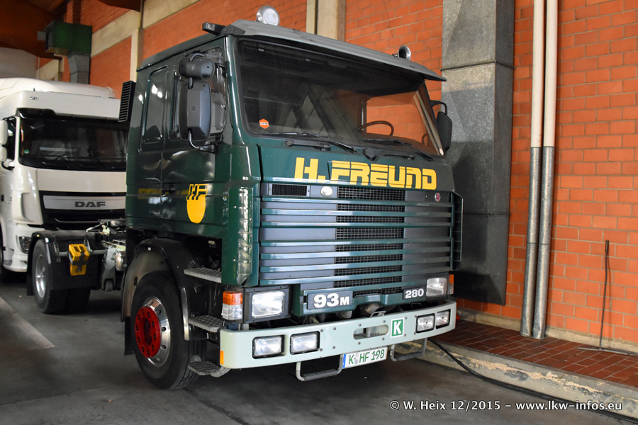 Ich war zum ersten Mal bei der Spedition H. Freund in Frechen zu Besuch. Der Fuhrpark besteht zur Zeit aus rund 160 LKW, die natürlich nie alle zusammen auf dem Firmengelände stehen, das würde der Platz auch nicht zulassen. Der größte Teil der Zugmaschinen ist von DAF, aber auch Scania ist stark vertreten. Dazu kommen noch LKW von Mercedes-Benz und Volvo. Die von mir fotografierten älteren Zugmaschinene (DAF CF 1, DAF 95 XF) sind nicht mehr im täglichen Einsatz, werden aber noch gebraucht, wenn ein Ersatzfahrzeug benötigt wird.