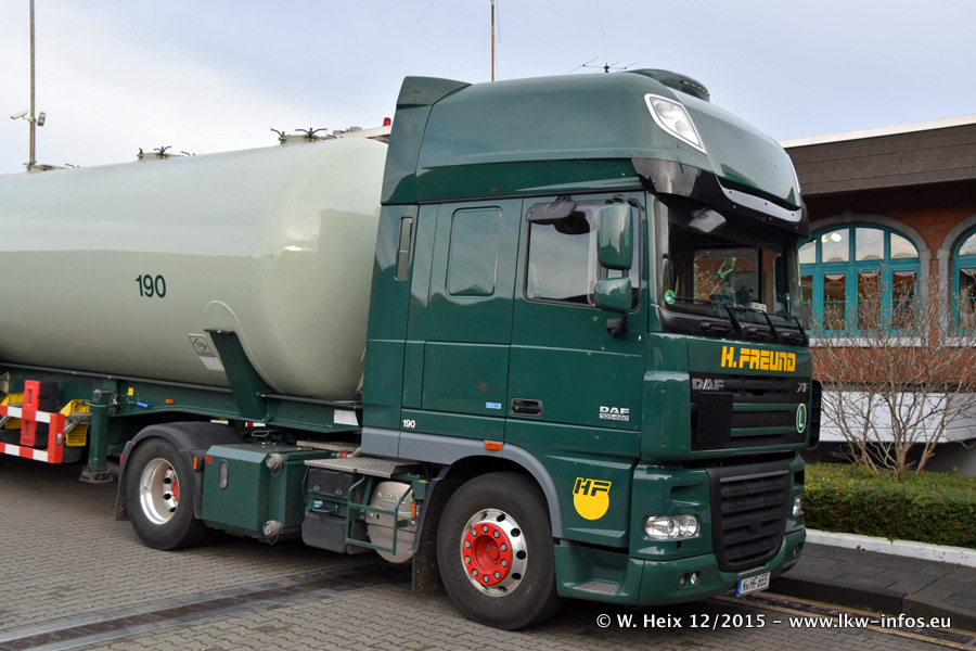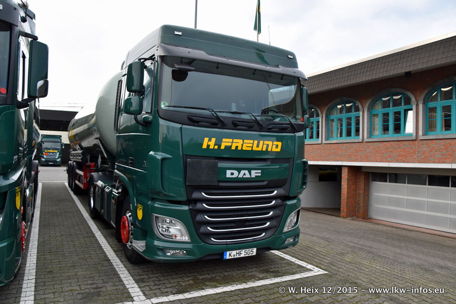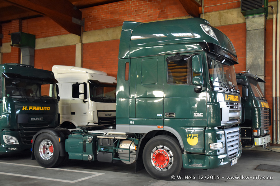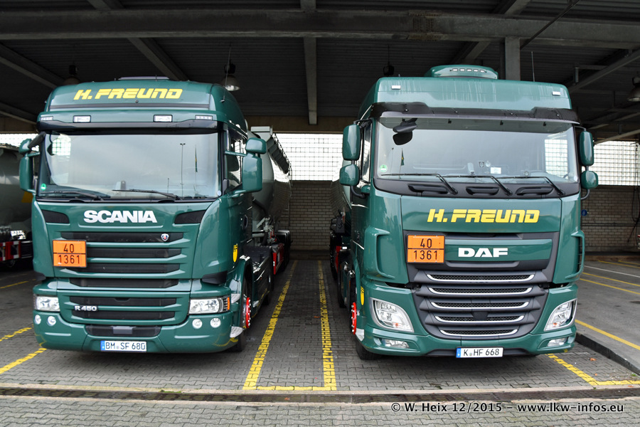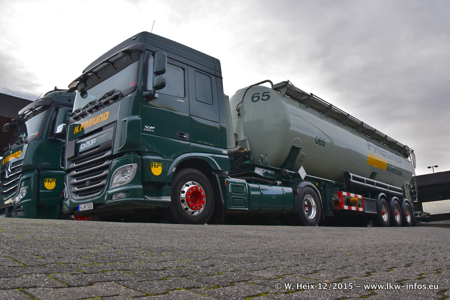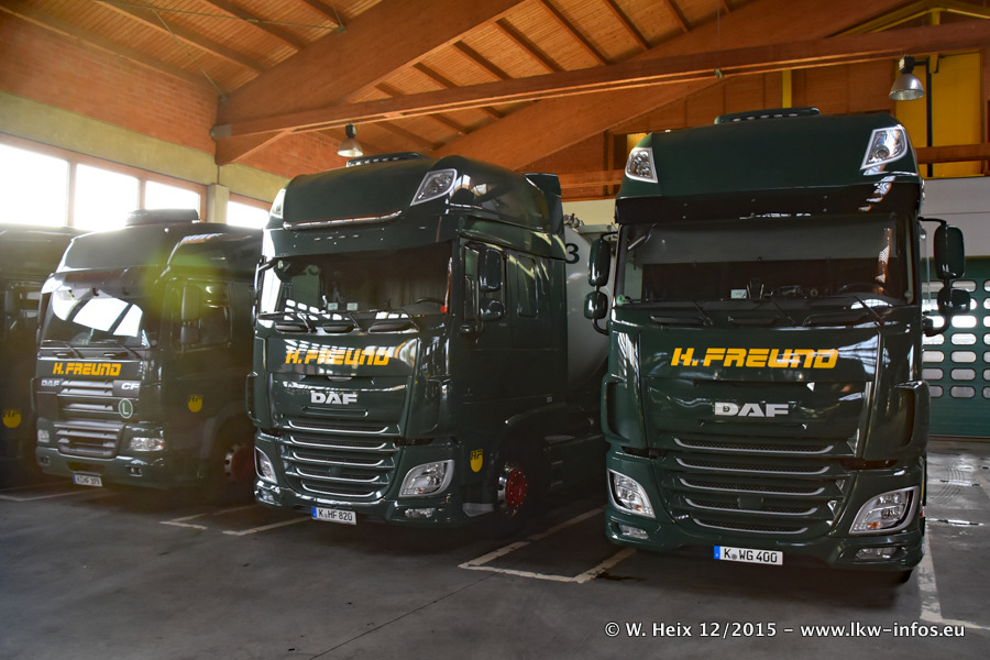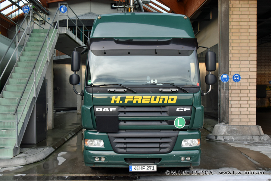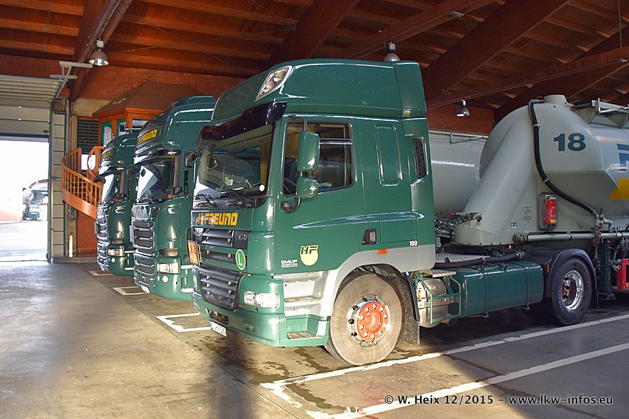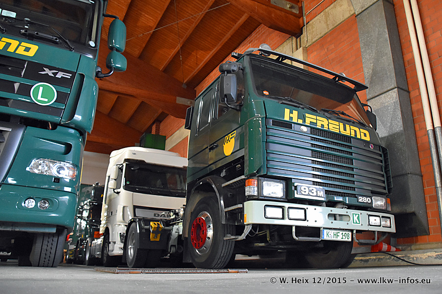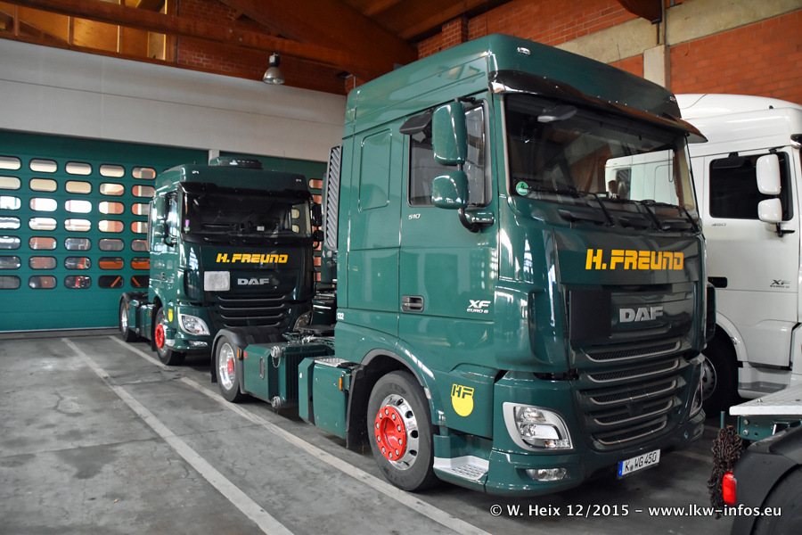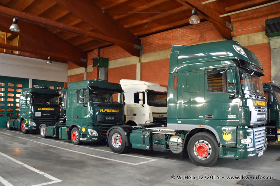 Ich war zum ersten Mal bei der Spedition H. Freund in Frechen zu Besuch. Der Fuhrpark besteht zur Zeit aus rund 160 LKW, die natürlich nie alle zusammen auf dem Firmengelände stehen, das würde der Platz auch nicht zulassen. Der größte Teil der Zugmaschinen ist von DAF, aber auch Scania ist stark vertreten. Dazu kommen noch LKW von Mercedes-Benz und Volvo. Die von mir fotografierten älteren Zugmaschinene (DAF CF 1, DAF 95 XF) sind nicht mehr im täglichen Einsatz, werden aber noch gebraucht, wenn ein Ersatzfahrzeug benötigt wird.