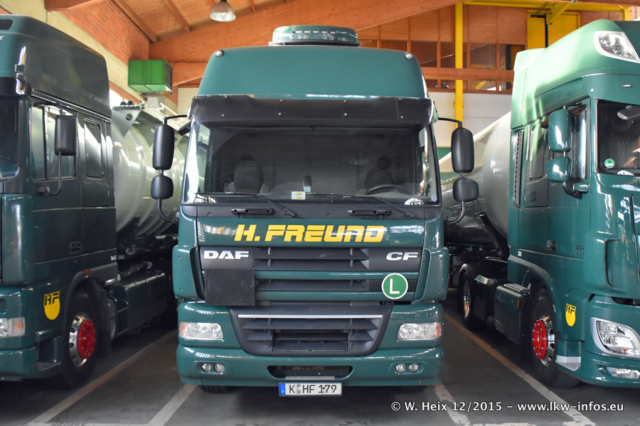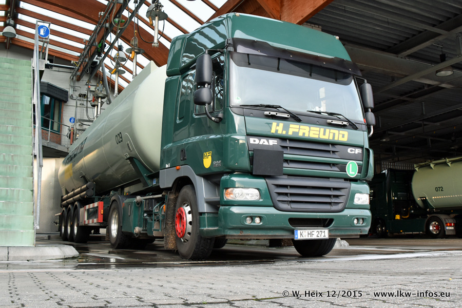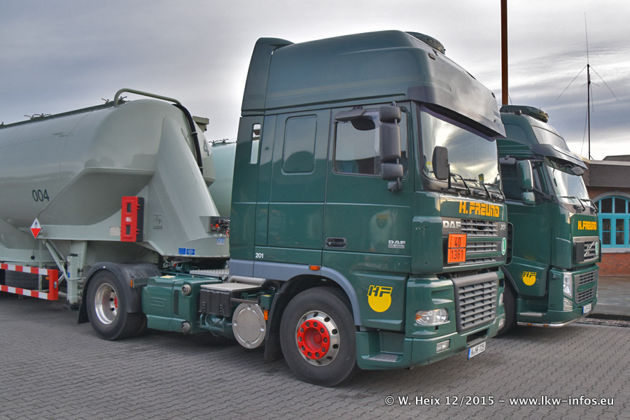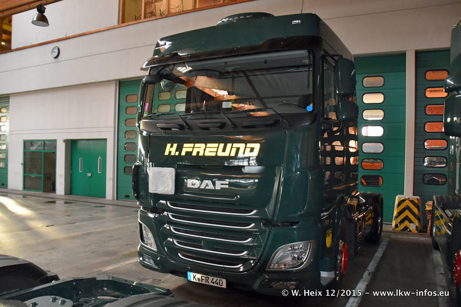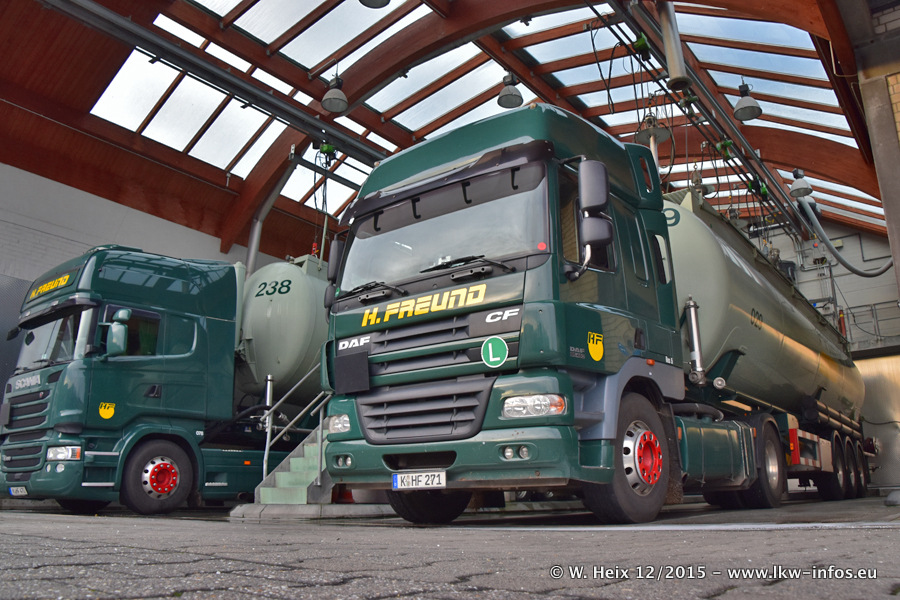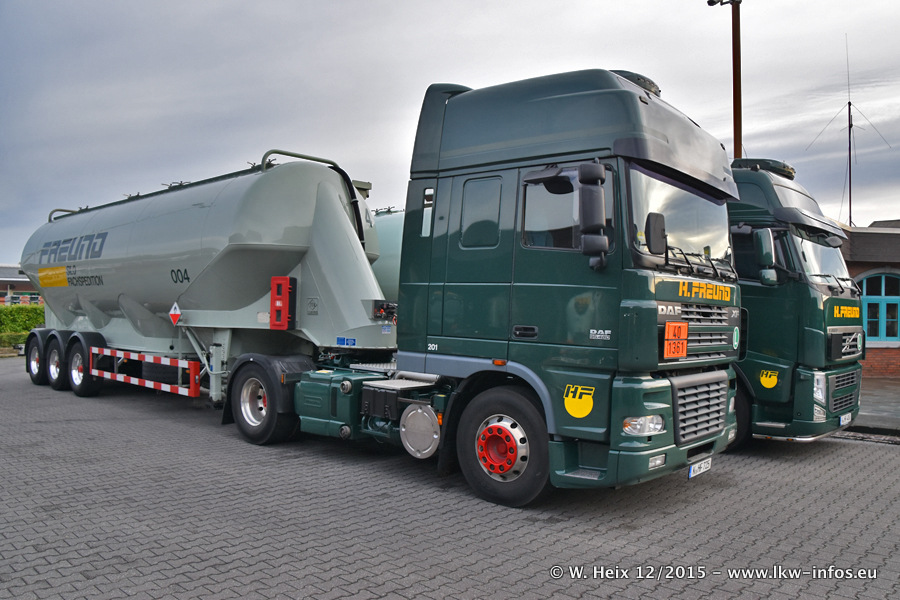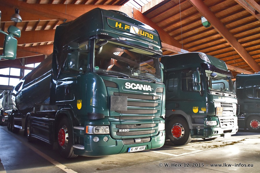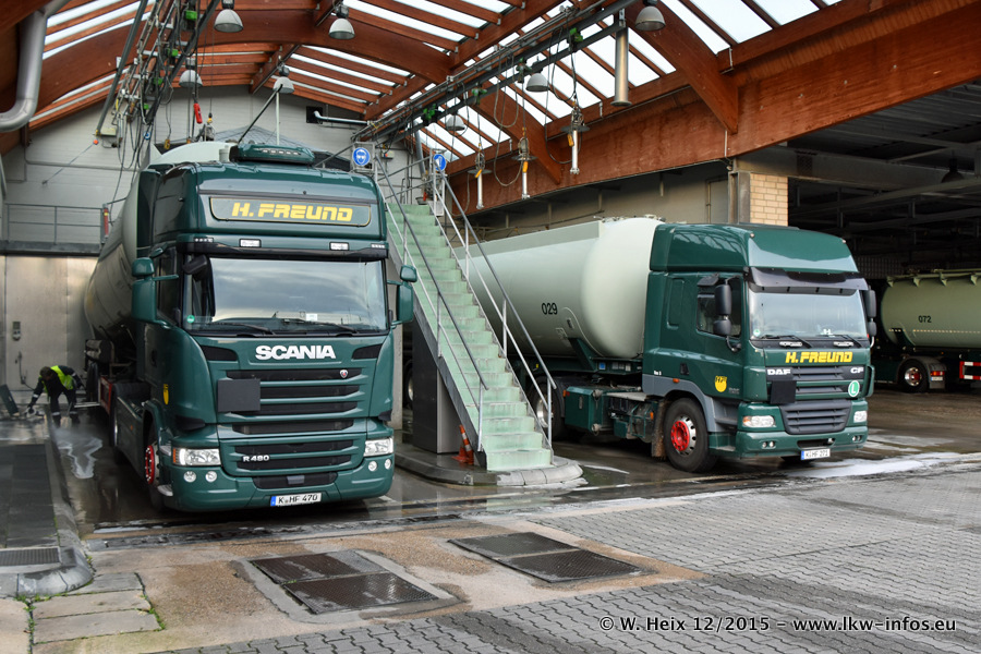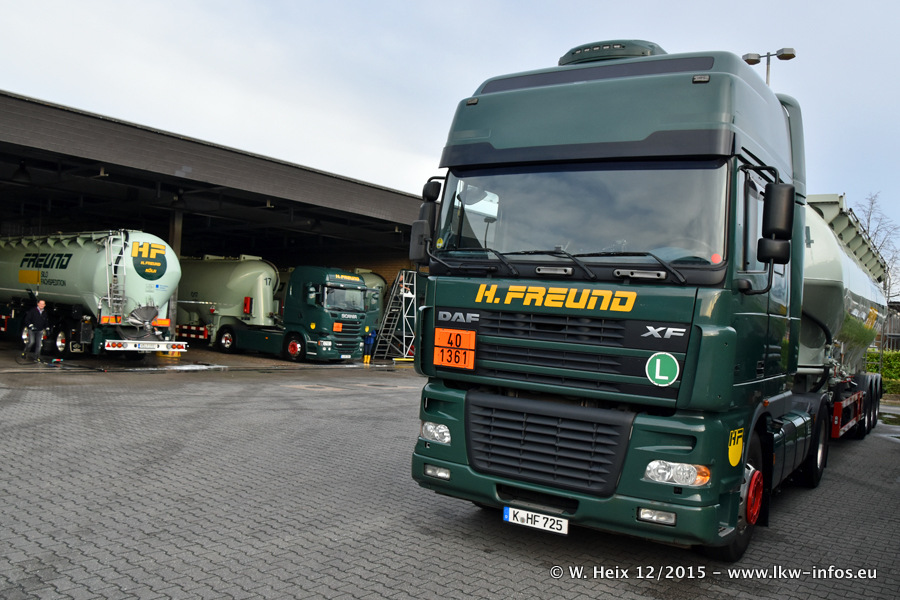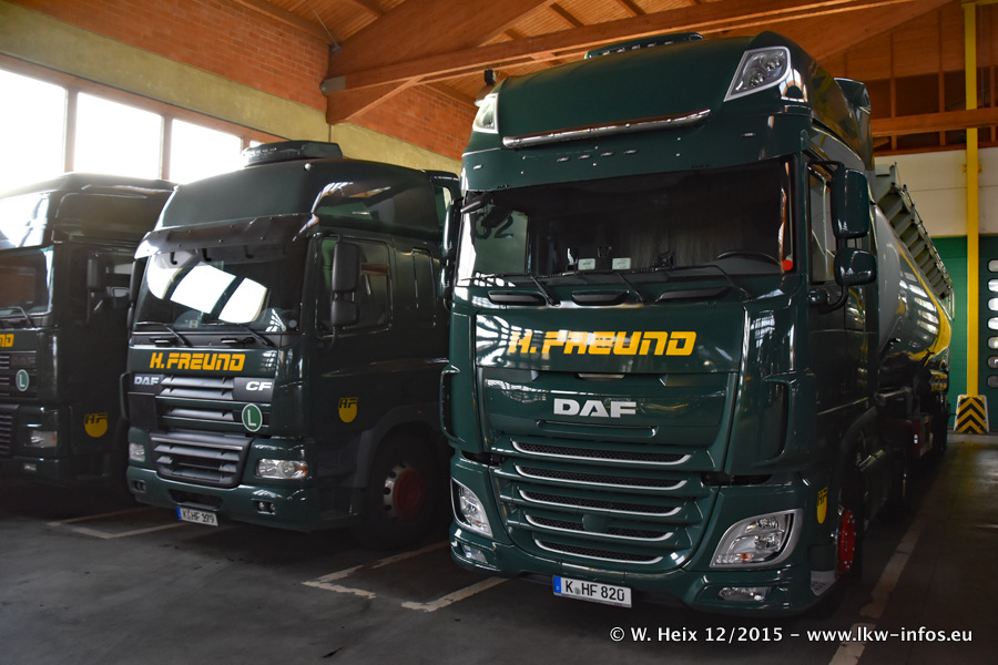 Ich war zum ersten Mal bei der Spedition H. Freund in Frechen zu Besuch. Der Fuhrpark besteht zur Zeit aus rund 160 LKW, die natürlich nie alle zusammen auf dem Firmengelände stehen, das würde der Platz auch nicht zulassen. Der größte Teil der Zugmaschinen ist von DAF, aber auch Scania ist stark vertreten. Dazu kommen noch LKW von Mercedes-Benz und Volvo. Die von mir fotografierten älteren Zugmaschinene (DAF CF 1, DAF 95 XF) sind nicht mehr im täglichen Einsatz, werden aber noch gebraucht, wenn ein Ersatzfahrzeug benötigt wird.