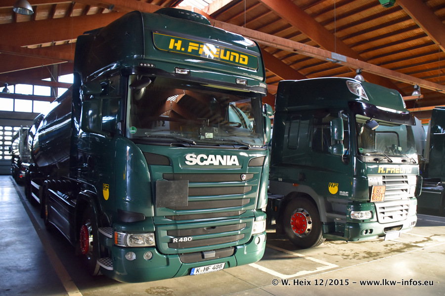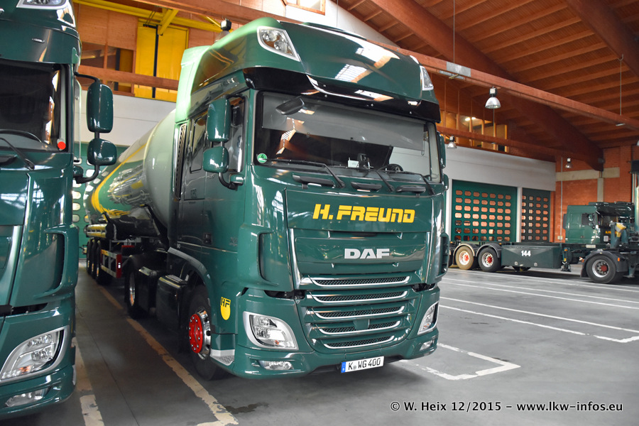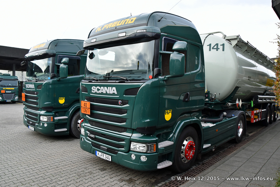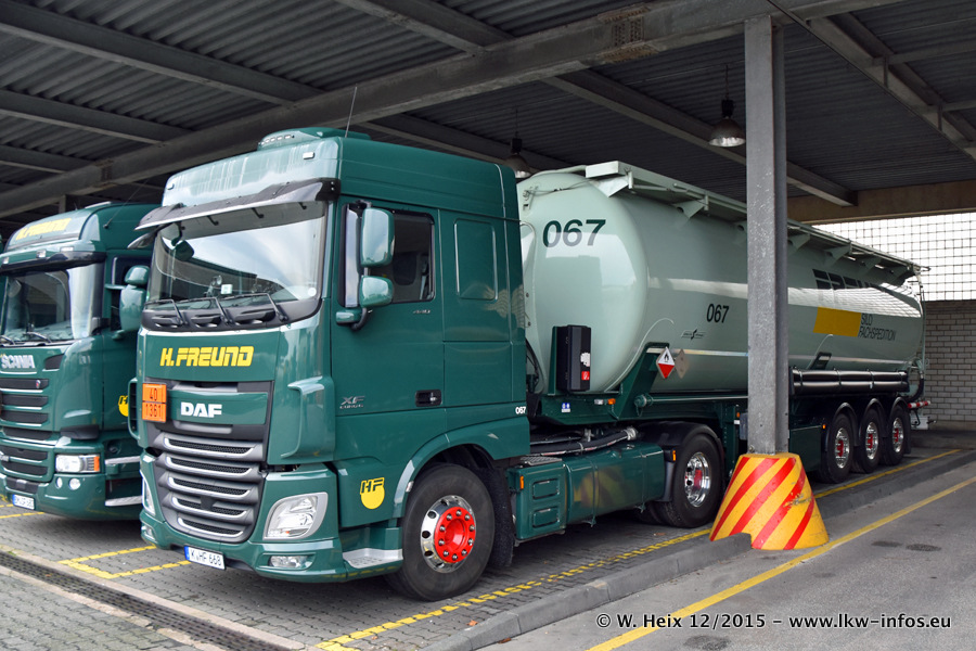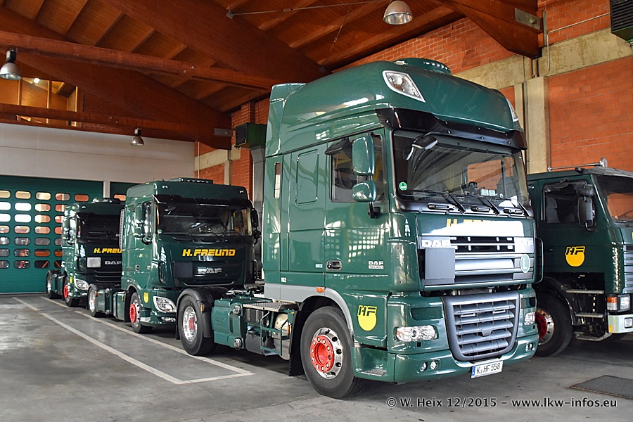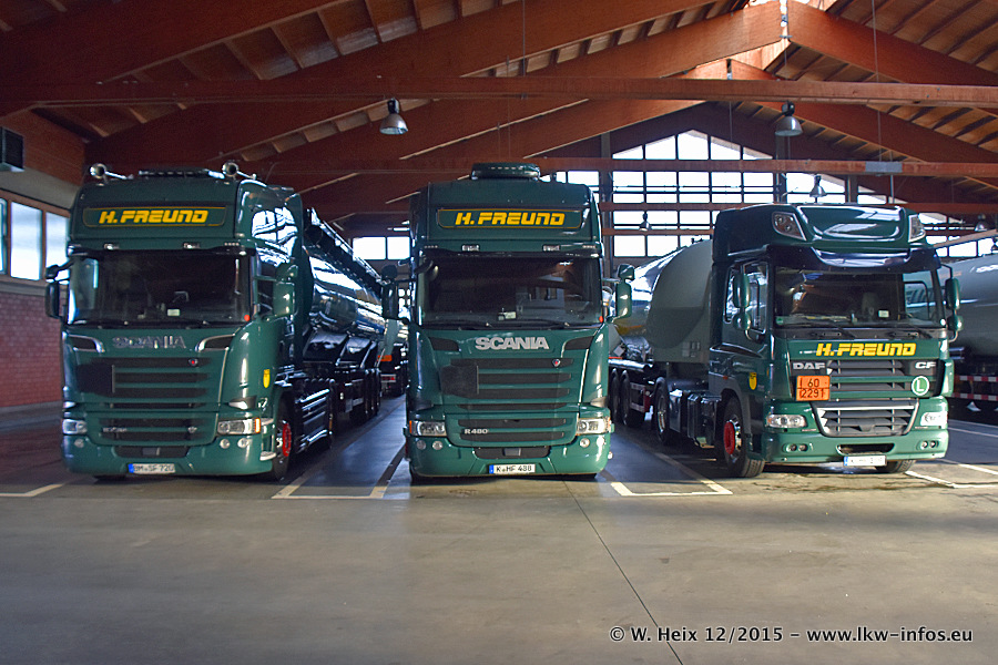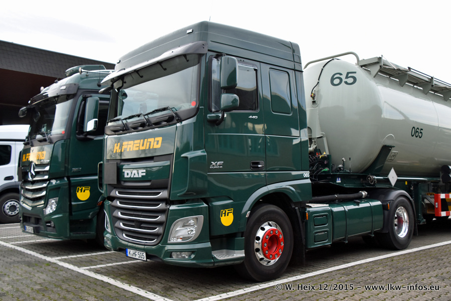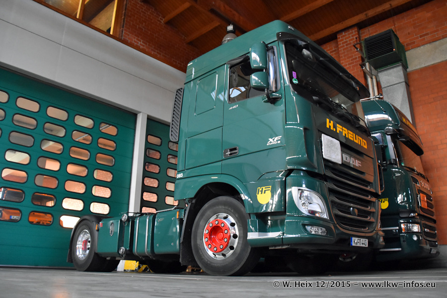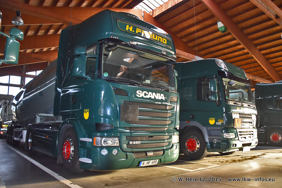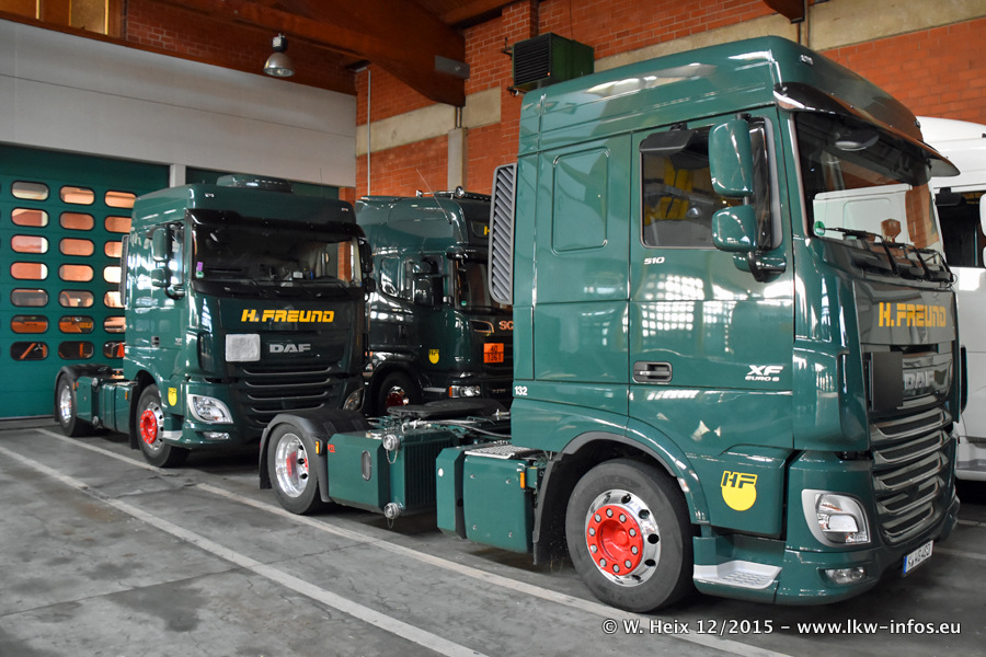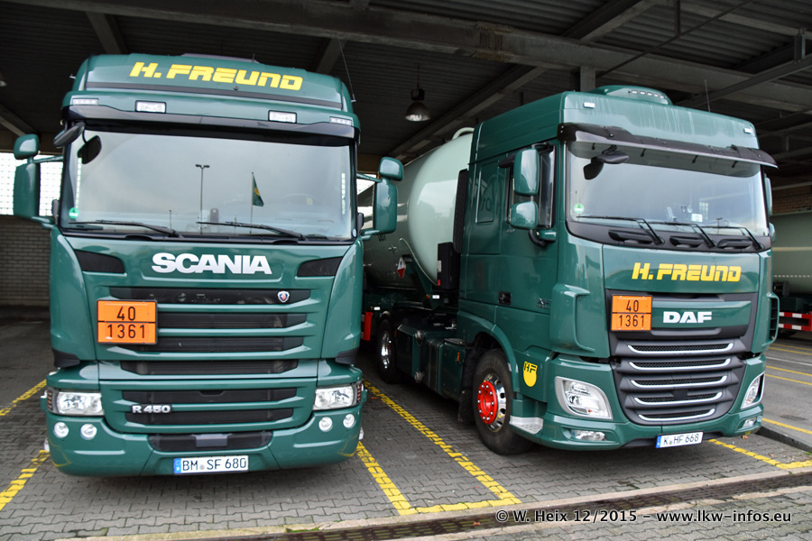 Ich war zum ersten Mal bei der Spedition H. Freund in Frechen zu Besuch. Der Fuhrpark besteht zur Zeit aus rund 160 LKW, die natürlich nie alle zusammen auf dem Firmengelände stehen, das würde der Platz auch nicht zulassen. Der größte Teil der Zugmaschinen ist von DAF, aber auch Scania ist stark vertreten. Dazu kommen noch LKW von Mercedes-Benz und Volvo. Die von mir fotografierten älteren Zugmaschinene (DAF CF 1, DAF 95 XF) sind nicht mehr im täglichen Einsatz, werden aber noch gebraucht, wenn ein Ersatzfahrzeug benötigt wird.