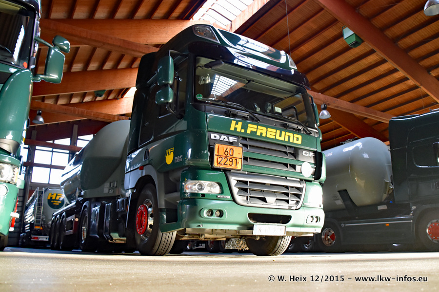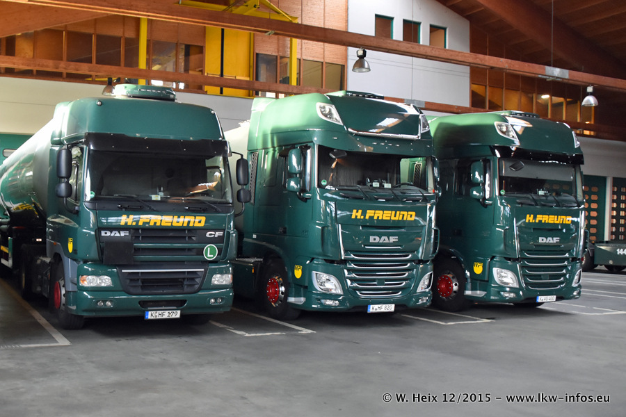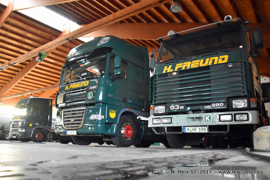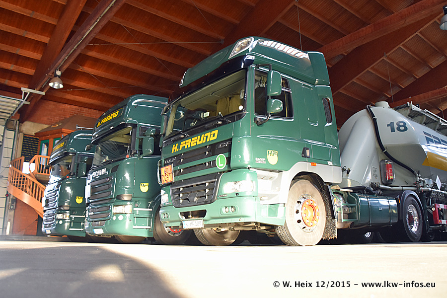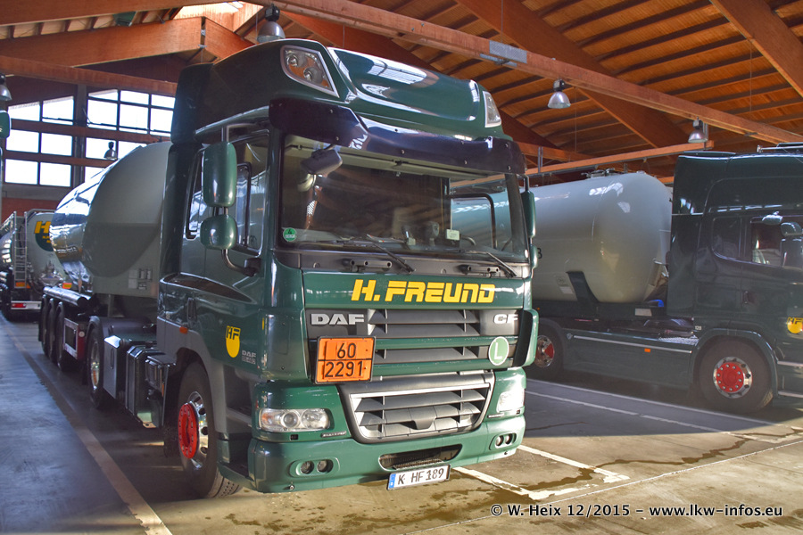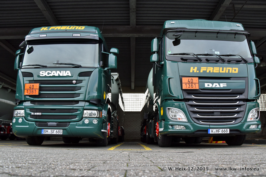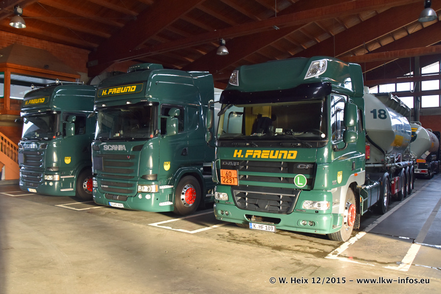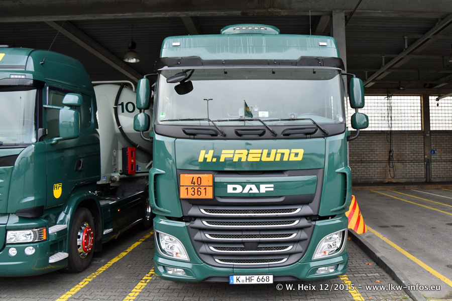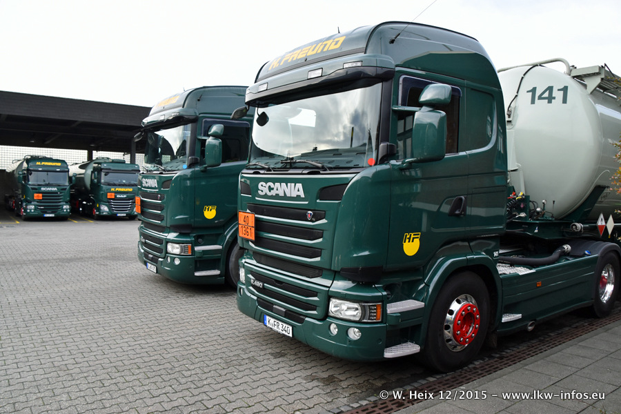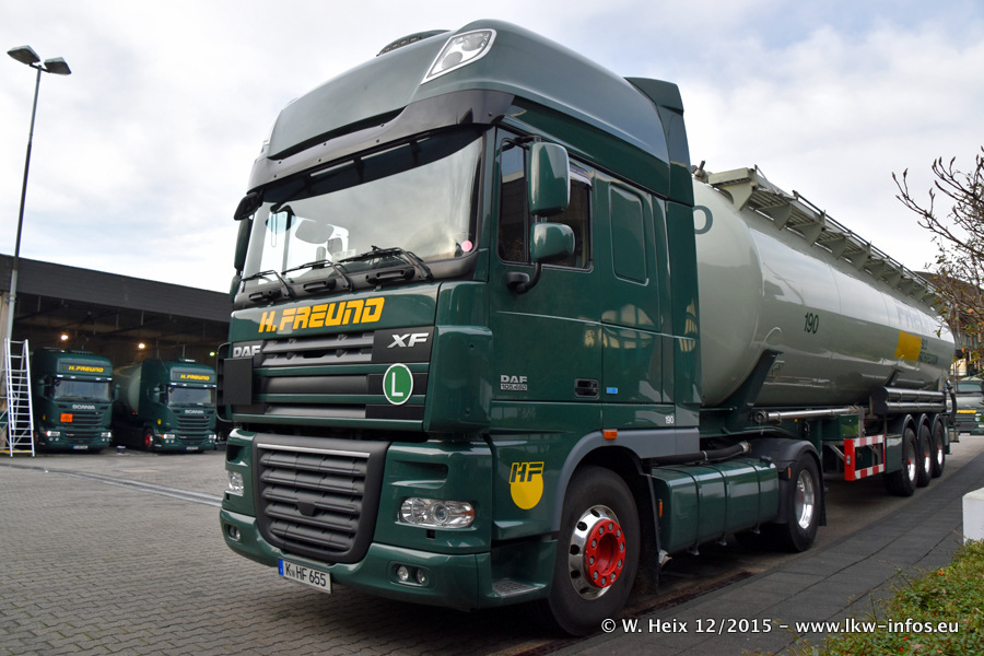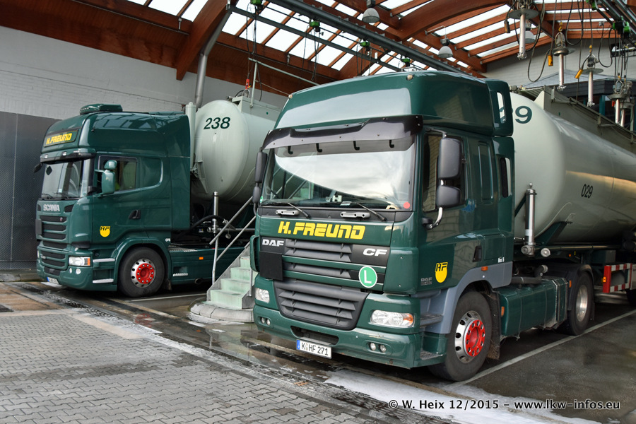 Ich war zum ersten Mal bei der Spedition H. Freund in Frechen zu Besuch. Der Fuhrpark besteht zur Zeit aus rund 160 LKW, die natürlich nie alle zusammen auf dem Firmengelände stehen, das würde der Platz auch nicht zulassen. Der größte Teil der Zugmaschinen ist von DAF, aber auch Scania ist stark vertreten. Dazu kommen noch LKW von Mercedes-Benz und Volvo. Die von mir fotografierten älteren Zugmaschinene (DAF CF 1, DAF 95 XF) sind nicht mehr im täglichen Einsatz, werden aber noch gebraucht, wenn ein Ersatzfahrzeug benötigt wird.