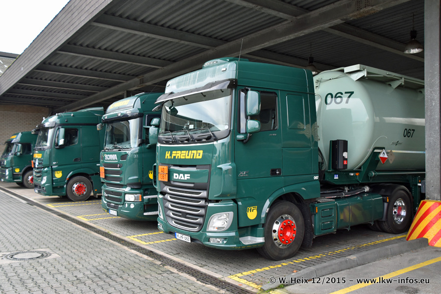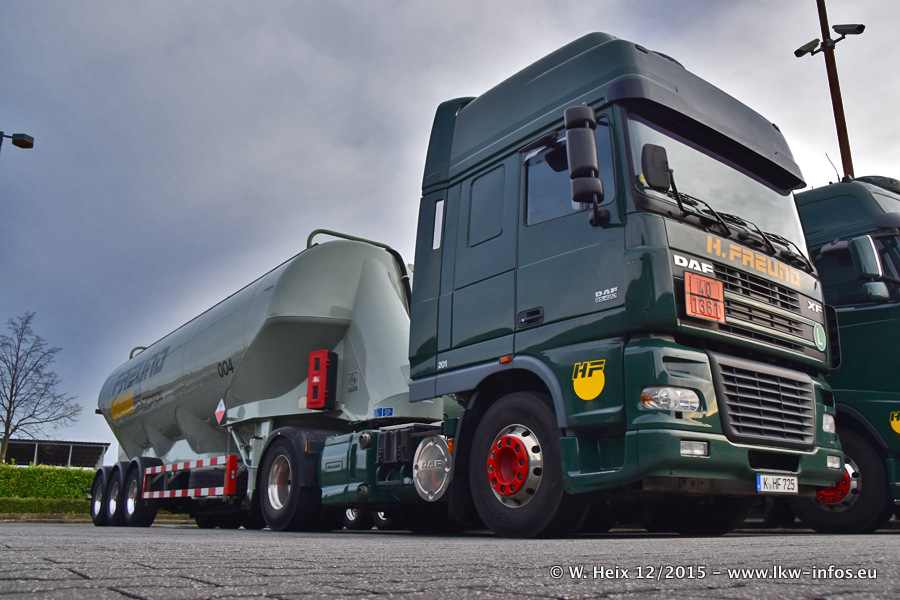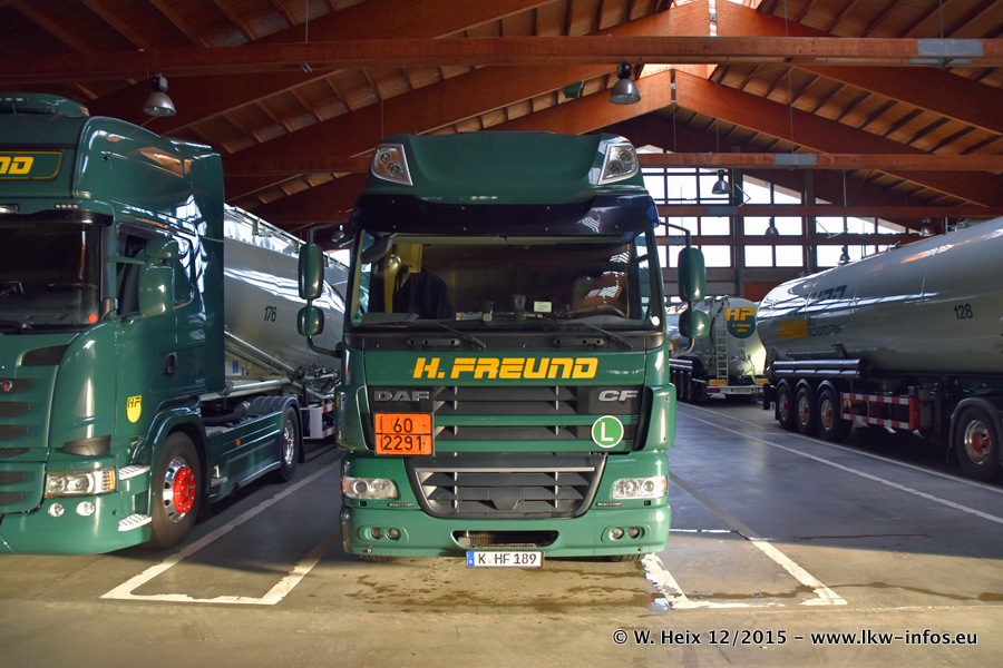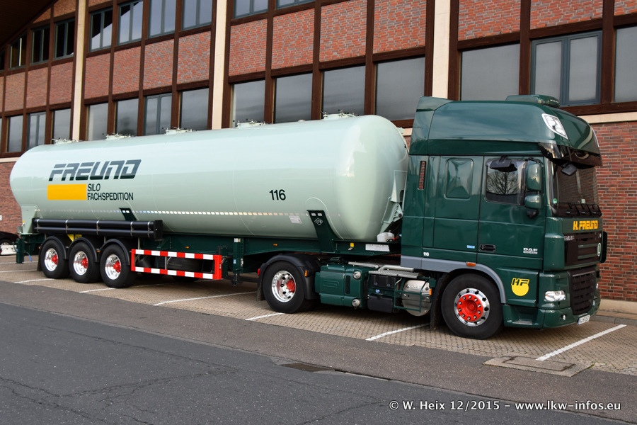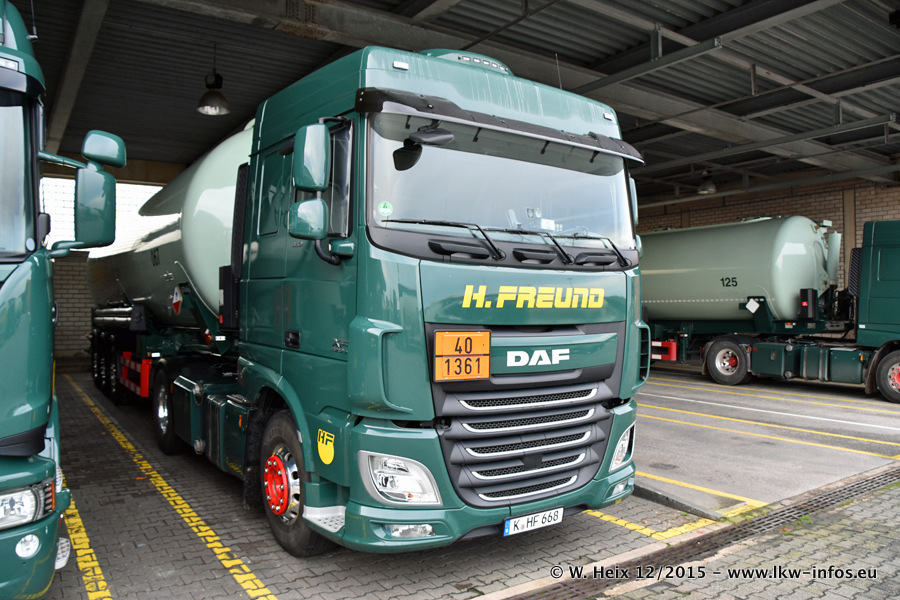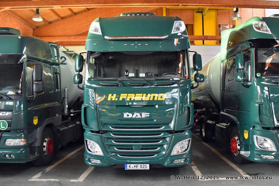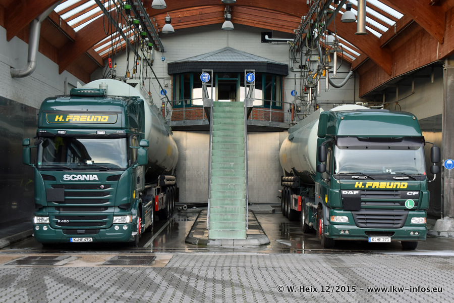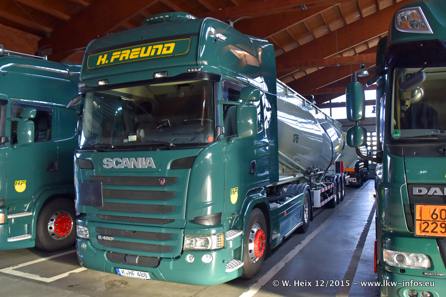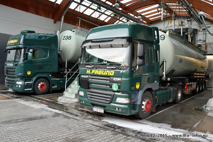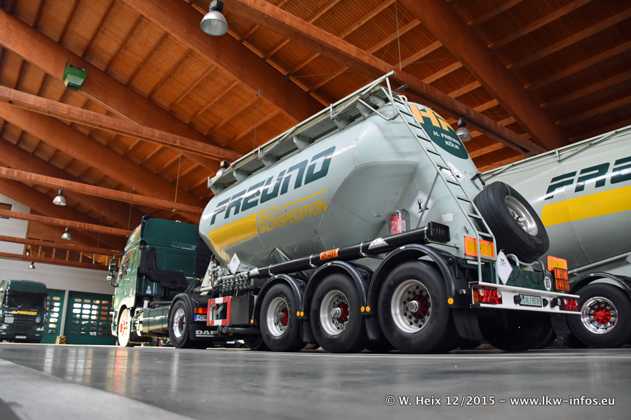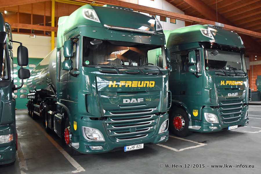 Ich war zum ersten Mal bei der Spedition H. Freund in Frechen zu Besuch. Der Fuhrpark besteht zur Zeit aus rund 160 LKW, die natürlich nie alle zusammen auf dem Firmengelände stehen, das würde der Platz auch nicht zulassen. Der größte Teil der Zugmaschinen ist von DAF, aber auch Scania ist stark vertreten. Dazu kommen noch LKW von Mercedes-Benz und Volvo. Die von mir fotografierten älteren Zugmaschinene (DAF CF 1, DAF 95 XF) sind nicht mehr im täglichen Einsatz, werden aber noch gebraucht, wenn ein Ersatzfahrzeug benötigt wird.