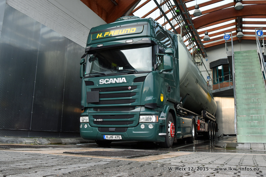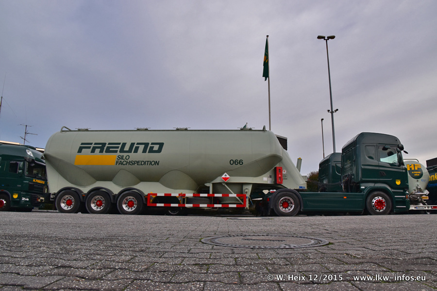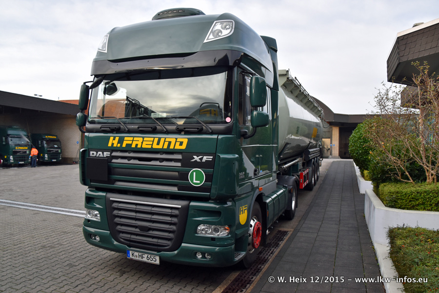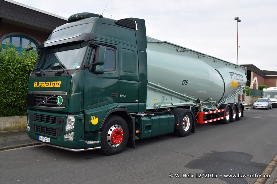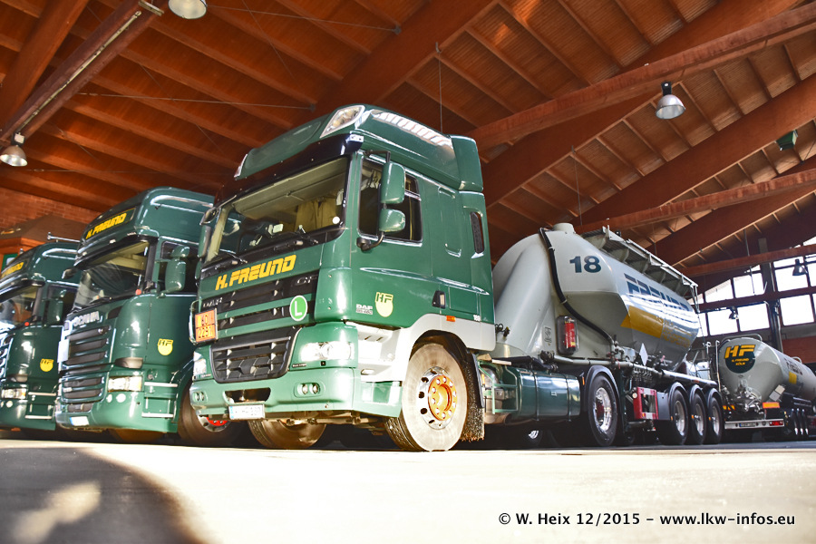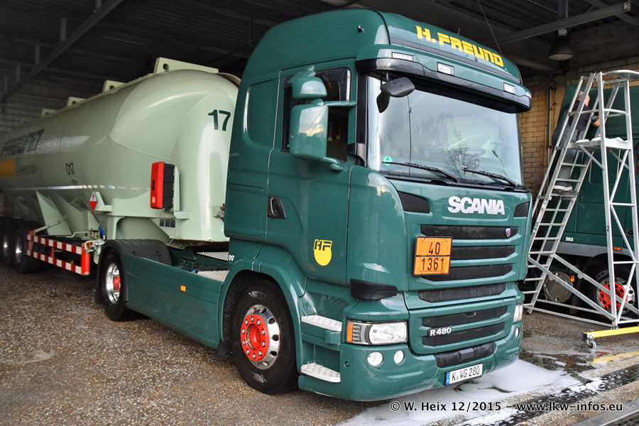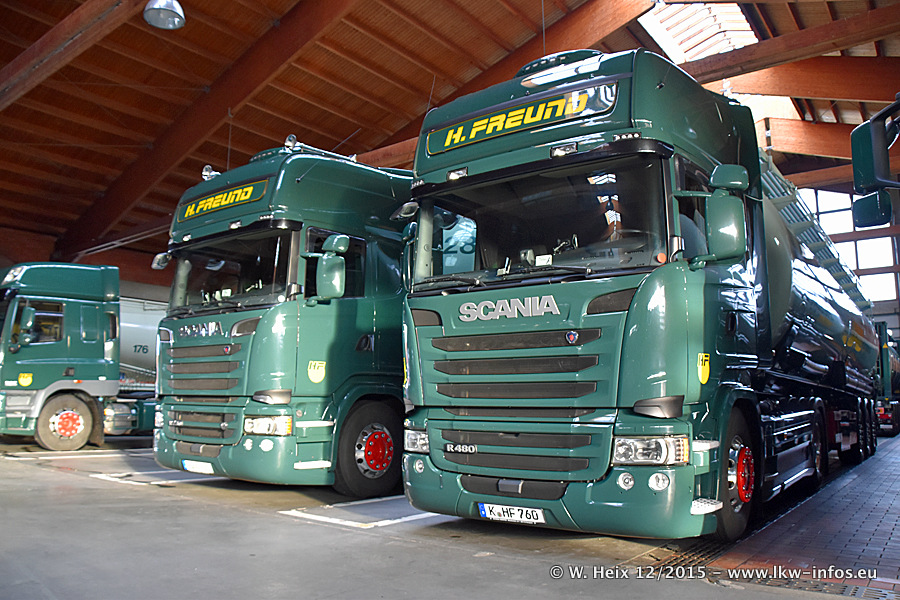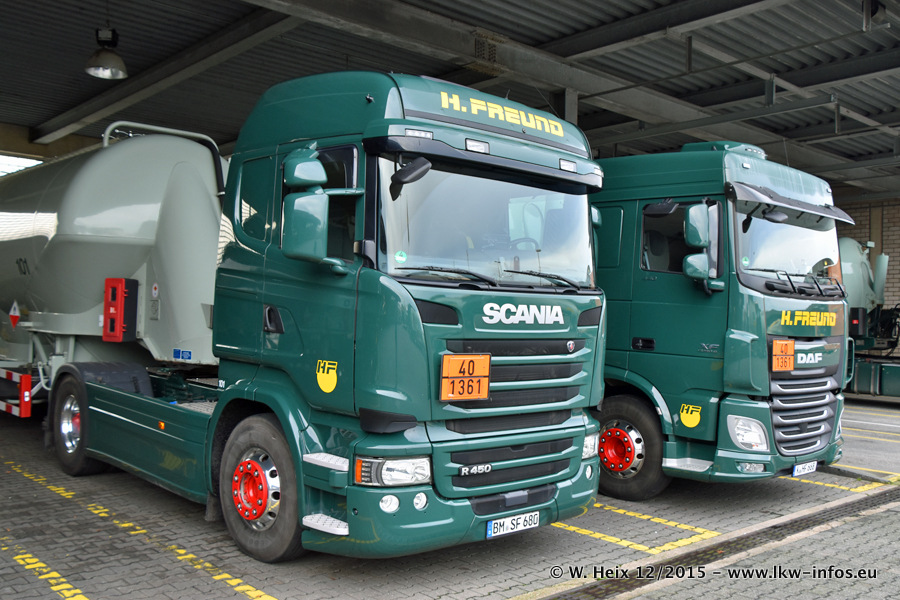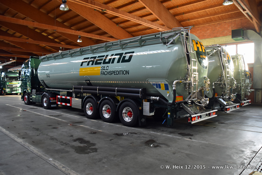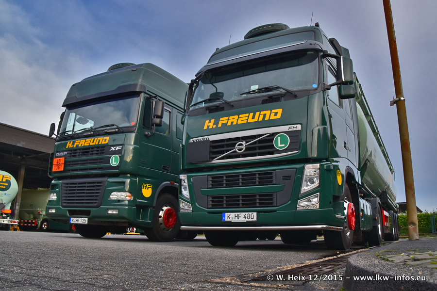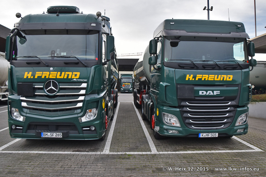 Ich war zum ersten Mal bei der Spedition H. Freund in Frechen zu Besuch. Der Fuhrpark besteht zur Zeit aus rund 160 LKW, die natürlich nie alle zusammen auf dem Firmengelände stehen, das würde der Platz auch nicht zulassen. Der größte Teil der Zugmaschinen ist von DAF, aber auch Scania ist stark vertreten. Dazu kommen noch LKW von Mercedes-Benz und Volvo. Die von mir fotografierten älteren Zugmaschinene (DAF CF 1, DAF 95 XF) sind nicht mehr im täglichen Einsatz, werden aber noch gebraucht, wenn ein Ersatzfahrzeug benötigt wird.