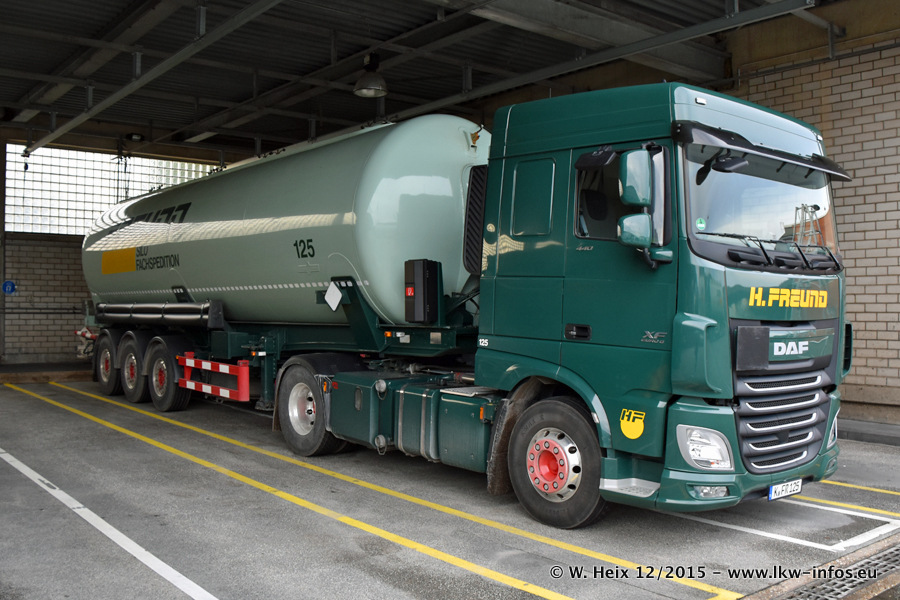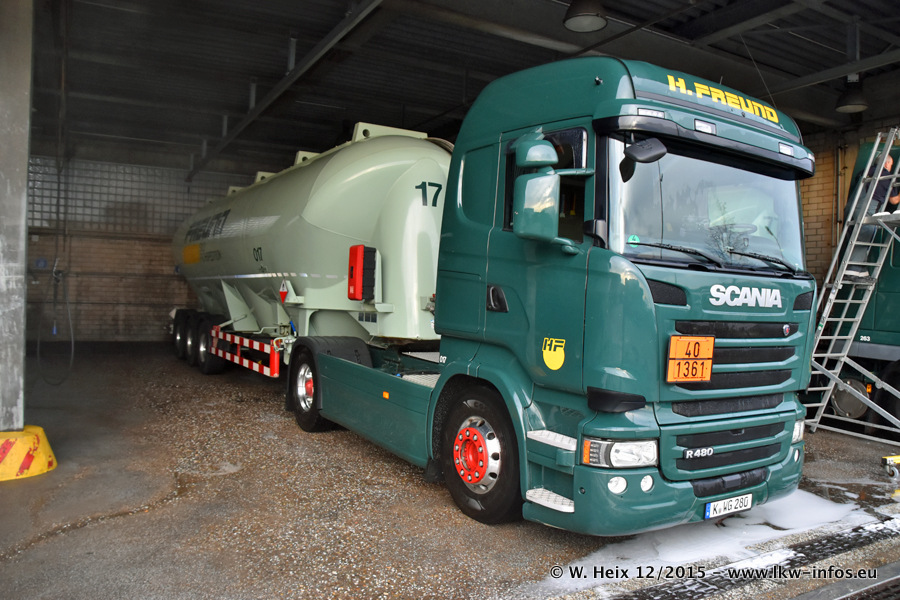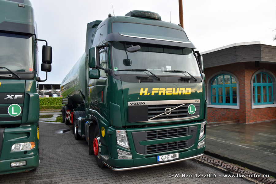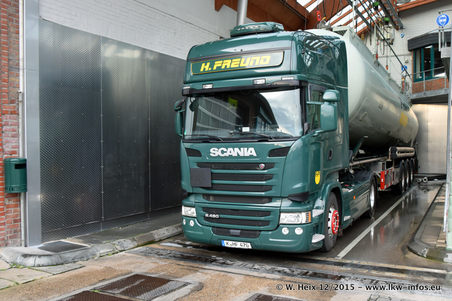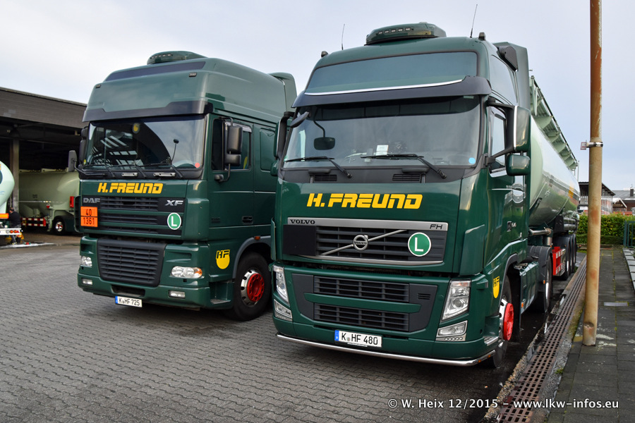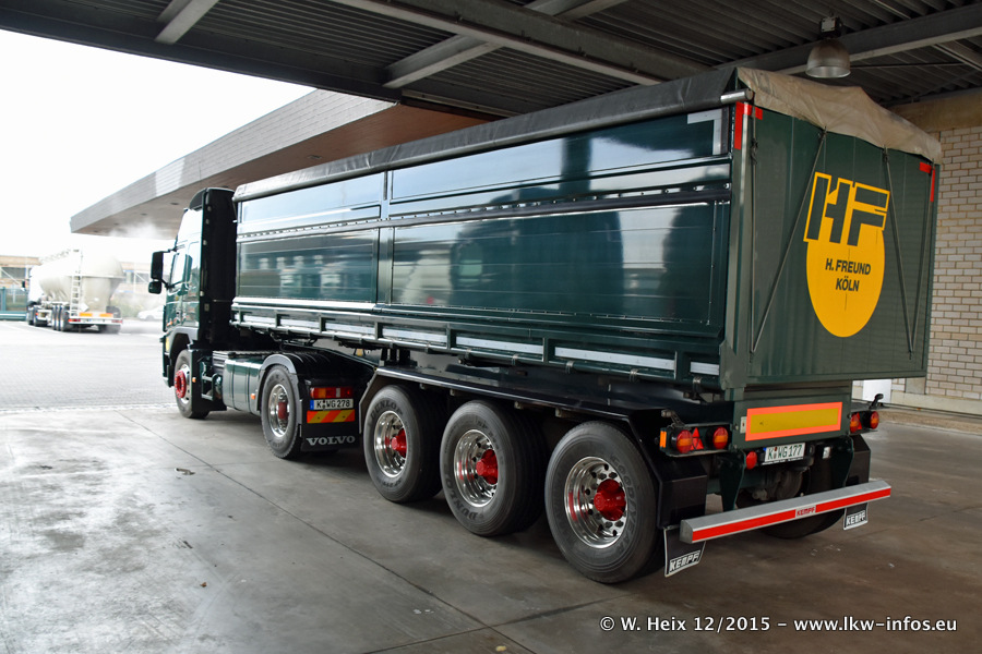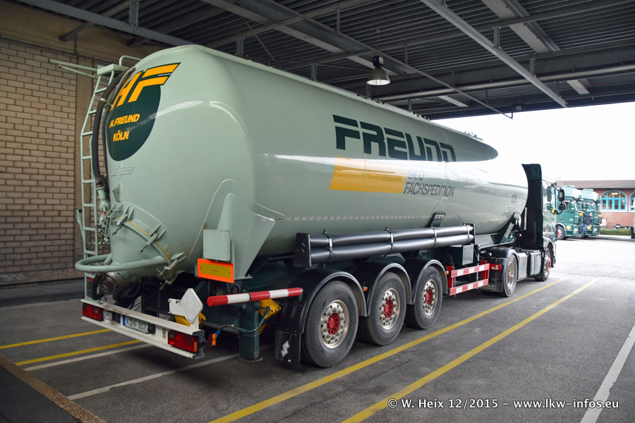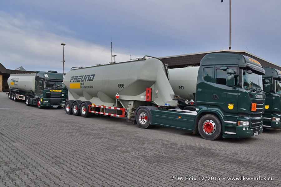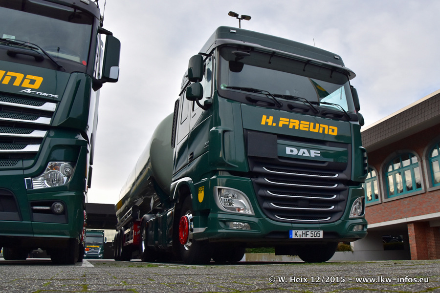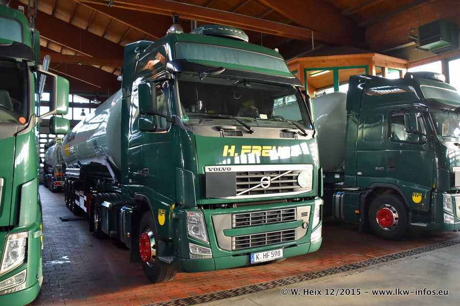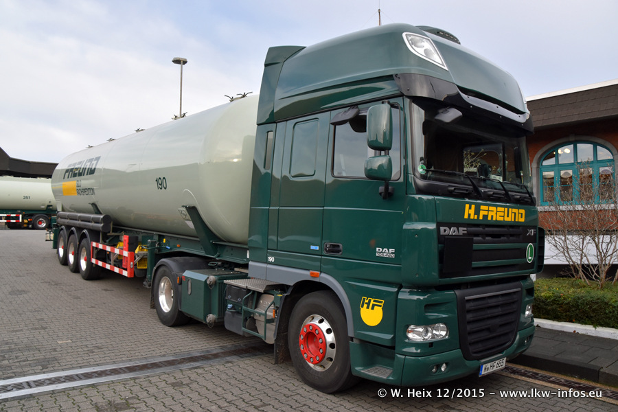 Ich war zum ersten Mal bei der Spedition H. Freund in Frechen zu Besuch. Der Fuhrpark besteht zur Zeit aus rund 160 LKW, die natürlich nie alle zusammen auf dem Firmengelände stehen, das würde der Platz auch nicht zulassen. Der größte Teil der Zugmaschinen ist von DAF, aber auch Scania ist stark vertreten. Dazu kommen noch LKW von Mercedes-Benz und Volvo. Die von mir fotografierten älteren Zugmaschinene (DAF CF 1, DAF 95 XF) sind nicht mehr im täglichen Einsatz, werden aber noch gebraucht, wenn ein Ersatzfahrzeug benötigt wird.