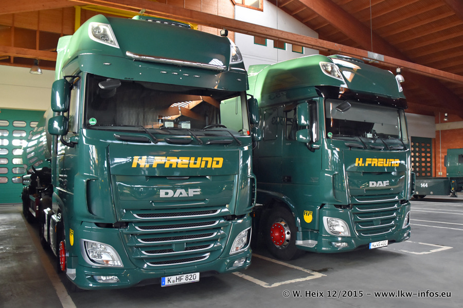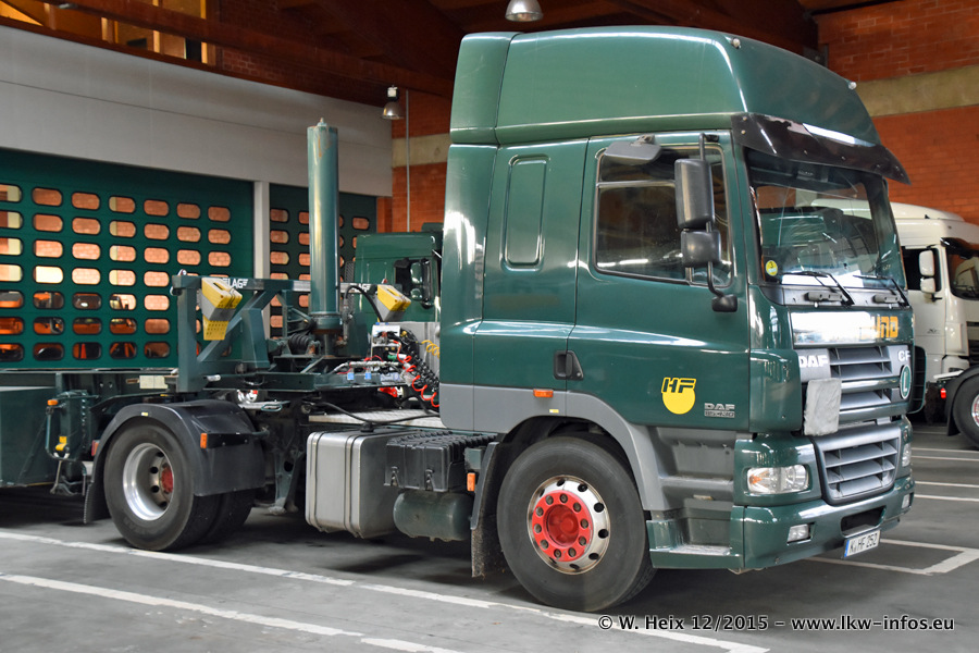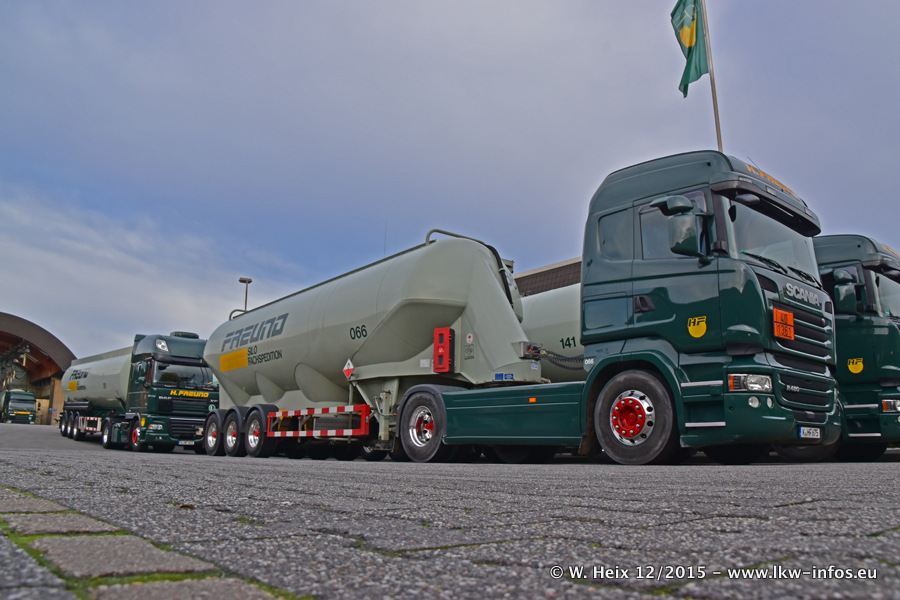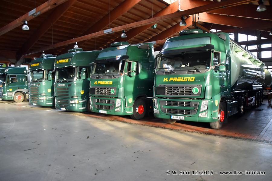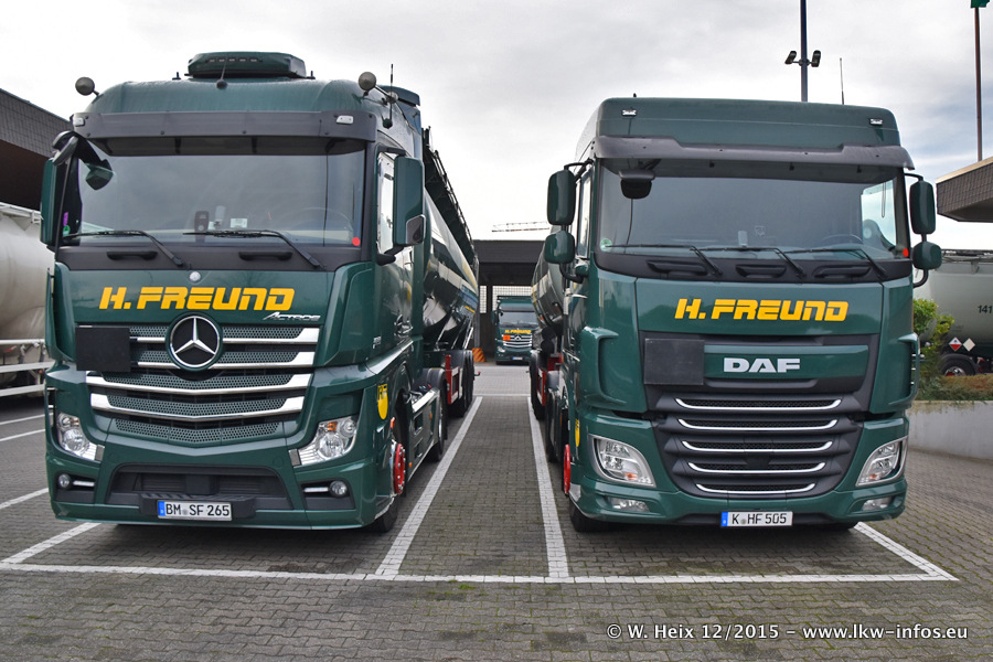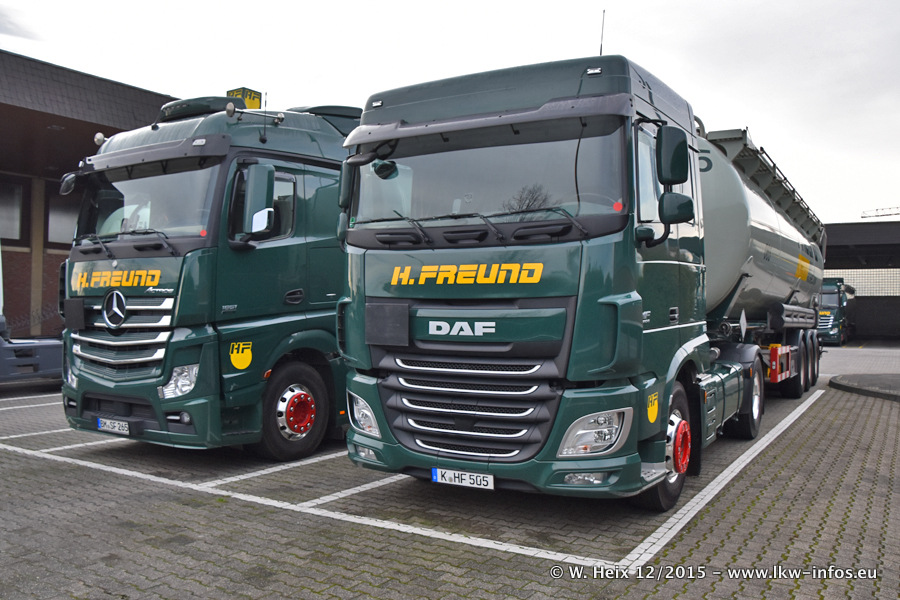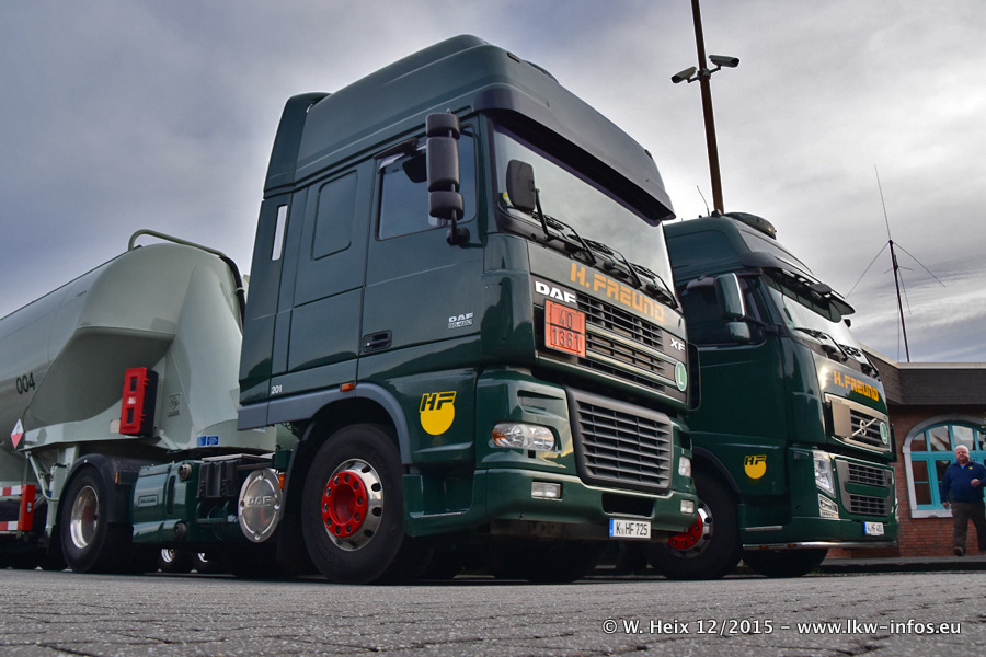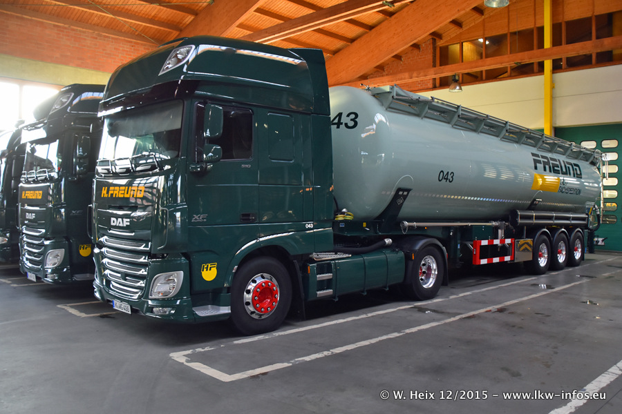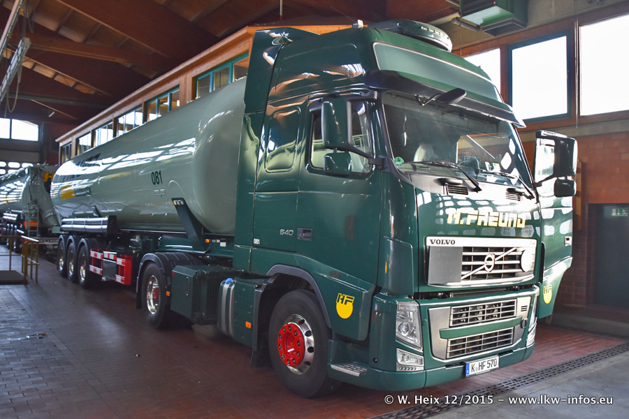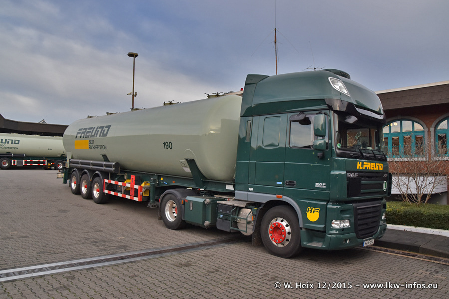 Ich war zum ersten Mal bei der Spedition H. Freund in Frechen zu Besuch. Der Fuhrpark besteht zur Zeit aus rund 160 LKW, die natürlich nie alle zusammen auf dem Firmengelände stehen, das würde der Platz auch nicht zulassen. Der größte Teil der Zugmaschinen ist von DAF, aber auch Scania ist stark vertreten. Dazu kommen noch LKW von Mercedes-Benz und Volvo. Die von mir fotografierten älteren Zugmaschinene (DAF CF 1, DAF 95 XF) sind nicht mehr im täglichen Einsatz, werden aber noch gebraucht, wenn ein Ersatzfahrzeug benötigt wird.