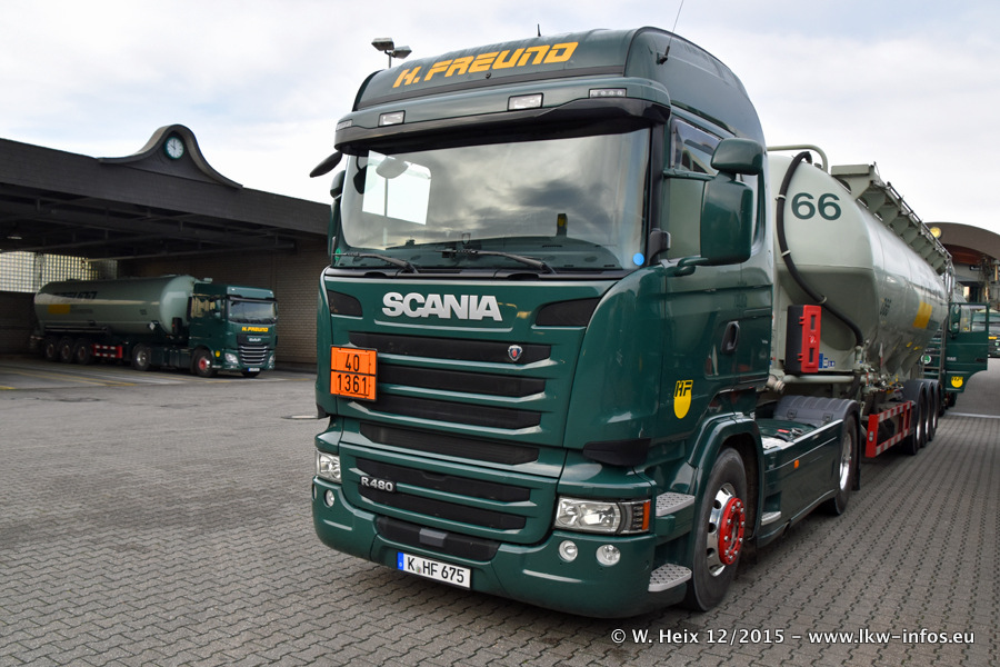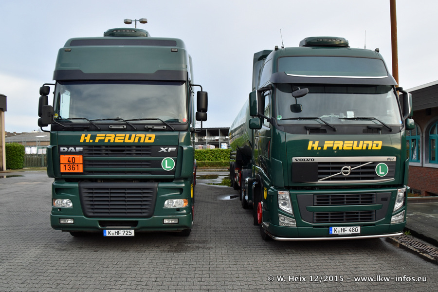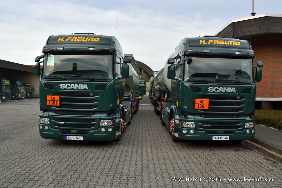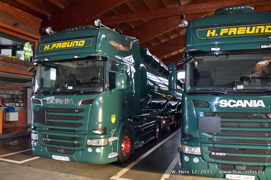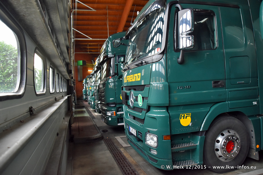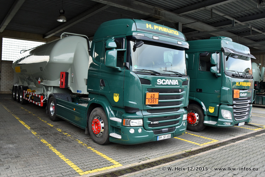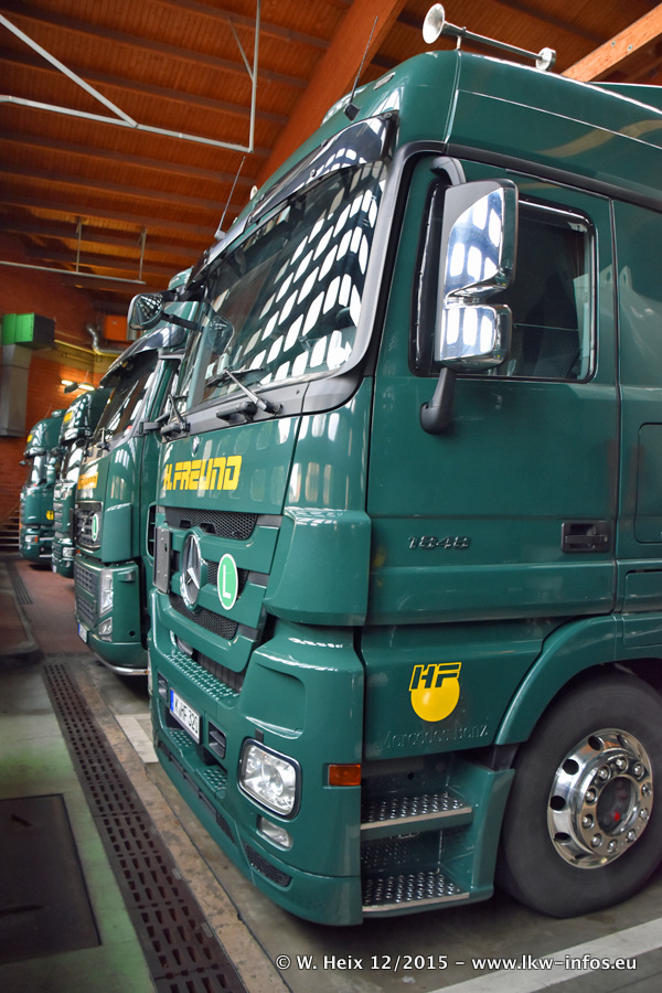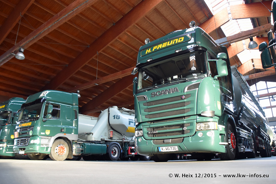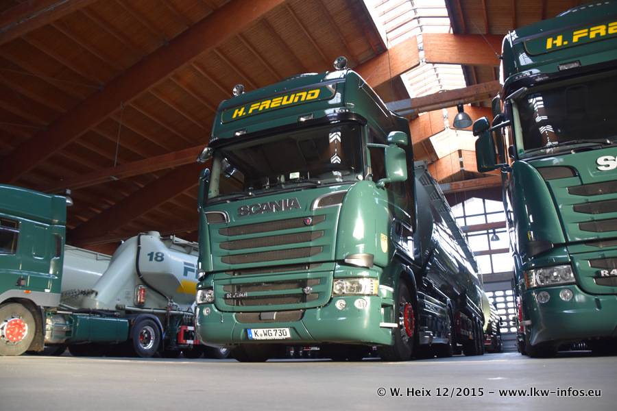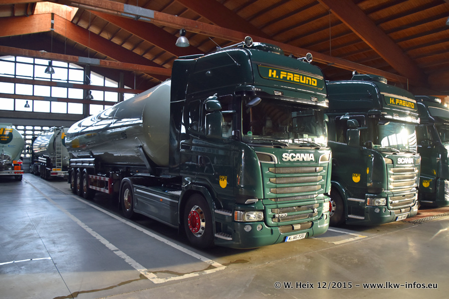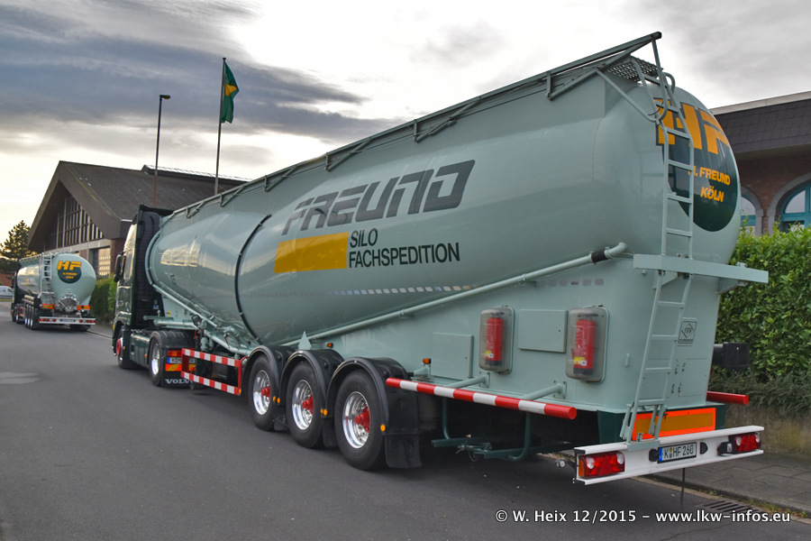 Ich war zum ersten Mal bei der Spedition H. Freund in Frechen zu Besuch. Der Fuhrpark besteht zur Zeit aus rund 160 LKW, die natürlich nie alle zusammen auf dem Firmengelände stehen, das würde der Platz auch nicht zulassen. Der größte Teil der Zugmaschinen ist von DAF, aber auch Scania ist stark vertreten. Dazu kommen noch LKW von Mercedes-Benz und Volvo. Die von mir fotografierten älteren Zugmaschinene (DAF CF 1, DAF 95 XF) sind nicht mehr im täglichen Einsatz, werden aber noch gebraucht, wenn ein Ersatzfahrzeug benötigt wird.