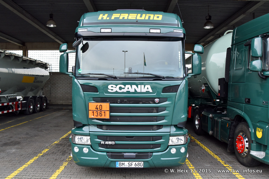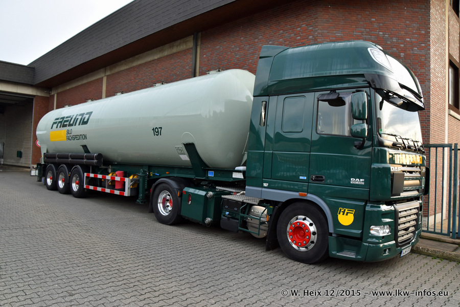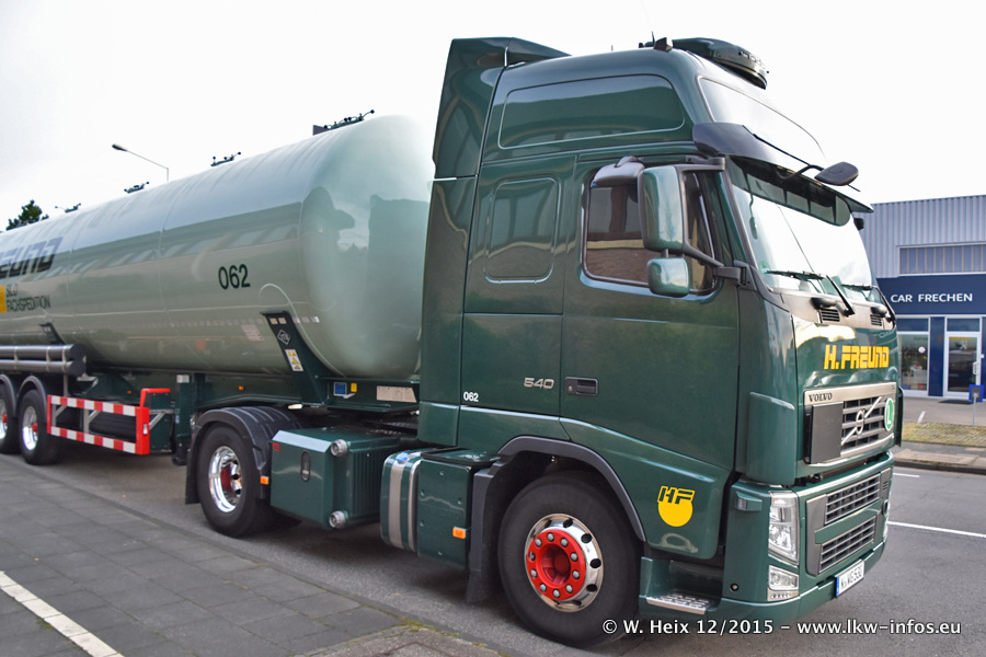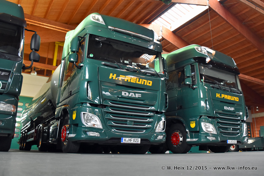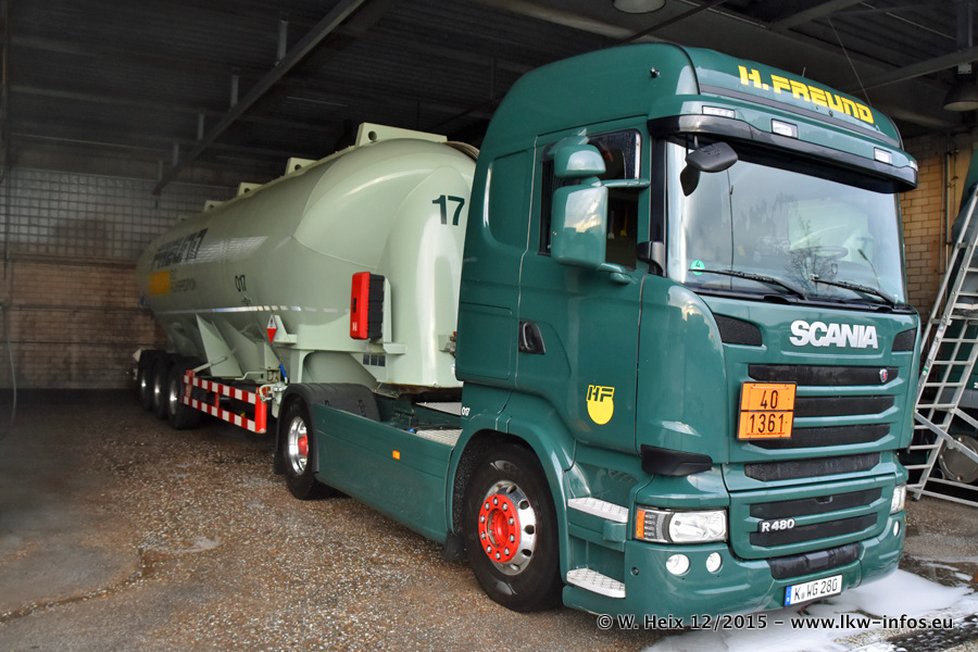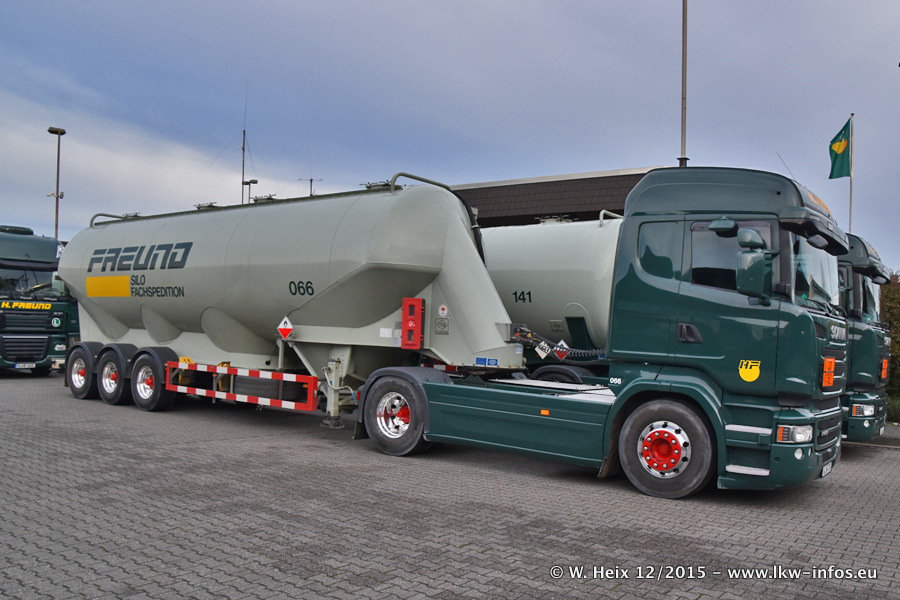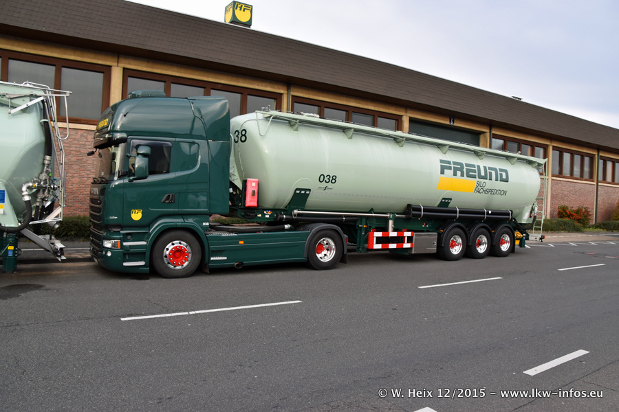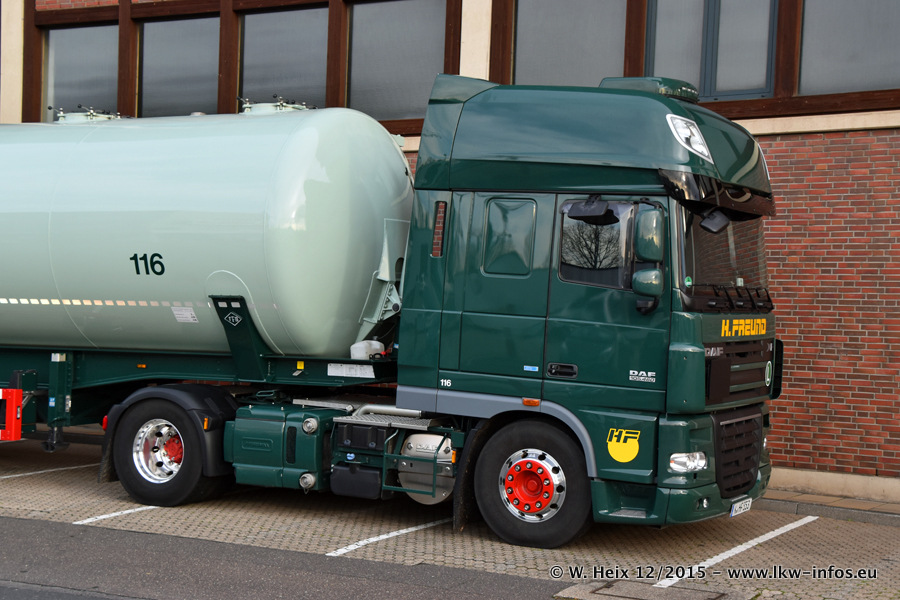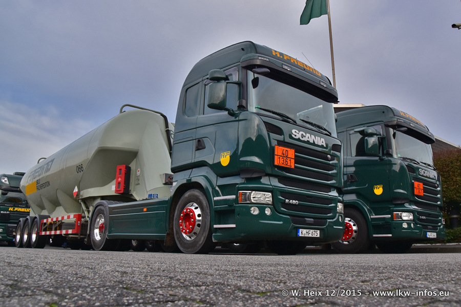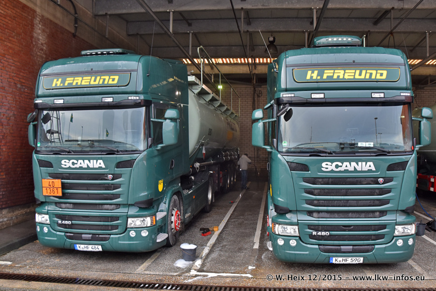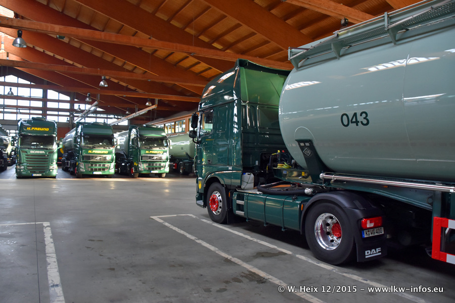 Ich war zum ersten Mal bei der Spedition H. Freund in Frechen zu Besuch. Der Fuhrpark besteht zur Zeit aus rund 160 LKW, die natürlich nie alle zusammen auf dem Firmengelände stehen, das würde der Platz auch nicht zulassen. Der größte Teil der Zugmaschinen ist von DAF, aber auch Scania ist stark vertreten. Dazu kommen noch LKW von Mercedes-Benz und Volvo. Die von mir fotografierten älteren Zugmaschinene (DAF CF 1, DAF 95 XF) sind nicht mehr im täglichen Einsatz, werden aber noch gebraucht, wenn ein Ersatzfahrzeug benötigt wird.