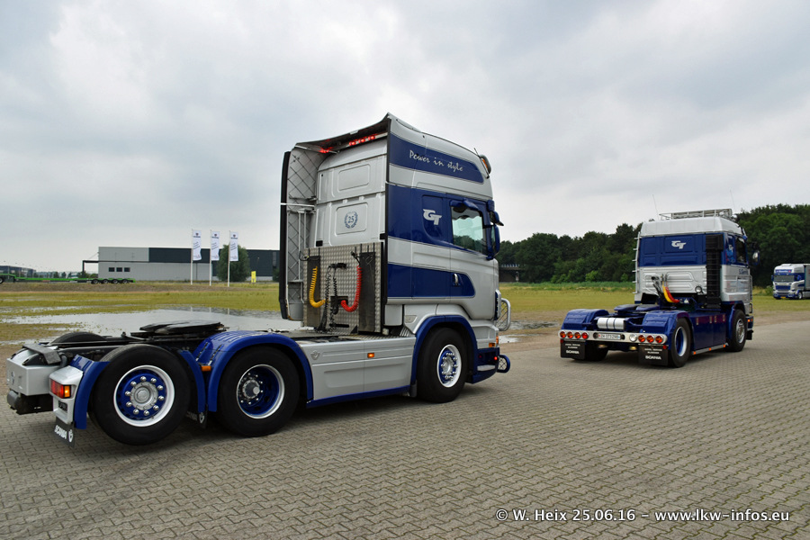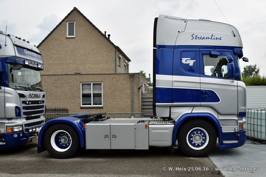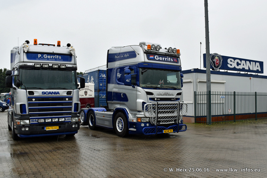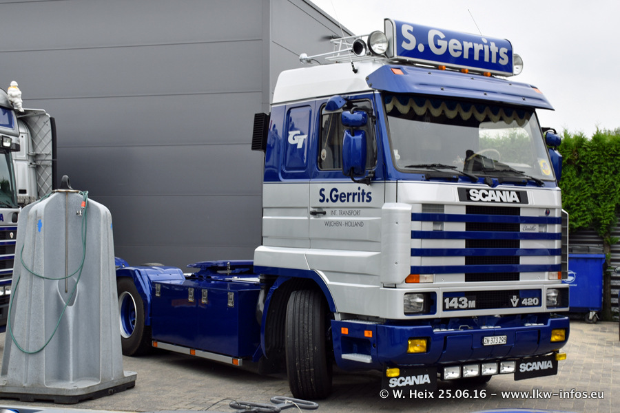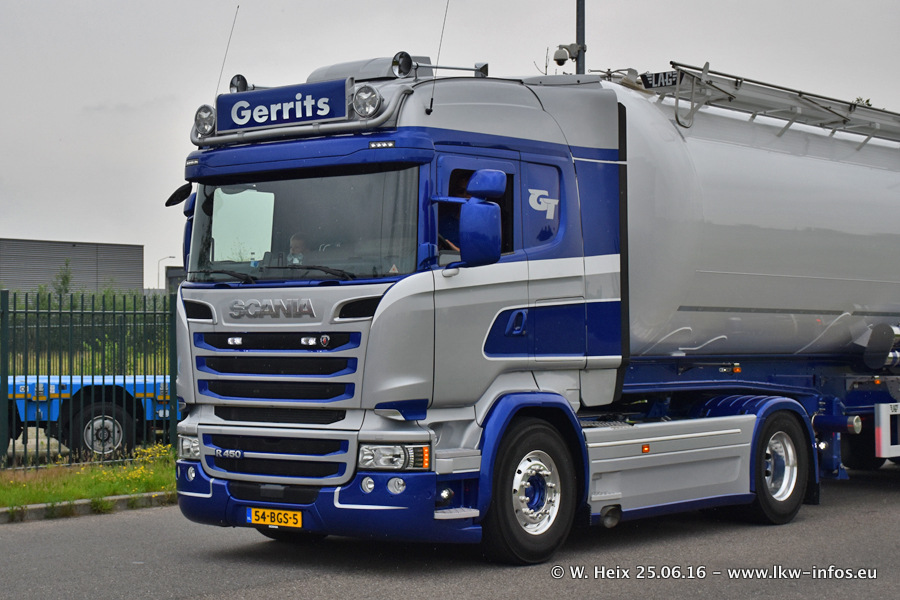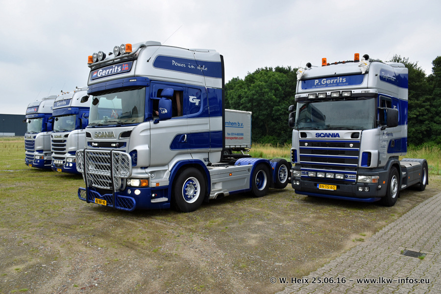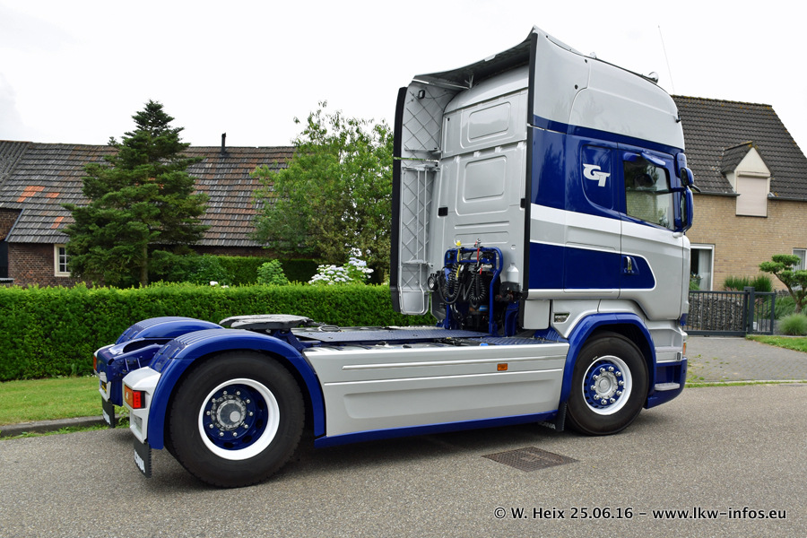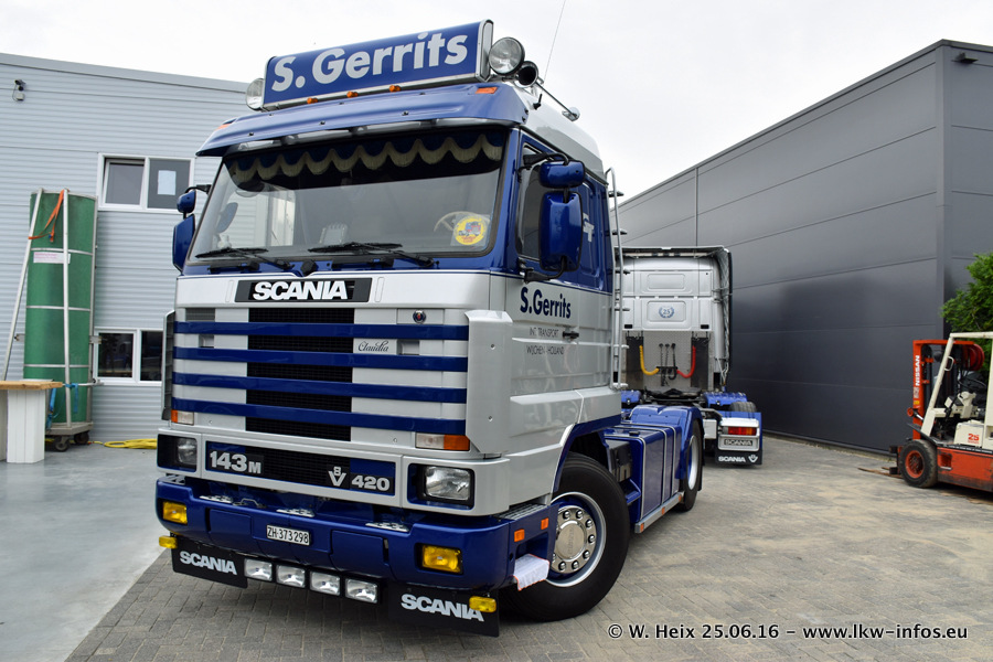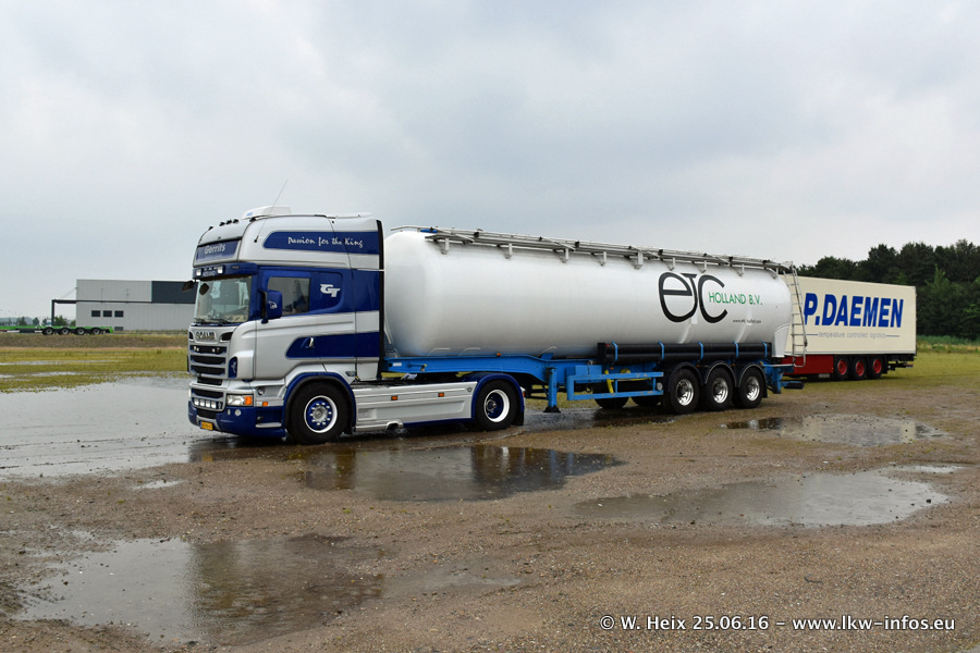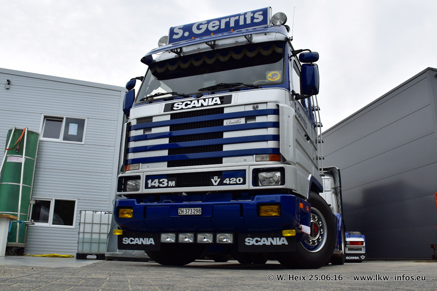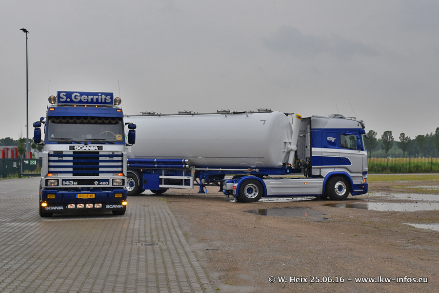 Peter Gerrits hatte mich zum Fotoshooting eingeladen, denn an diesem Samstag hatte er organisiert, dass alle neun LKW zuhause in Wijchen sind. Das Fotoshooting fand auf dem Gelände von Scania Benelux, Wijchen statt. Der Scania 143 V8 Streamline ist inzwischen fest in Zürüch (CH) und einige der V8-Scania sind regelmässig in Norwegen unterwegs und selteh zuhause. Anfang Juni kam übrigens der neute LKW in den Fuhrpark, ein Scania R 450 Streamline Euro 6. Neu ist auch ein Siloauflieger, den Gerrits vor einigen Wochen schon bekommen hat. Das Chassis ist blau lackiert, passend zu den Zugmaschinen. Außerdem hat der neue Auflieger Alufelgen, passend zur Scania-Zugmaschine. Insgesamt eine tolle Kombination. Leider hat das Wetter nicht mitgespielt, denn pünktlich zum eigentlichen Fotoshooting begann es zu regnen und der Regen wurde immer stärker. Trotzdem sind viele schöne Bilder entstanden! Der neue Scania ist übrigens auch schon auf den ersten Bildern in der Galerie zu sehen, zuhause vor dem kleinen Firmenhof in Wijchen.