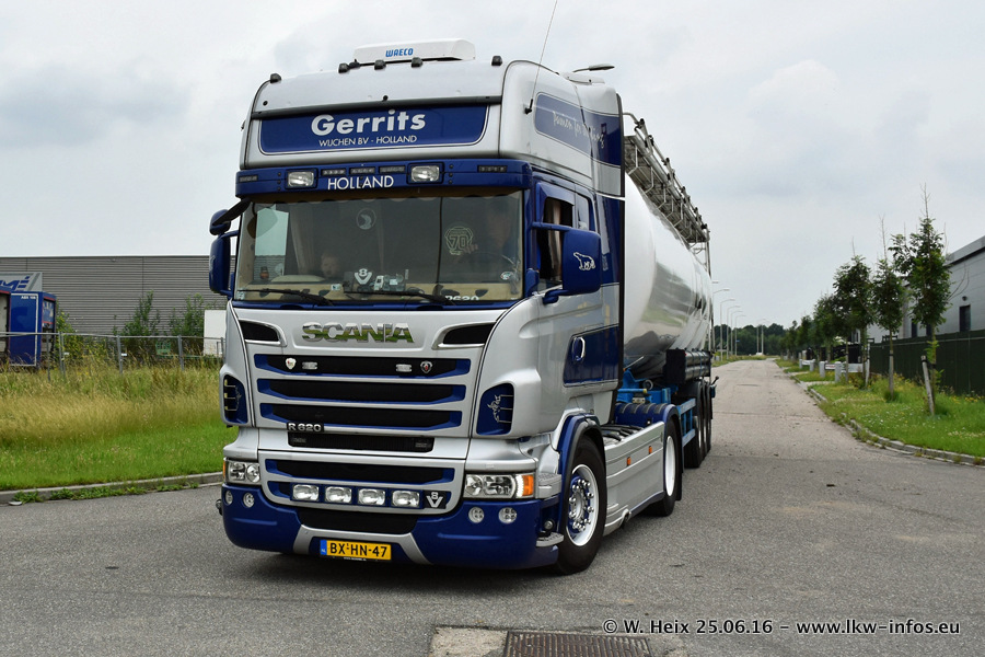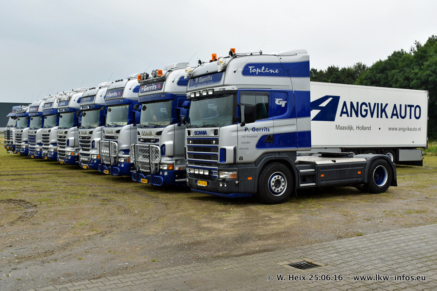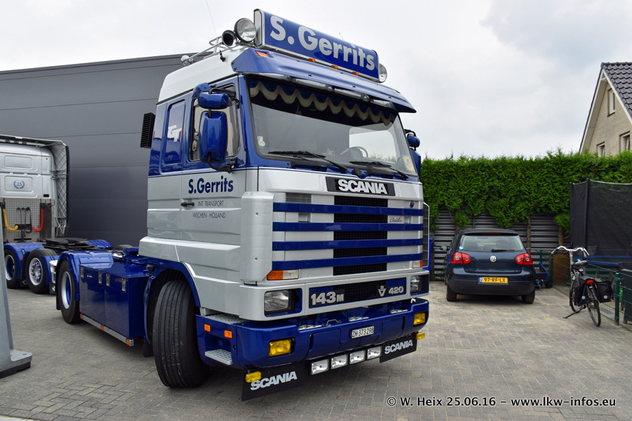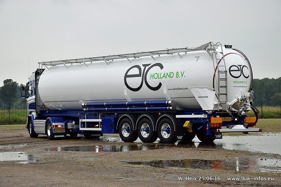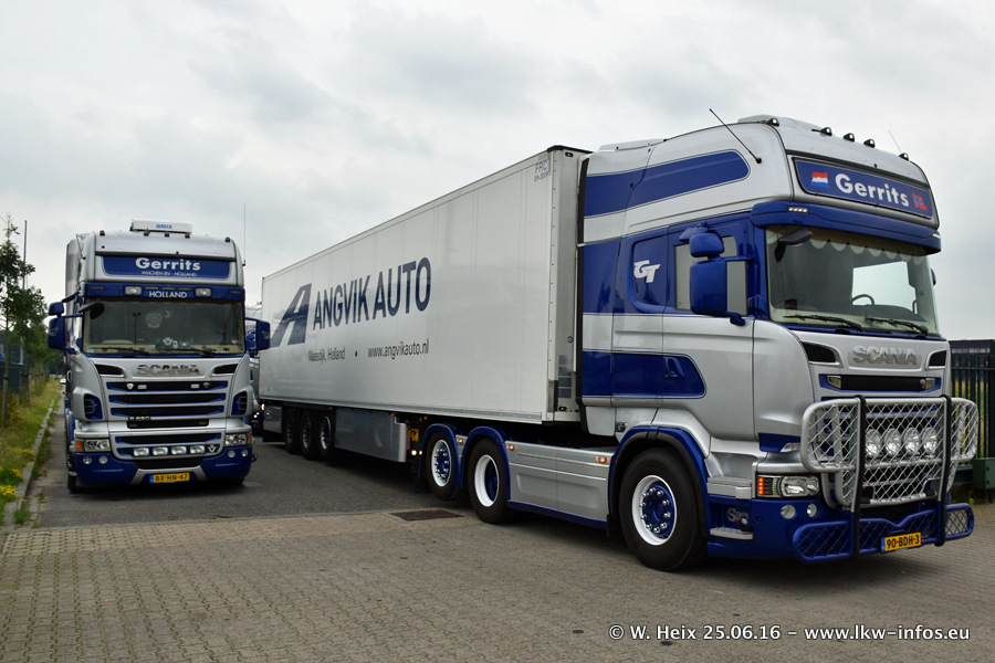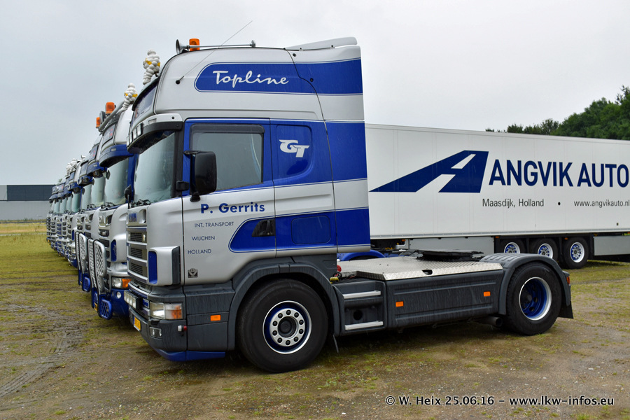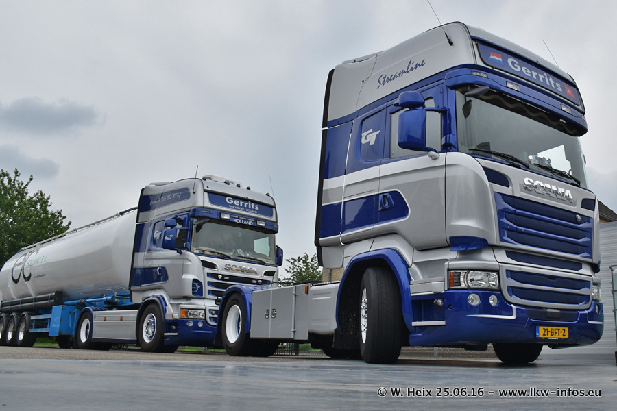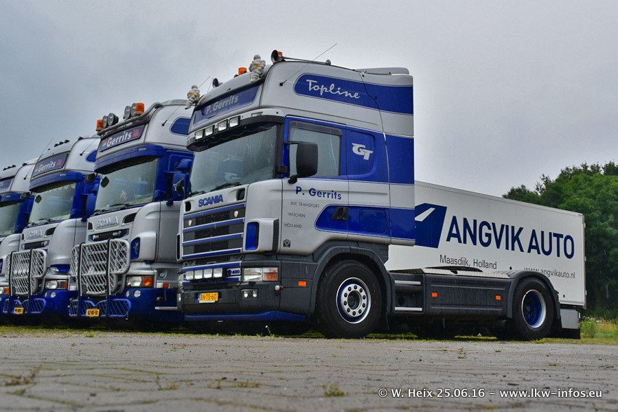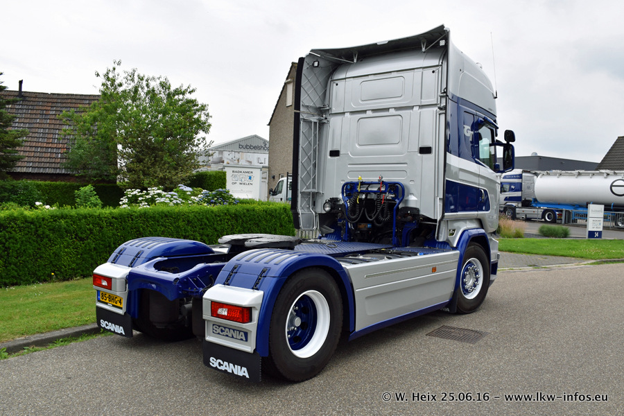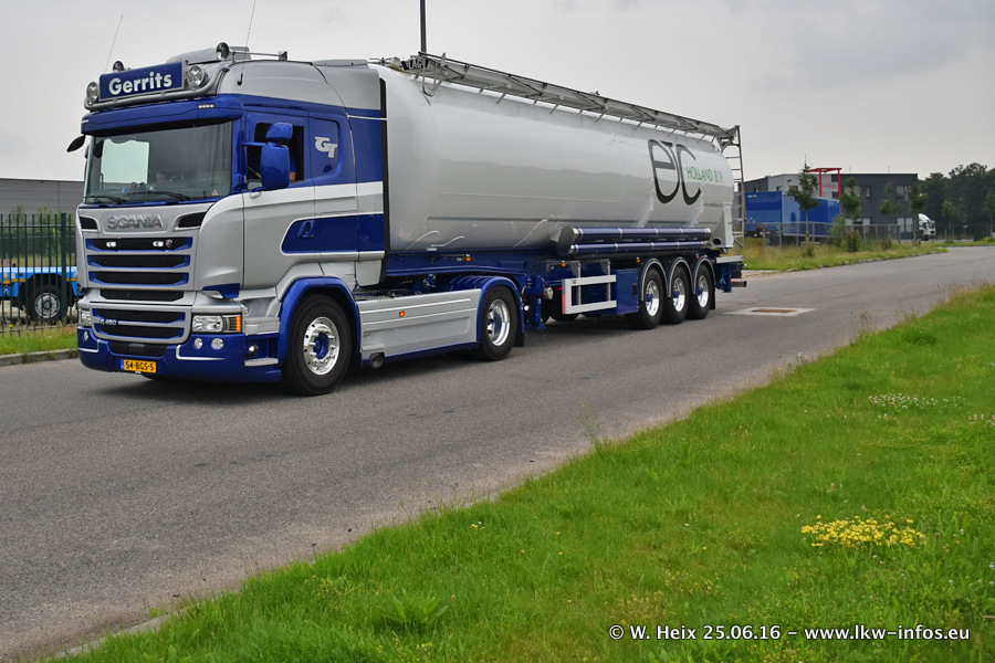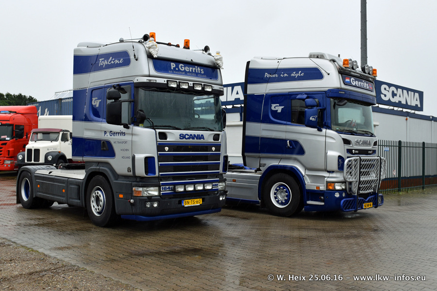 Peter Gerrits hatte mich zum Fotoshooting eingeladen, denn an diesem Samstag hatte er organisiert, dass alle neun LKW zuhause in Wijchen sind. Das Fotoshooting fand auf dem Gelände von Scania Benelux, Wijchen statt. Der Scania 143 V8 Streamline ist inzwischen fest in Zürüch (CH) und einige der V8-Scania sind regelmässig in Norwegen unterwegs und selteh zuhause. Anfang Juni kam übrigens der neute LKW in den Fuhrpark, ein Scania R 450 Streamline Euro 6. Neu ist auch ein Siloauflieger, den Gerrits vor einigen Wochen schon bekommen hat. Das Chassis ist blau lackiert, passend zu den Zugmaschinen. Außerdem hat der neue Auflieger Alufelgen, passend zur Scania-Zugmaschine. Insgesamt eine tolle Kombination. Leider hat das Wetter nicht mitgespielt, denn pünktlich zum eigentlichen Fotoshooting begann es zu regnen und der Regen wurde immer stärker. Trotzdem sind viele schöne Bilder entstanden! Der neue Scania ist übrigens auch schon auf den ersten Bildern in der Galerie zu sehen, zuhause vor dem kleinen Firmenhof in Wijchen.