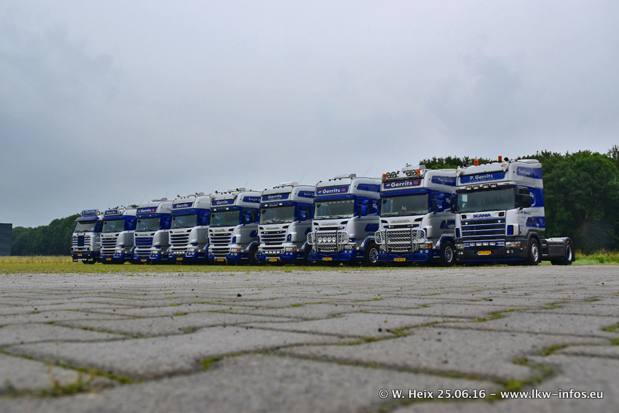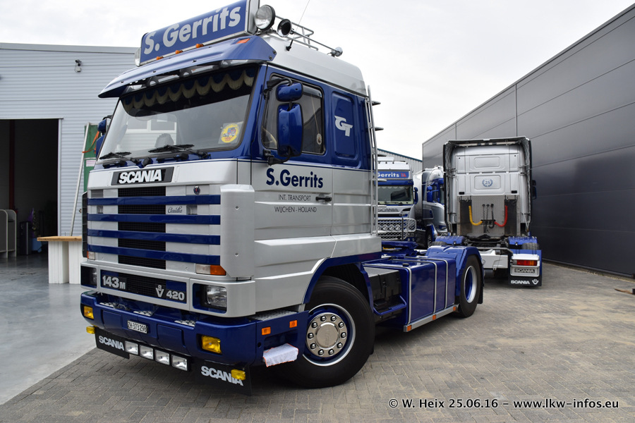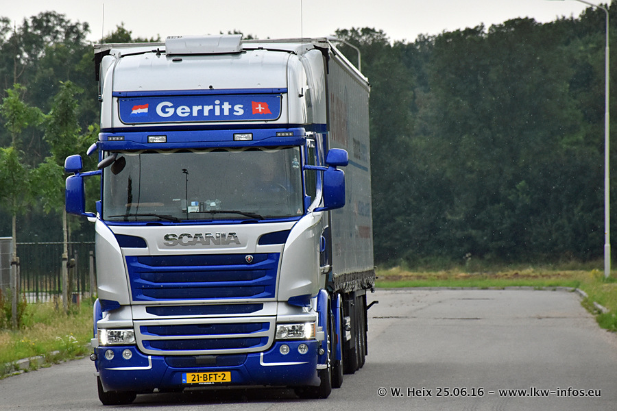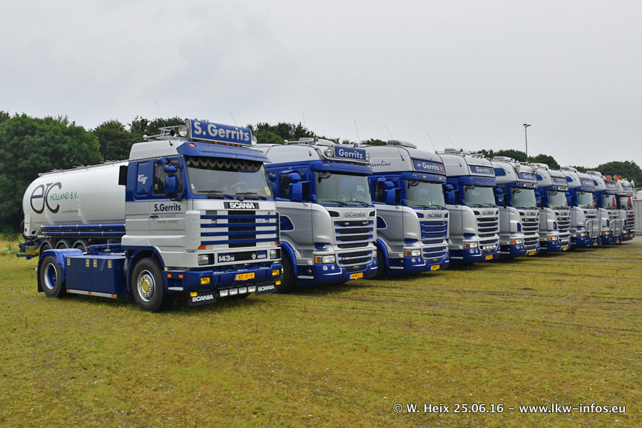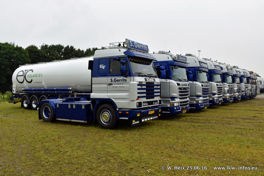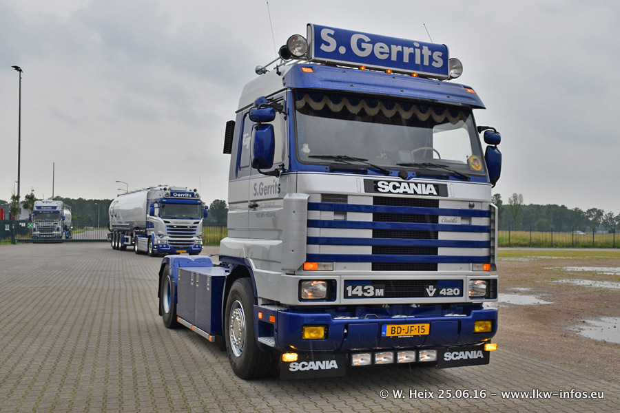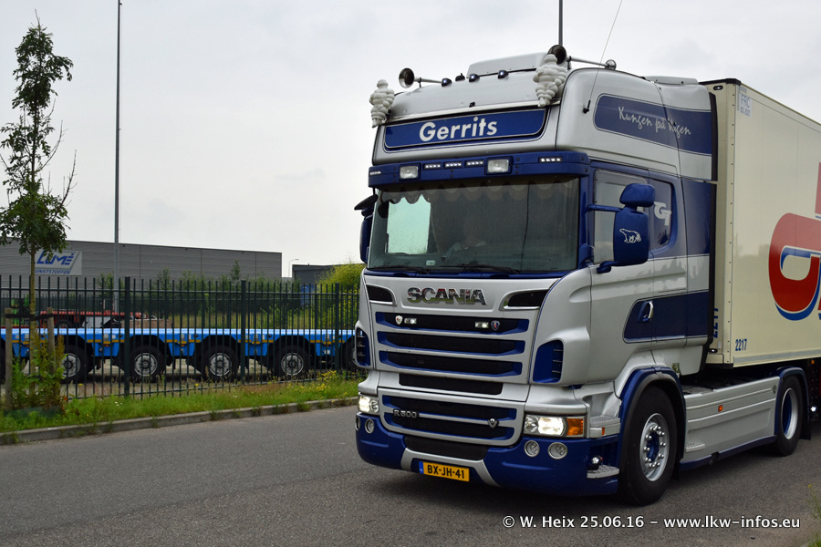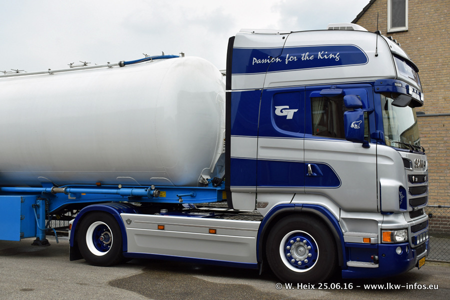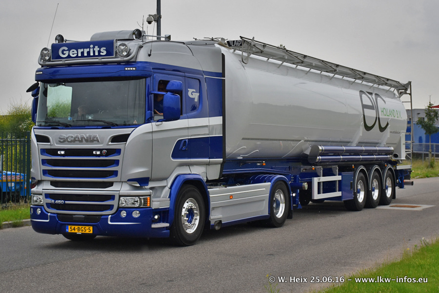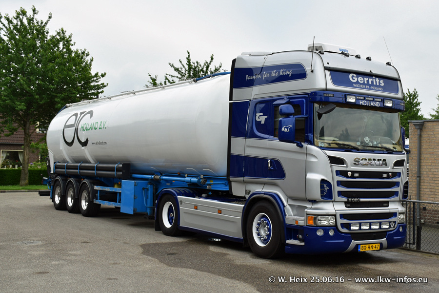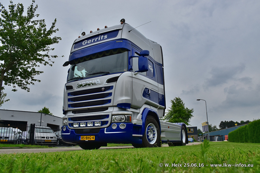 Peter Gerrits hatte mich zum Fotoshooting eingeladen, denn an diesem Samstag hatte er organisiert, dass alle neun LKW zuhause in Wijchen sind. Das Fotoshooting fand auf dem Gelände von Scania Benelux, Wijchen statt. Der Scania 143 V8 Streamline ist inzwischen fest in Zürüch (CH) und einige der V8-Scania sind regelmässig in Norwegen unterwegs und selteh zuhause. Anfang Juni kam übrigens der neute LKW in den Fuhrpark, ein Scania R 450 Streamline Euro 6. Neu ist auch ein Siloauflieger, den Gerrits vor einigen Wochen schon bekommen hat. Das Chassis ist blau lackiert, passend zu den Zugmaschinen. Außerdem hat der neue Auflieger Alufelgen, passend zur Scania-Zugmaschine. Insgesamt eine tolle Kombination. Leider hat das Wetter nicht mitgespielt, denn pünktlich zum eigentlichen Fotoshooting begann es zu regnen und der Regen wurde immer stärker. Trotzdem sind viele schöne Bilder entstanden! Der neue Scania ist übrigens auch schon auf den ersten Bildern in der Galerie zu sehen, zuhause vor dem kleinen Firmenhof in Wijchen.