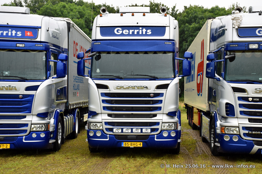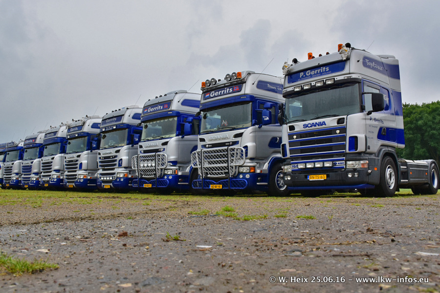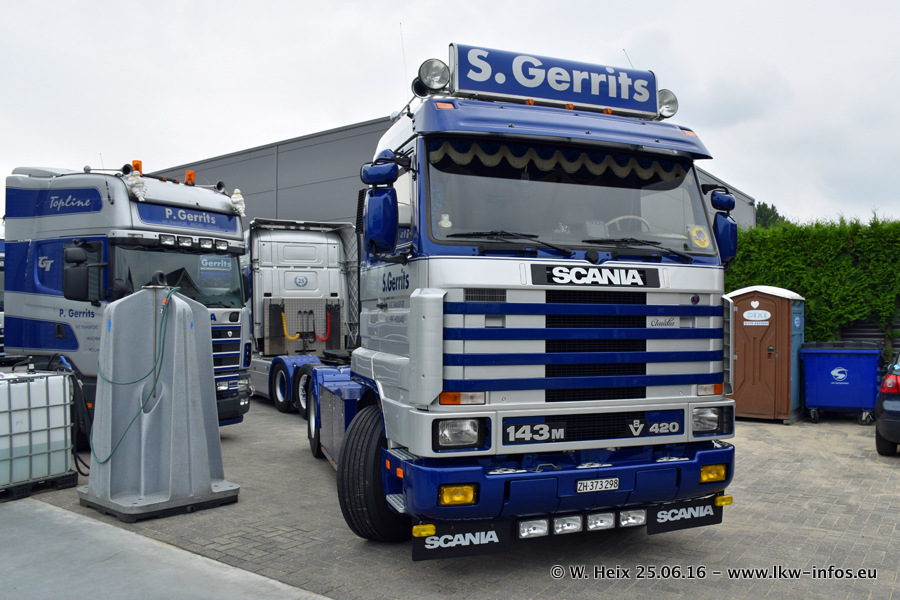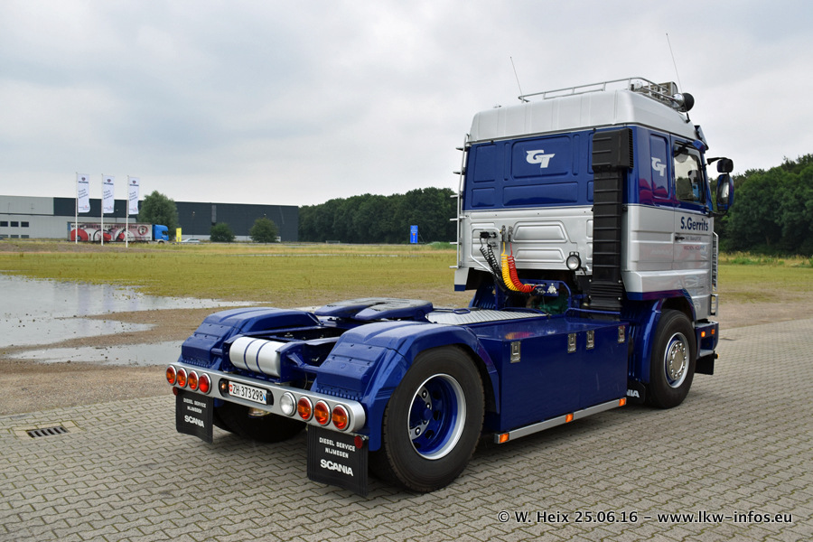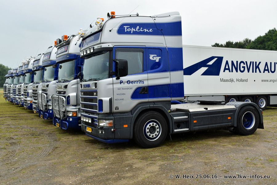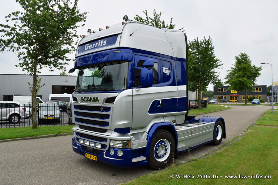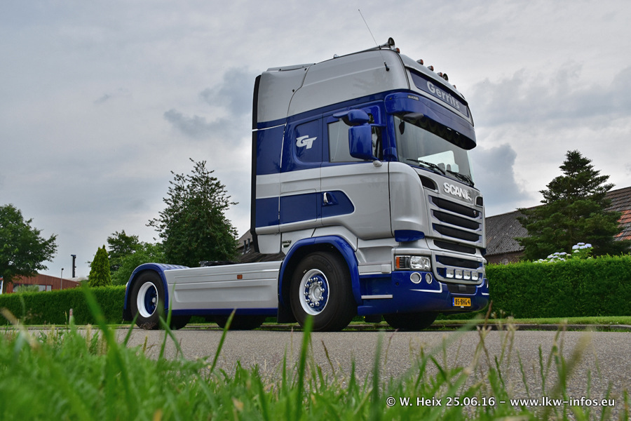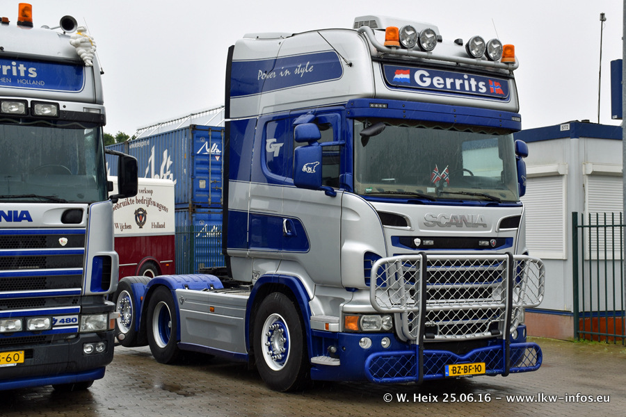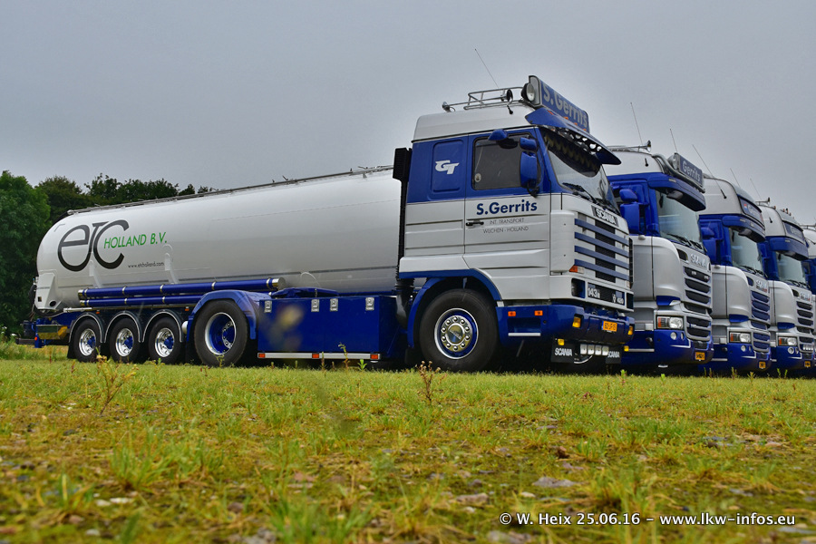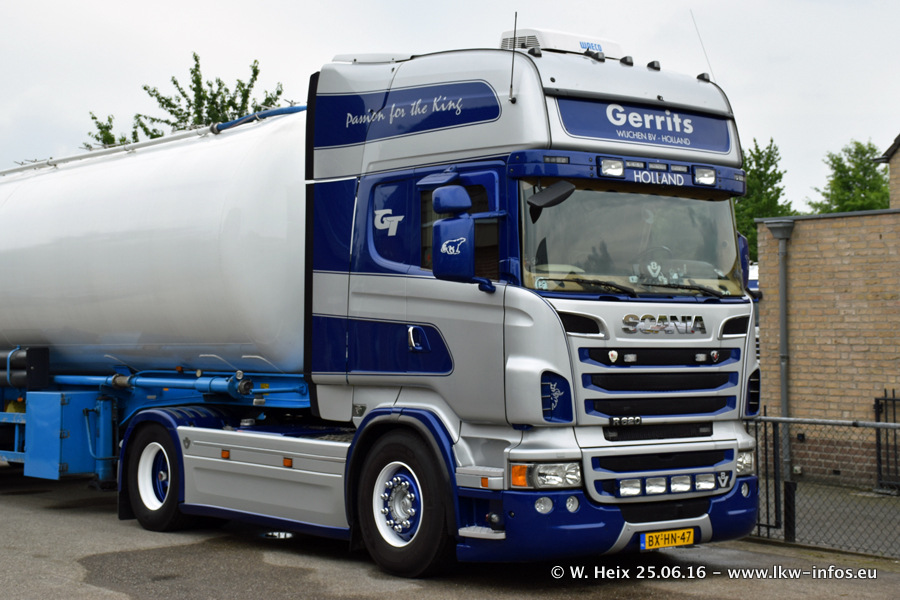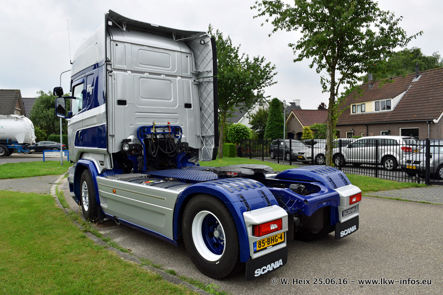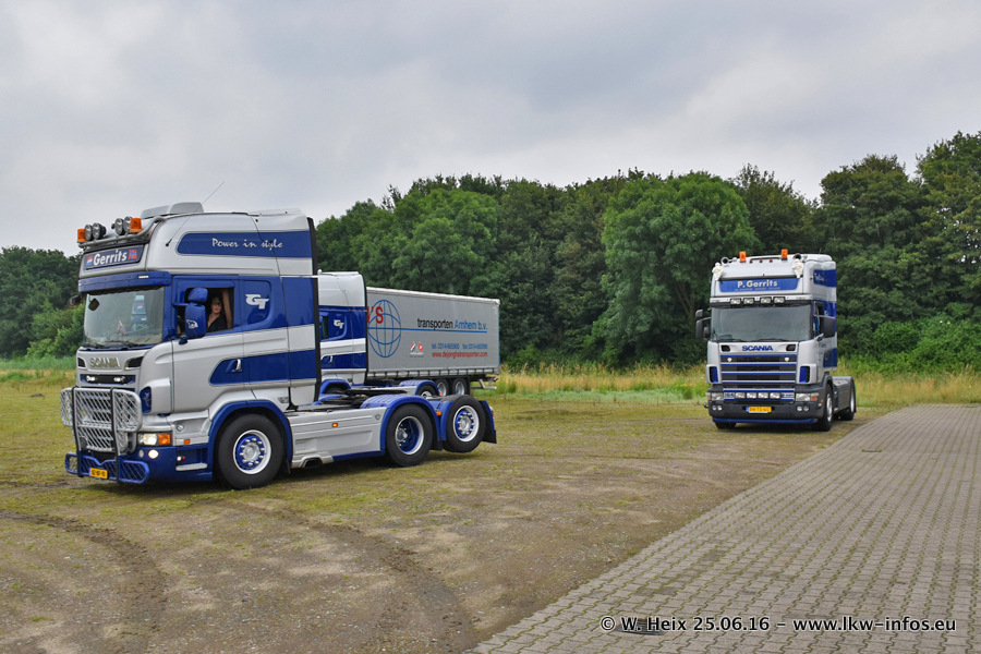 Peter Gerrits hatte mich zum Fotoshooting eingeladen, denn an diesem Samstag hatte er organisiert, dass alle neun LKW zuhause in Wijchen sind. Das Fotoshooting fand auf dem Gelände von Scania Benelux, Wijchen statt. Der Scania 143 V8 Streamline ist inzwischen fest in Zürüch (CH) und einige der V8-Scania sind regelmässig in Norwegen unterwegs und selteh zuhause. Anfang Juni kam übrigens der neute LKW in den Fuhrpark, ein Scania R 450 Streamline Euro 6. Neu ist auch ein Siloauflieger, den Gerrits vor einigen Wochen schon bekommen hat. Das Chassis ist blau lackiert, passend zu den Zugmaschinen. Außerdem hat der neue Auflieger Alufelgen, passend zur Scania-Zugmaschine. Insgesamt eine tolle Kombination. Leider hat das Wetter nicht mitgespielt, denn pünktlich zum eigentlichen Fotoshooting begann es zu regnen und der Regen wurde immer stärker. Trotzdem sind viele schöne Bilder entstanden! Der neue Scania ist übrigens auch schon auf den ersten Bildern in der Galerie zu sehen, zuhause vor dem kleinen Firmenhof in Wijchen.