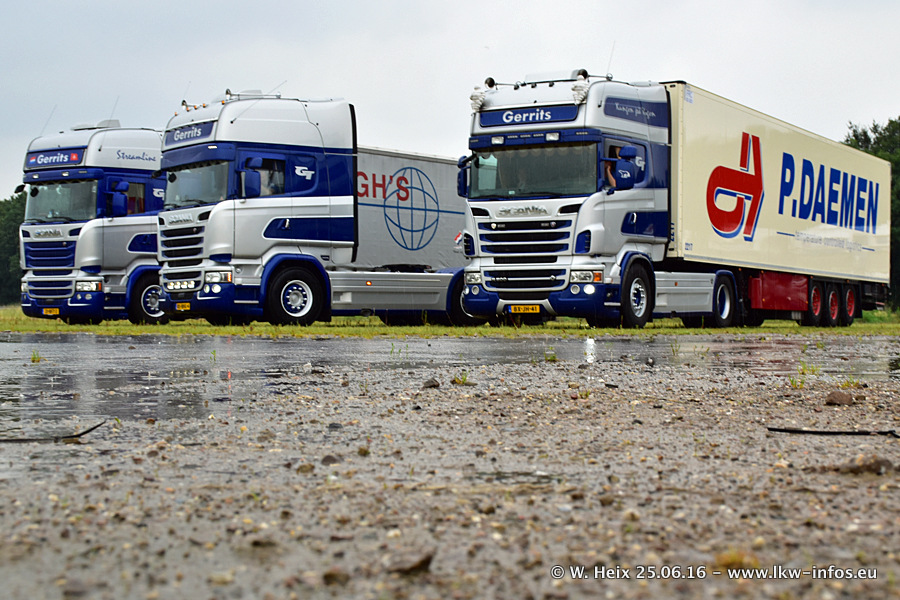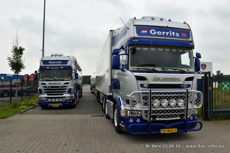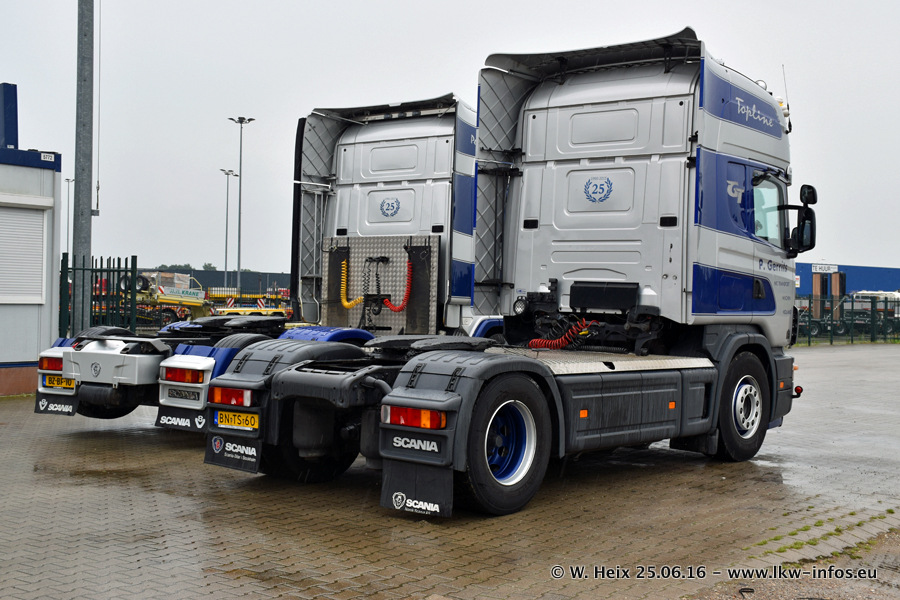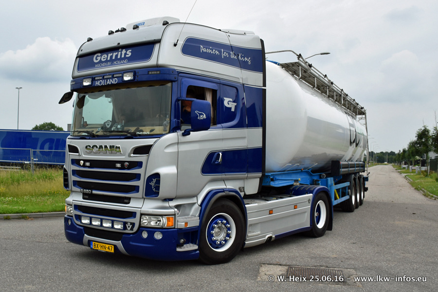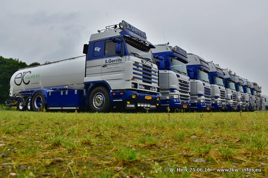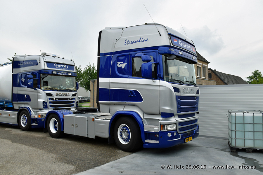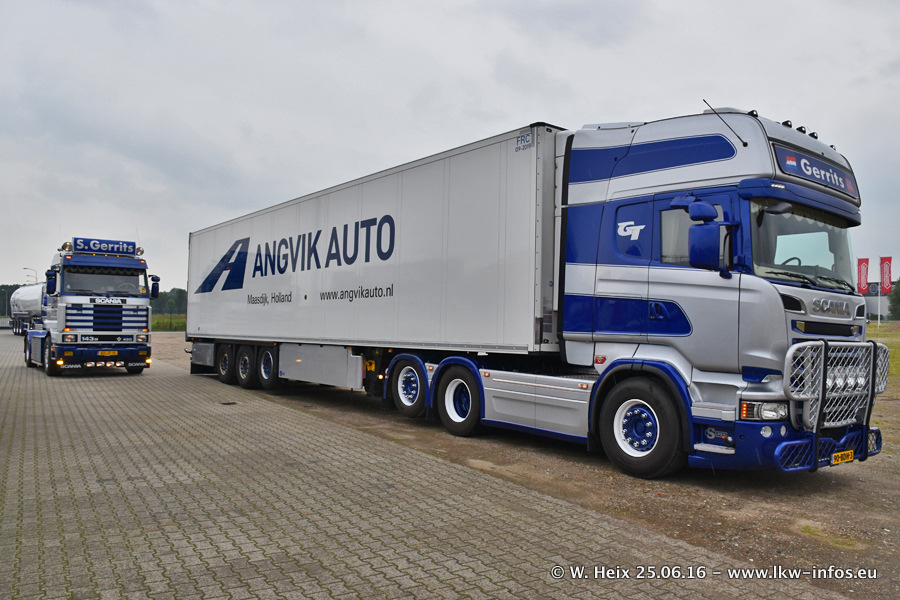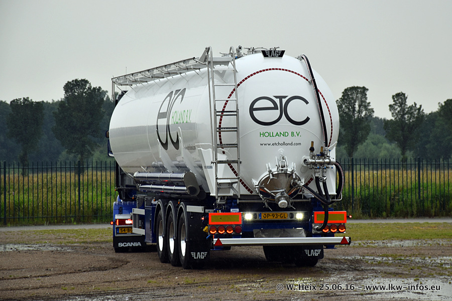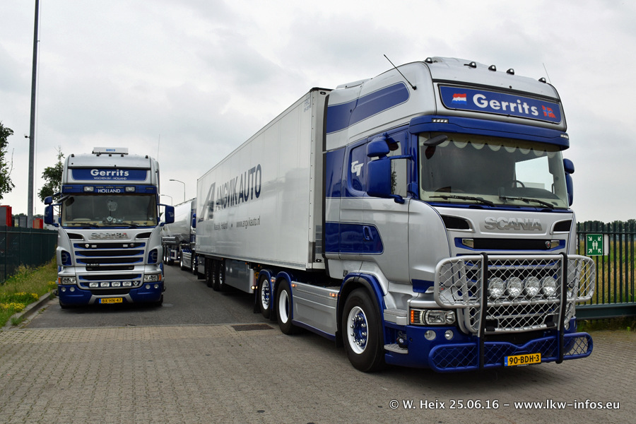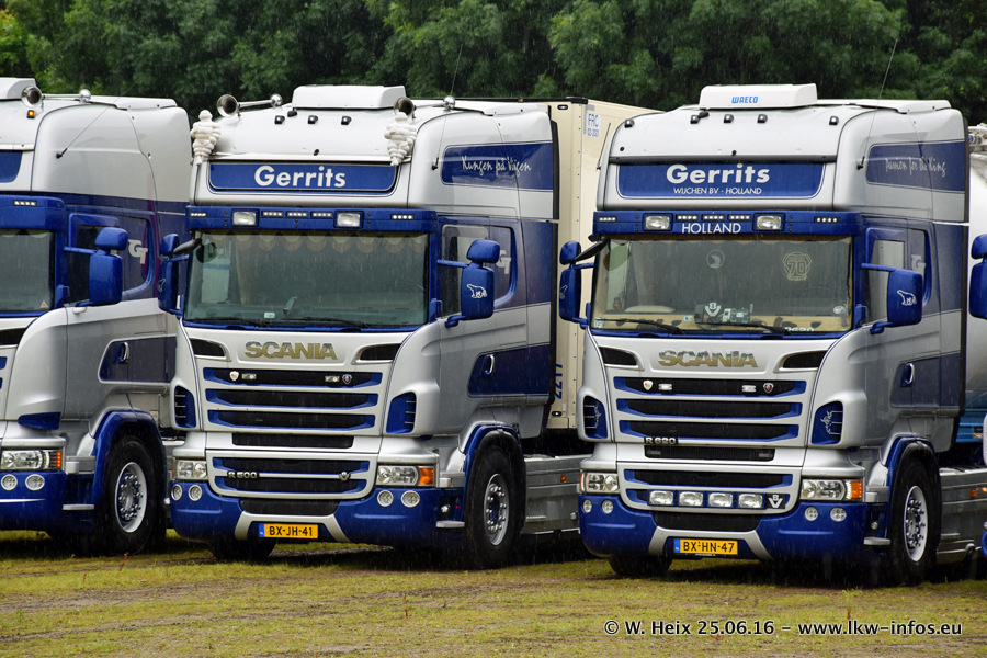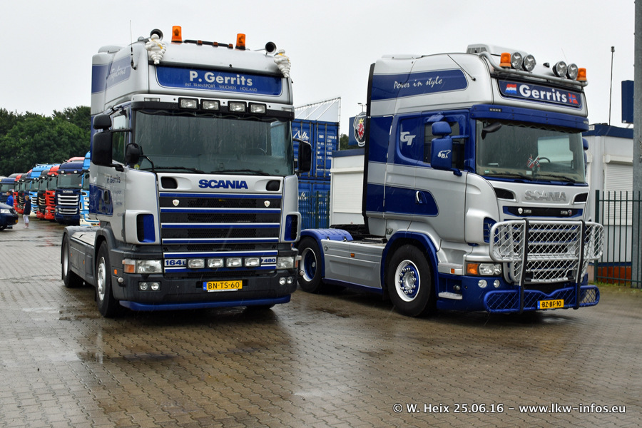 Peter Gerrits hatte mich zum Fotoshooting eingeladen, denn an diesem Samstag hatte er organisiert, dass alle neun LKW zuhause in Wijchen sind. Das Fotoshooting fand auf dem Gelände von Scania Benelux, Wijchen statt. Der Scania 143 V8 Streamline ist inzwischen fest in Zürüch (CH) und einige der V8-Scania sind regelmässig in Norwegen unterwegs und selteh zuhause. Anfang Juni kam übrigens der neute LKW in den Fuhrpark, ein Scania R 450 Streamline Euro 6. Neu ist auch ein Siloauflieger, den Gerrits vor einigen Wochen schon bekommen hat. Das Chassis ist blau lackiert, passend zu den Zugmaschinen. Außerdem hat der neue Auflieger Alufelgen, passend zur Scania-Zugmaschine. Insgesamt eine tolle Kombination. Leider hat das Wetter nicht mitgespielt, denn pünktlich zum eigentlichen Fotoshooting begann es zu regnen und der Regen wurde immer stärker. Trotzdem sind viele schöne Bilder entstanden! Der neue Scania ist übrigens auch schon auf den ersten Bildern in der Galerie zu sehen, zuhause vor dem kleinen Firmenhof in Wijchen.