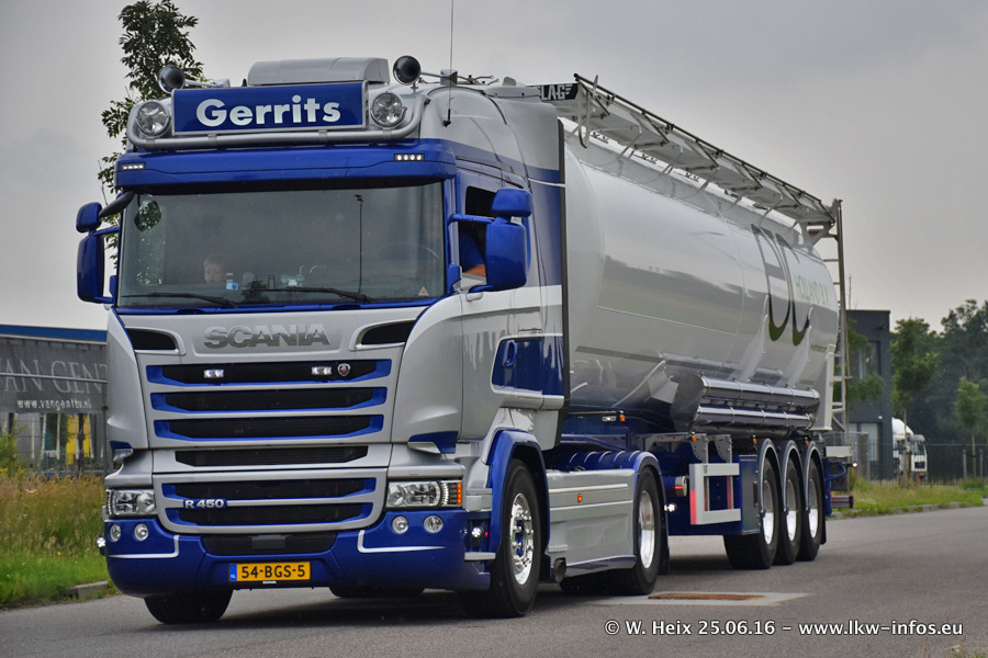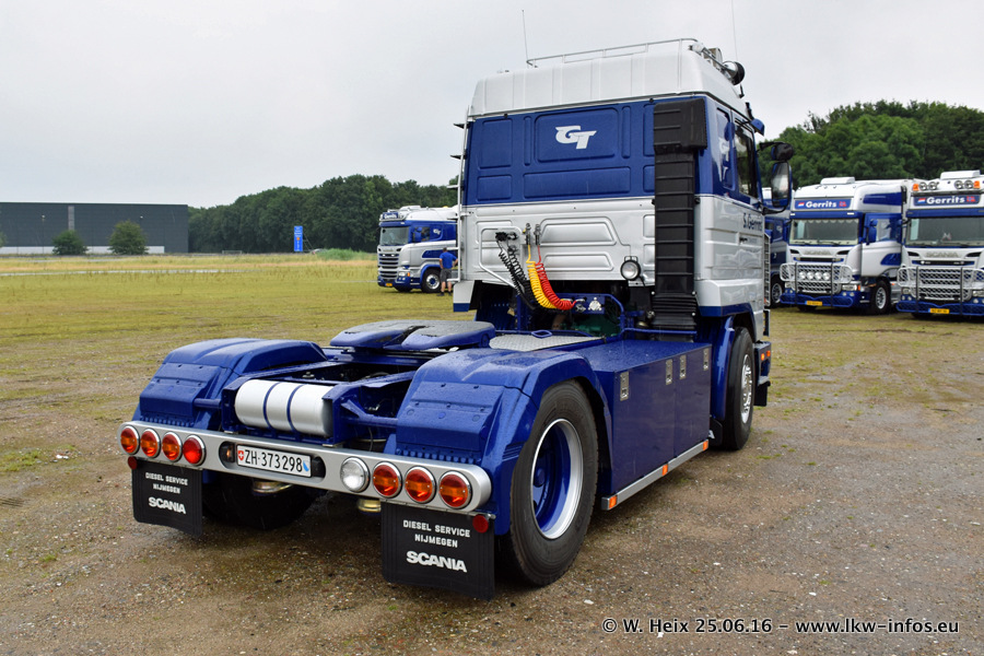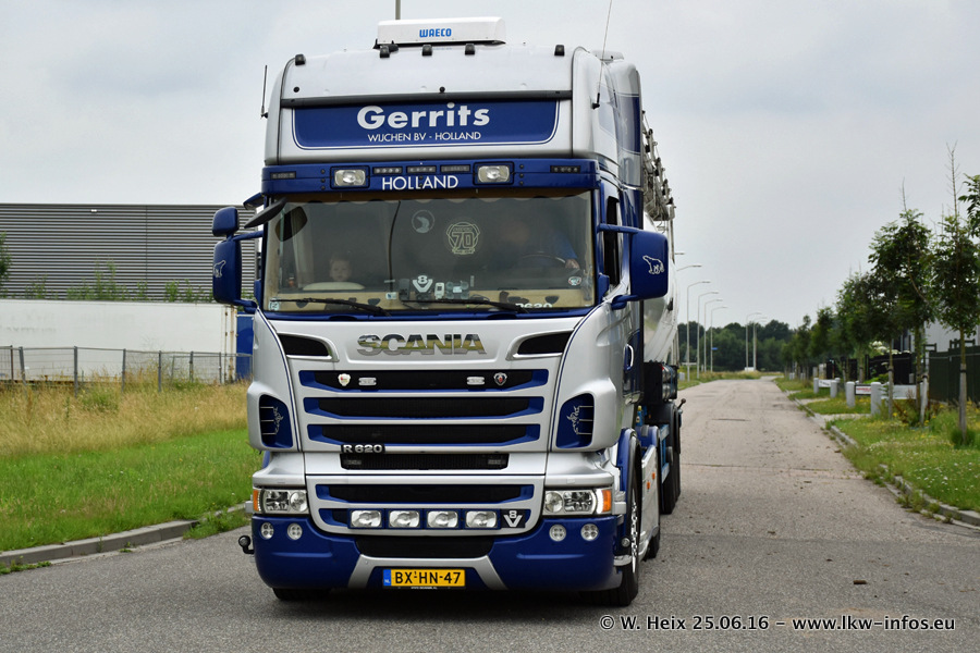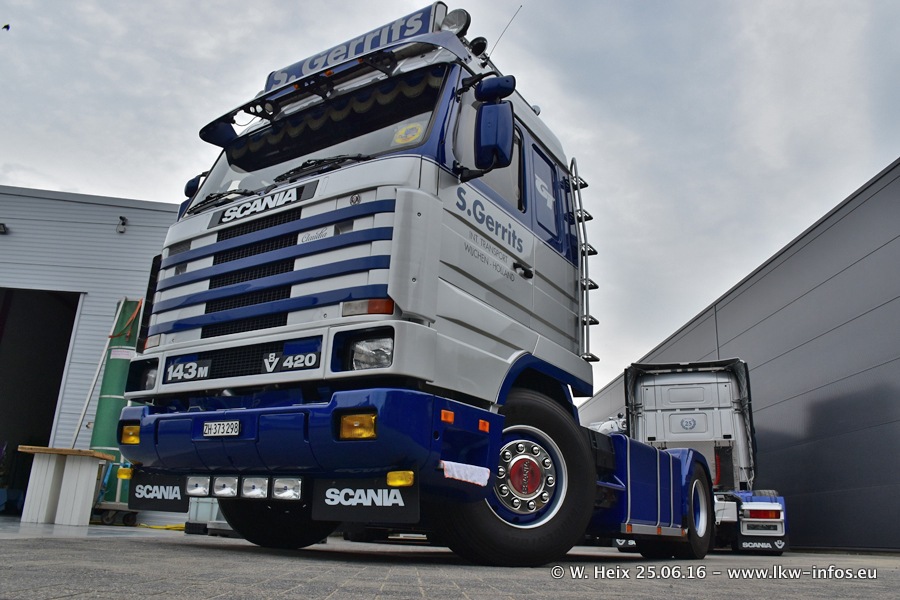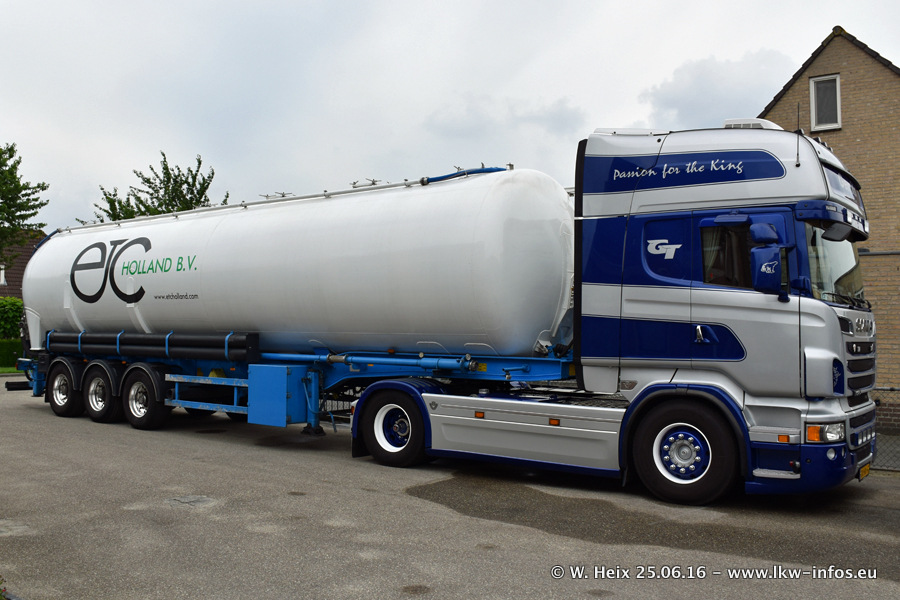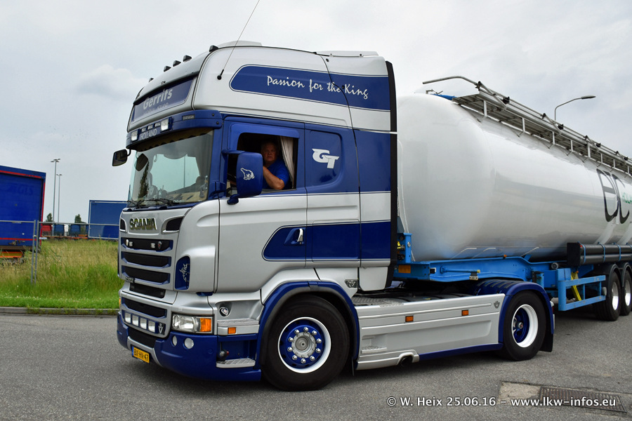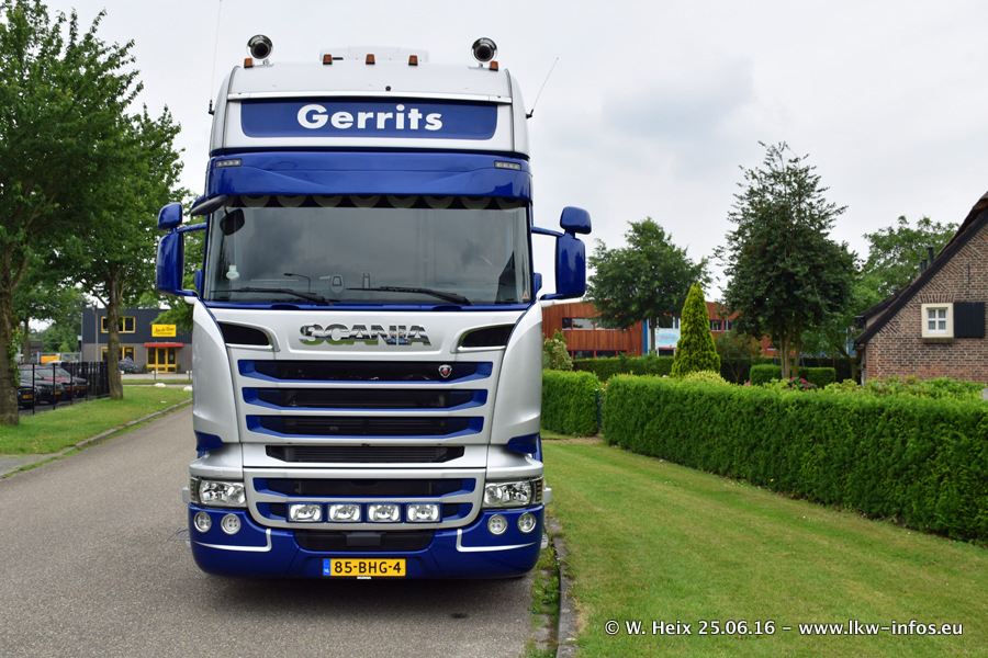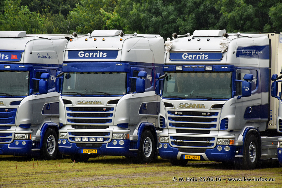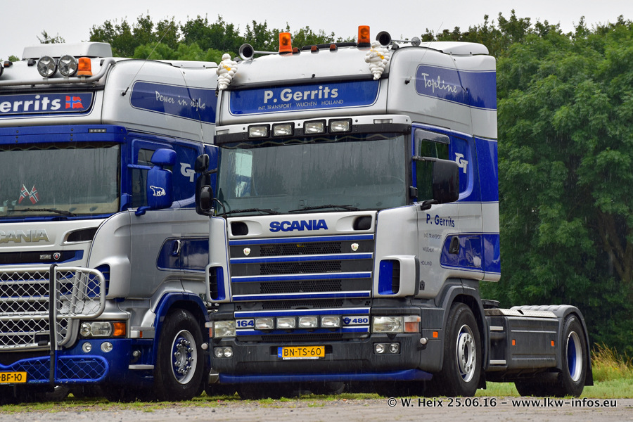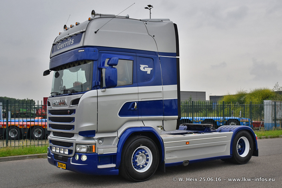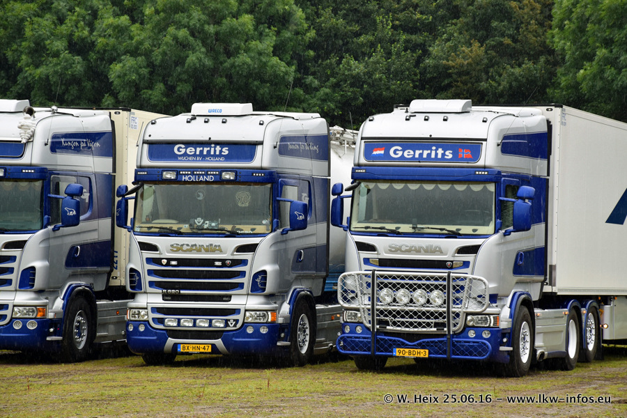 Peter Gerrits hatte mich zum Fotoshooting eingeladen, denn an diesem Samstag hatte er organisiert, dass alle neun LKW zuhause in Wijchen sind. Das Fotoshooting fand auf dem Gelände von Scania Benelux, Wijchen statt. Der Scania 143 V8 Streamline ist inzwischen fest in Zürüch (CH) und einige der V8-Scania sind regelmässig in Norwegen unterwegs und selteh zuhause. Anfang Juni kam übrigens der neute LKW in den Fuhrpark, ein Scania R 450 Streamline Euro 6. Neu ist auch ein Siloauflieger, den Gerrits vor einigen Wochen schon bekommen hat. Das Chassis ist blau lackiert, passend zu den Zugmaschinen. Außerdem hat der neue Auflieger Alufelgen, passend zur Scania-Zugmaschine. Insgesamt eine tolle Kombination. Leider hat das Wetter nicht mitgespielt, denn pünktlich zum eigentlichen Fotoshooting begann es zu regnen und der Regen wurde immer stärker. Trotzdem sind viele schöne Bilder entstanden! Der neue Scania ist übrigens auch schon auf den ersten Bildern in der Galerie zu sehen, zuhause vor dem kleinen Firmenhof in Wijchen.