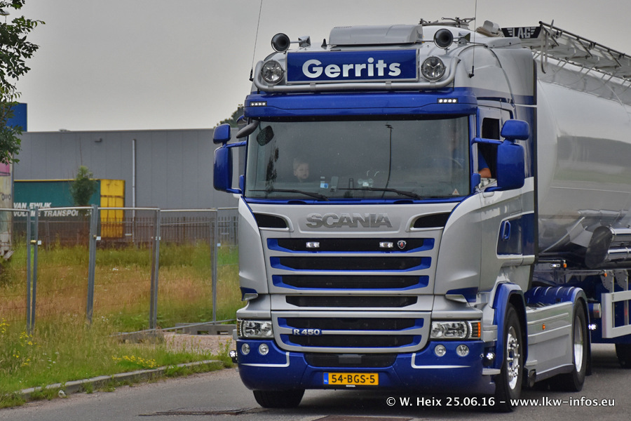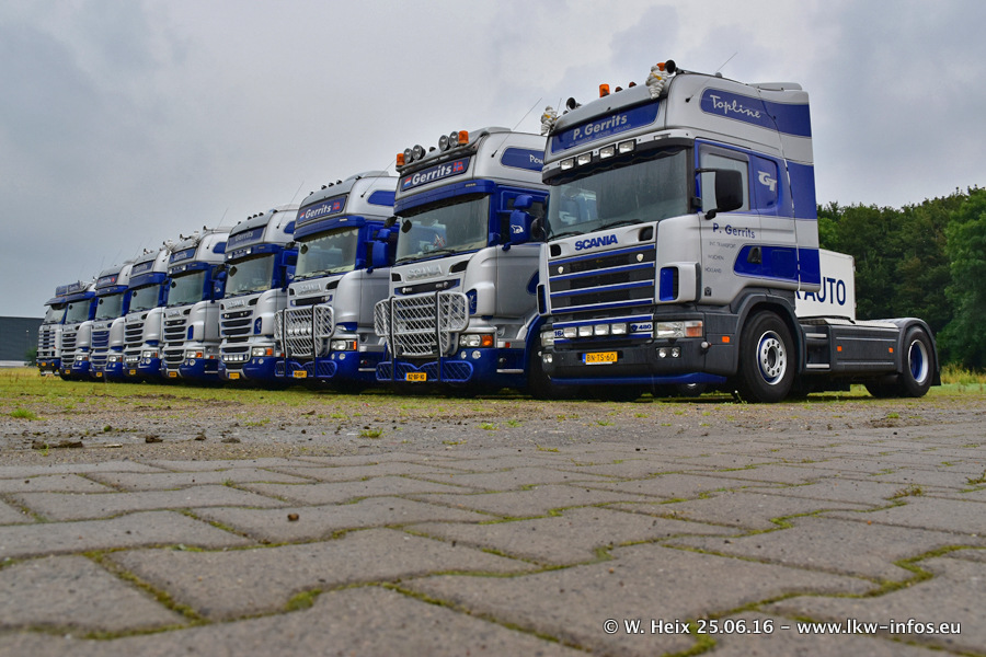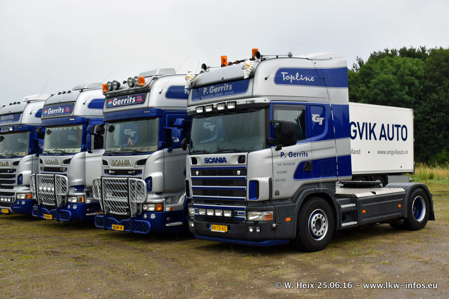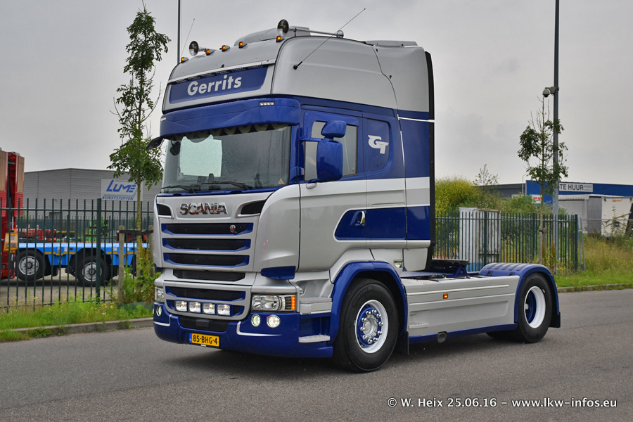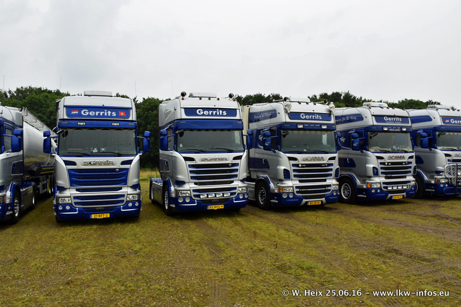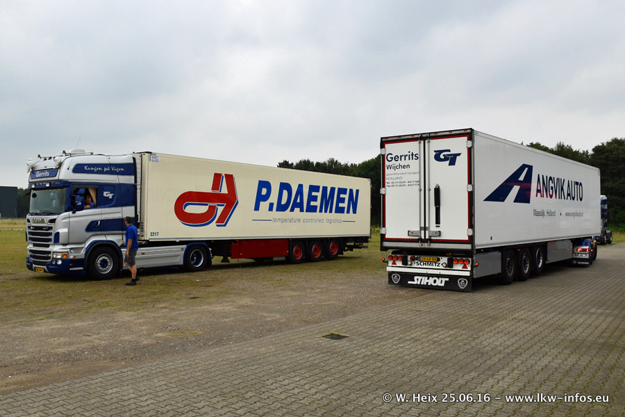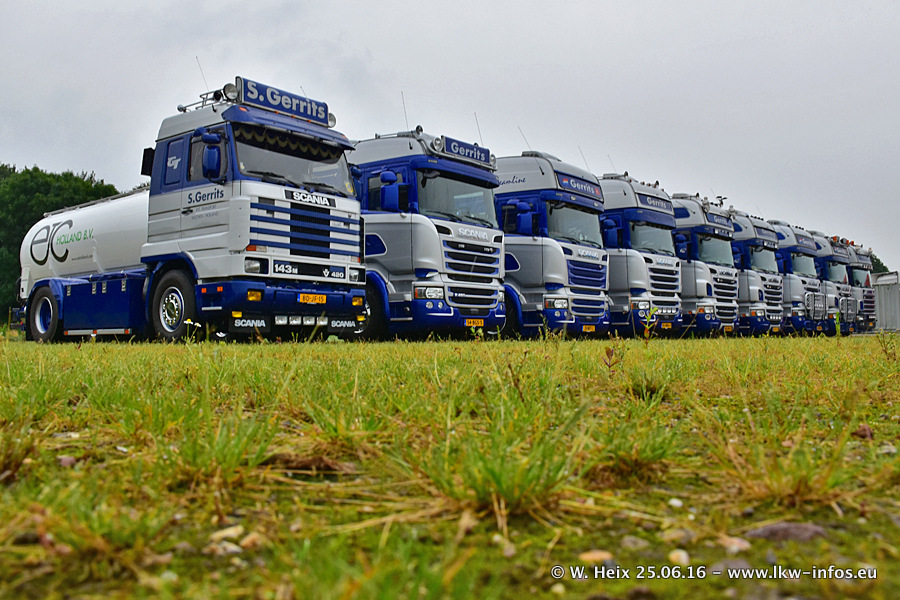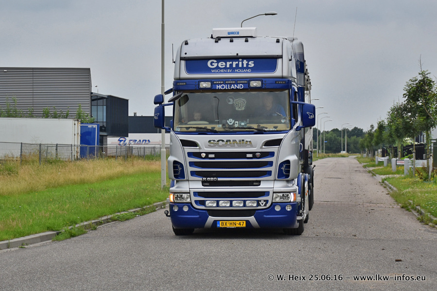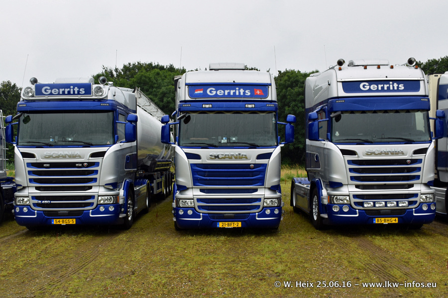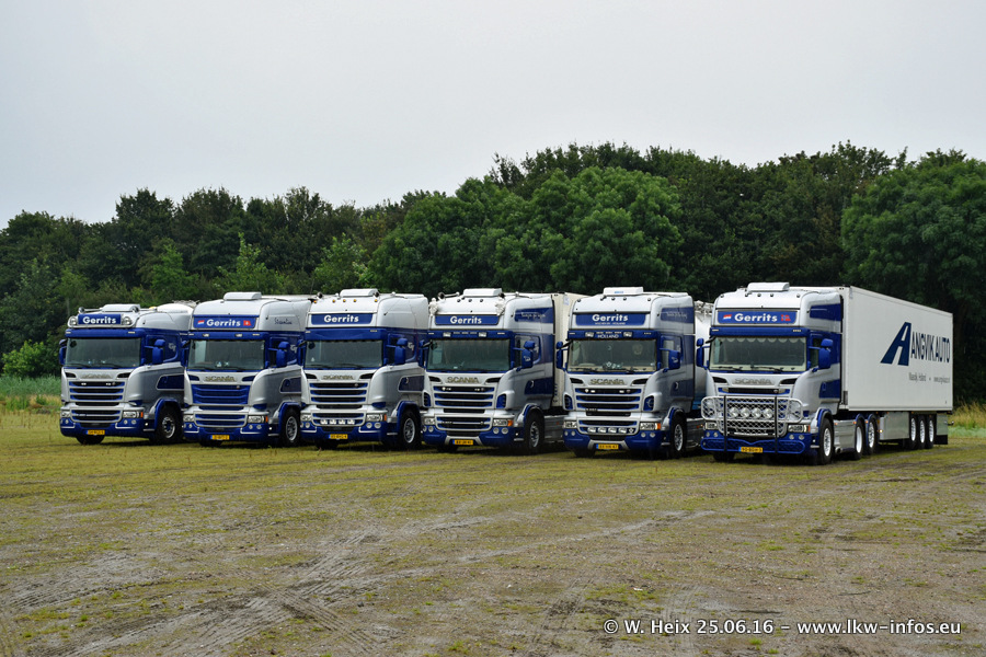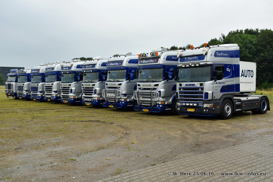 Peter Gerrits hatte mich zum Fotoshooting eingeladen, denn an diesem Samstag hatte er organisiert, dass alle neun LKW zuhause in Wijchen sind. Das Fotoshooting fand auf dem Gelände von Scania Benelux, Wijchen statt. Der Scania 143 V8 Streamline ist inzwischen fest in Zürüch (CH) und einige der V8-Scania sind regelmässig in Norwegen unterwegs und selteh zuhause. Anfang Juni kam übrigens der neute LKW in den Fuhrpark, ein Scania R 450 Streamline Euro 6. Neu ist auch ein Siloauflieger, den Gerrits vor einigen Wochen schon bekommen hat. Das Chassis ist blau lackiert, passend zu den Zugmaschinen. Außerdem hat der neue Auflieger Alufelgen, passend zur Scania-Zugmaschine. Insgesamt eine tolle Kombination. Leider hat das Wetter nicht mitgespielt, denn pünktlich zum eigentlichen Fotoshooting begann es zu regnen und der Regen wurde immer stärker. Trotzdem sind viele schöne Bilder entstanden! Der neue Scania ist übrigens auch schon auf den ersten Bildern in der Galerie zu sehen, zuhause vor dem kleinen Firmenhof in Wijchen.