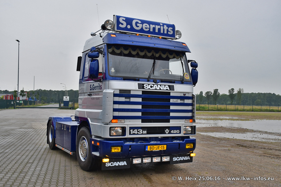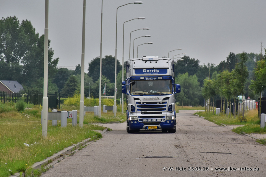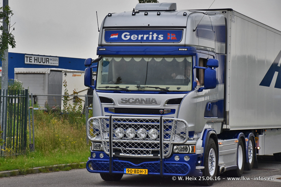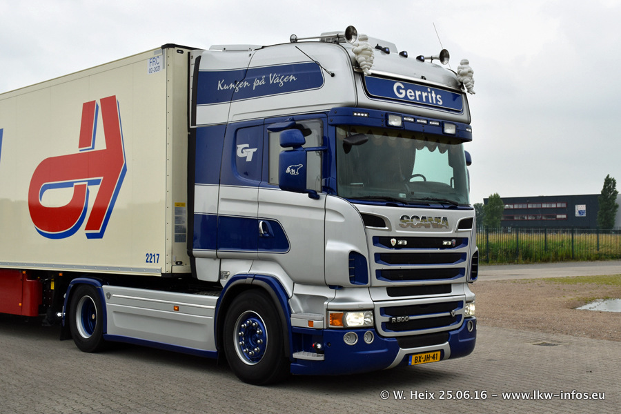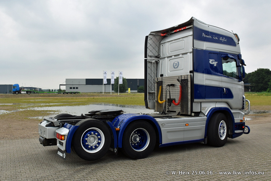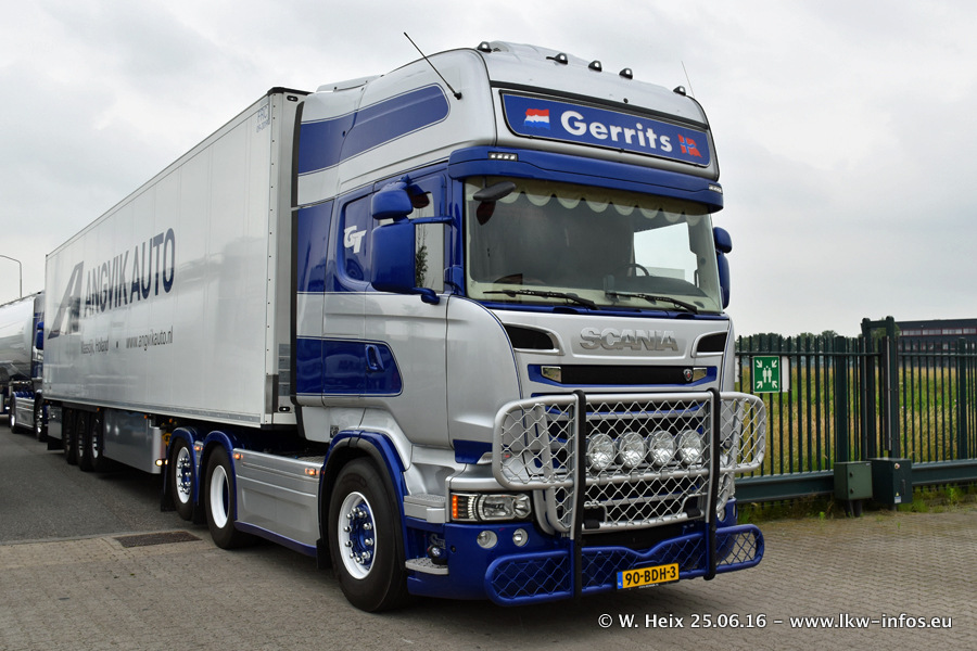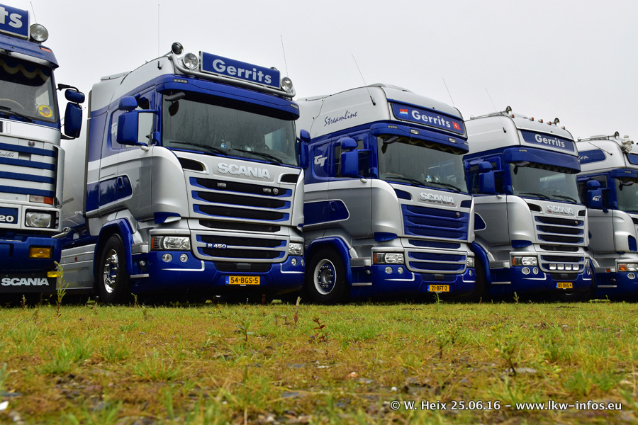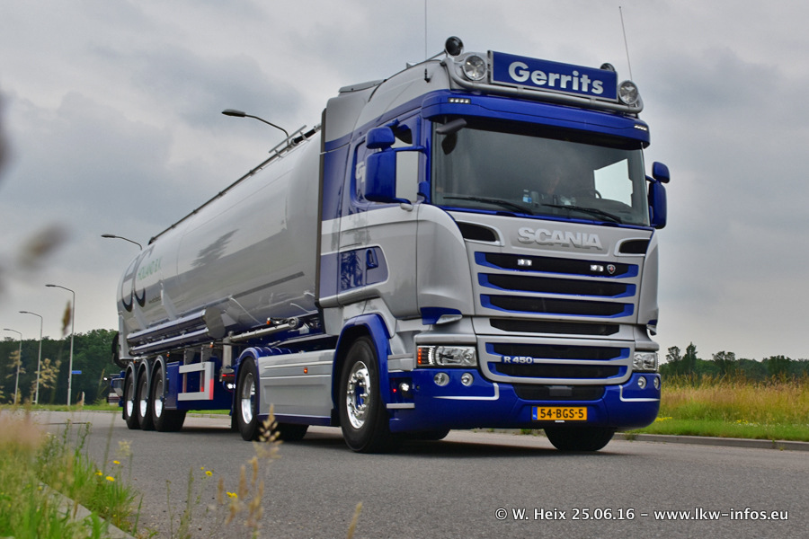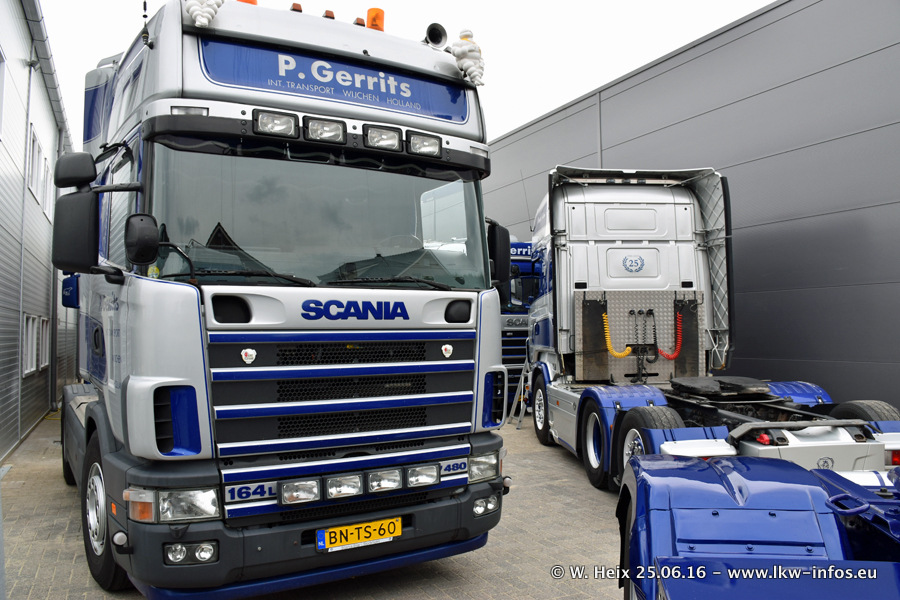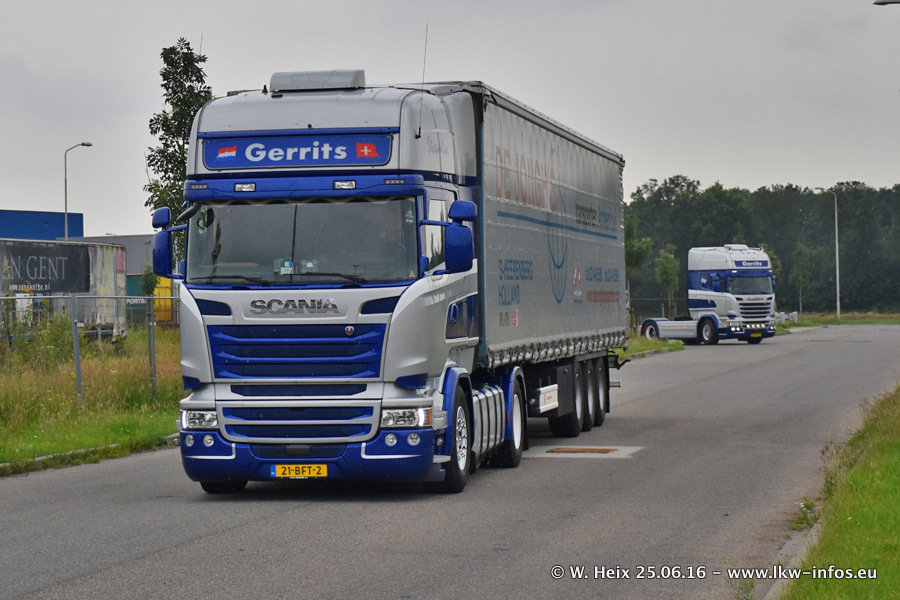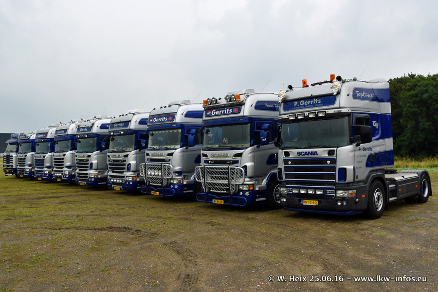 Peter Gerrits hatte mich zum Fotoshooting eingeladen, denn an diesem Samstag hatte er organisiert, dass alle neun LKW zuhause in Wijchen sind. Das Fotoshooting fand auf dem Gelände von Scania Benelux, Wijchen statt. Der Scania 143 V8 Streamline ist inzwischen fest in Zürüch (CH) und einige der V8-Scania sind regelmässig in Norwegen unterwegs und selteh zuhause. Anfang Juni kam übrigens der neute LKW in den Fuhrpark, ein Scania R 450 Streamline Euro 6. Neu ist auch ein Siloauflieger, den Gerrits vor einigen Wochen schon bekommen hat. Das Chassis ist blau lackiert, passend zu den Zugmaschinen. Außerdem hat der neue Auflieger Alufelgen, passend zur Scania-Zugmaschine. Insgesamt eine tolle Kombination. Leider hat das Wetter nicht mitgespielt, denn pünktlich zum eigentlichen Fotoshooting begann es zu regnen und der Regen wurde immer stärker. Trotzdem sind viele schöne Bilder entstanden! Der neue Scania ist übrigens auch schon auf den ersten Bildern in der Galerie zu sehen, zuhause vor dem kleinen Firmenhof in Wijchen.