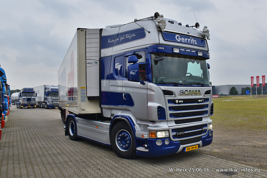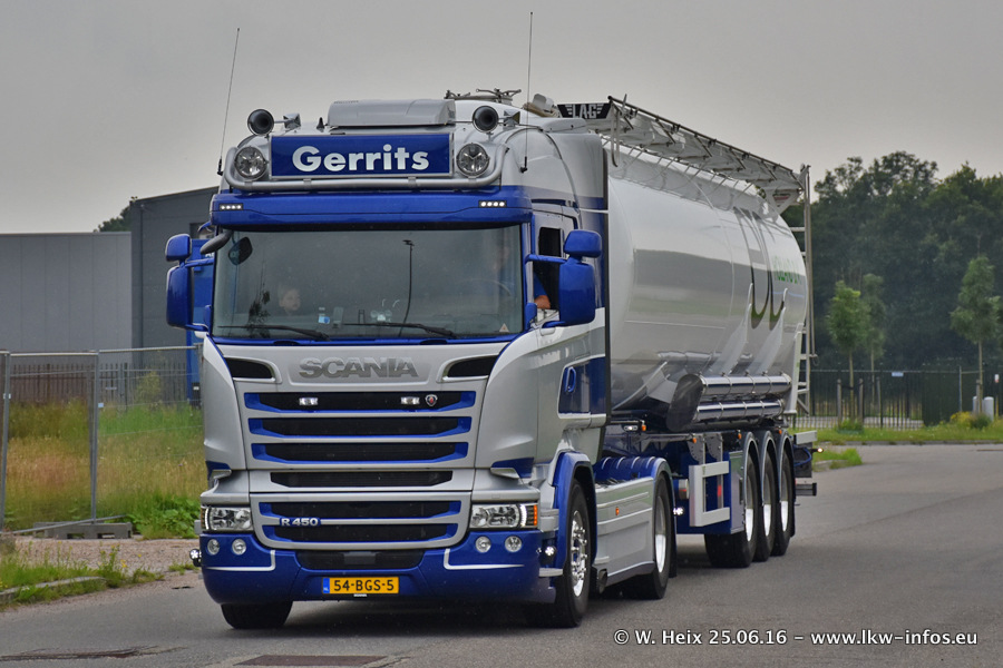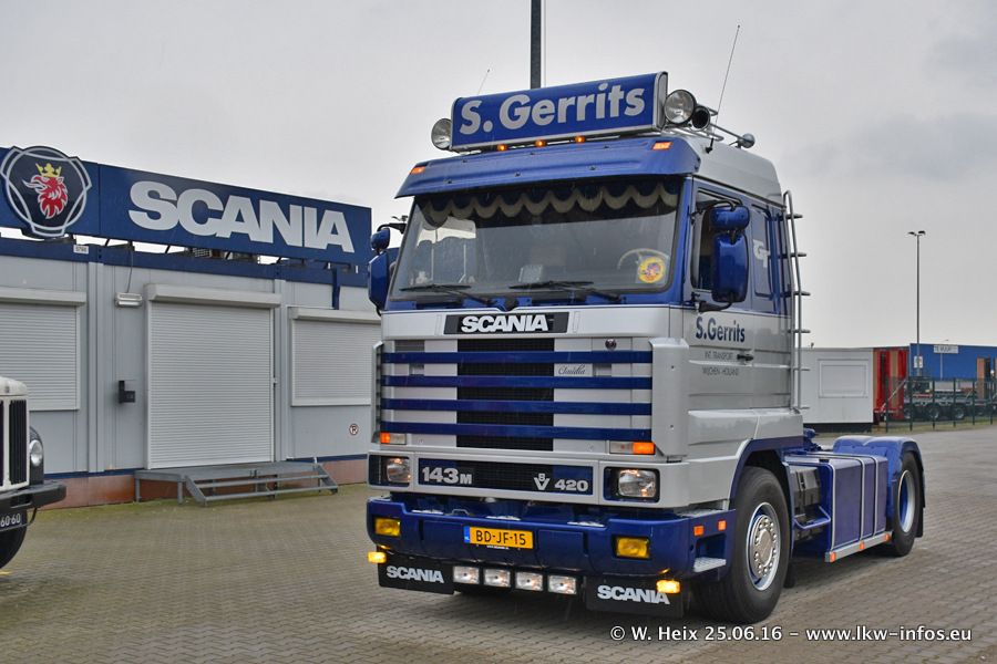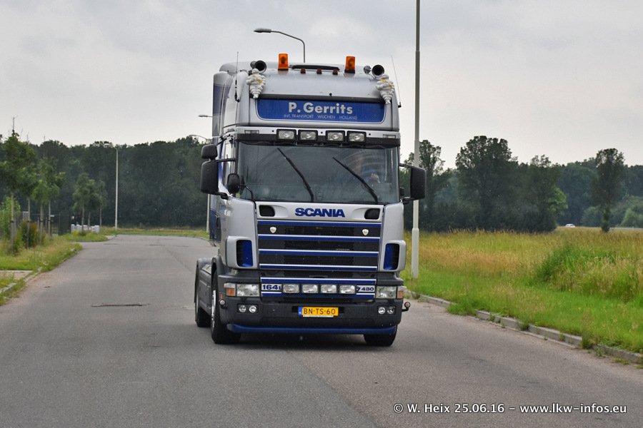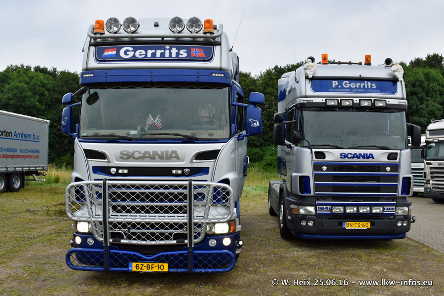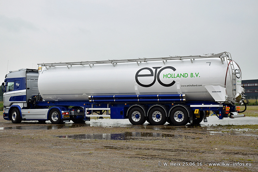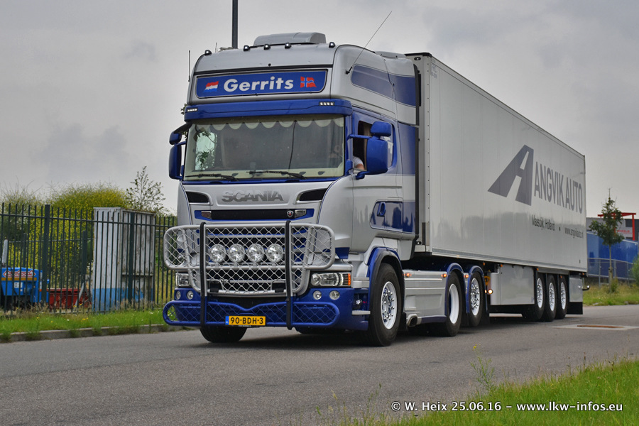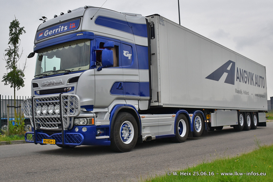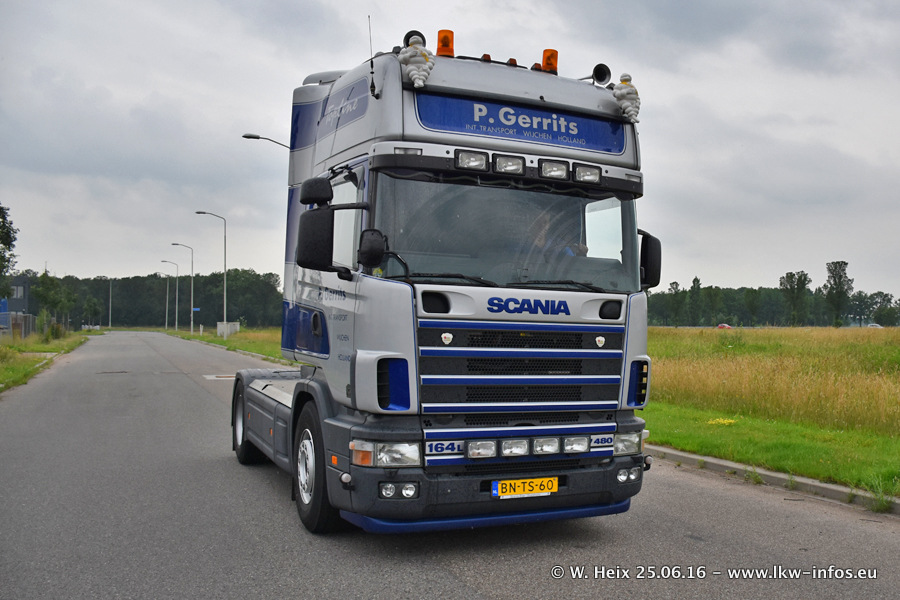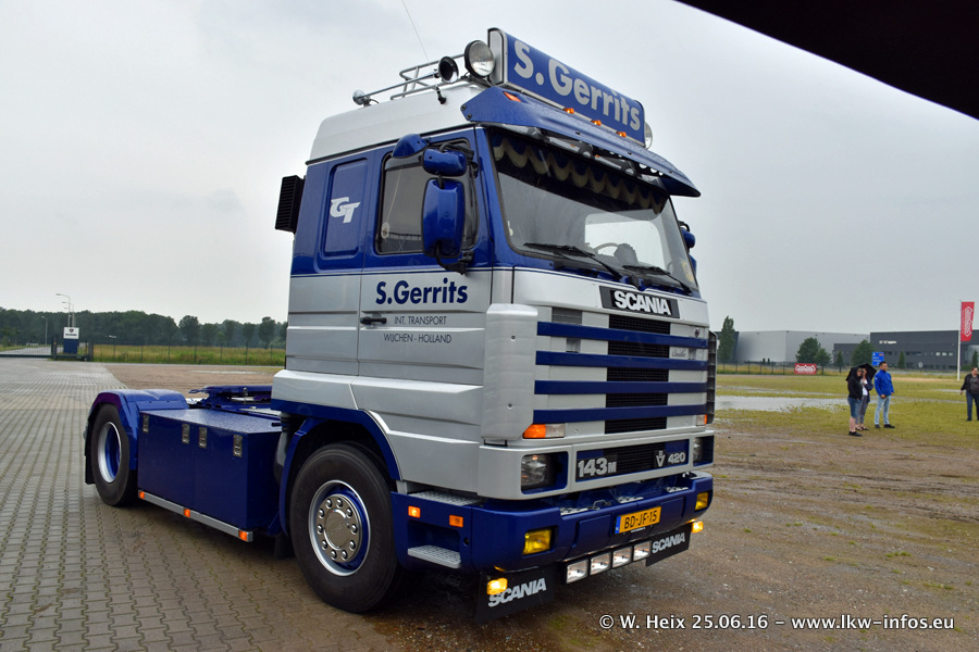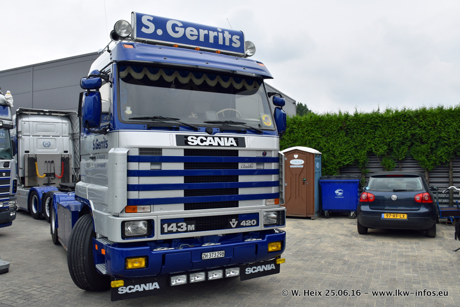 Peter Gerrits hatte mich zum Fotoshooting eingeladen, denn an diesem Samstag hatte er organisiert, dass alle neun LKW zuhause in Wijchen sind. Das Fotoshooting fand auf dem Gelände von Scania Benelux, Wijchen statt. Der Scania 143 V8 Streamline ist inzwischen fest in Zürüch (CH) und einige der V8-Scania sind regelmässig in Norwegen unterwegs und selteh zuhause. Anfang Juni kam übrigens der neute LKW in den Fuhrpark, ein Scania R 450 Streamline Euro 6. Neu ist auch ein Siloauflieger, den Gerrits vor einigen Wochen schon bekommen hat. Das Chassis ist blau lackiert, passend zu den Zugmaschinen. Außerdem hat der neue Auflieger Alufelgen, passend zur Scania-Zugmaschine. Insgesamt eine tolle Kombination. Leider hat das Wetter nicht mitgespielt, denn pünktlich zum eigentlichen Fotoshooting begann es zu regnen und der Regen wurde immer stärker. Trotzdem sind viele schöne Bilder entstanden! Der neue Scania ist übrigens auch schon auf den ersten Bildern in der Galerie zu sehen, zuhause vor dem kleinen Firmenhof in Wijchen.