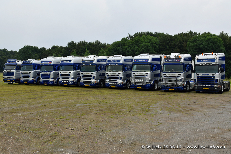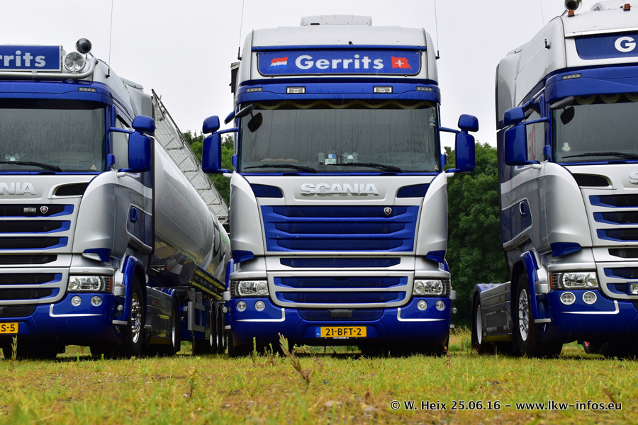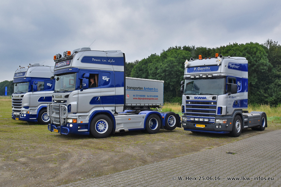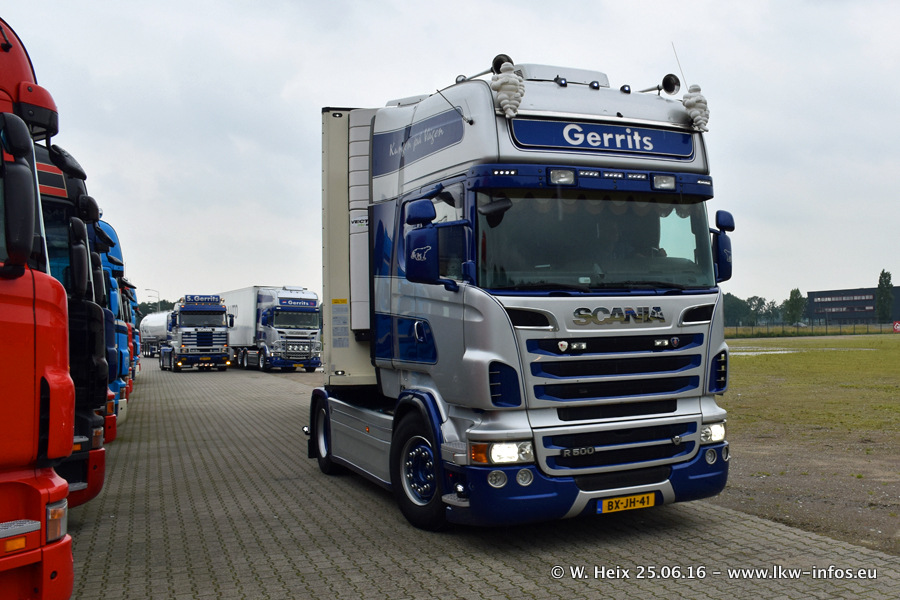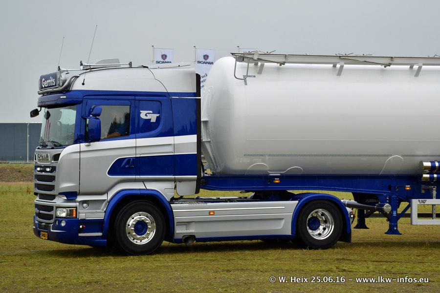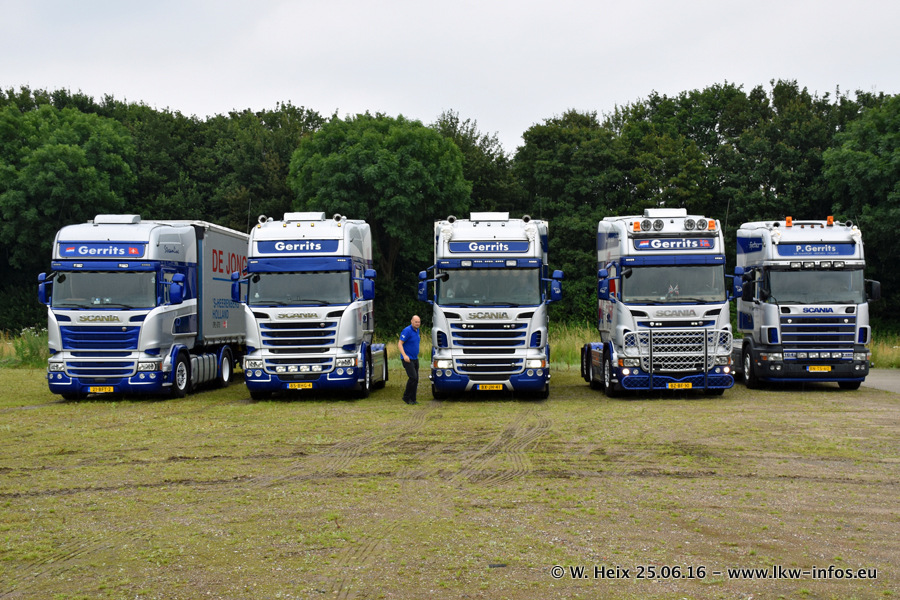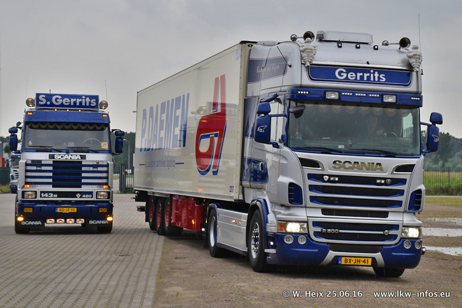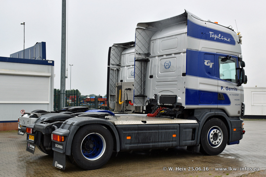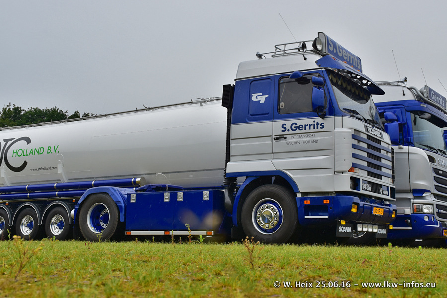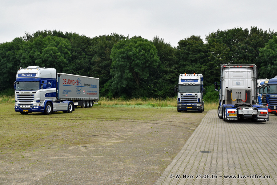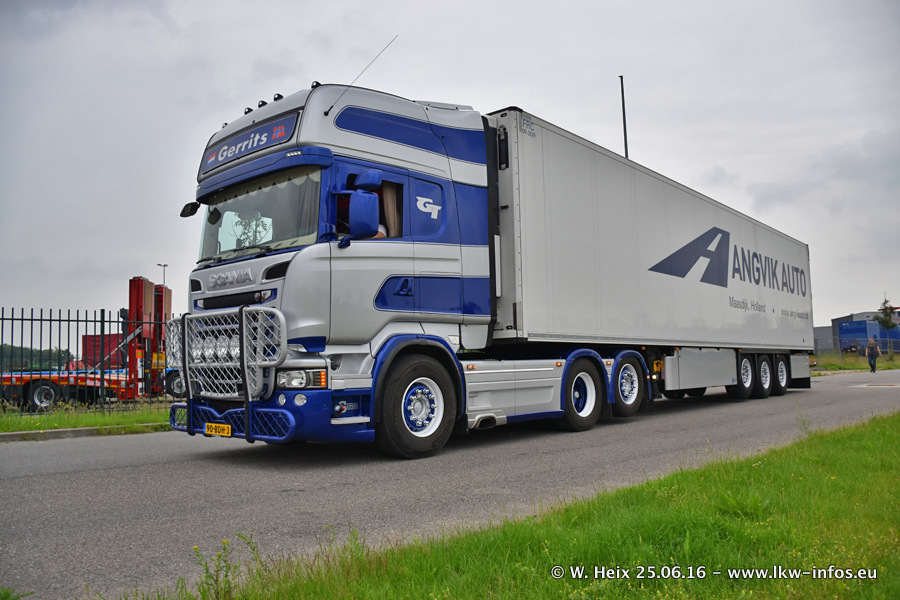 Peter Gerrits hatte mich zum Fotoshooting eingeladen, denn an diesem Samstag hatte er organisiert, dass alle neun LKW zuhause in Wijchen sind. Das Fotoshooting fand auf dem Gelände von Scania Benelux, Wijchen statt. Der Scania 143 V8 Streamline ist inzwischen fest in Zürüch (CH) und einige der V8-Scania sind regelmässig in Norwegen unterwegs und selteh zuhause. Anfang Juni kam übrigens der neute LKW in den Fuhrpark, ein Scania R 450 Streamline Euro 6. Neu ist auch ein Siloauflieger, den Gerrits vor einigen Wochen schon bekommen hat. Das Chassis ist blau lackiert, passend zu den Zugmaschinen. Außerdem hat der neue Auflieger Alufelgen, passend zur Scania-Zugmaschine. Insgesamt eine tolle Kombination. Leider hat das Wetter nicht mitgespielt, denn pünktlich zum eigentlichen Fotoshooting begann es zu regnen und der Regen wurde immer stärker. Trotzdem sind viele schöne Bilder entstanden! Der neue Scania ist übrigens auch schon auf den ersten Bildern in der Galerie zu sehen, zuhause vor dem kleinen Firmenhof in Wijchen.