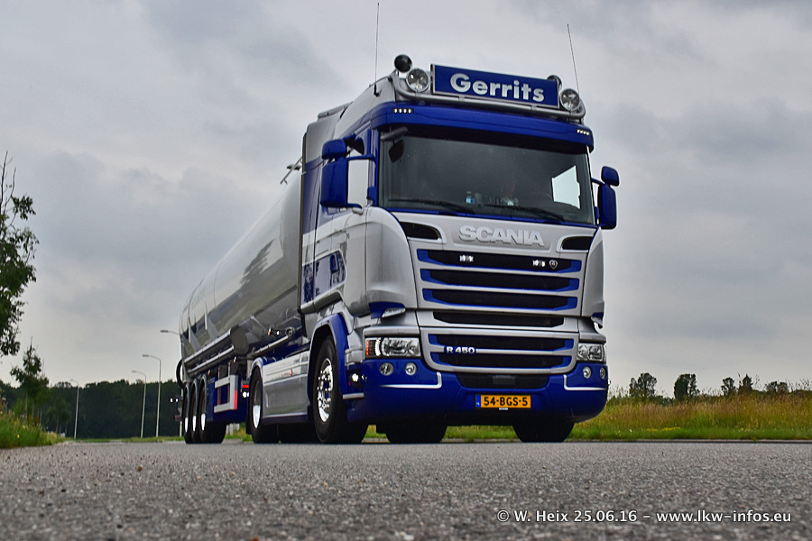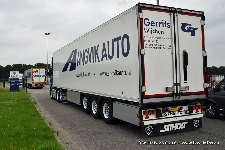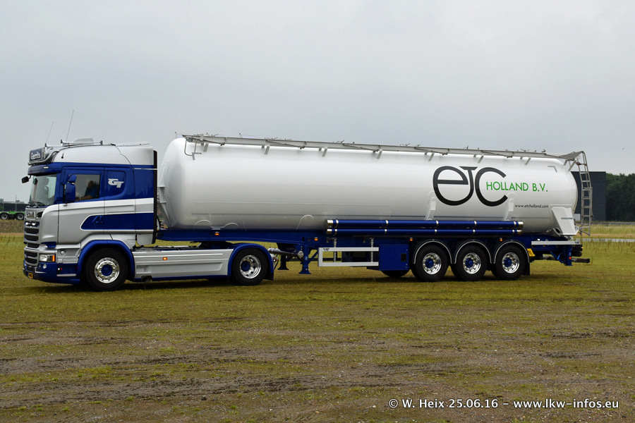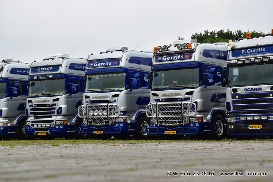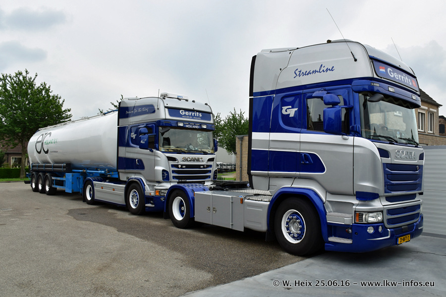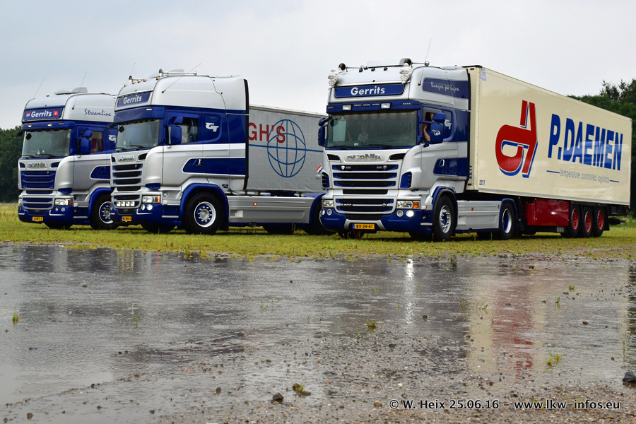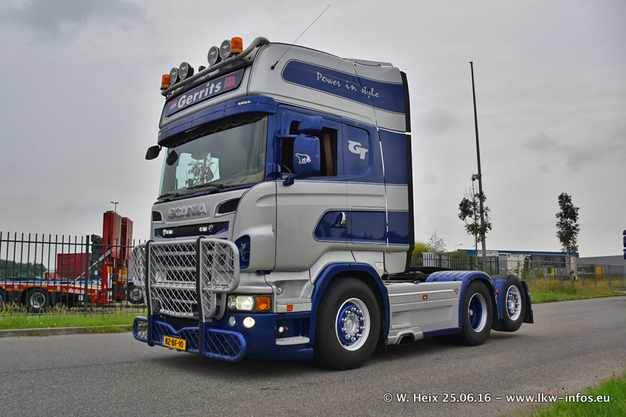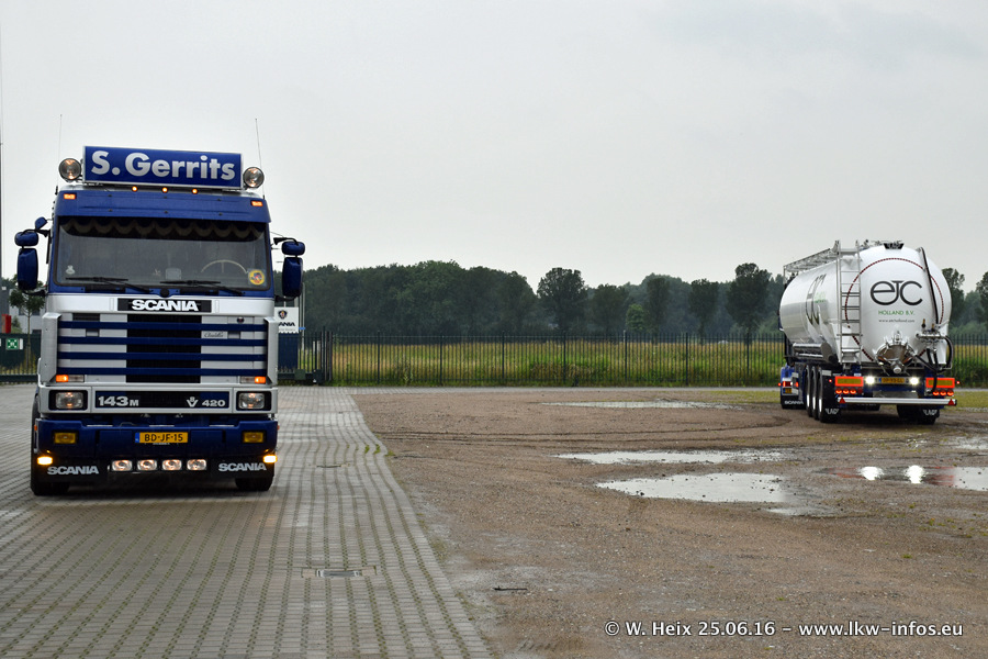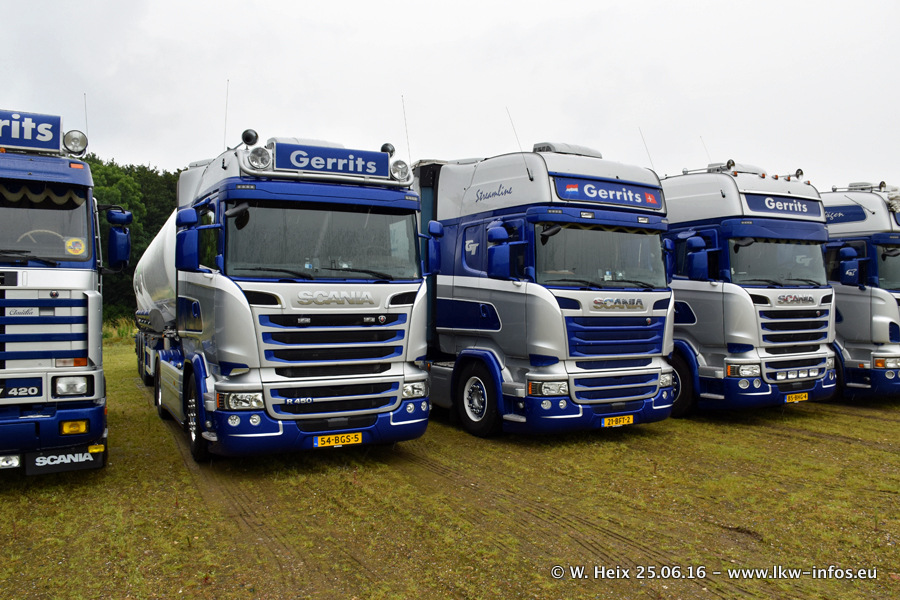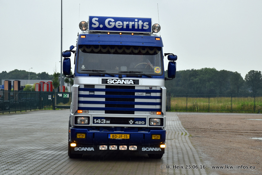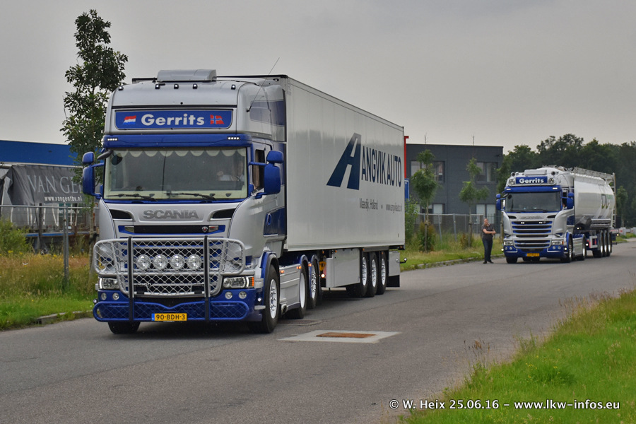 Peter Gerrits hatte mich zum Fotoshooting eingeladen, denn an diesem Samstag hatte er organisiert, dass alle neun LKW zuhause in Wijchen sind. Das Fotoshooting fand auf dem Gelände von Scania Benelux, Wijchen statt. Der Scania 143 V8 Streamline ist inzwischen fest in Zürüch (CH) und einige der V8-Scania sind regelmässig in Norwegen unterwegs und selteh zuhause. Anfang Juni kam übrigens der neute LKW in den Fuhrpark, ein Scania R 450 Streamline Euro 6. Neu ist auch ein Siloauflieger, den Gerrits vor einigen Wochen schon bekommen hat. Das Chassis ist blau lackiert, passend zu den Zugmaschinen. Außerdem hat der neue Auflieger Alufelgen, passend zur Scania-Zugmaschine. Insgesamt eine tolle Kombination. Leider hat das Wetter nicht mitgespielt, denn pünktlich zum eigentlichen Fotoshooting begann es zu regnen und der Regen wurde immer stärker. Trotzdem sind viele schöne Bilder entstanden! Der neue Scania ist übrigens auch schon auf den ersten Bildern in der Galerie zu sehen, zuhause vor dem kleinen Firmenhof in Wijchen.
