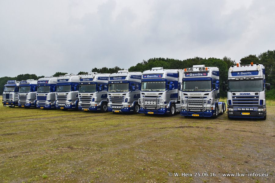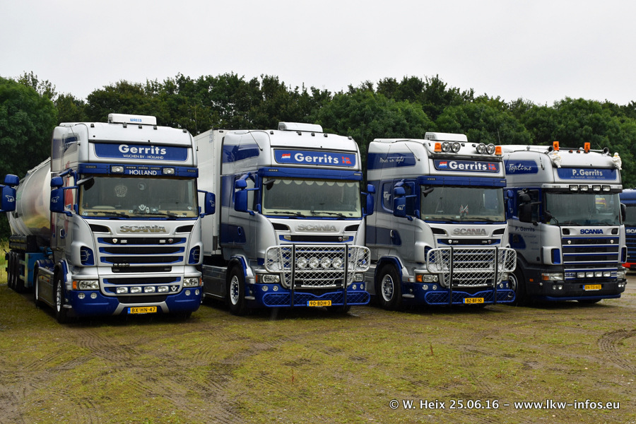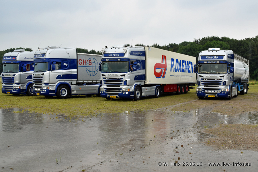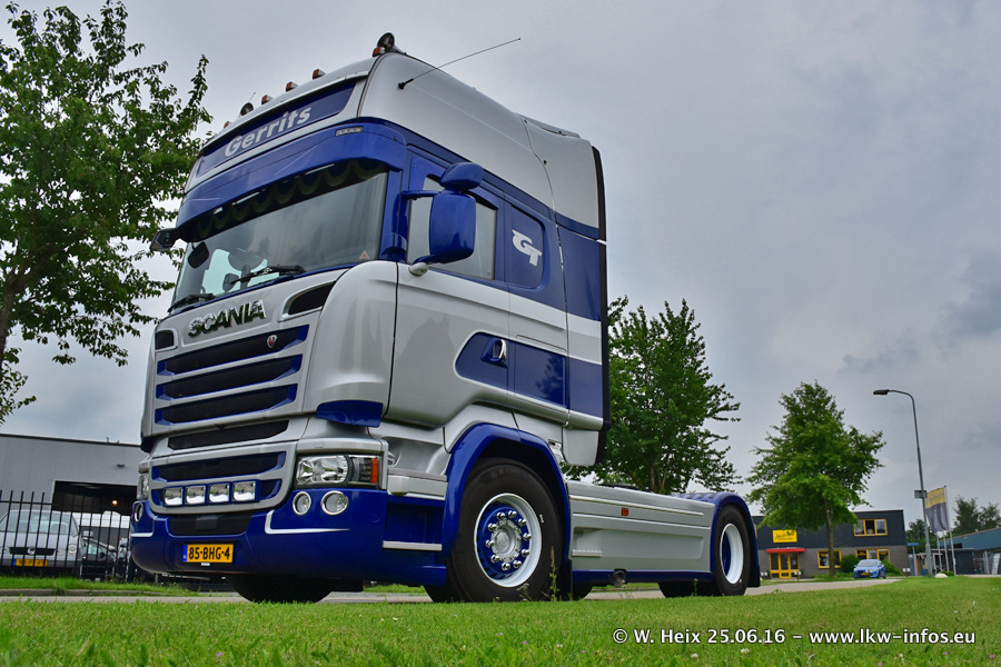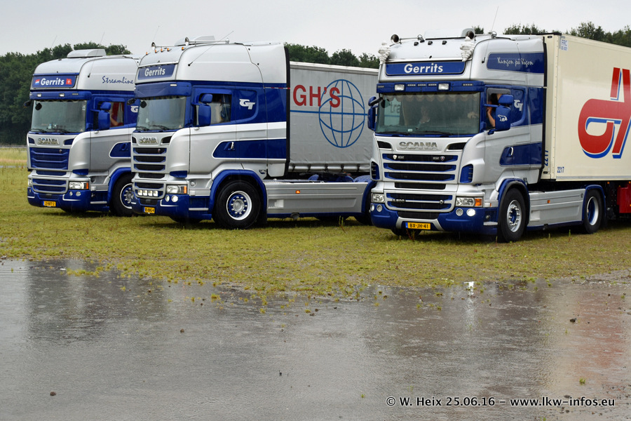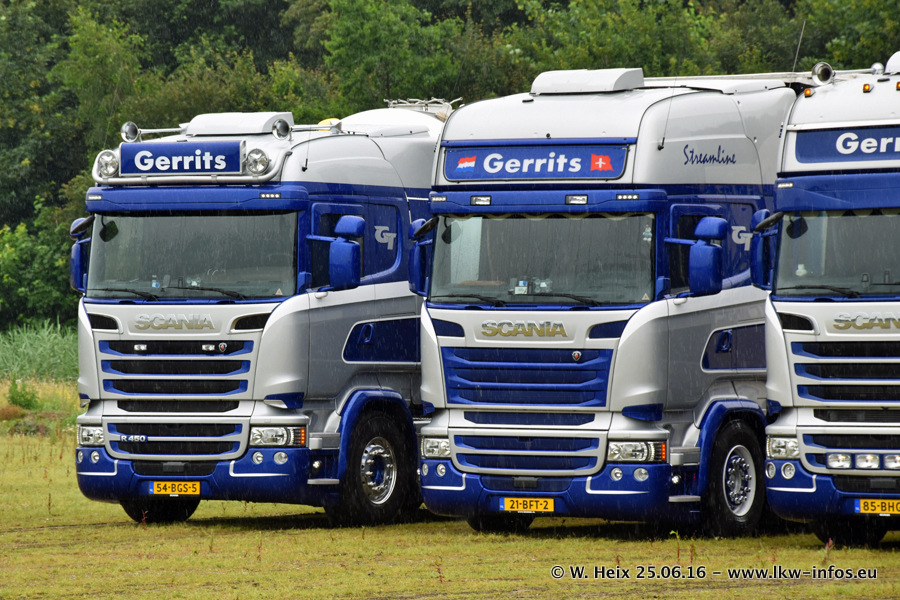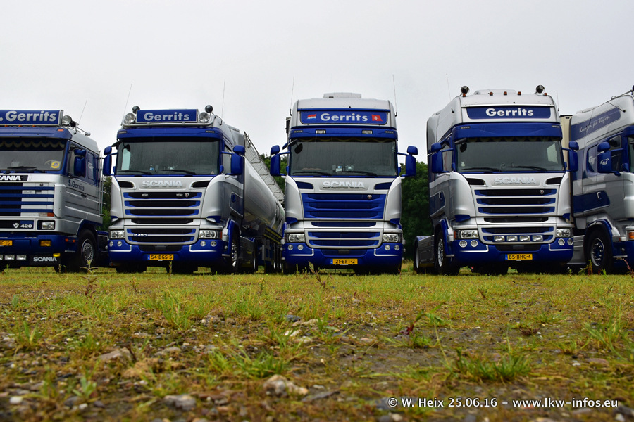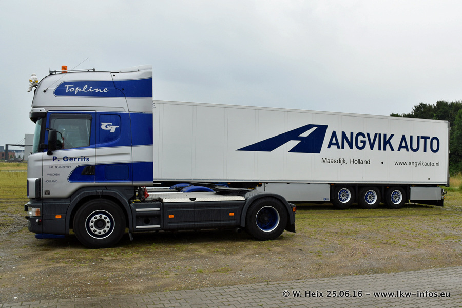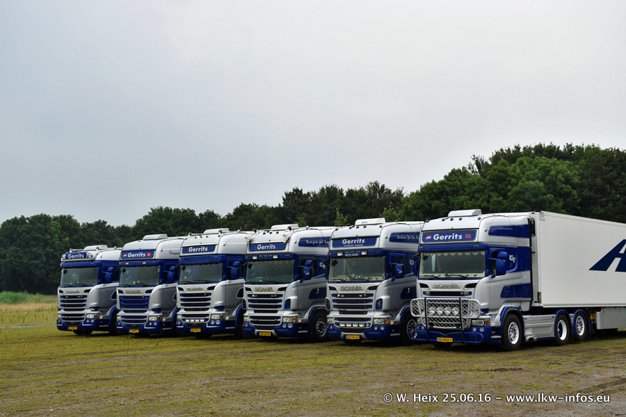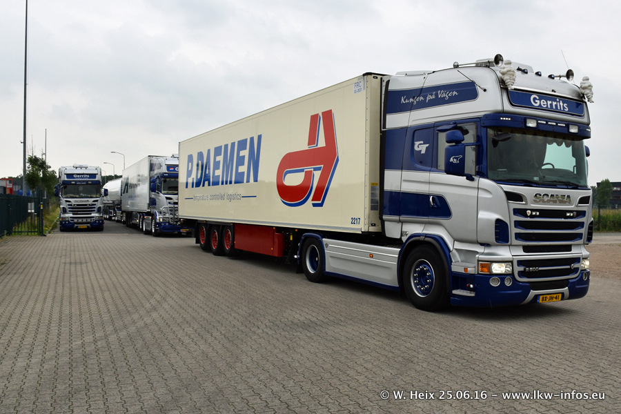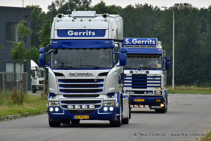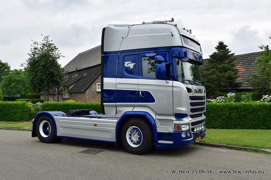 Peter Gerrits hatte mich zum Fotoshooting eingeladen, denn an diesem Samstag hatte er organisiert, dass alle neun LKW zuhause in Wijchen sind. Das Fotoshooting fand auf dem Gelände von Scania Benelux, Wijchen statt. Der Scania 143 V8 Streamline ist inzwischen fest in Zürüch (CH) und einige der V8-Scania sind regelmässig in Norwegen unterwegs und selteh zuhause. Anfang Juni kam übrigens der neute LKW in den Fuhrpark, ein Scania R 450 Streamline Euro 6. Neu ist auch ein Siloauflieger, den Gerrits vor einigen Wochen schon bekommen hat. Das Chassis ist blau lackiert, passend zu den Zugmaschinen. Außerdem hat der neue Auflieger Alufelgen, passend zur Scania-Zugmaschine. Insgesamt eine tolle Kombination. Leider hat das Wetter nicht mitgespielt, denn pünktlich zum eigentlichen Fotoshooting begann es zu regnen und der Regen wurde immer stärker. Trotzdem sind viele schöne Bilder entstanden! Der neue Scania ist übrigens auch schon auf den ersten Bildern in der Galerie zu sehen, zuhause vor dem kleinen Firmenhof in Wijchen.