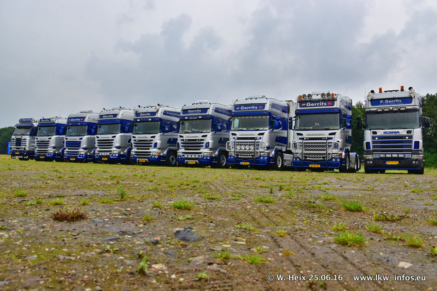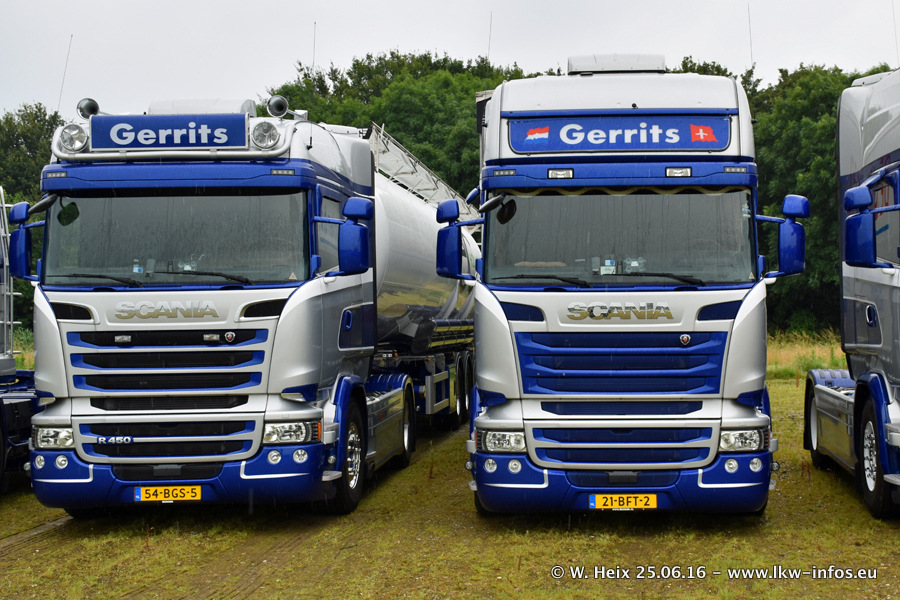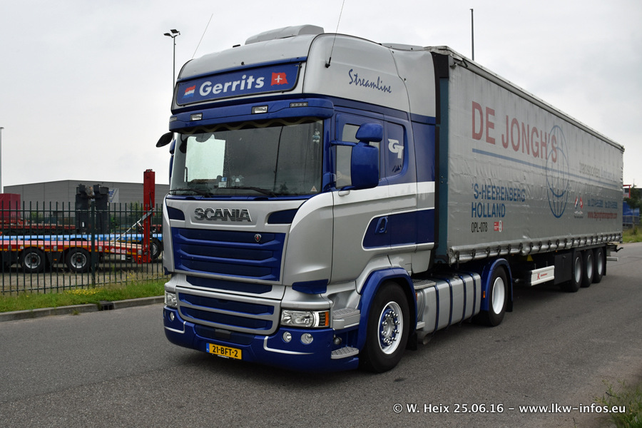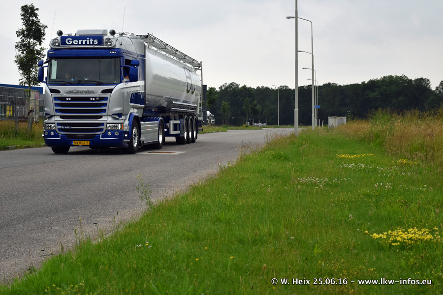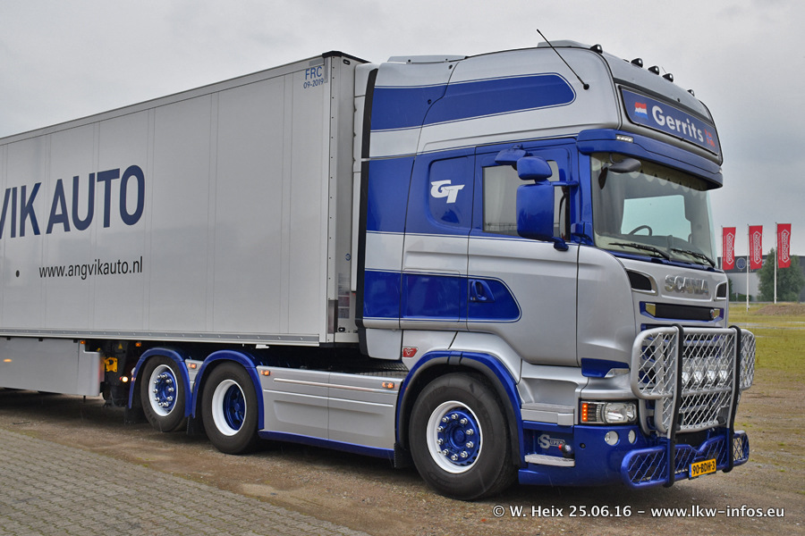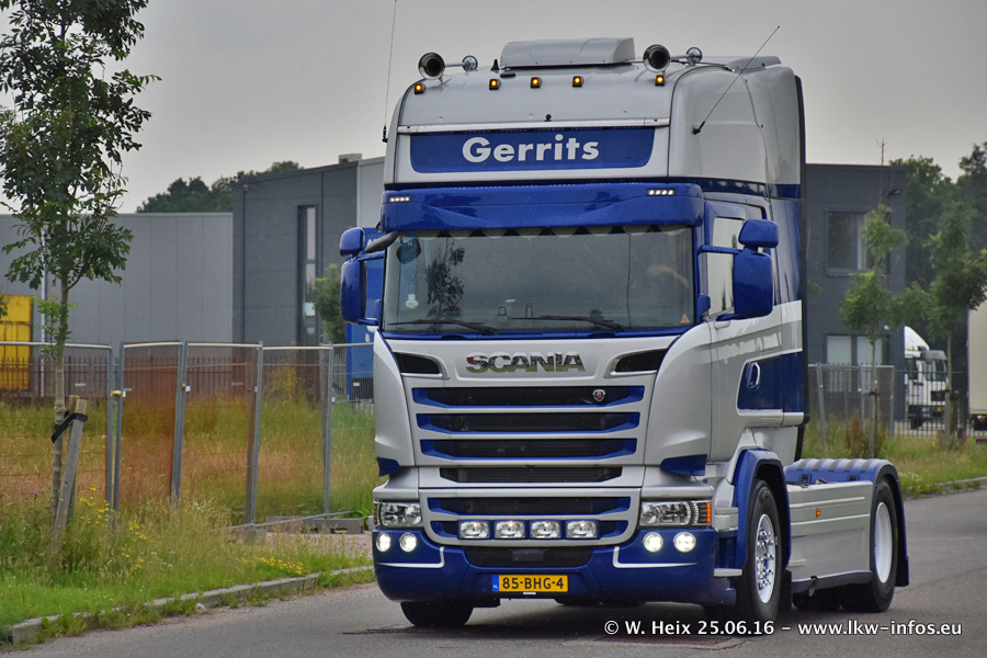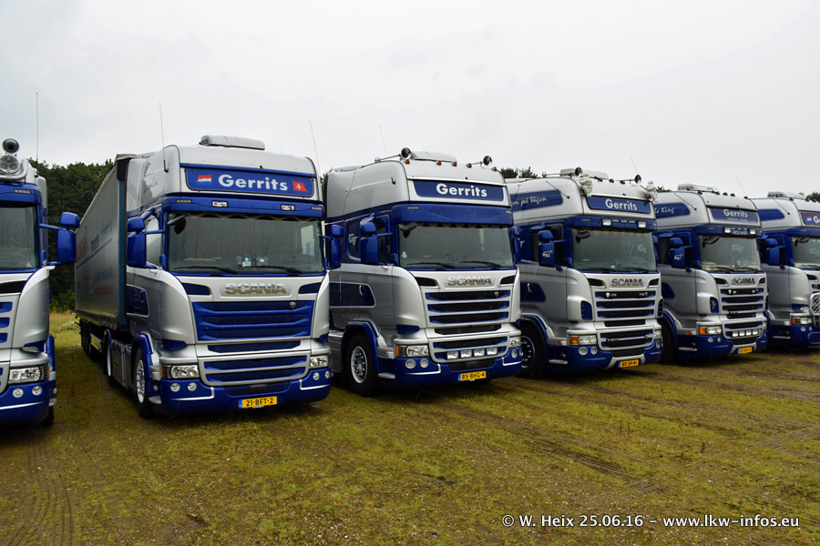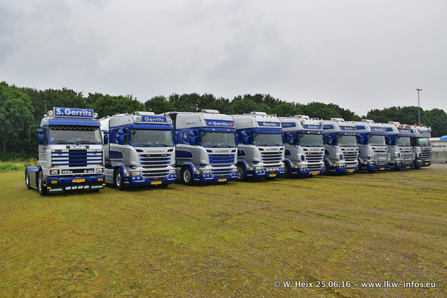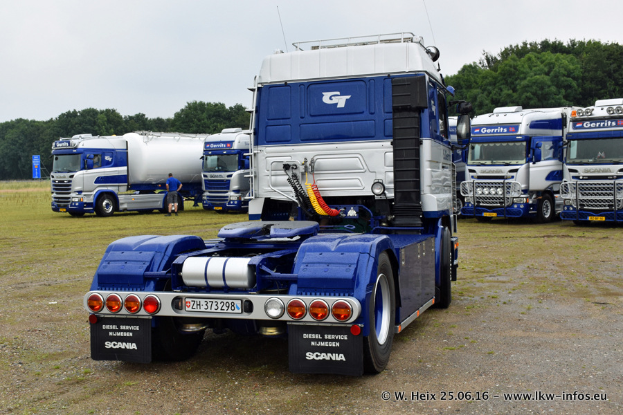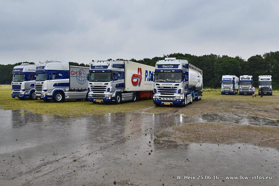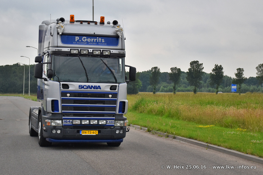 Peter Gerrits hatte mich zum Fotoshooting eingeladen, denn an diesem Samstag hatte er organisiert, dass alle neun LKW zuhause in Wijchen sind. Das Fotoshooting fand auf dem Gelände von Scania Benelux, Wijchen statt. Der Scania 143 V8 Streamline ist inzwischen fest in Zürüch (CH) und einige der V8-Scania sind regelmässig in Norwegen unterwegs und selteh zuhause. Anfang Juni kam übrigens der neute LKW in den Fuhrpark, ein Scania R 450 Streamline Euro 6. Neu ist auch ein Siloauflieger, den Gerrits vor einigen Wochen schon bekommen hat. Das Chassis ist blau lackiert, passend zu den Zugmaschinen. Außerdem hat der neue Auflieger Alufelgen, passend zur Scania-Zugmaschine. Insgesamt eine tolle Kombination. Leider hat das Wetter nicht mitgespielt, denn pünktlich zum eigentlichen Fotoshooting begann es zu regnen und der Regen wurde immer stärker. Trotzdem sind viele schöne Bilder entstanden! Der neue Scania ist übrigens auch schon auf den ersten Bildern in der Galerie zu sehen, zuhause vor dem kleinen Firmenhof in Wijchen.