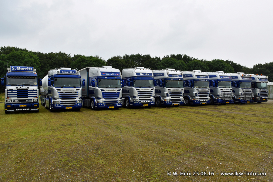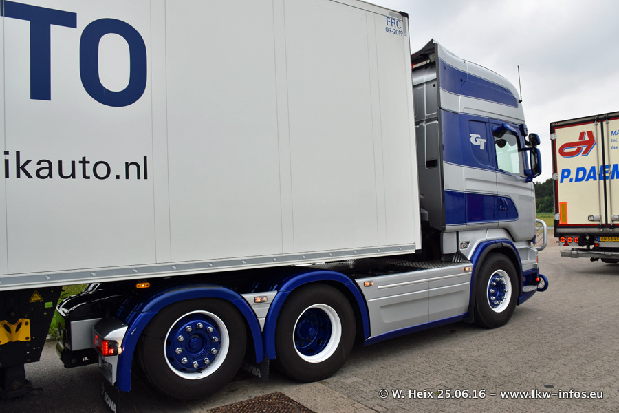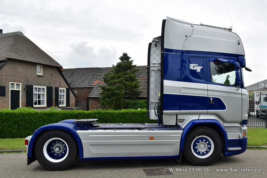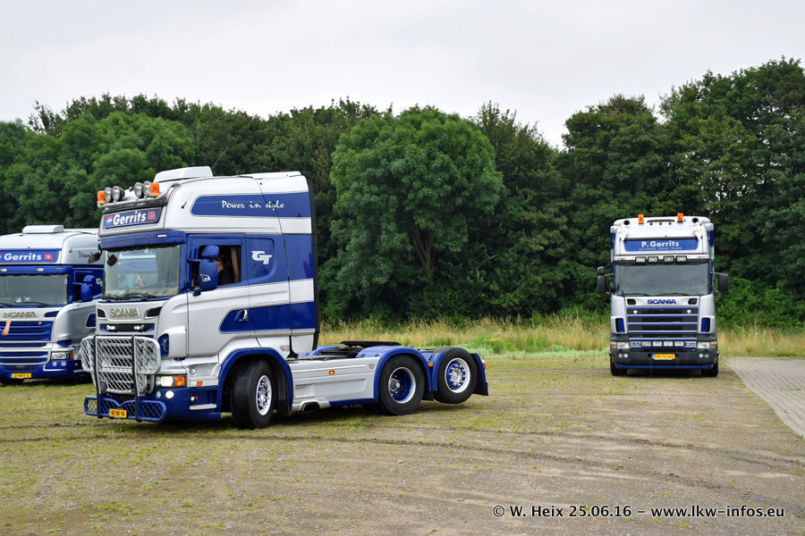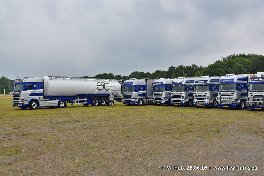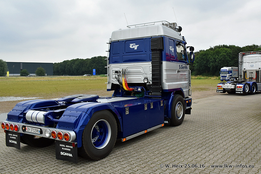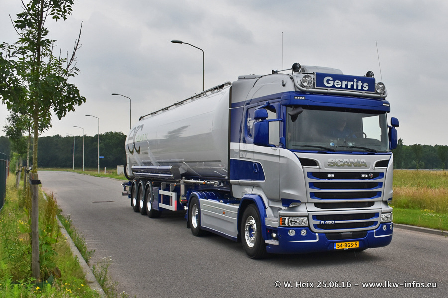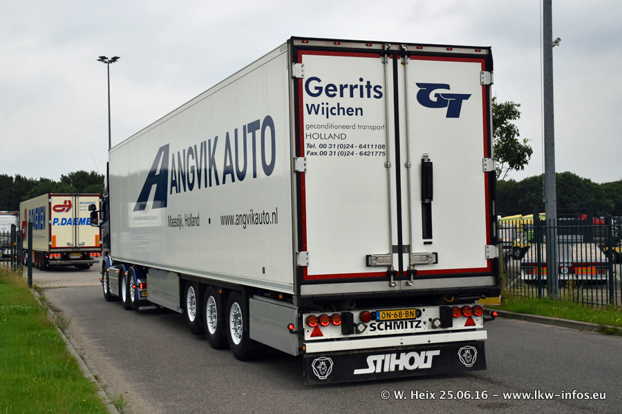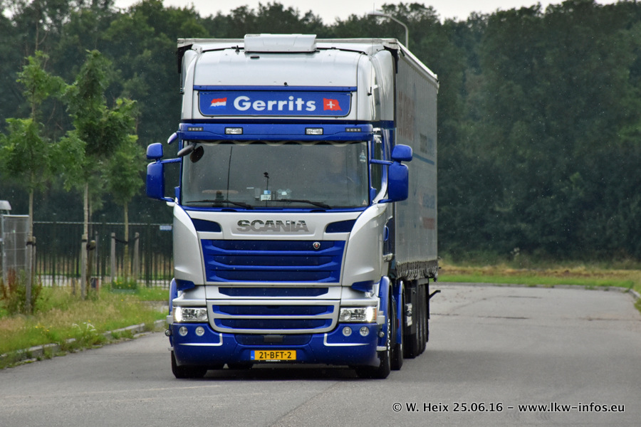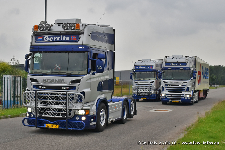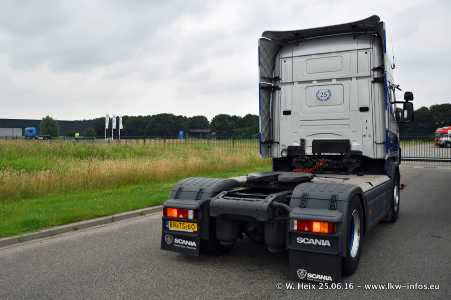 Peter Gerrits hatte mich zum Fotoshooting eingeladen, denn an diesem Samstag hatte er organisiert, dass alle neun LKW zuhause in Wijchen sind. Das Fotoshooting fand auf dem Gelände von Scania Benelux, Wijchen statt. Der Scania 143 V8 Streamline ist inzwischen fest in Zürüch (CH) und einige der V8-Scania sind regelmässig in Norwegen unterwegs und selteh zuhause. Anfang Juni kam übrigens der neute LKW in den Fuhrpark, ein Scania R 450 Streamline Euro 6. Neu ist auch ein Siloauflieger, den Gerrits vor einigen Wochen schon bekommen hat. Das Chassis ist blau lackiert, passend zu den Zugmaschinen. Außerdem hat der neue Auflieger Alufelgen, passend zur Scania-Zugmaschine. Insgesamt eine tolle Kombination. Leider hat das Wetter nicht mitgespielt, denn pünktlich zum eigentlichen Fotoshooting begann es zu regnen und der Regen wurde immer stärker. Trotzdem sind viele schöne Bilder entstanden! Der neue Scania ist übrigens auch schon auf den ersten Bildern in der Galerie zu sehen, zuhause vor dem kleinen Firmenhof in Wijchen.
