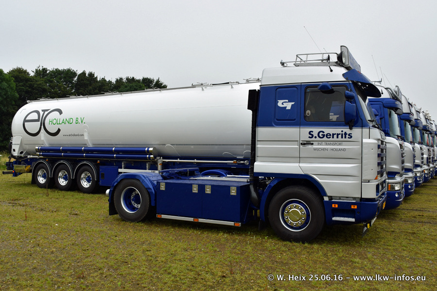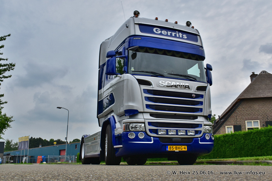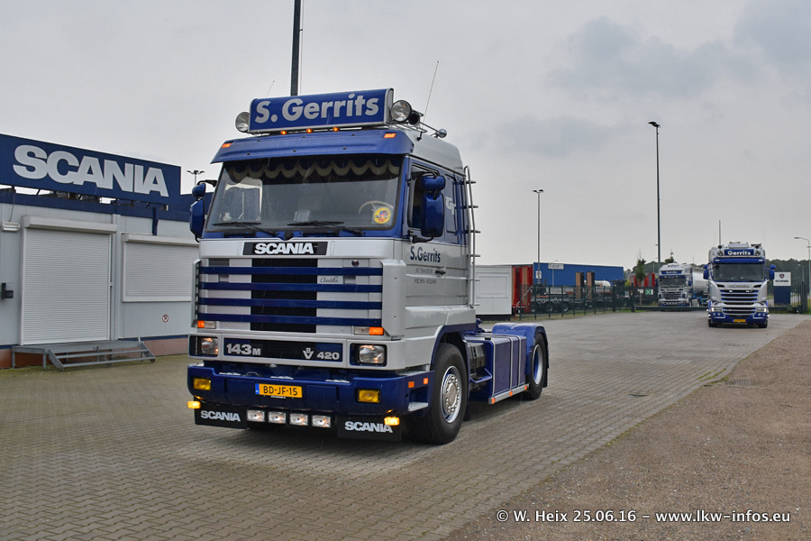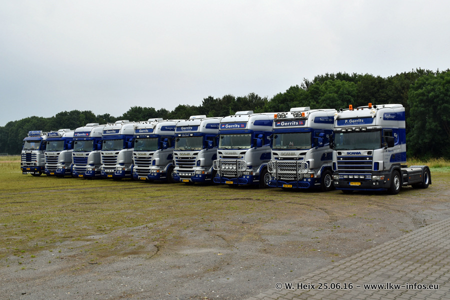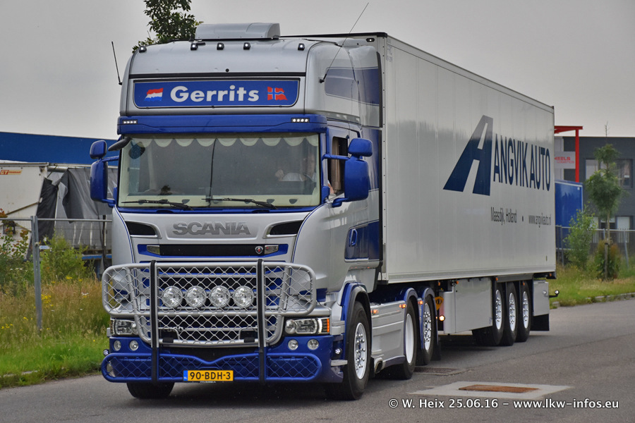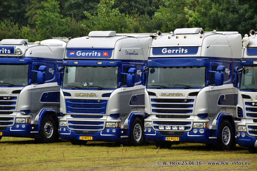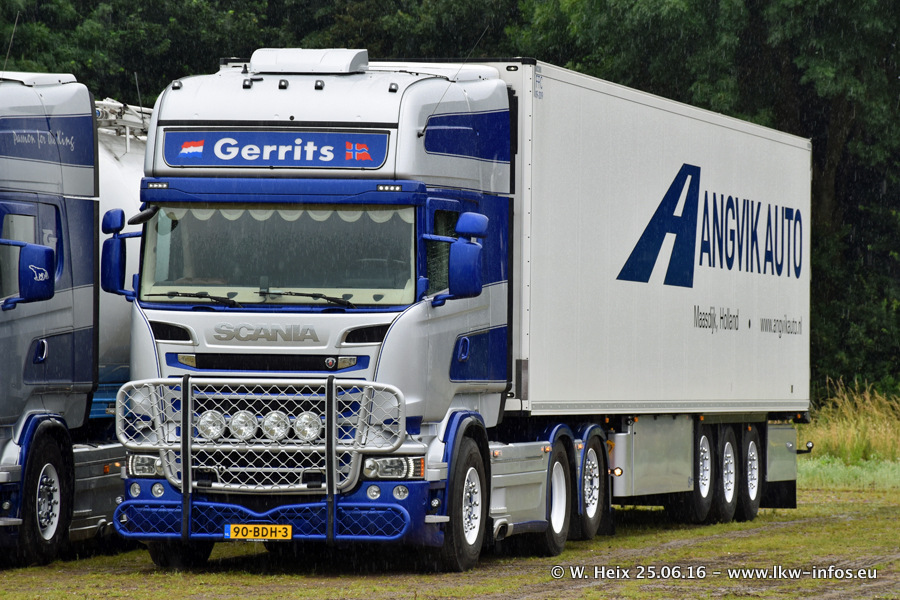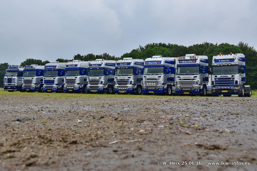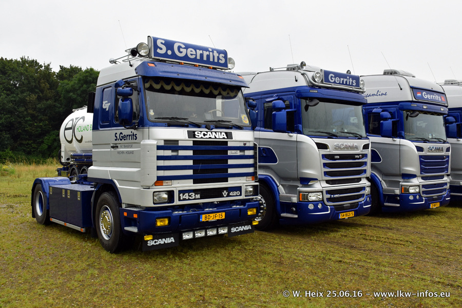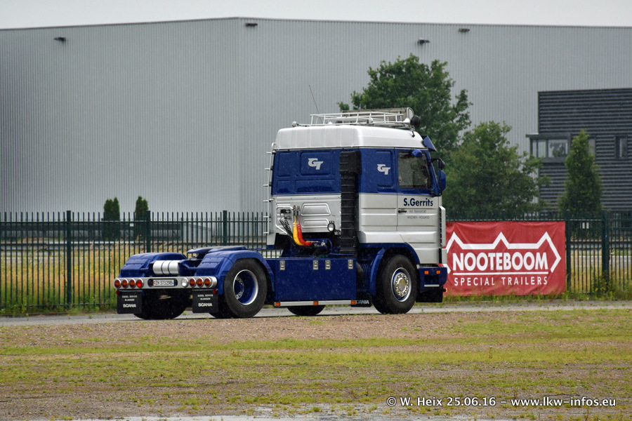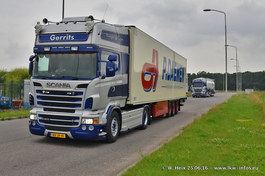 Peter Gerrits hatte mich zum Fotoshooting eingeladen, denn an diesem Samstag hatte er organisiert, dass alle neun LKW zuhause in Wijchen sind. Das Fotoshooting fand auf dem Gelände von Scania Benelux, Wijchen statt. Der Scania 143 V8 Streamline ist inzwischen fest in Zürüch (CH) und einige der V8-Scania sind regelmässig in Norwegen unterwegs und selteh zuhause. Anfang Juni kam übrigens der neute LKW in den Fuhrpark, ein Scania R 450 Streamline Euro 6. Neu ist auch ein Siloauflieger, den Gerrits vor einigen Wochen schon bekommen hat. Das Chassis ist blau lackiert, passend zu den Zugmaschinen. Außerdem hat der neue Auflieger Alufelgen, passend zur Scania-Zugmaschine. Insgesamt eine tolle Kombination. Leider hat das Wetter nicht mitgespielt, denn pünktlich zum eigentlichen Fotoshooting begann es zu regnen und der Regen wurde immer stärker. Trotzdem sind viele schöne Bilder entstanden! Der neue Scania ist übrigens auch schon auf den ersten Bildern in der Galerie zu sehen, zuhause vor dem kleinen Firmenhof in Wijchen.
