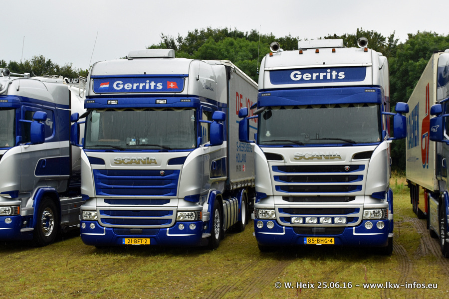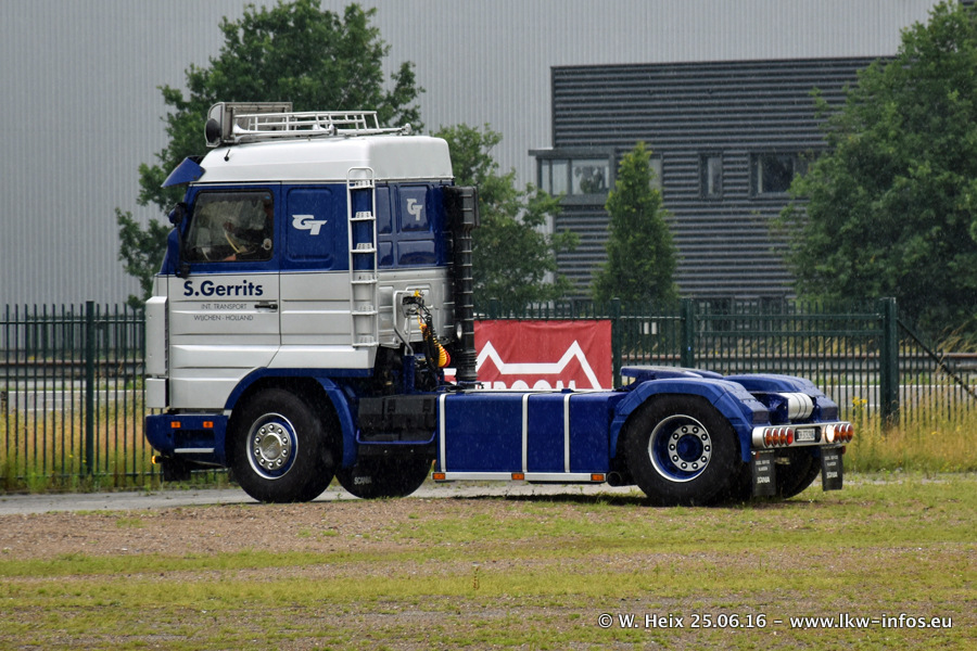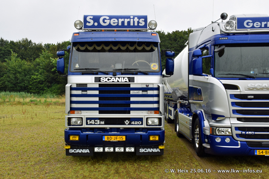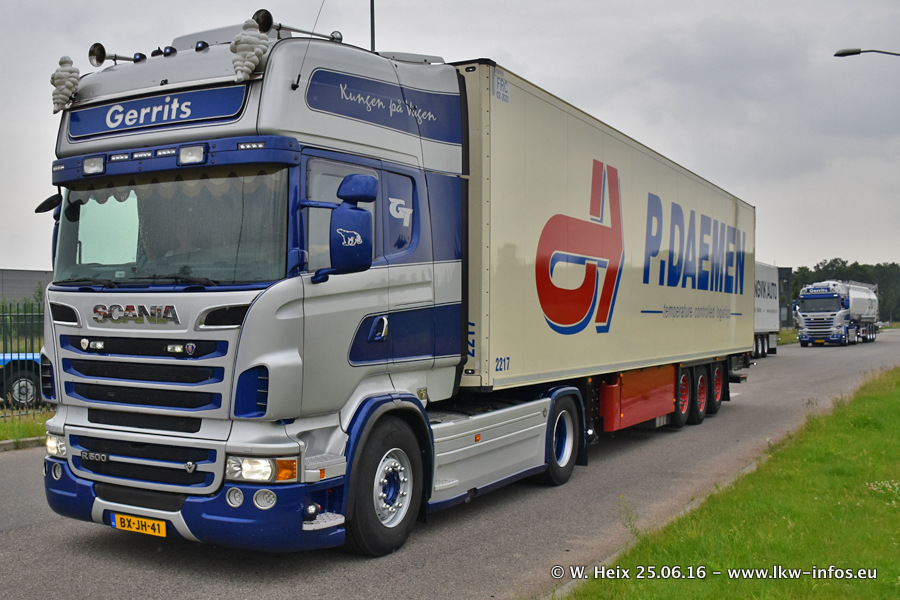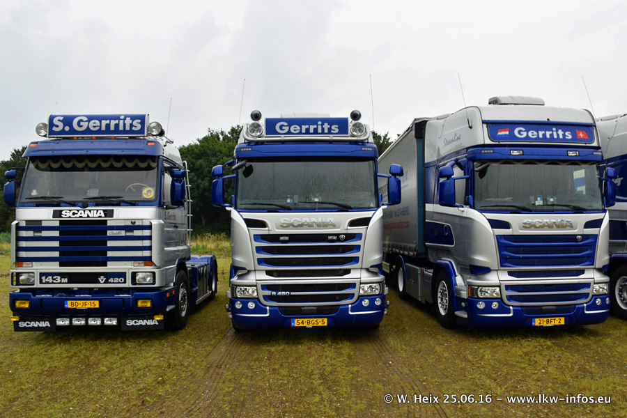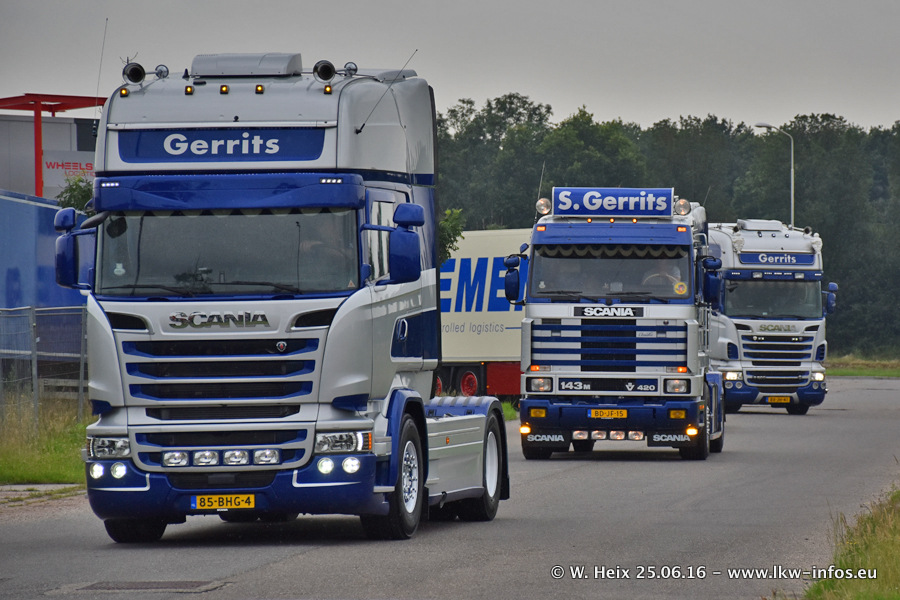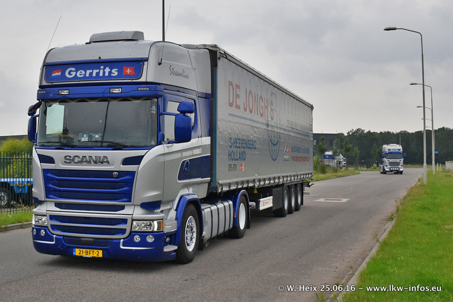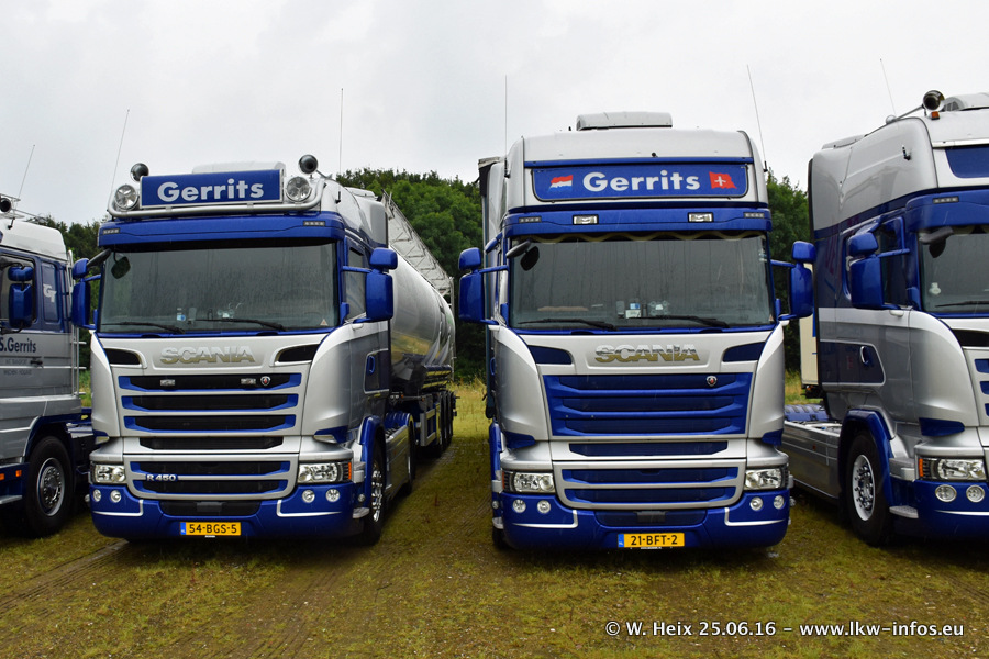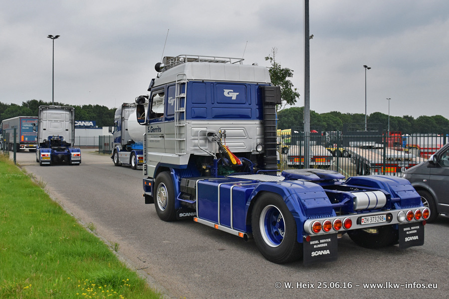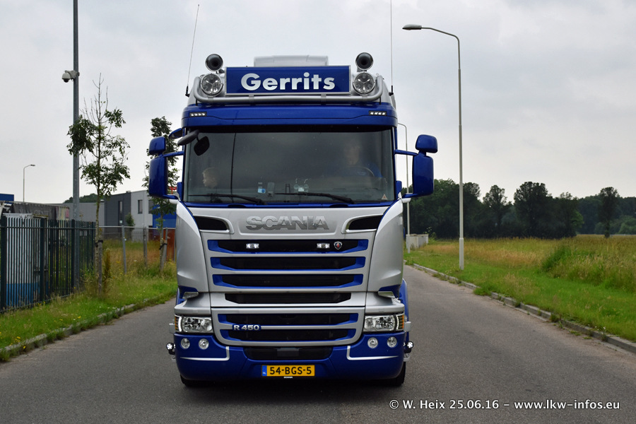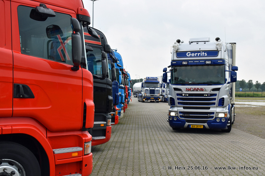 Peter Gerrits hatte mich zum Fotoshooting eingeladen, denn an diesem Samstag hatte er organisiert, dass alle neun LKW zuhause in Wijchen sind. Das Fotoshooting fand auf dem Gelände von Scania Benelux, Wijchen statt. Der Scania 143 V8 Streamline ist inzwischen fest in Zürüch (CH) und einige der V8-Scania sind regelmässig in Norwegen unterwegs und selteh zuhause. Anfang Juni kam übrigens der neute LKW in den Fuhrpark, ein Scania R 450 Streamline Euro 6. Neu ist auch ein Siloauflieger, den Gerrits vor einigen Wochen schon bekommen hat. Das Chassis ist blau lackiert, passend zu den Zugmaschinen. Außerdem hat der neue Auflieger Alufelgen, passend zur Scania-Zugmaschine. Insgesamt eine tolle Kombination. Leider hat das Wetter nicht mitgespielt, denn pünktlich zum eigentlichen Fotoshooting begann es zu regnen und der Regen wurde immer stärker. Trotzdem sind viele schöne Bilder entstanden! Der neue Scania ist übrigens auch schon auf den ersten Bildern in der Galerie zu sehen, zuhause vor dem kleinen Firmenhof in Wijchen.