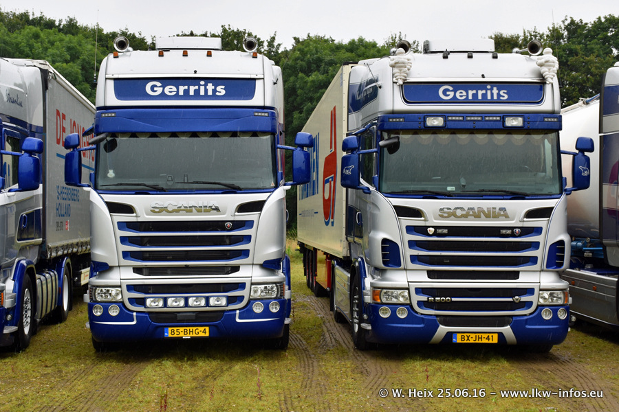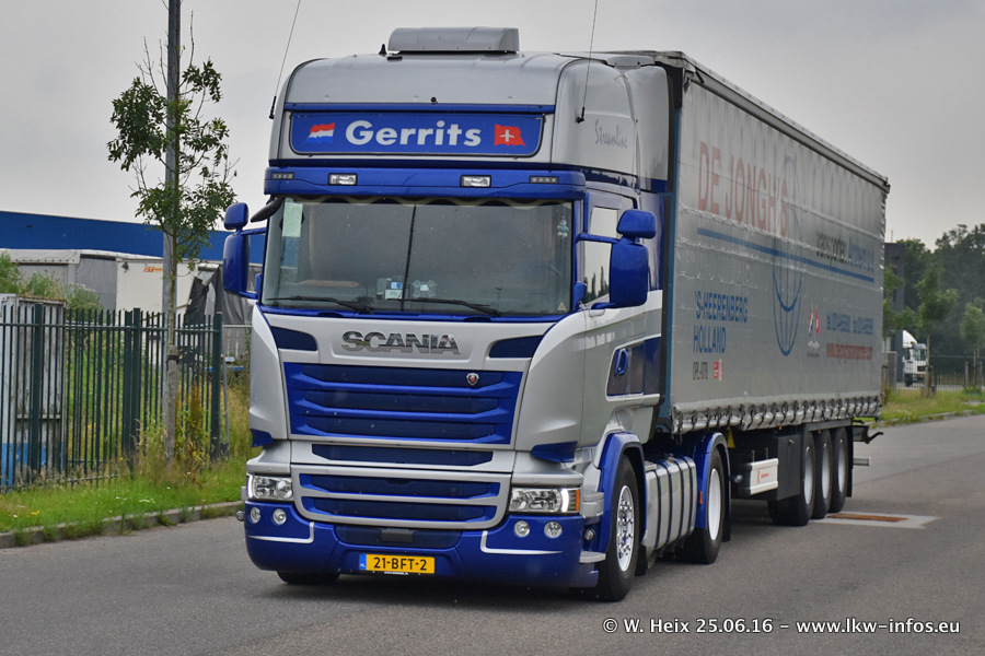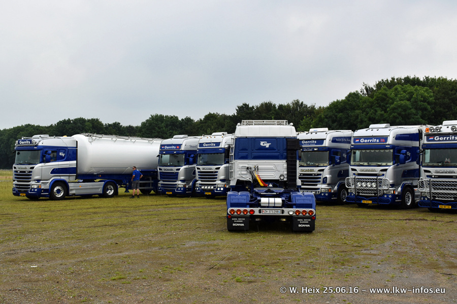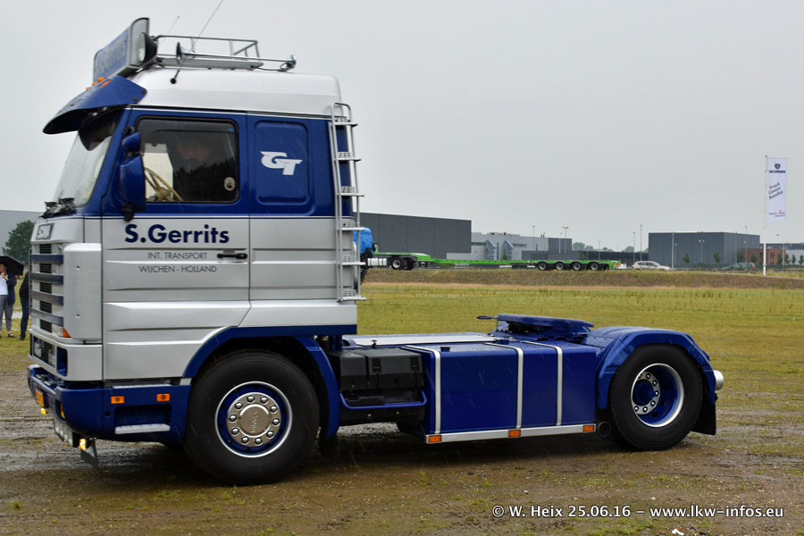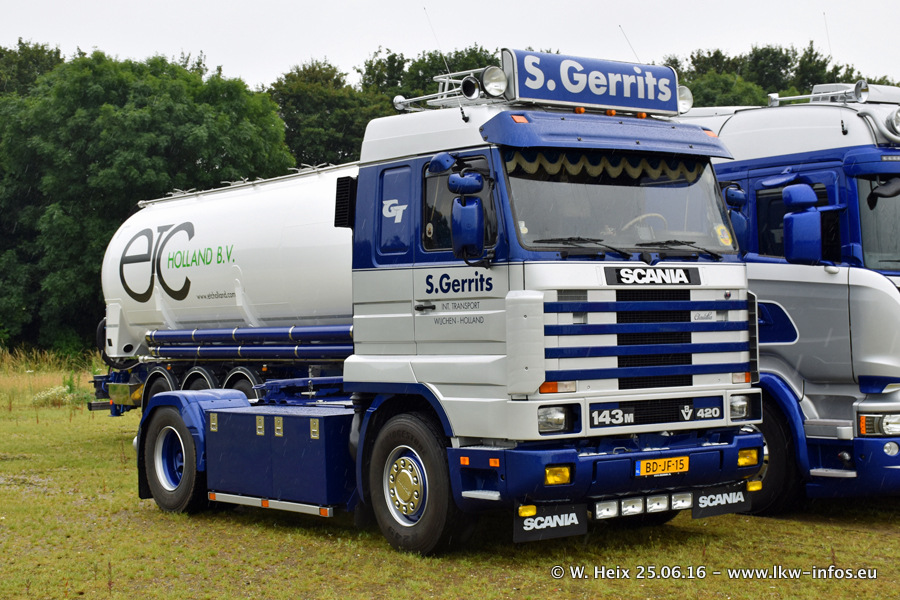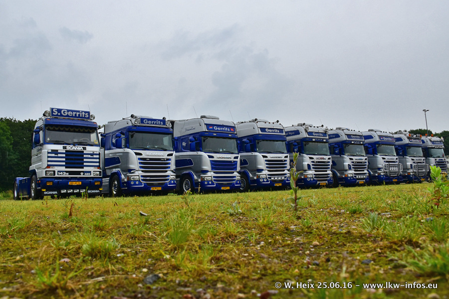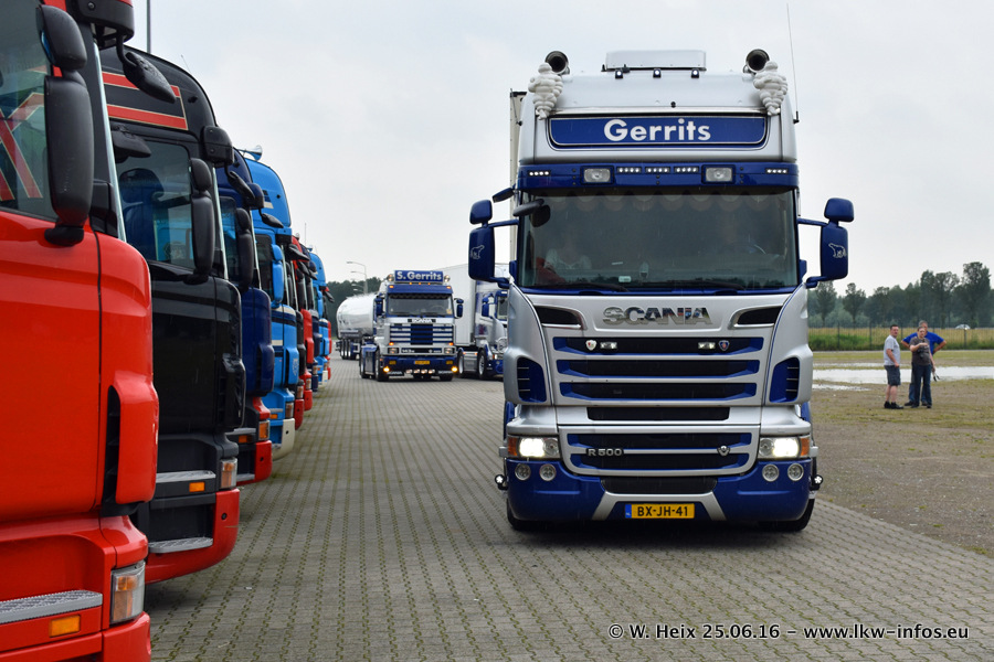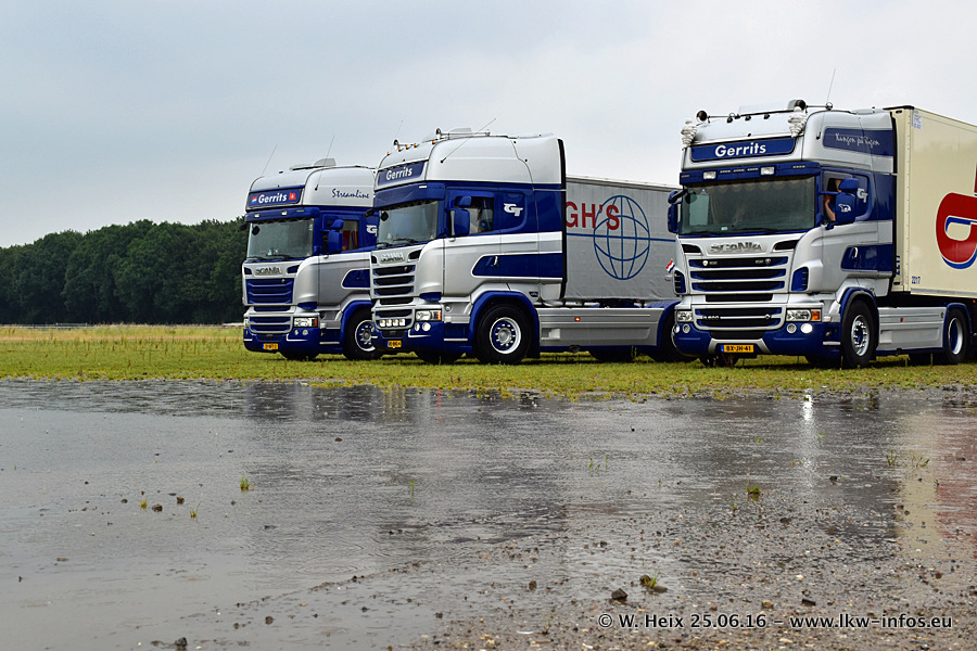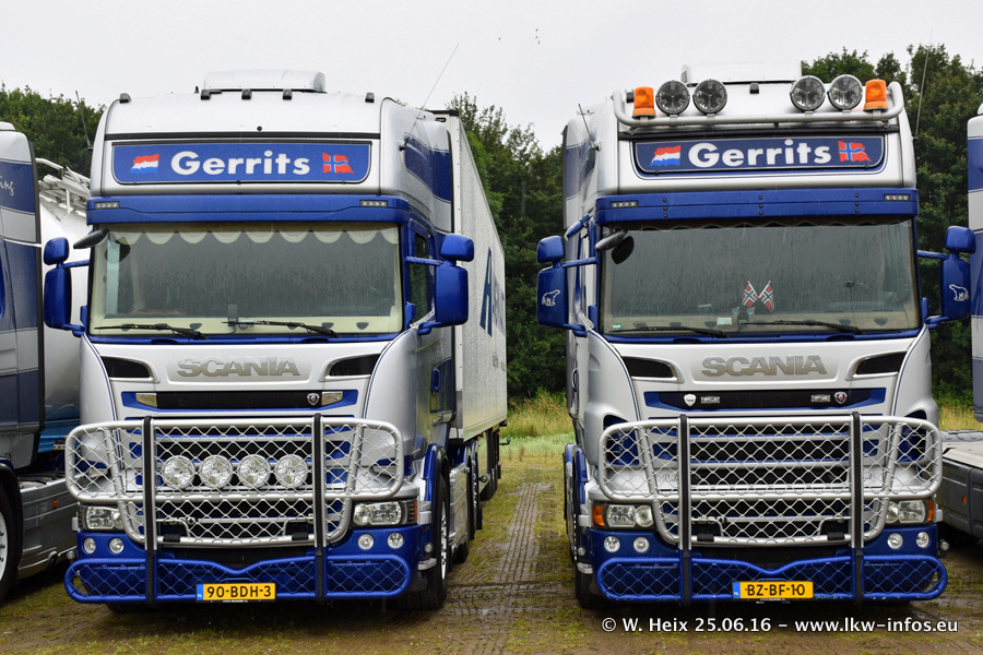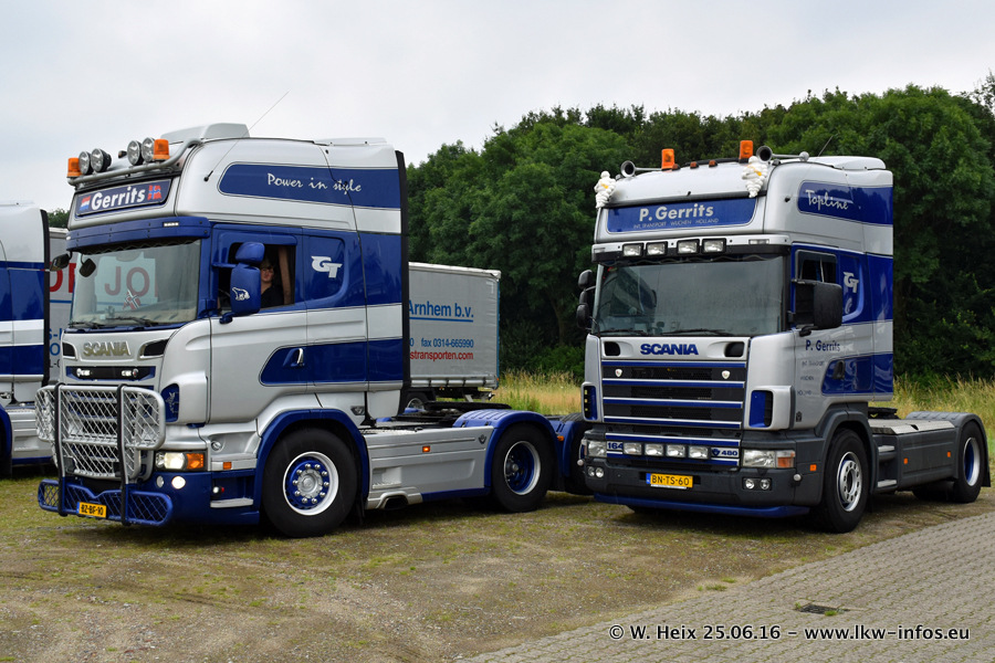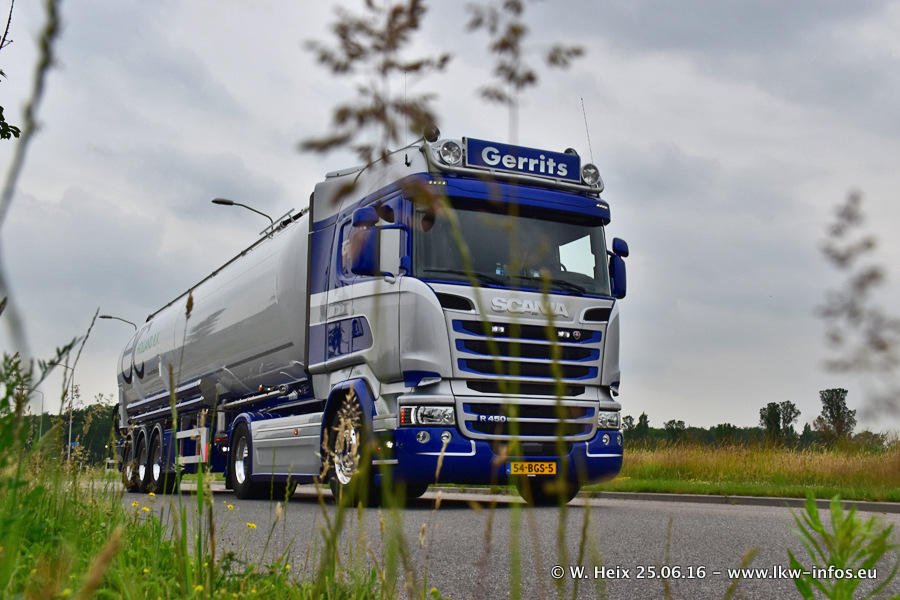 Peter Gerrits hatte mich zum Fotoshooting eingeladen, denn an diesem Samstag hatte er organisiert, dass alle neun LKW zuhause in Wijchen sind. Das Fotoshooting fand auf dem Gelände von Scania Benelux, Wijchen statt. Der Scania 143 V8 Streamline ist inzwischen fest in Zürüch (CH) und einige der V8-Scania sind regelmässig in Norwegen unterwegs und selteh zuhause. Anfang Juni kam übrigens der neute LKW in den Fuhrpark, ein Scania R 450 Streamline Euro 6. Neu ist auch ein Siloauflieger, den Gerrits vor einigen Wochen schon bekommen hat. Das Chassis ist blau lackiert, passend zu den Zugmaschinen. Außerdem hat der neue Auflieger Alufelgen, passend zur Scania-Zugmaschine. Insgesamt eine tolle Kombination. Leider hat das Wetter nicht mitgespielt, denn pünktlich zum eigentlichen Fotoshooting begann es zu regnen und der Regen wurde immer stärker. Trotzdem sind viele schöne Bilder entstanden! Der neue Scania ist übrigens auch schon auf den ersten Bildern in der Galerie zu sehen, zuhause vor dem kleinen Firmenhof in Wijchen.