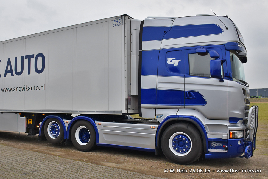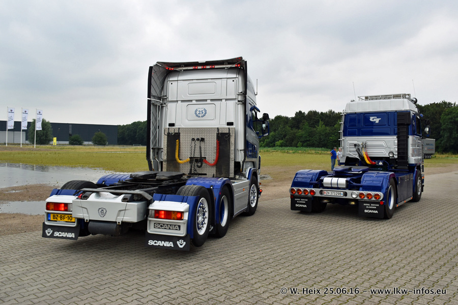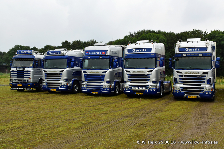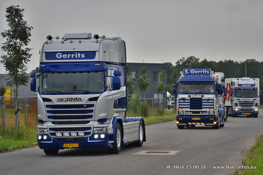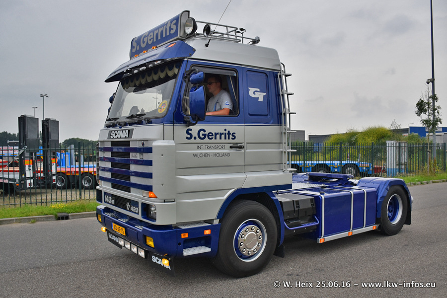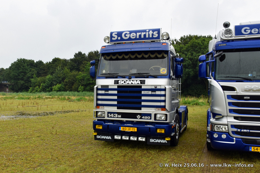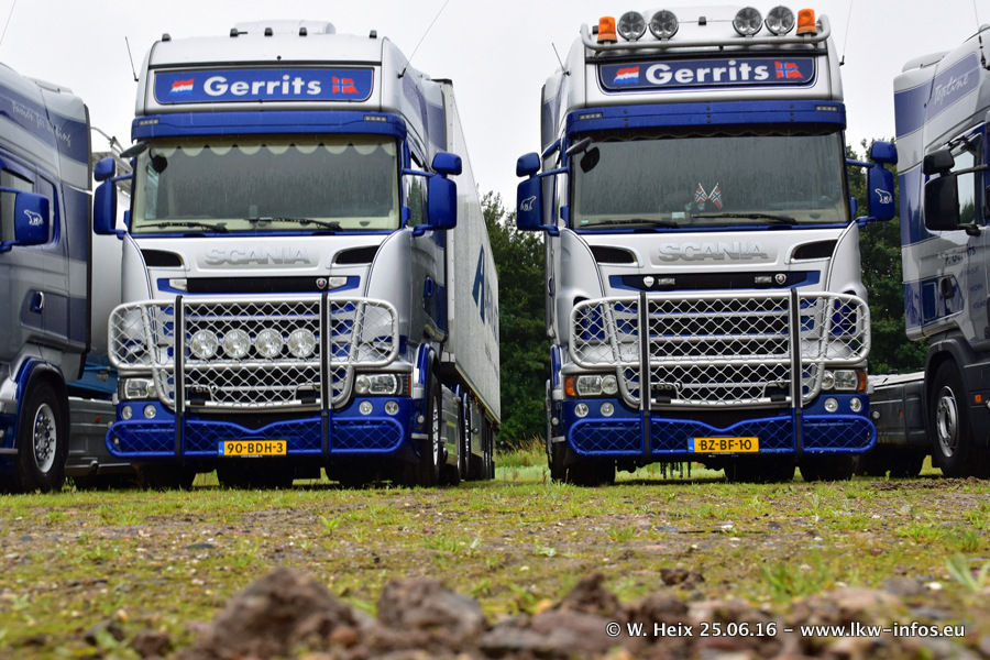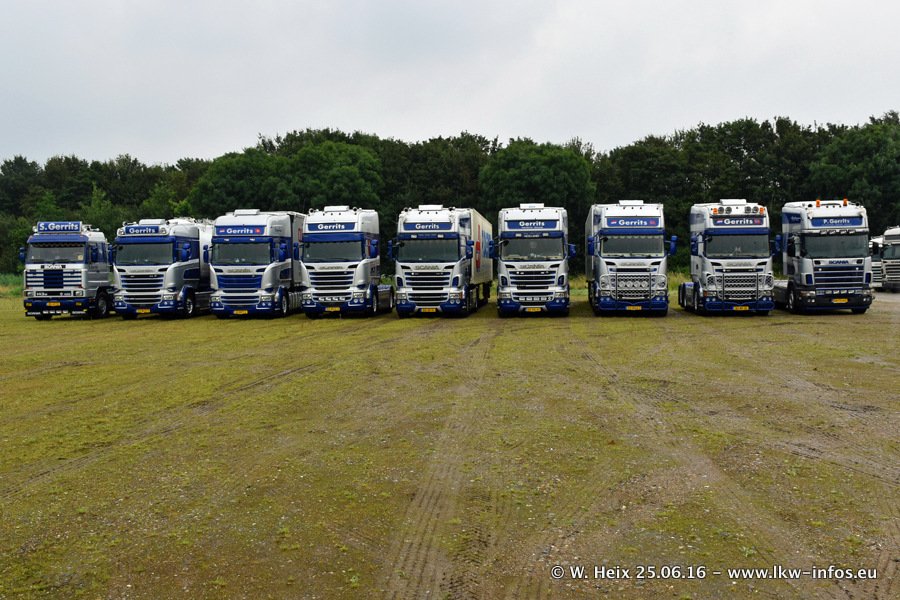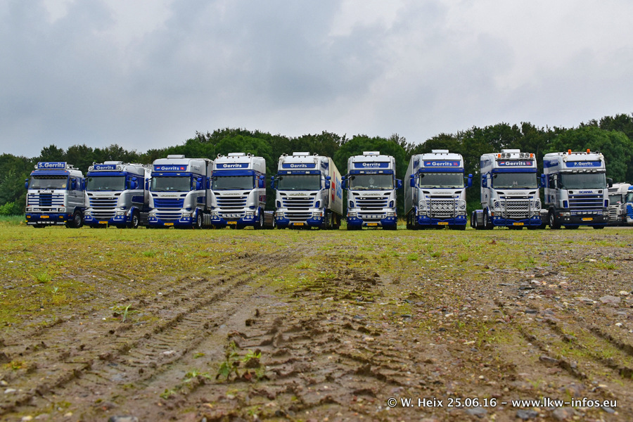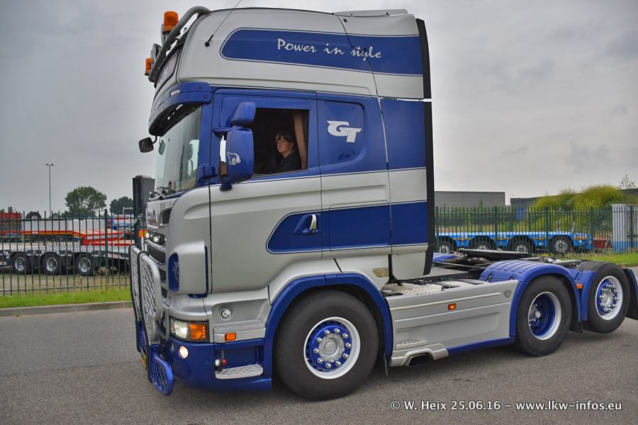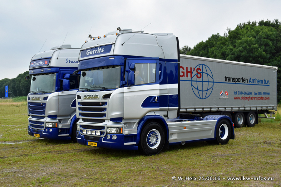 Peter Gerrits hatte mich zum Fotoshooting eingeladen, denn an diesem Samstag hatte er organisiert, dass alle neun LKW zuhause in Wijchen sind. Das Fotoshooting fand auf dem Gelände von Scania Benelux, Wijchen statt. Der Scania 143 V8 Streamline ist inzwischen fest in Zürüch (CH) und einige der V8-Scania sind regelmässig in Norwegen unterwegs und selteh zuhause. Anfang Juni kam übrigens der neute LKW in den Fuhrpark, ein Scania R 450 Streamline Euro 6. Neu ist auch ein Siloauflieger, den Gerrits vor einigen Wochen schon bekommen hat. Das Chassis ist blau lackiert, passend zu den Zugmaschinen. Außerdem hat der neue Auflieger Alufelgen, passend zur Scania-Zugmaschine. Insgesamt eine tolle Kombination. Leider hat das Wetter nicht mitgespielt, denn pünktlich zum eigentlichen Fotoshooting begann es zu regnen und der Regen wurde immer stärker. Trotzdem sind viele schöne Bilder entstanden! Der neue Scania ist übrigens auch schon auf den ersten Bildern in der Galerie zu sehen, zuhause vor dem kleinen Firmenhof in Wijchen.