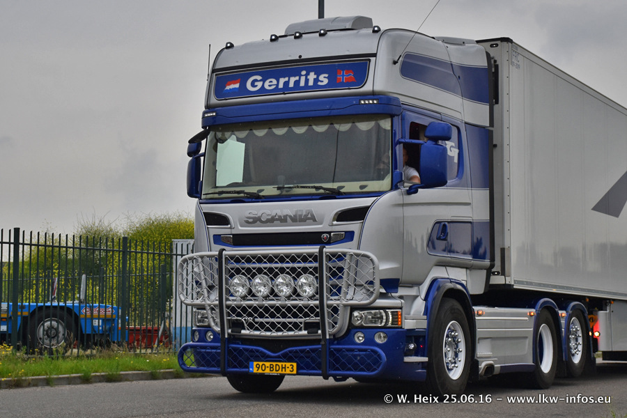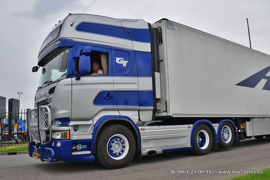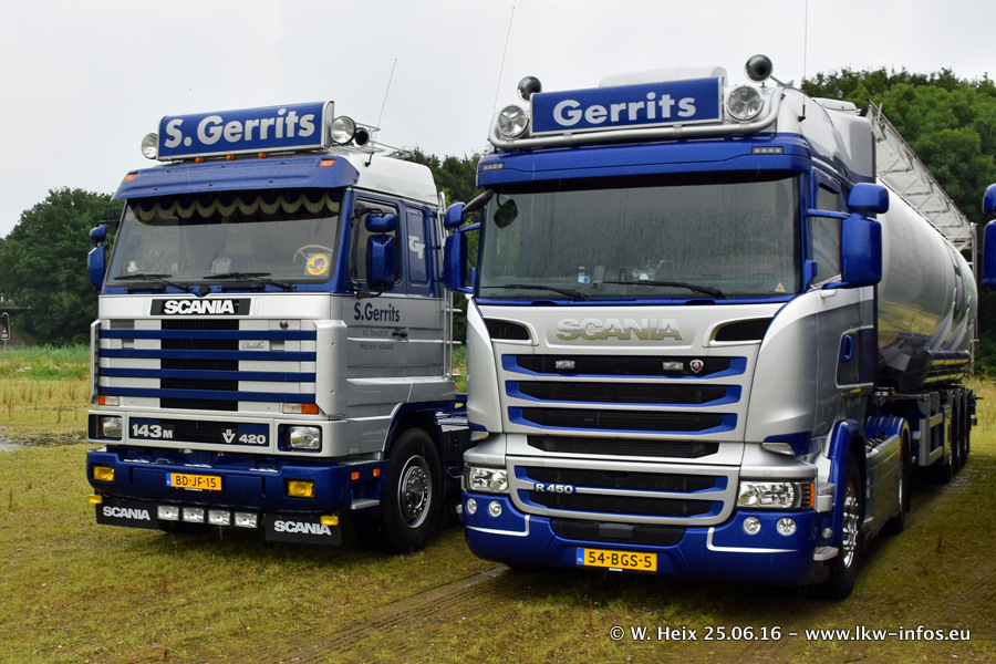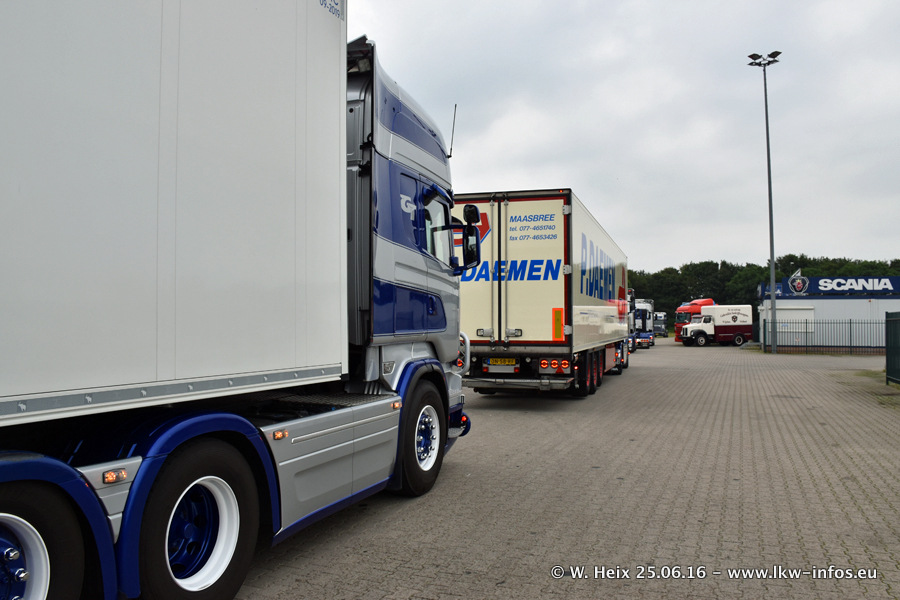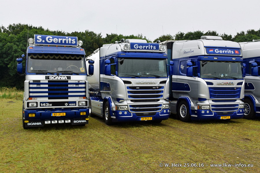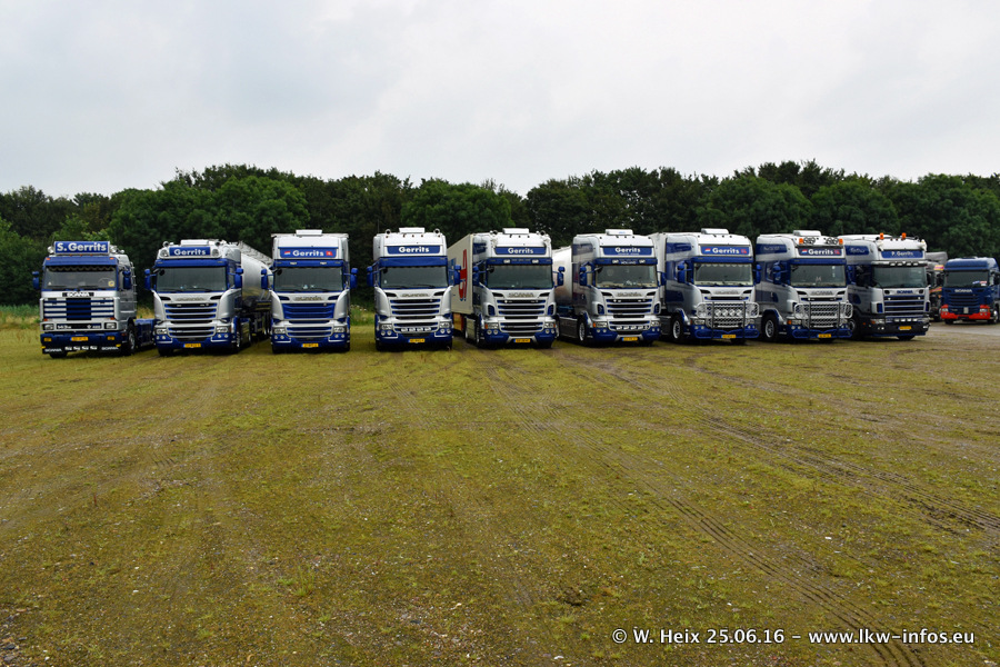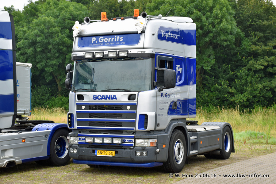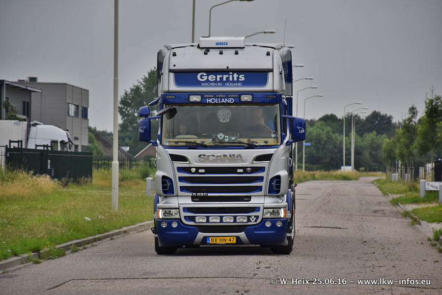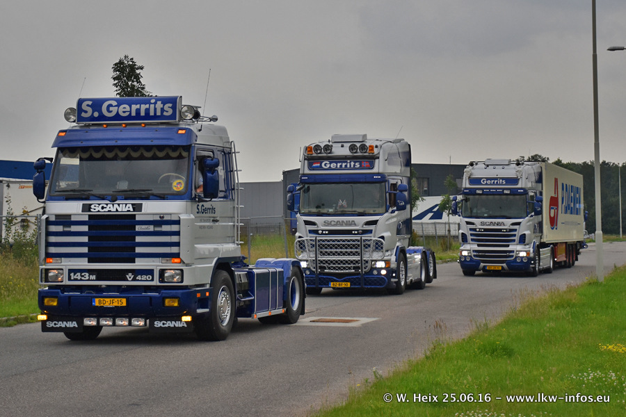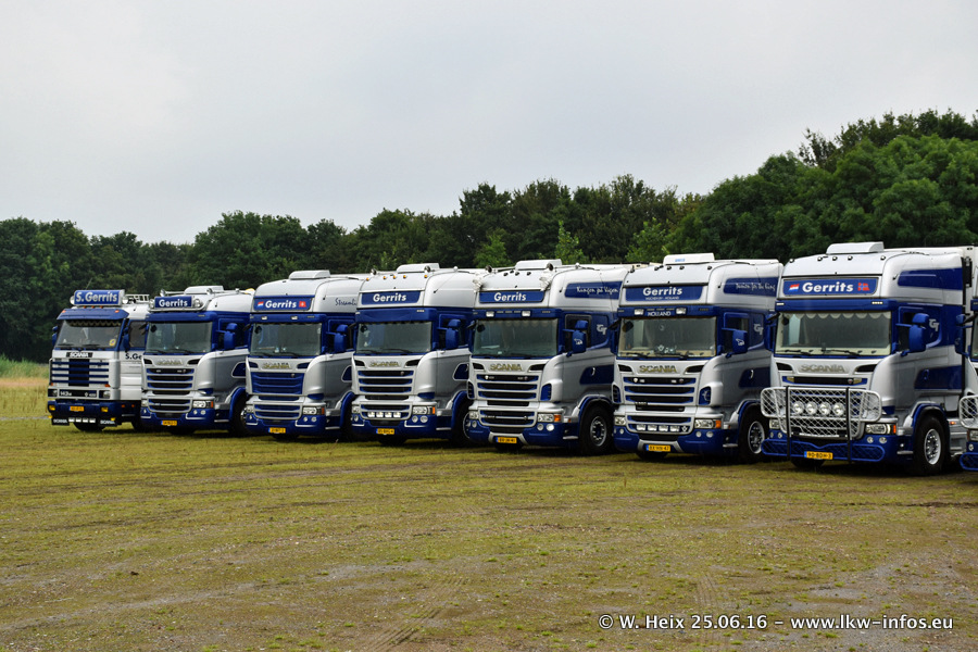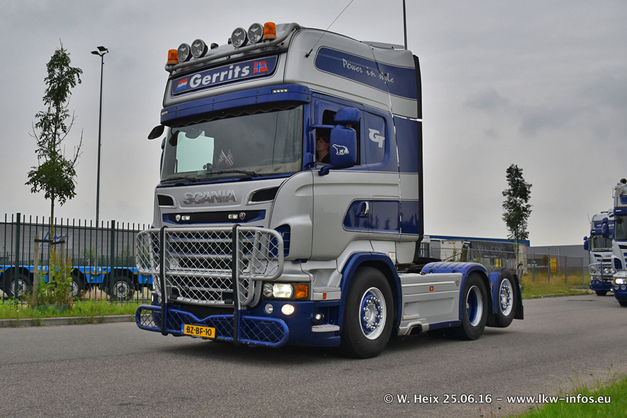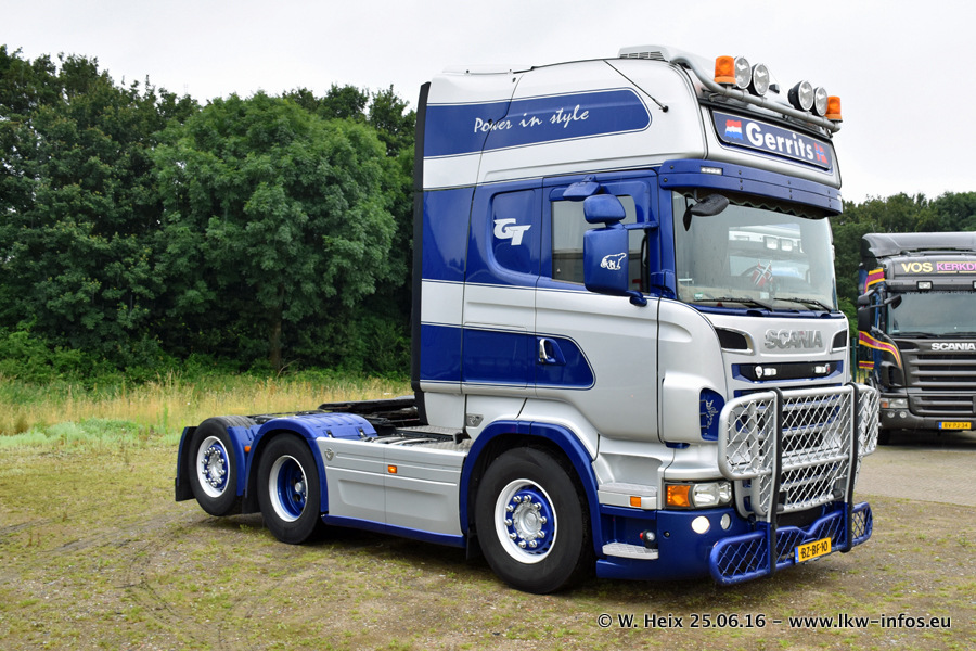 Peter Gerrits hatte mich zum Fotoshooting eingeladen, denn an diesem Samstag hatte er organisiert, dass alle neun LKW zuhause in Wijchen sind. Das Fotoshooting fand auf dem Gelände von Scania Benelux, Wijchen statt. Der Scania 143 V8 Streamline ist inzwischen fest in Zürüch (CH) und einige der V8-Scania sind regelmässig in Norwegen unterwegs und selteh zuhause. Anfang Juni kam übrigens der neute LKW in den Fuhrpark, ein Scania R 450 Streamline Euro 6. Neu ist auch ein Siloauflieger, den Gerrits vor einigen Wochen schon bekommen hat. Das Chassis ist blau lackiert, passend zu den Zugmaschinen. Außerdem hat der neue Auflieger Alufelgen, passend zur Scania-Zugmaschine. Insgesamt eine tolle Kombination. Leider hat das Wetter nicht mitgespielt, denn pünktlich zum eigentlichen Fotoshooting begann es zu regnen und der Regen wurde immer stärker. Trotzdem sind viele schöne Bilder entstanden! Der neue Scania ist übrigens auch schon auf den ersten Bildern in der Galerie zu sehen, zuhause vor dem kleinen Firmenhof in Wijchen.