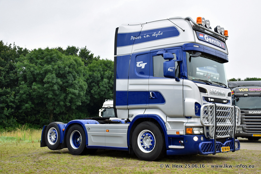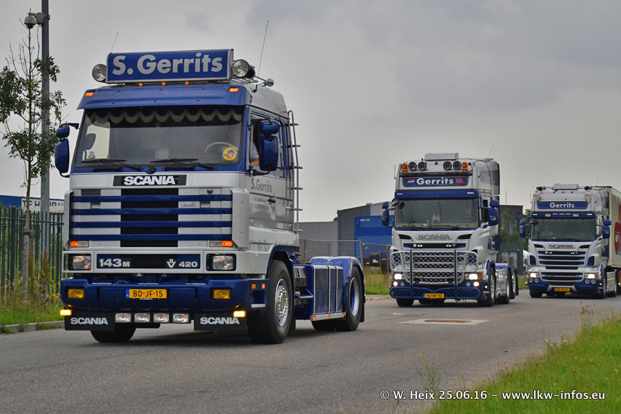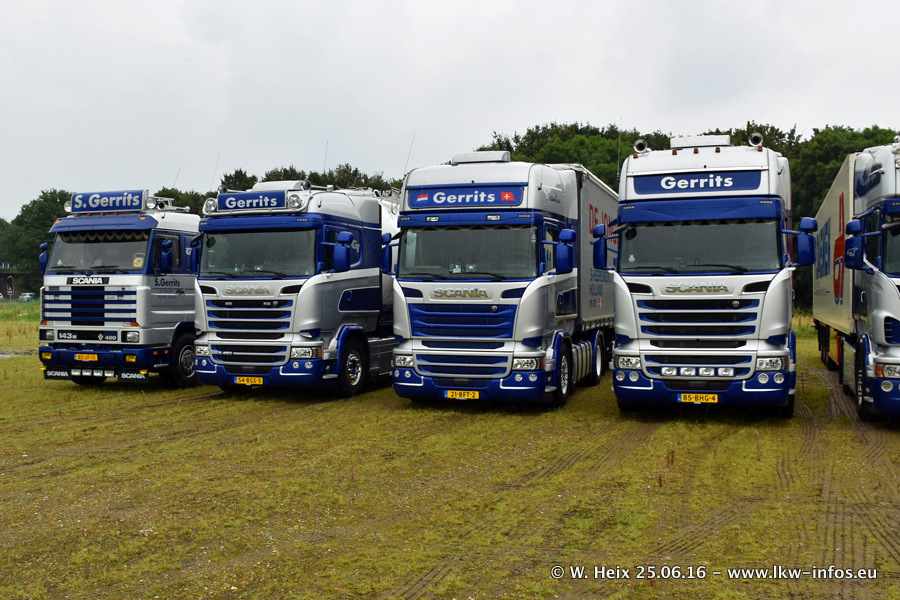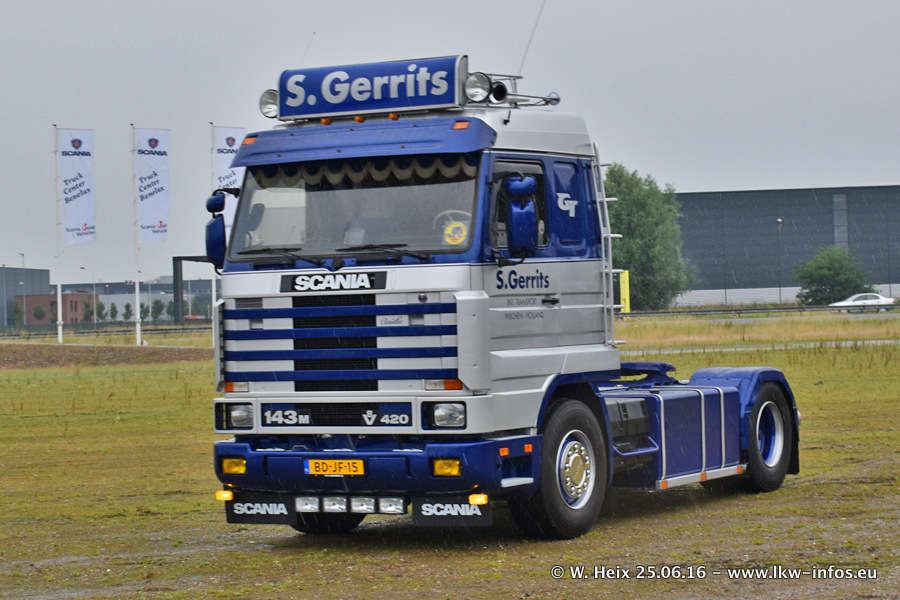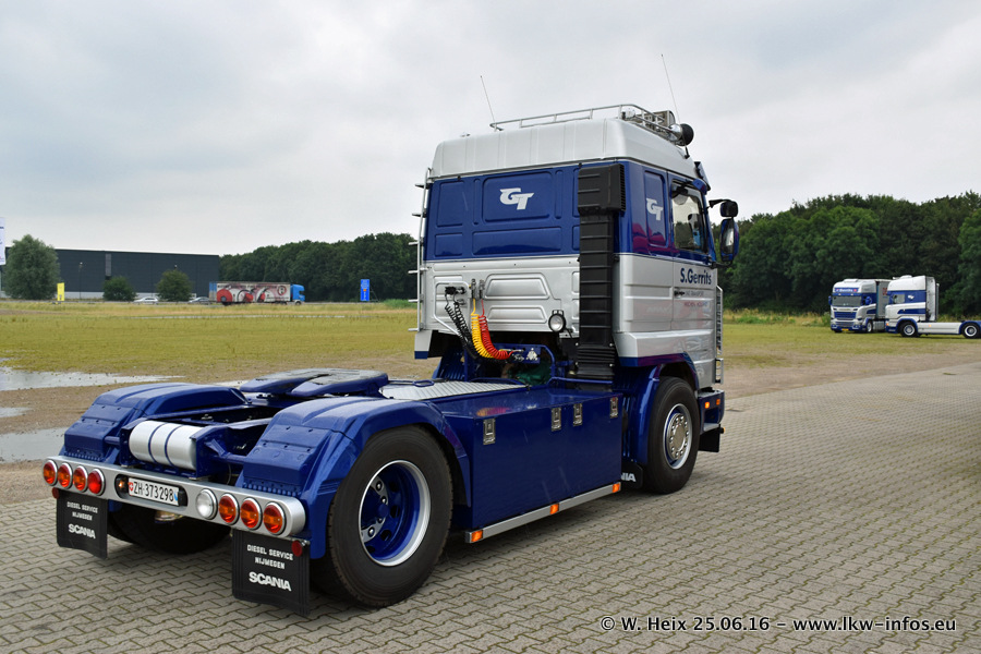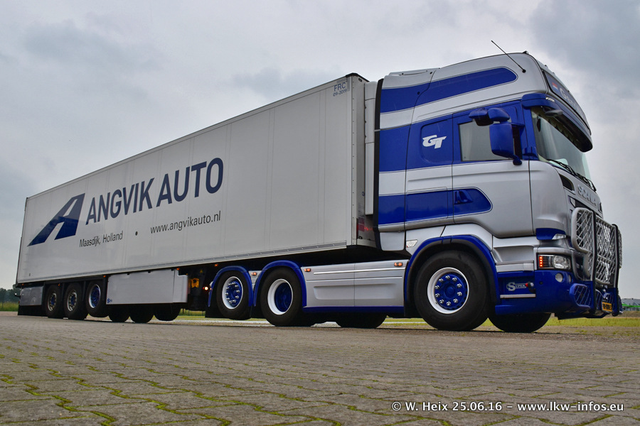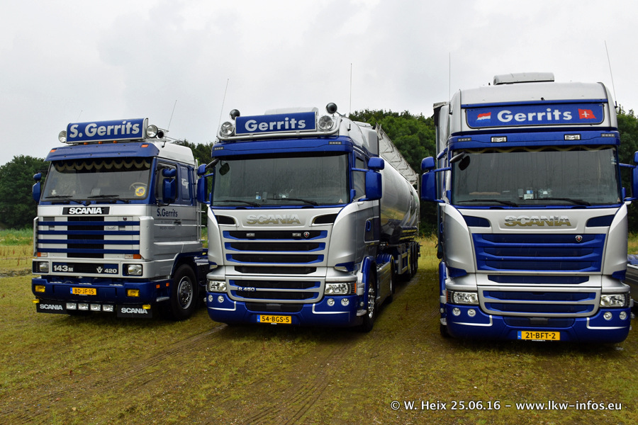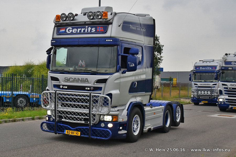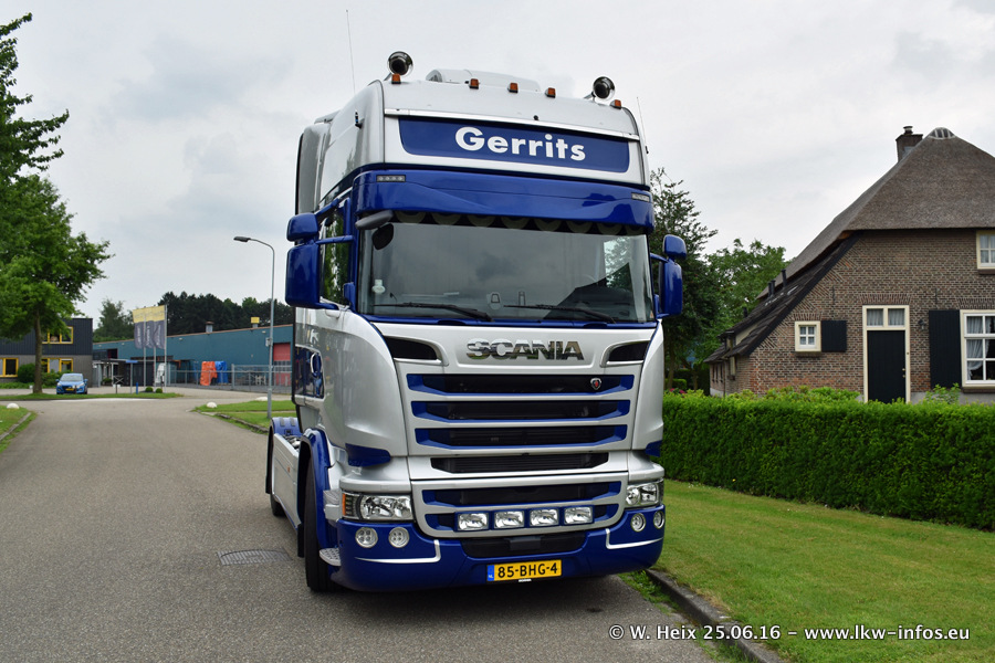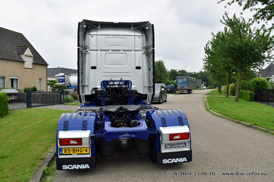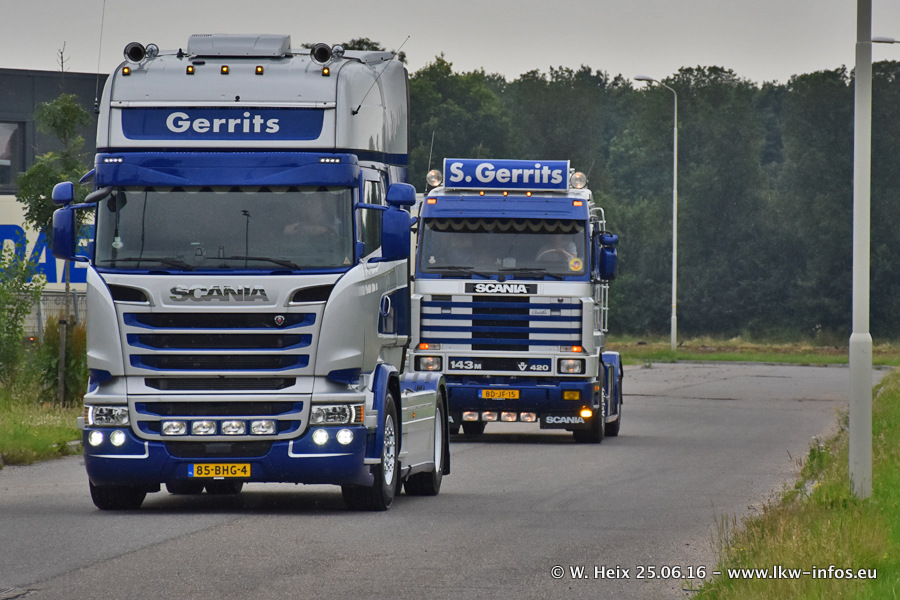 Peter Gerrits hatte mich zum Fotoshooting eingeladen, denn an diesem Samstag hatte er organisiert, dass alle neun LKW zuhause in Wijchen sind. Das Fotoshooting fand auf dem Gelände von Scania Benelux, Wijchen statt. Der Scania 143 V8 Streamline ist inzwischen fest in Zürüch (CH) und einige der V8-Scania sind regelmässig in Norwegen unterwegs und selteh zuhause. Anfang Juni kam übrigens der neute LKW in den Fuhrpark, ein Scania R 450 Streamline Euro 6. Neu ist auch ein Siloauflieger, den Gerrits vor einigen Wochen schon bekommen hat. Das Chassis ist blau lackiert, passend zu den Zugmaschinen. Außerdem hat der neue Auflieger Alufelgen, passend zur Scania-Zugmaschine. Insgesamt eine tolle Kombination. Leider hat das Wetter nicht mitgespielt, denn pünktlich zum eigentlichen Fotoshooting begann es zu regnen und der Regen wurde immer stärker. Trotzdem sind viele schöne Bilder entstanden! Der neue Scania ist übrigens auch schon auf den ersten Bildern in der Galerie zu sehen, zuhause vor dem kleinen Firmenhof in Wijchen.