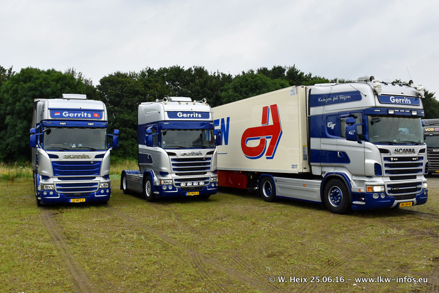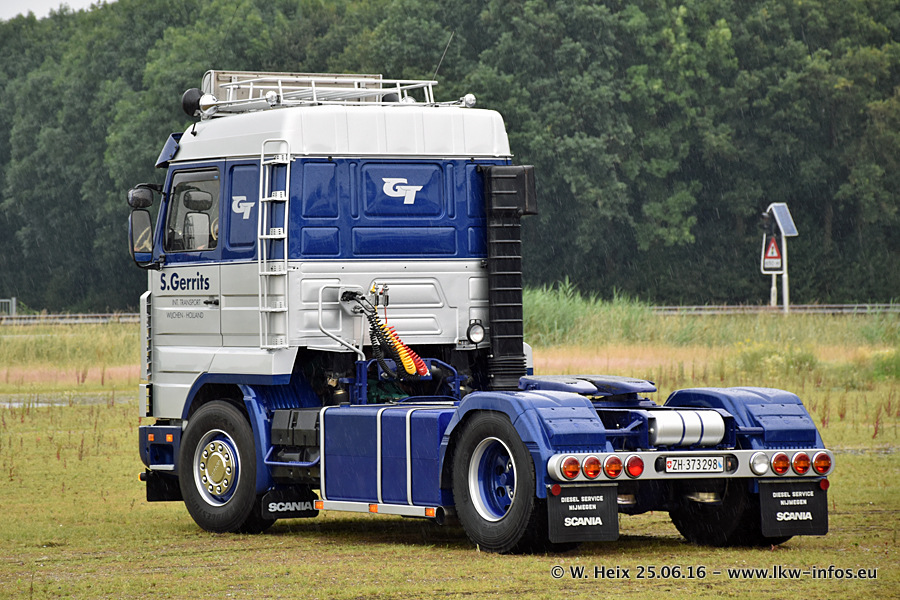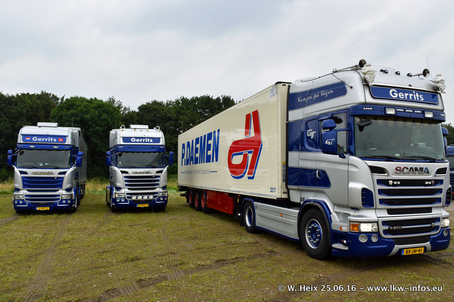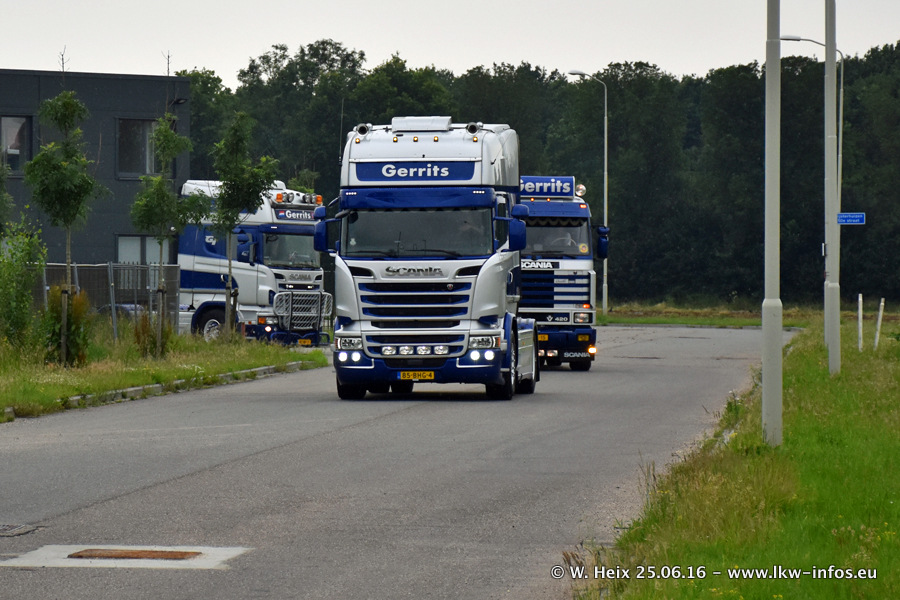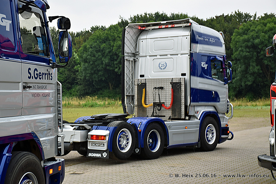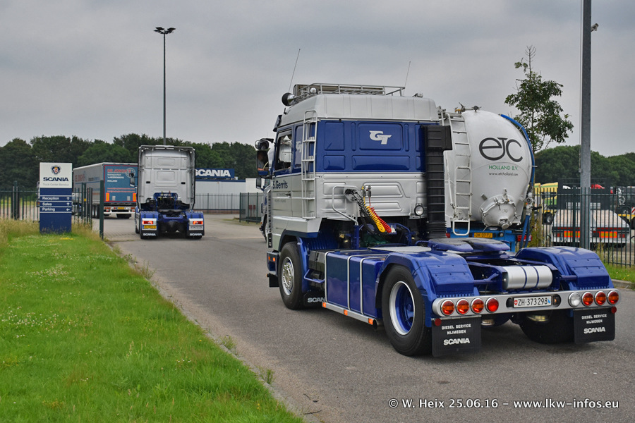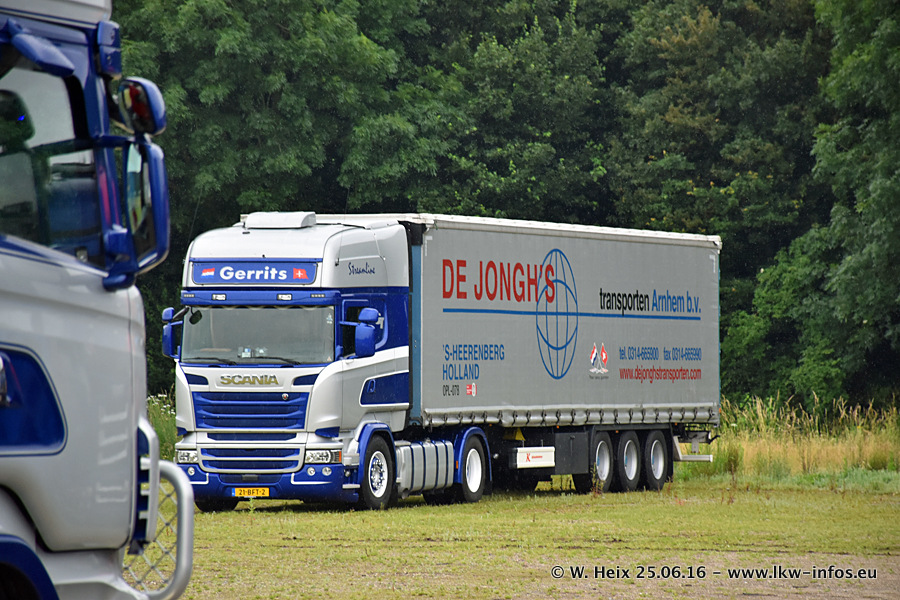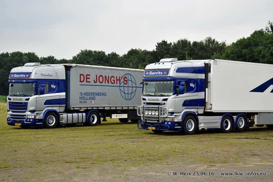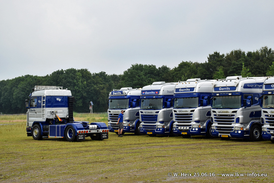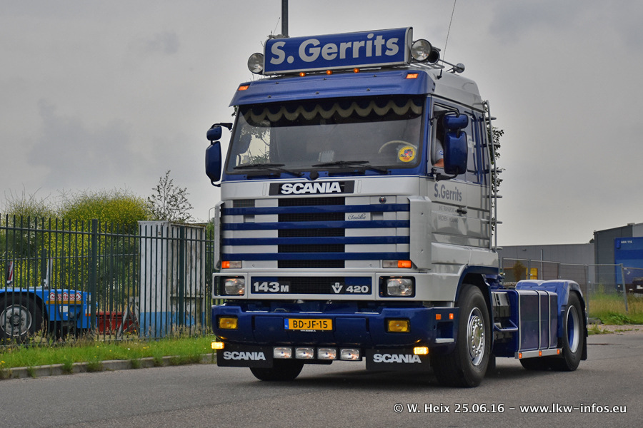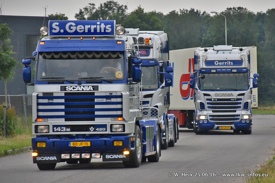 Peter Gerrits hatte mich zum Fotoshooting eingeladen, denn an diesem Samstag hatte er organisiert, dass alle neun LKW zuhause in Wijchen sind. Das Fotoshooting fand auf dem Gelände von Scania Benelux, Wijchen statt. Der Scania 143 V8 Streamline ist inzwischen fest in Zürüch (CH) und einige der V8-Scania sind regelmässig in Norwegen unterwegs und selteh zuhause. Anfang Juni kam übrigens der neute LKW in den Fuhrpark, ein Scania R 450 Streamline Euro 6. Neu ist auch ein Siloauflieger, den Gerrits vor einigen Wochen schon bekommen hat. Das Chassis ist blau lackiert, passend zu den Zugmaschinen. Außerdem hat der neue Auflieger Alufelgen, passend zur Scania-Zugmaschine. Insgesamt eine tolle Kombination. Leider hat das Wetter nicht mitgespielt, denn pünktlich zum eigentlichen Fotoshooting begann es zu regnen und der Regen wurde immer stärker. Trotzdem sind viele schöne Bilder entstanden! Der neue Scania ist übrigens auch schon auf den ersten Bildern in der Galerie zu sehen, zuhause vor dem kleinen Firmenhof in Wijchen.
