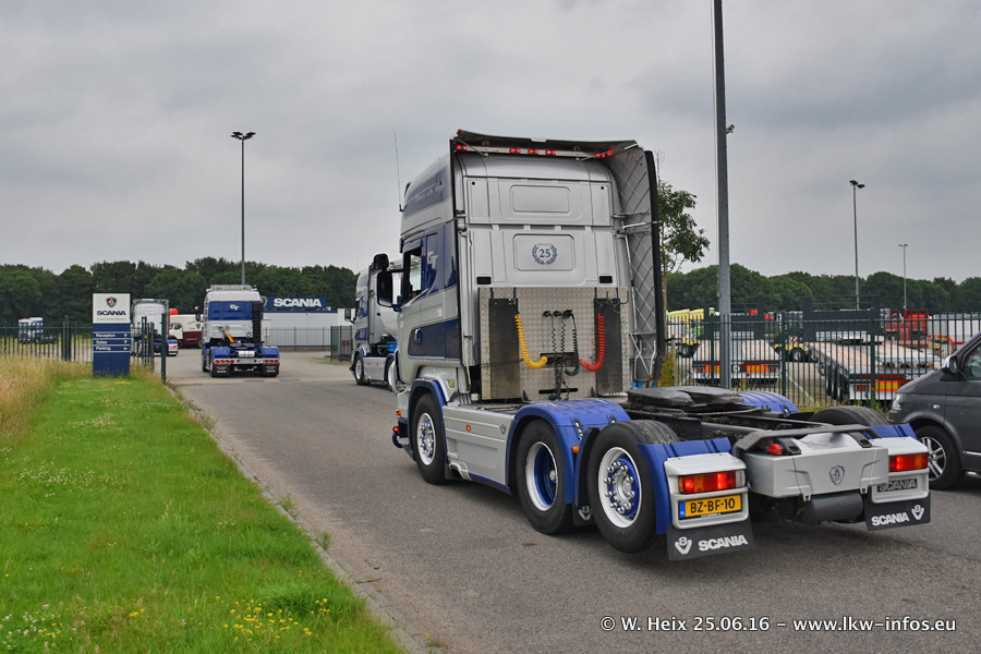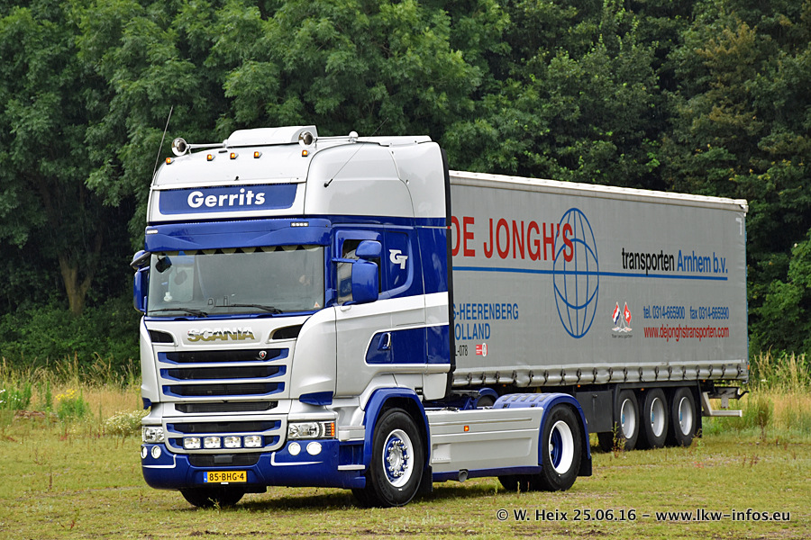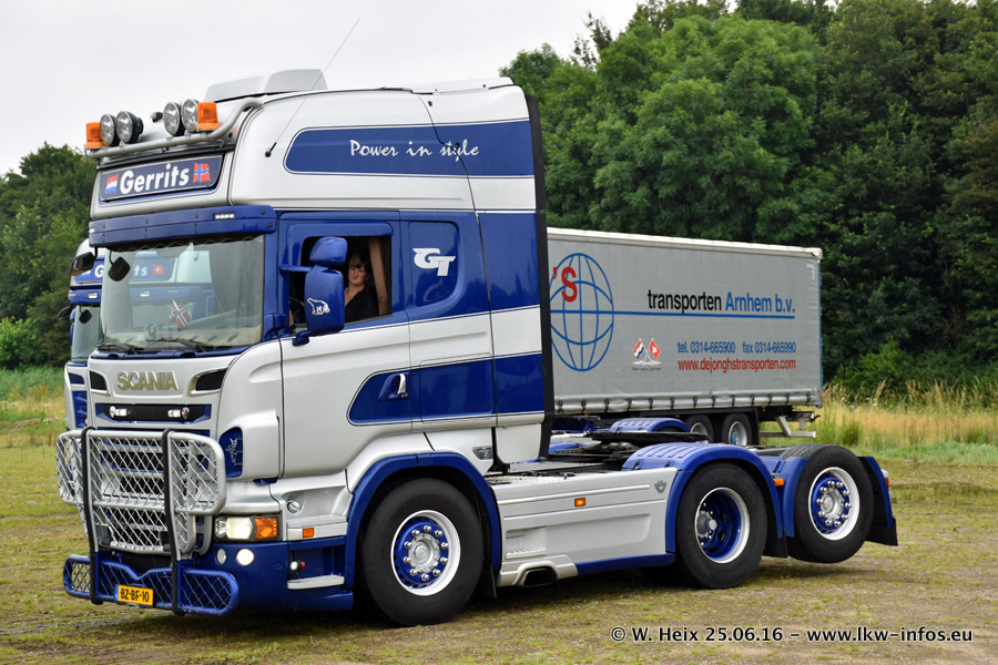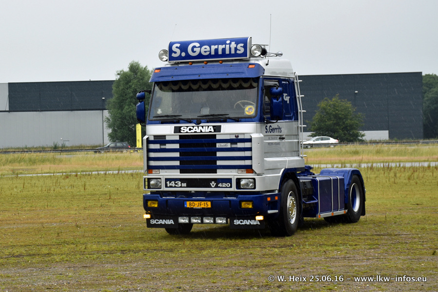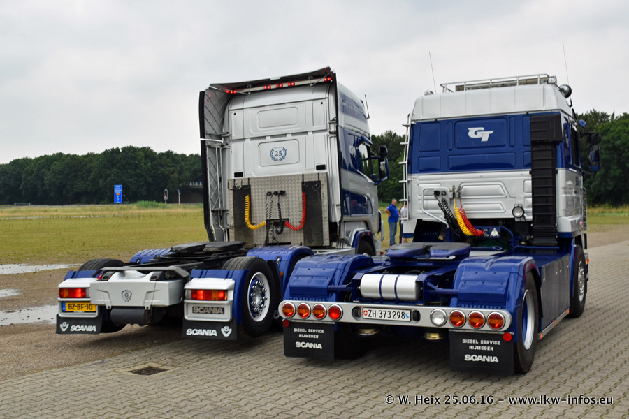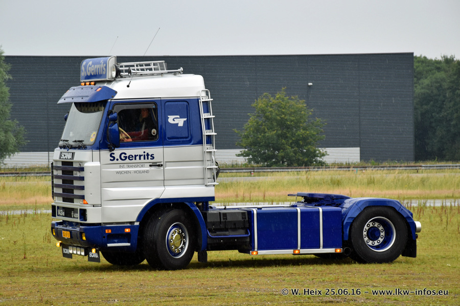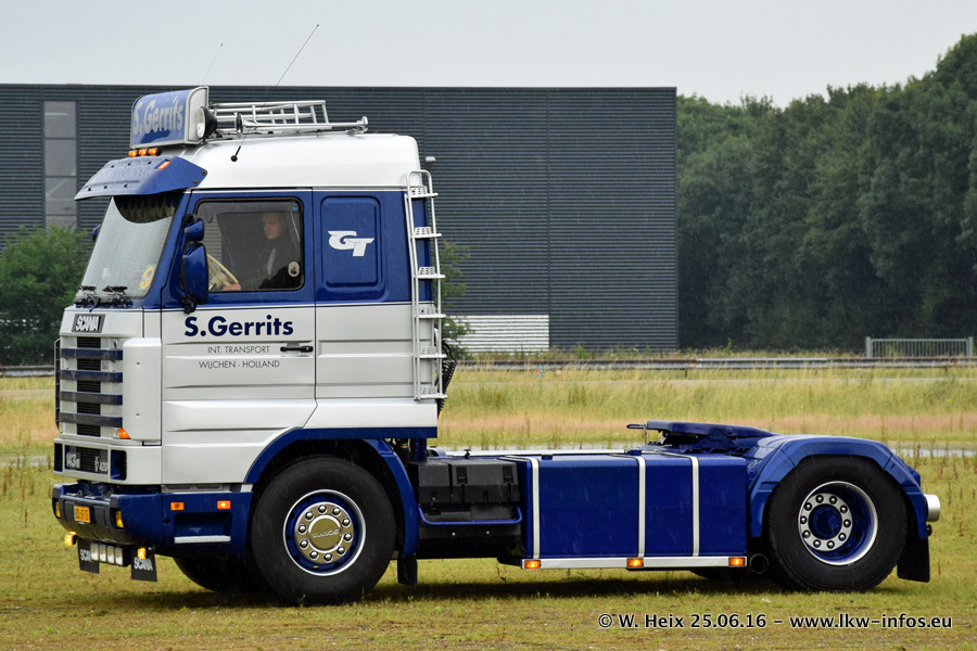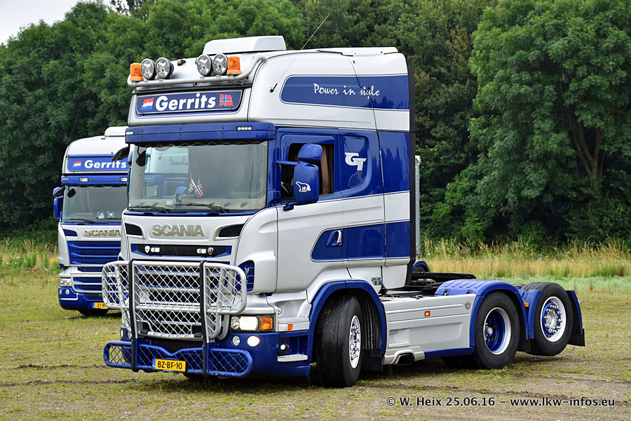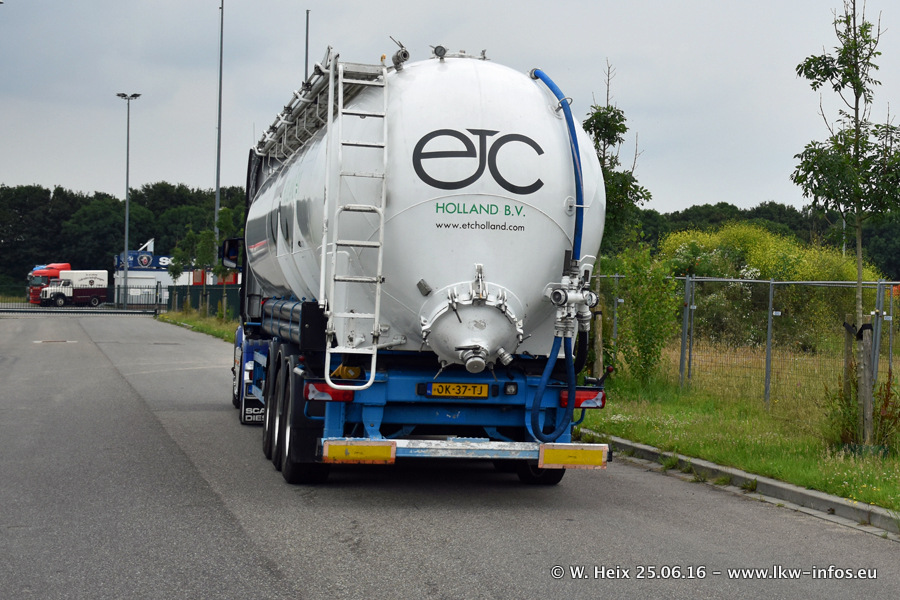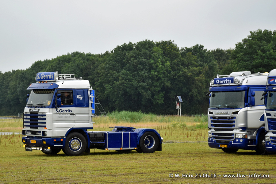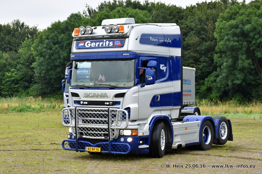 Peter Gerrits hatte mich zum Fotoshooting eingeladen, denn an diesem Samstag hatte er organisiert, dass alle neun LKW zuhause in Wijchen sind. Das Fotoshooting fand auf dem Gelände von Scania Benelux, Wijchen statt. Der Scania 143 V8 Streamline ist inzwischen fest in Zürüch (CH) und einige der V8-Scania sind regelmässig in Norwegen unterwegs und selteh zuhause. Anfang Juni kam übrigens der neute LKW in den Fuhrpark, ein Scania R 450 Streamline Euro 6. Neu ist auch ein Siloauflieger, den Gerrits vor einigen Wochen schon bekommen hat. Das Chassis ist blau lackiert, passend zu den Zugmaschinen. Außerdem hat der neue Auflieger Alufelgen, passend zur Scania-Zugmaschine. Insgesamt eine tolle Kombination. Leider hat das Wetter nicht mitgespielt, denn pünktlich zum eigentlichen Fotoshooting begann es zu regnen und der Regen wurde immer stärker. Trotzdem sind viele schöne Bilder entstanden! Der neue Scania ist übrigens auch schon auf den ersten Bildern in der Galerie zu sehen, zuhause vor dem kleinen Firmenhof in Wijchen.