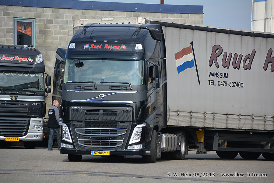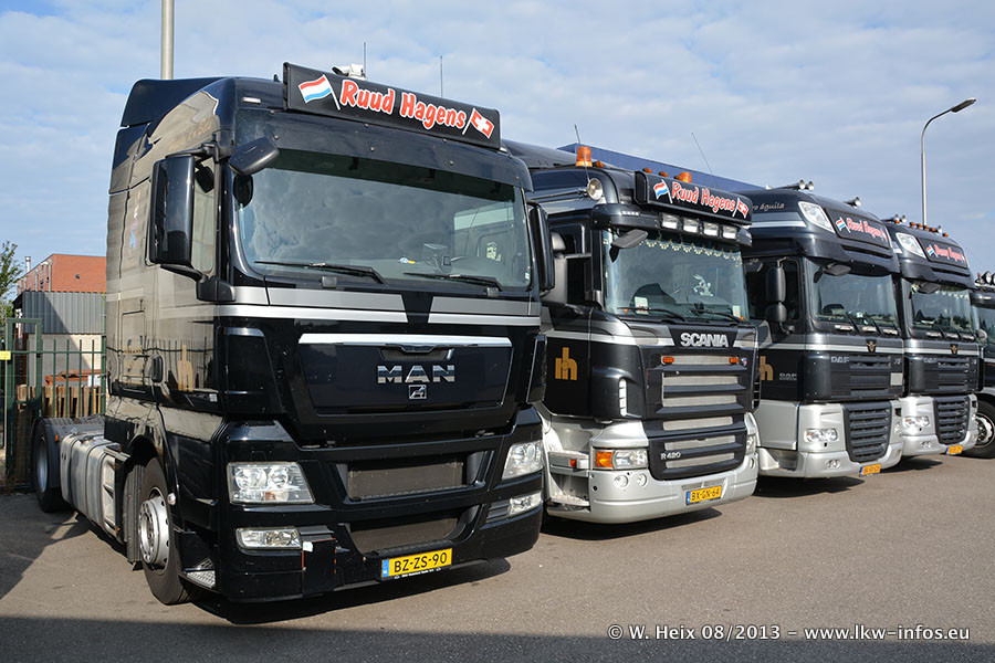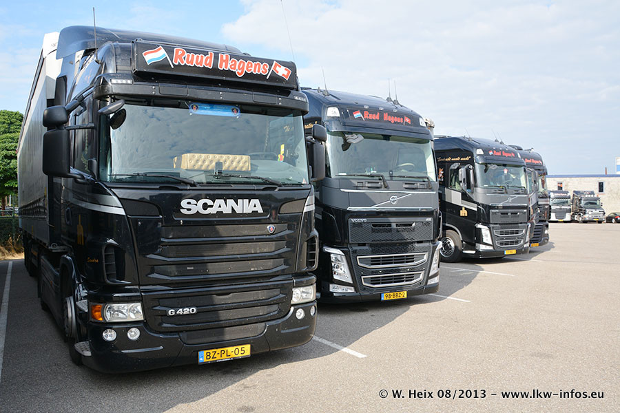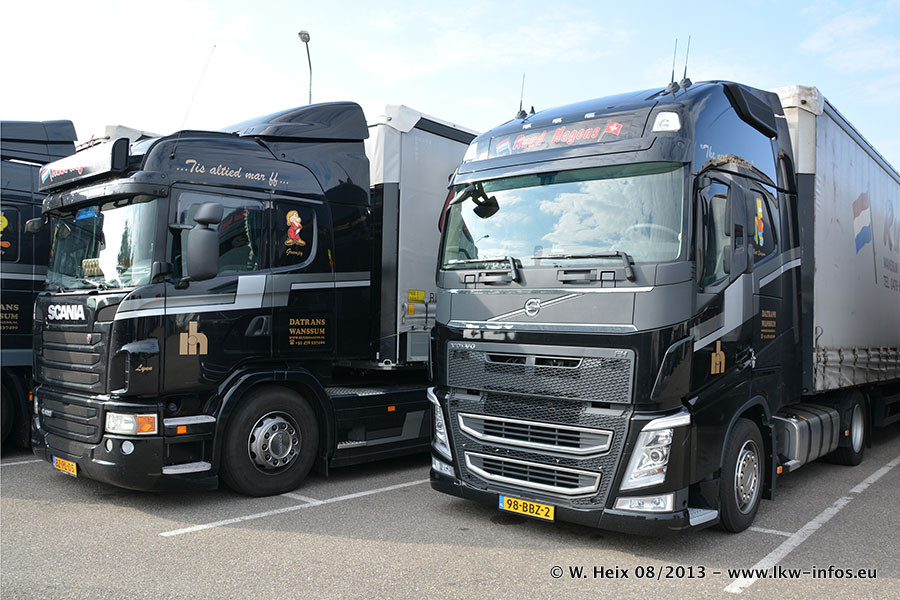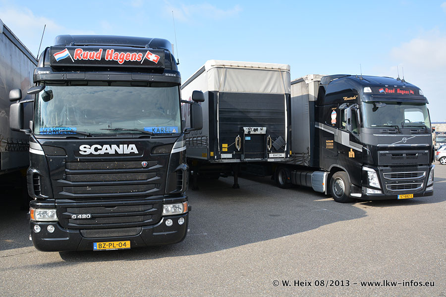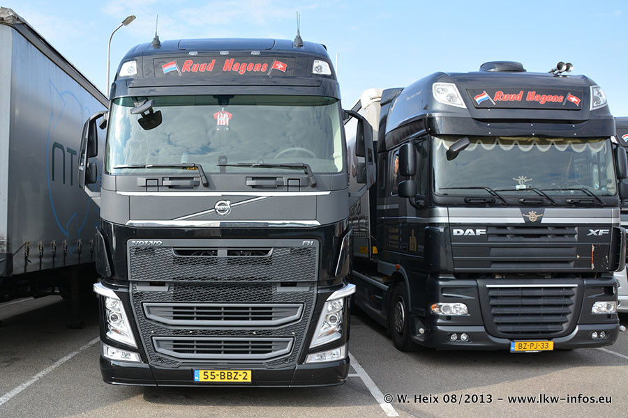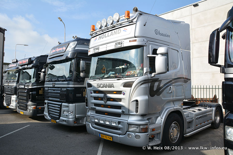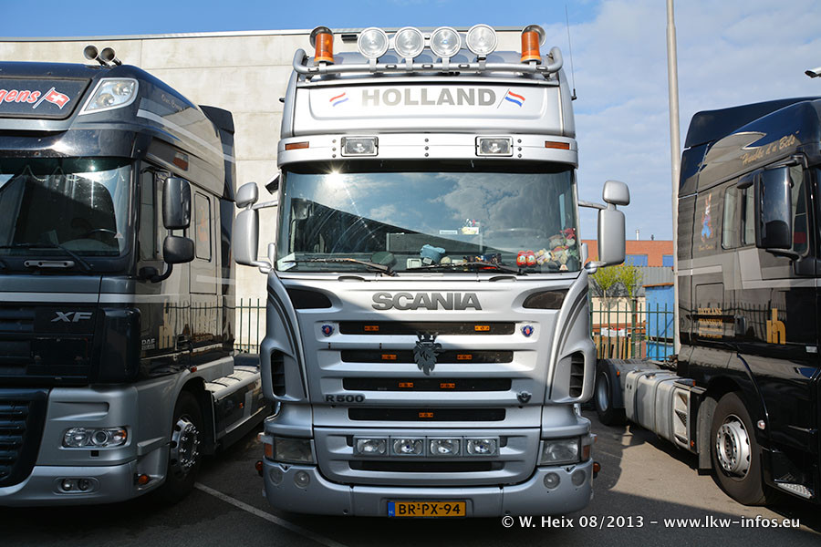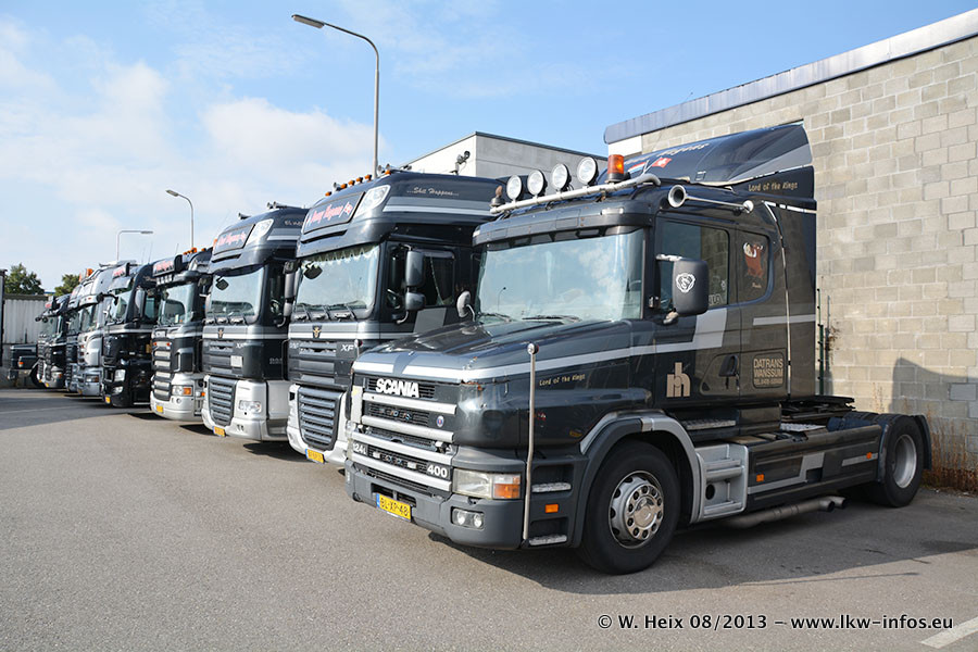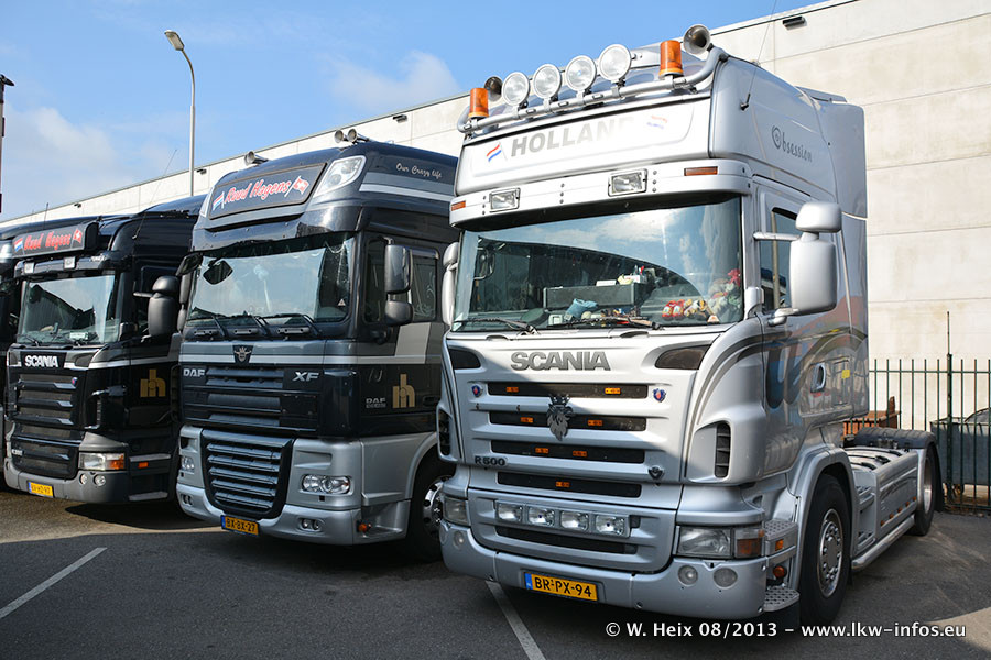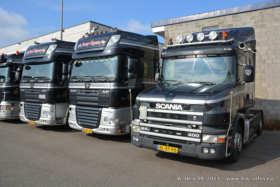 Die vier neuen Volvo New FH (FH 4) sind erst seit wenigen Tagen im Fuhrpark. Neu sind auch drei MAN New TGX (leider war nur einer da) sowie einzelne Scania New G und DAF XF 105. In den nächsten Wochen werden weitere Zugmaschinen durch neue ersetzt. Bilder folgen demnächst ..... Der schwarze Scania New R 500 V8 mit den blauen Streifen gehört inzwischen auch zu Fuhrpark. Der LKW wurde vor einiger Wochen von der Firma W. Gerrits aus Wellerlooi übernommen (siehe Modell 1:50 von Tekno - noch mit der alten Beschrifrung). Die Galerie enthält auch Bilder von Subunternehmer-Fahrzeugen.