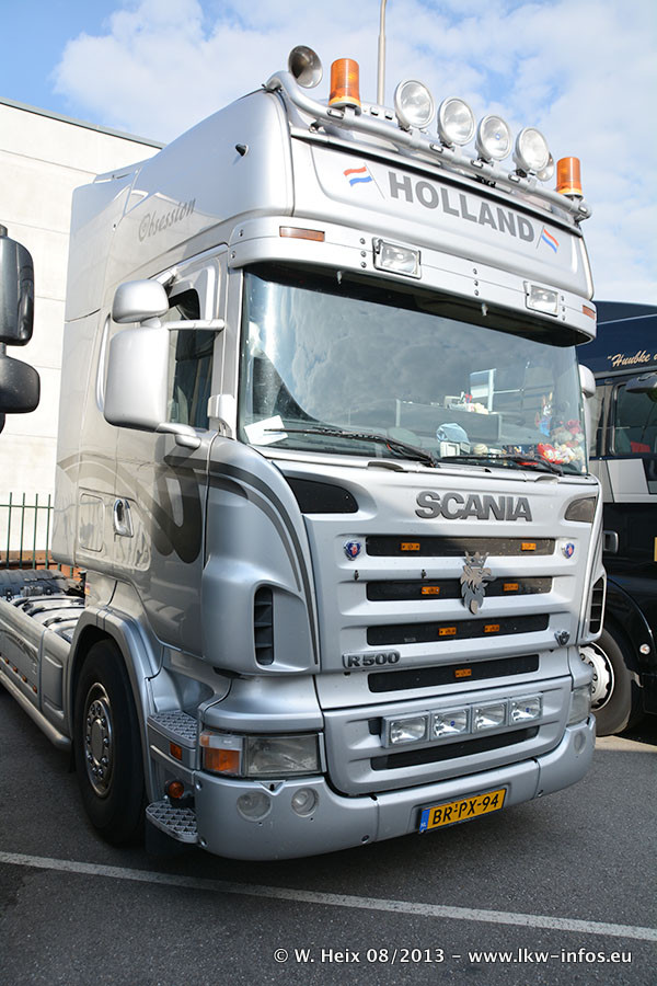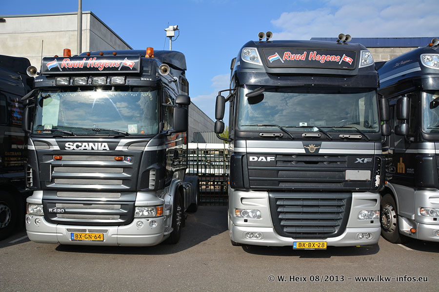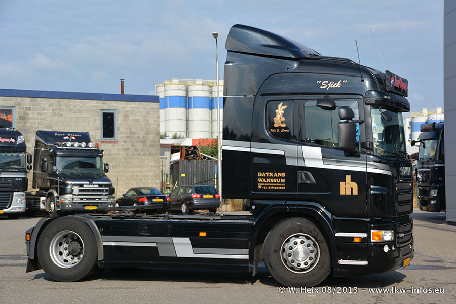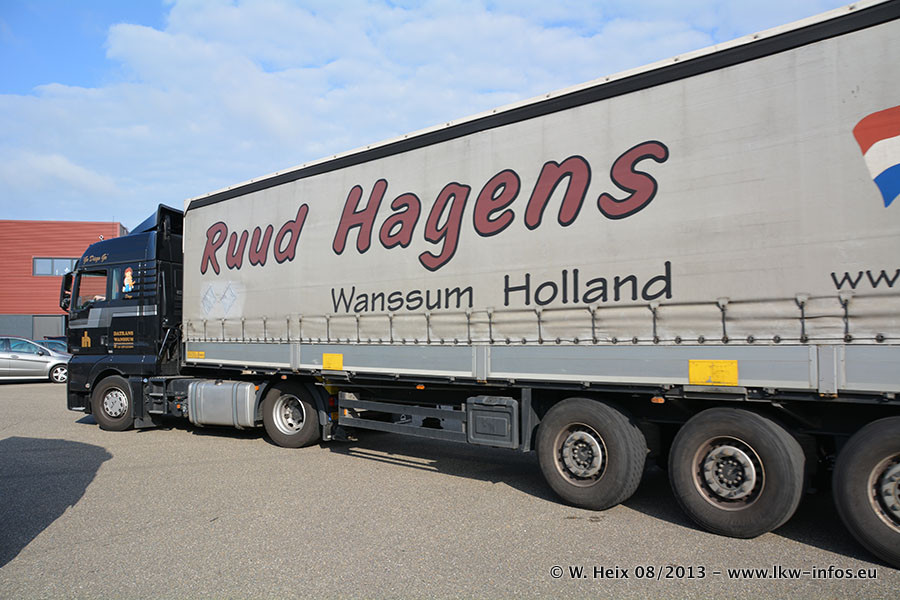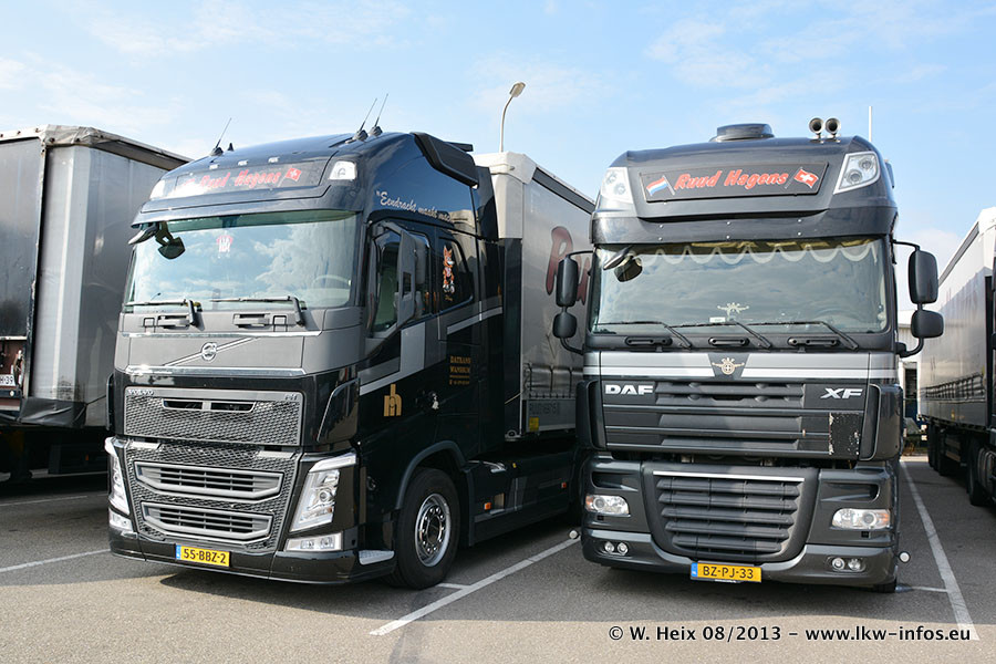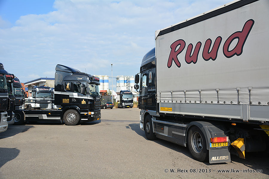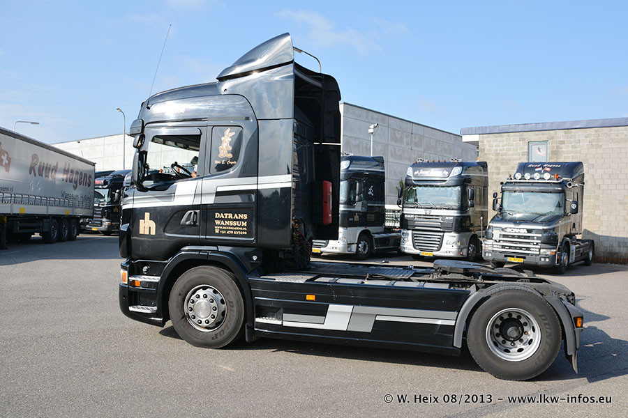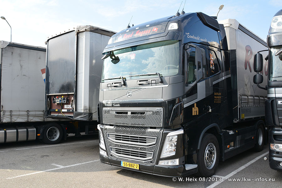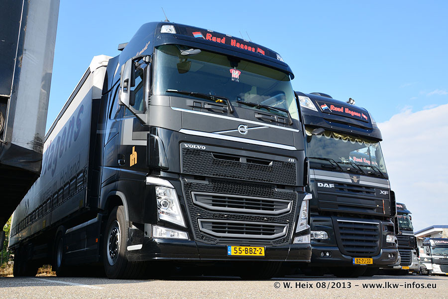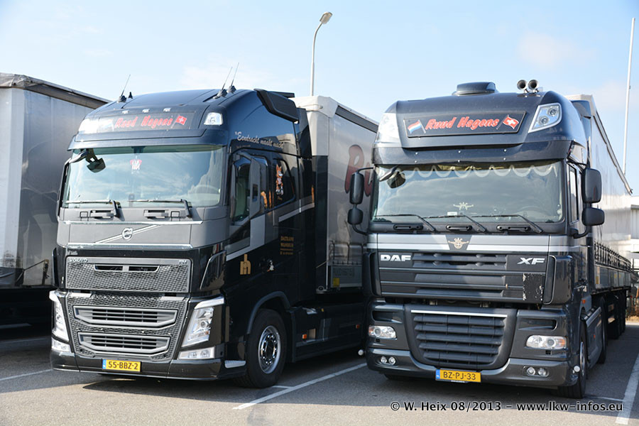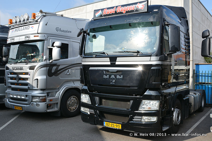Die vier neuen Volvo New FH (FH 4) sind erst seit wenigen Tagen im Fuhrpark. Neu sind auch drei MAN New TGX (leider war nur einer da) sowie einzelne Scania New G und DAF XF 105. In den nächsten Wochen werden weitere Zugmaschinen durch neue ersetzt. Bilder folgen demnächst ..... Der schwarze Scania New R 500 V8 mit den blauen Streifen gehört inzwischen auch zu Fuhrpark. Der LKW wurde vor einiger Wochen von der Firma W. Gerrits aus Wellerlooi übernommen (siehe Modell 1:50 von Tekno - noch mit der alten Beschrifrung). Die Galerie enthält auch Bilder von Subunternehmer-Fahrzeugen.