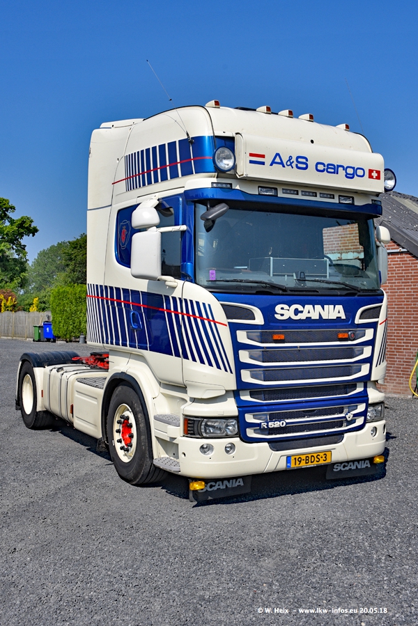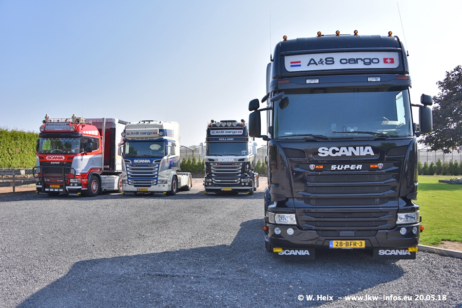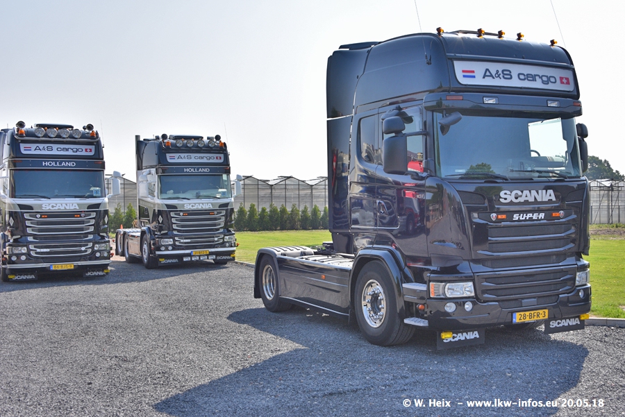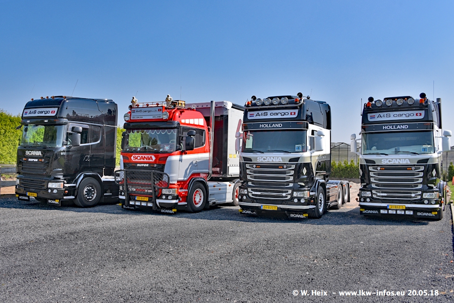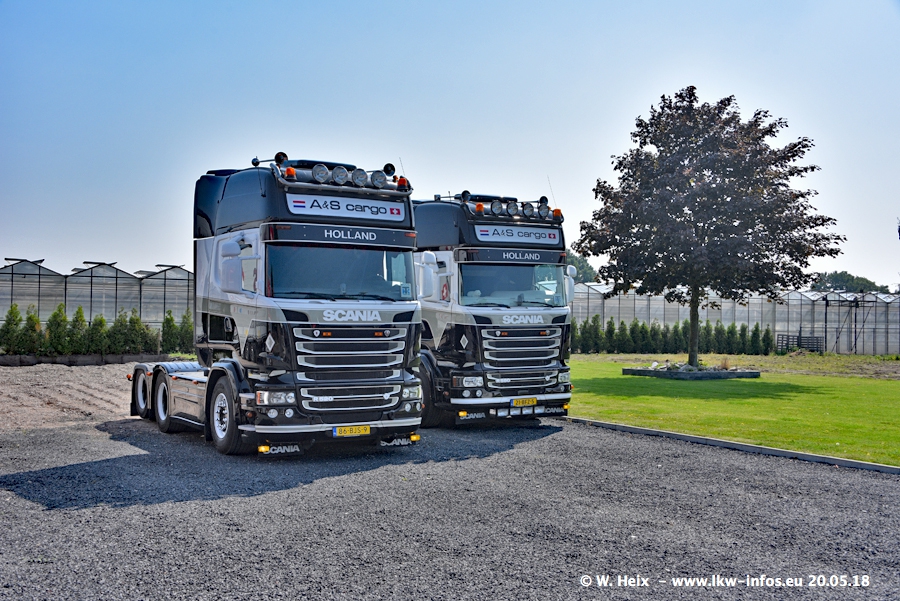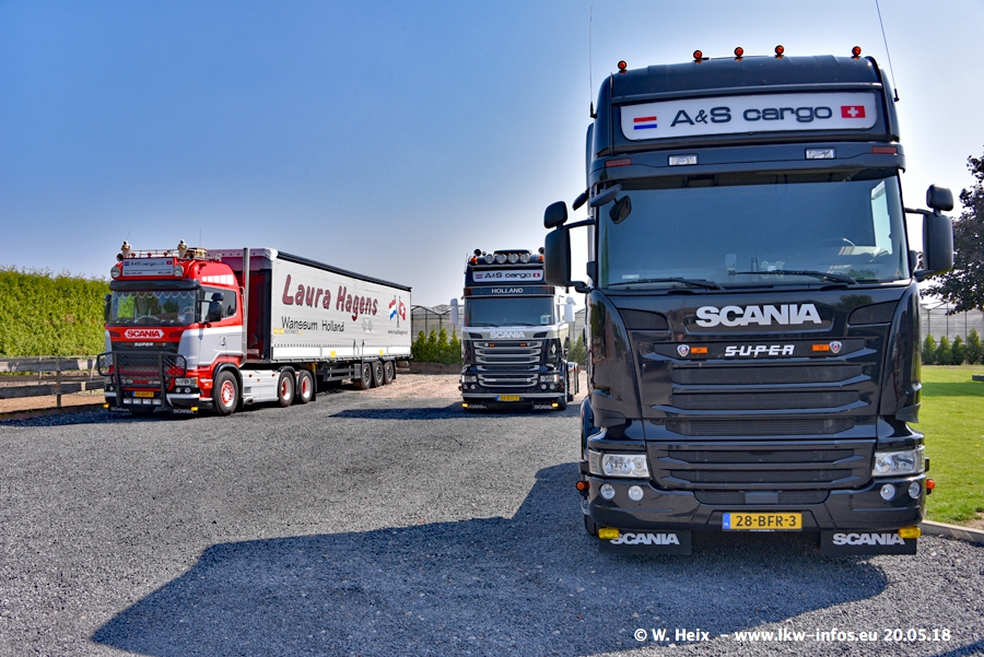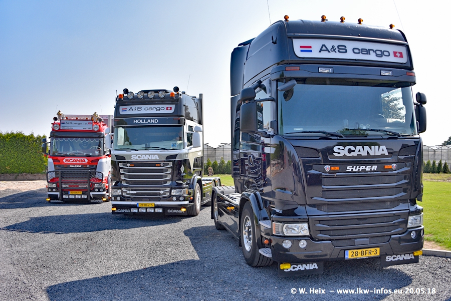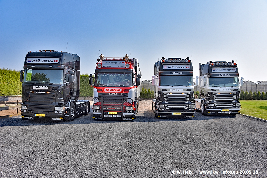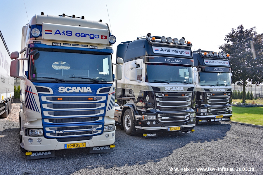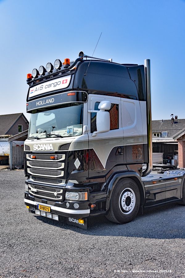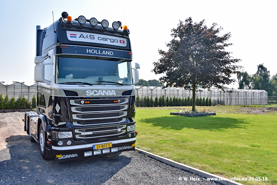 Wir haben ein kleines Fotoshooting bei A&S Cargo zuhause gemacht, wo die LKW am Wochenende stehen. Das sind aktuell 5 SCANIA: 1 schwarzer R 450 Streamline, ein R 520 V8 Streamline in den Farben von M-Trex, ein R 520 V8 Streamline in rot/grau/schwarz, ein R 520 V8 Streamline in A&S-Cargo-Farben und ein R 580 V8 Streamline in A&S-Cargo Farben. Es gibt mittlerweile keine eigenen Auflieger mehr. A&S Cargo fährt als Charter für die Firmen Kempen Transport und Ruud Hagens/Datrans und nutzt entsprechend deren Auflieger.
