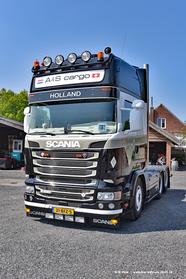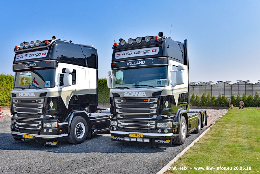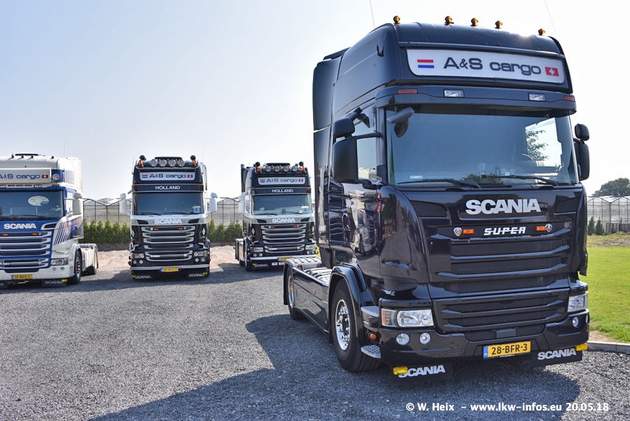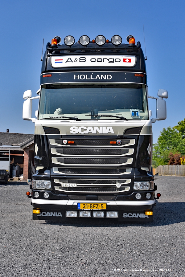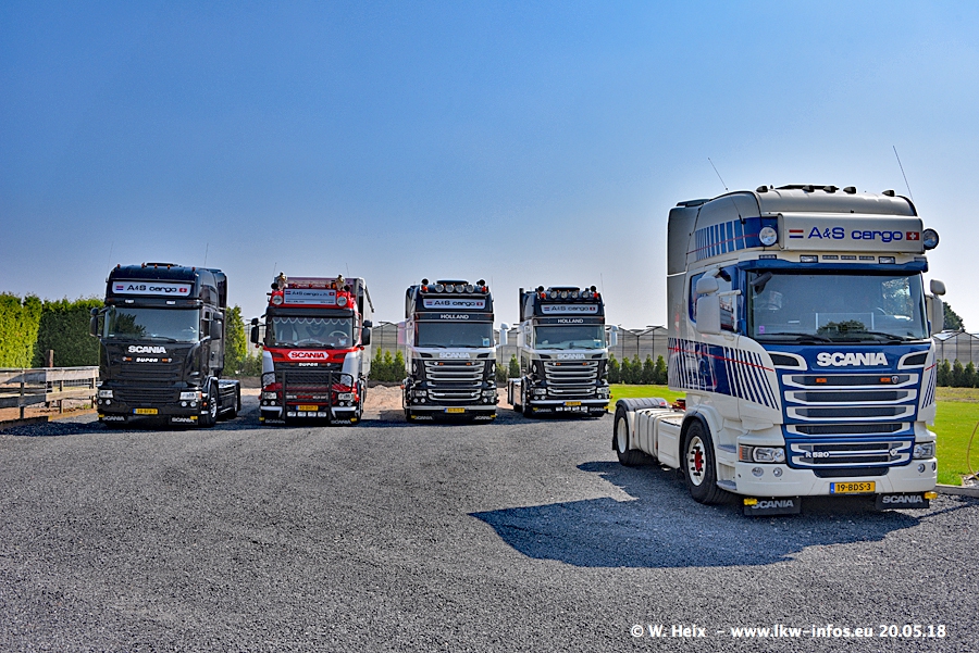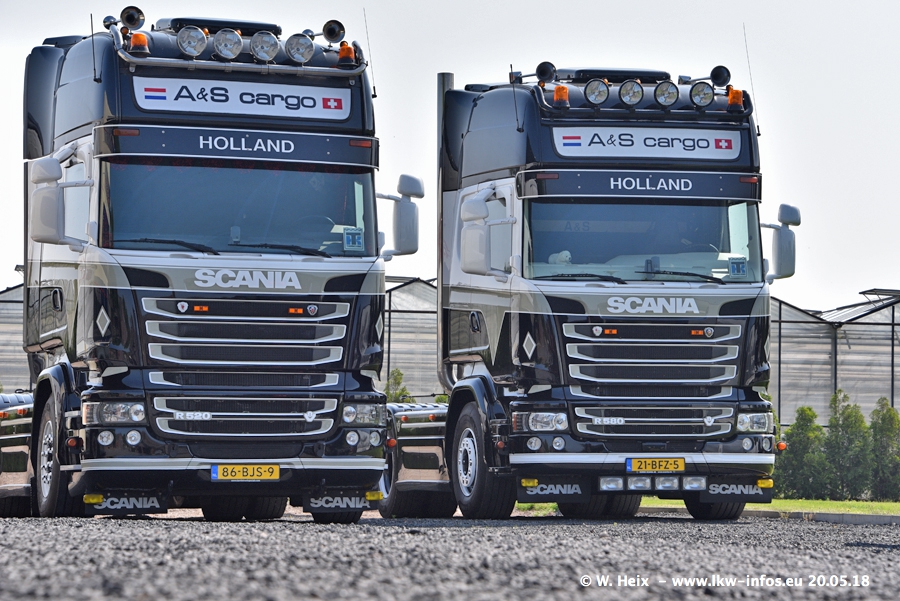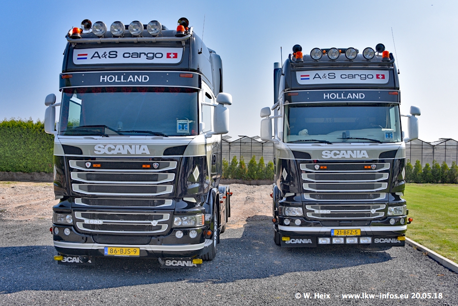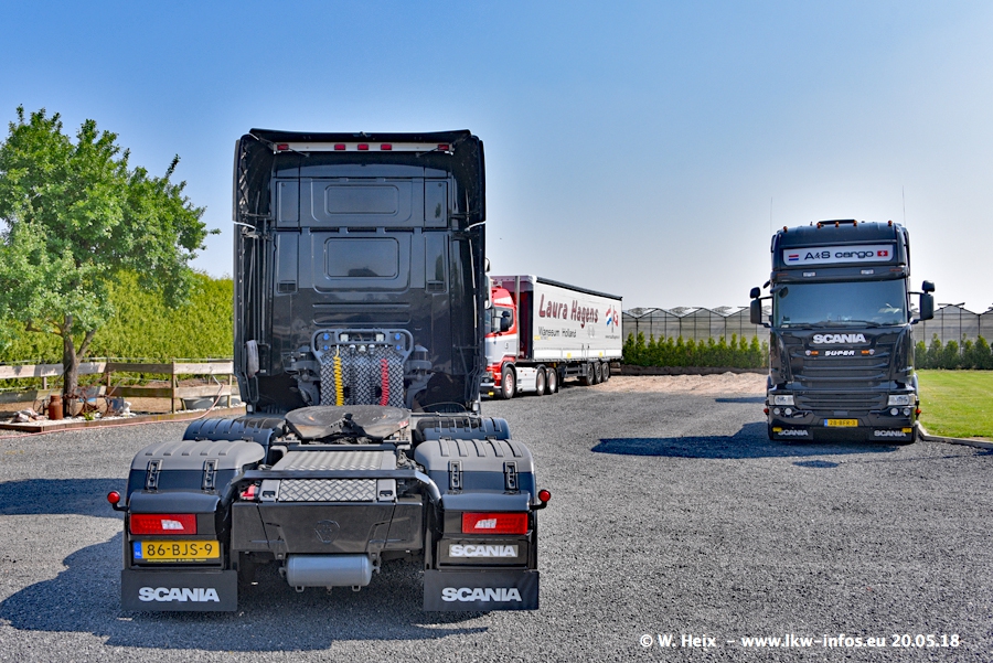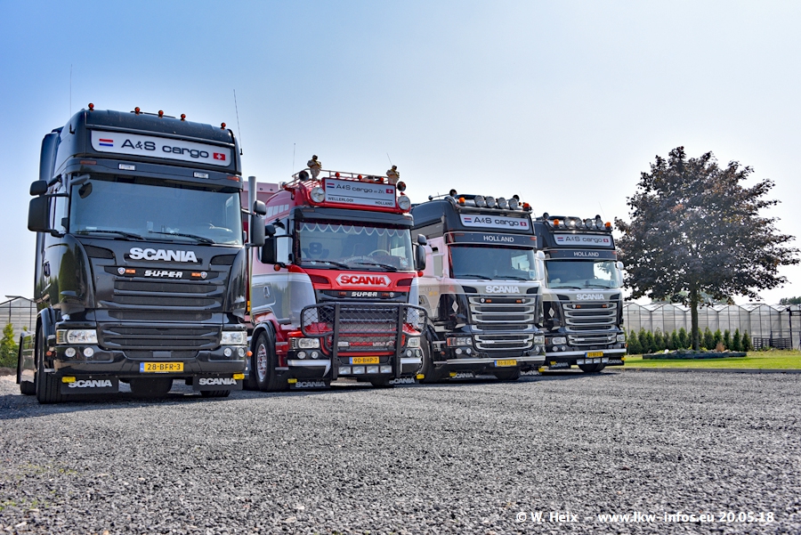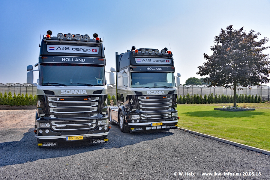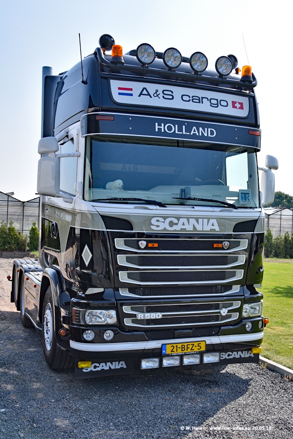 Wir haben ein kleines Fotoshooting bei A&S Cargo zuhause gemacht, wo die LKW am Wochenende stehen. Das sind aktuell 5 SCANIA: 1 schwarzer R 450 Streamline, ein R 520 V8 Streamline in den Farben von M-Trex, ein R 520 V8 Streamline in rot/grau/schwarz, ein R 520 V8 Streamline in A&S-Cargo-Farben und ein R 580 V8 Streamline in A&S-Cargo Farben. Es gibt mittlerweile keine eigenen Auflieger mehr. A&S Cargo fährt als Charter für die Firmen Kempen Transport und Ruud Hagens/Datrans und nutzt entsprechend deren Auflieger.