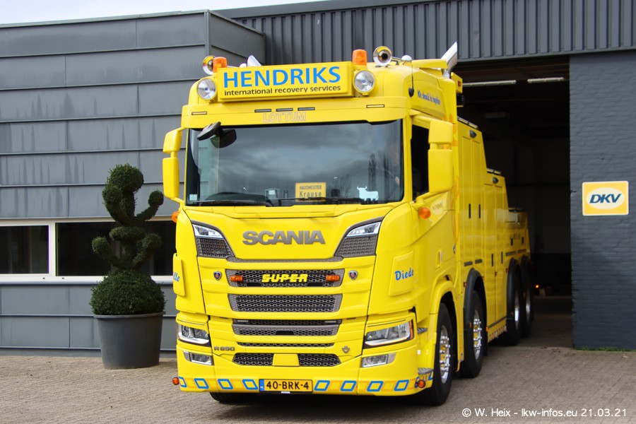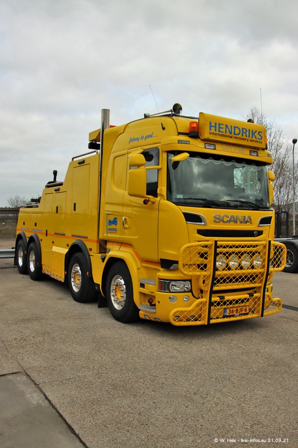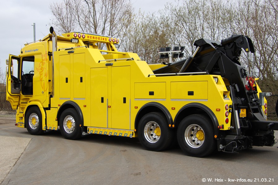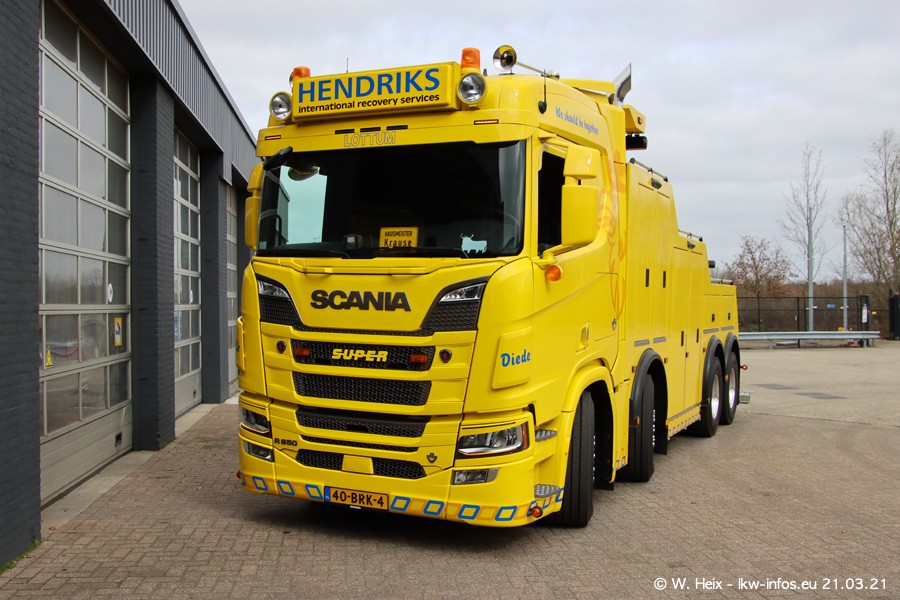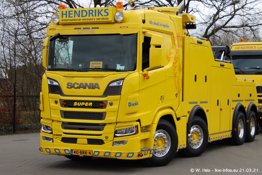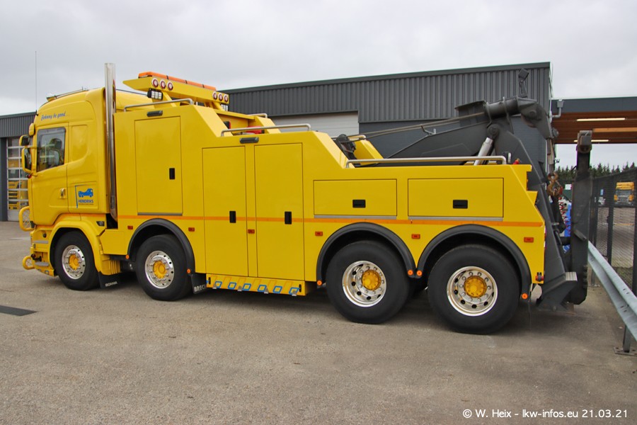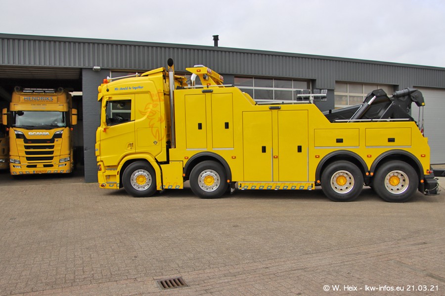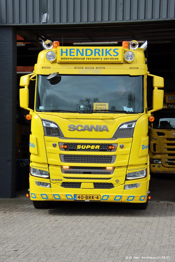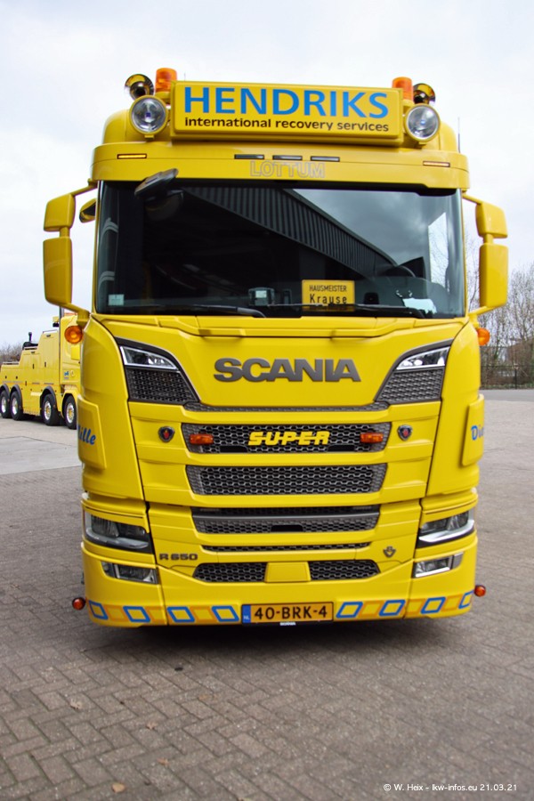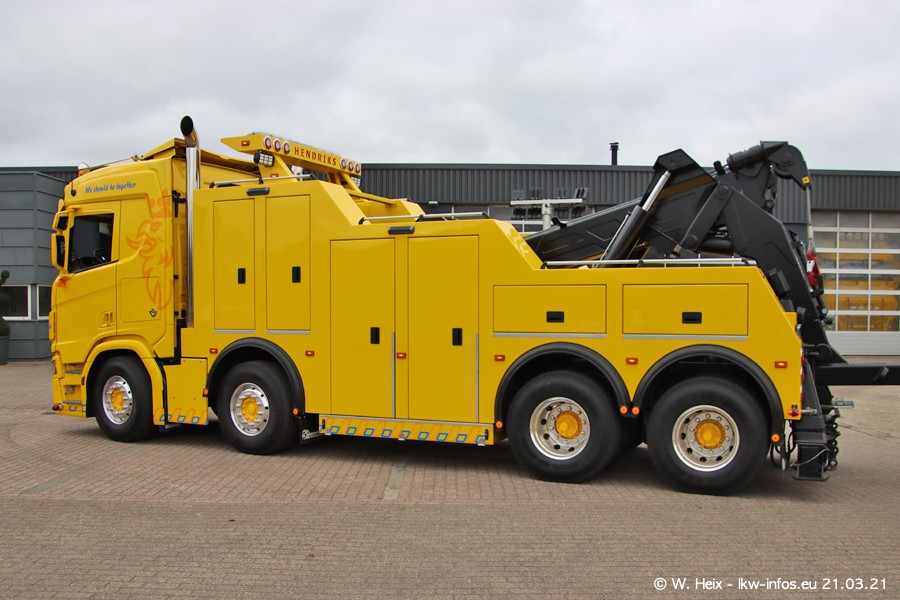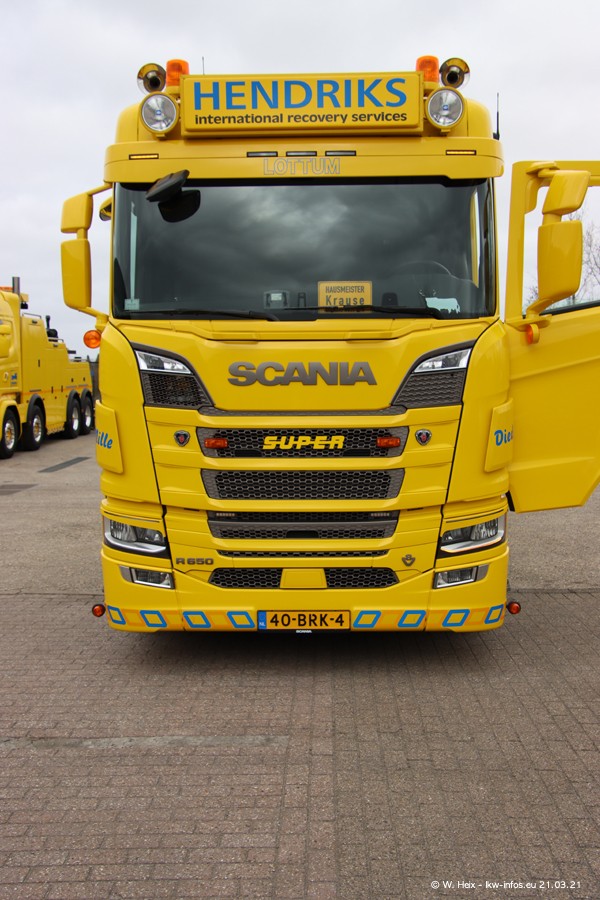 Am heutigen Sonntag war ich kurz bei Hendriks in Lottum. Am Donnerstag hat die Firma einen weiteren neuen Bergetruck bekommen, der heute morgen vom Fahrer getestet wurde und für Fotos bereit stand. Diesmal ist es ein SCANIA R 650 V8 NextGen, der von der Firma Brechtel in Deutschland aufgebaut wurde. Und es waren auch einige weitere LKW zuhause. Das ist an jedem Wochenende anders, da immer gearbeitet und gefahren wird, wie das in dieser Branche eben so ist.