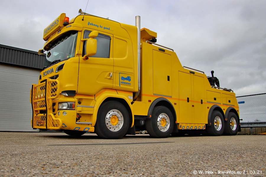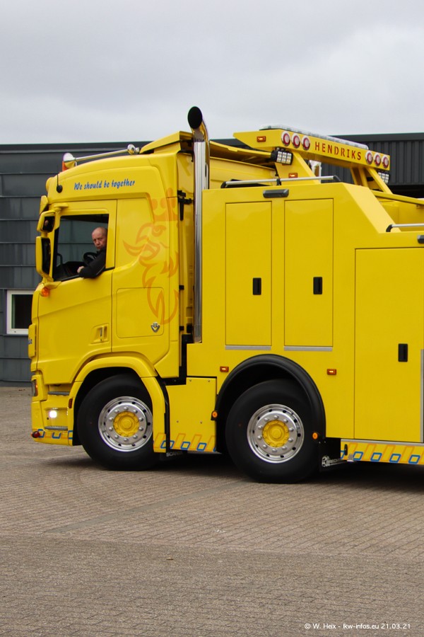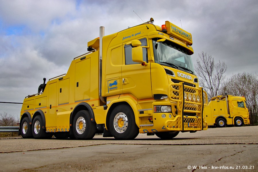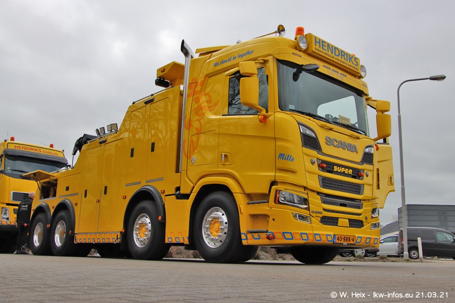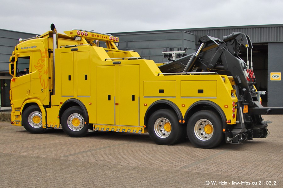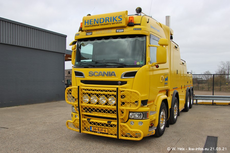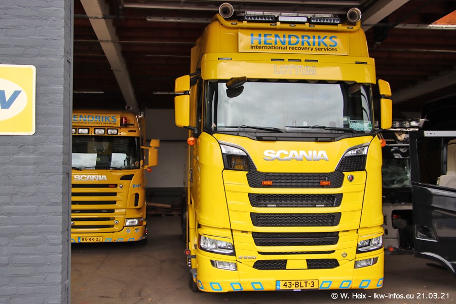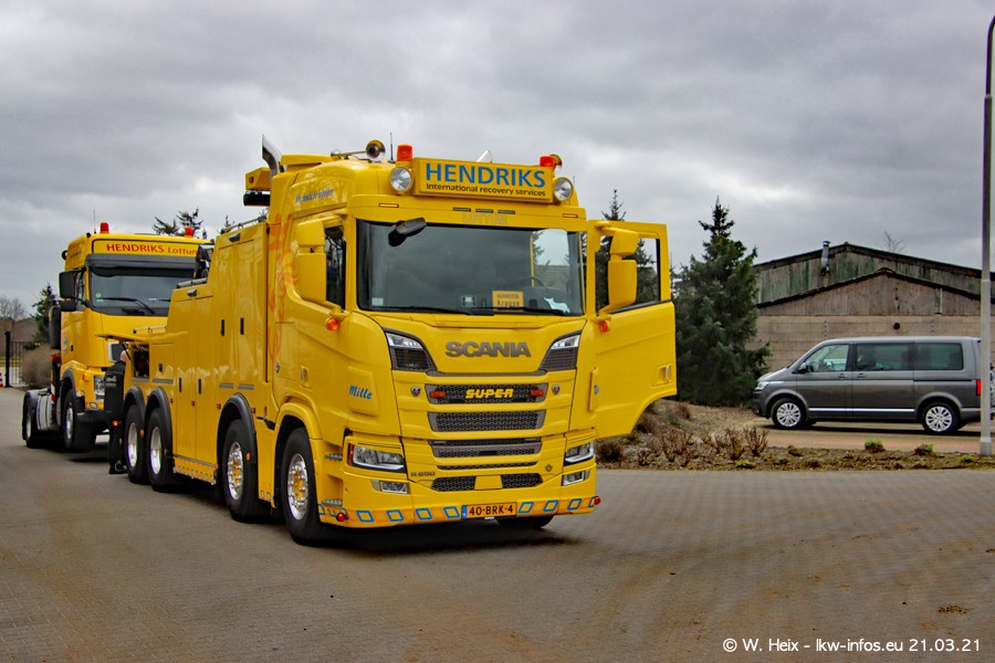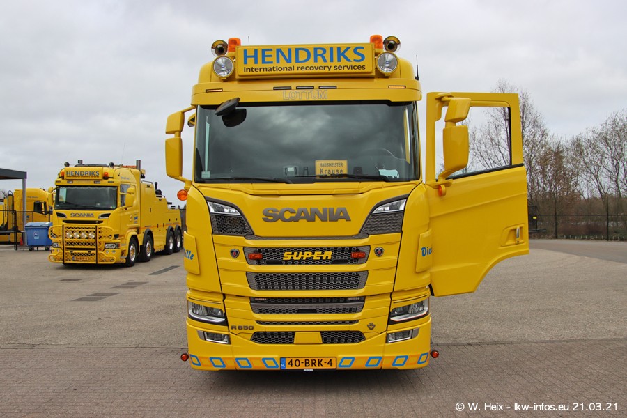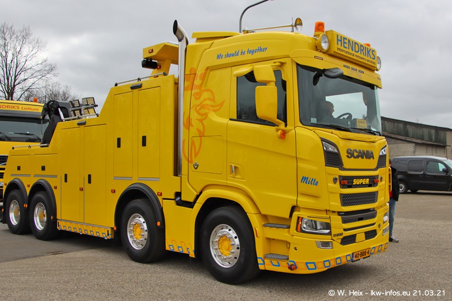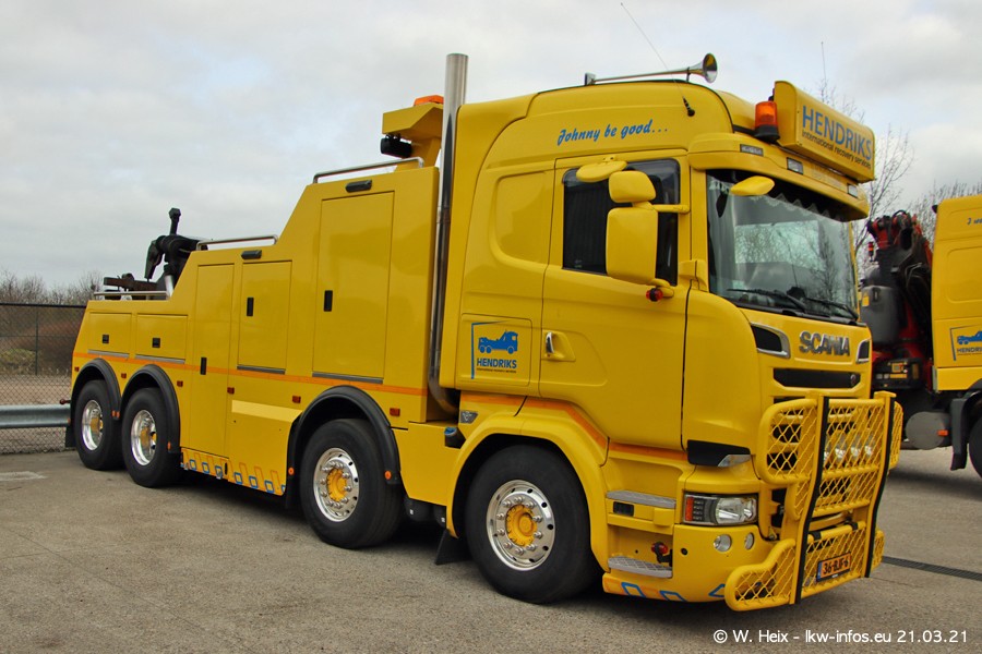 Am heutigen Sonntag war ich kurz bei Hendriks in Lottum. Am Donnerstag hat die Firma einen weiteren neuen Bergetruck bekommen, der heute morgen vom Fahrer getestet wurde und für Fotos bereit stand. Diesmal ist es ein SCANIA R 650 V8 NextGen, der von der Firma Brechtel in Deutschland aufgebaut wurde. Und es waren auch einige weitere LKW zuhause. Das ist an jedem Wochenende anders, da immer gearbeitet und gefahren wird, wie das in dieser Branche eben so ist.