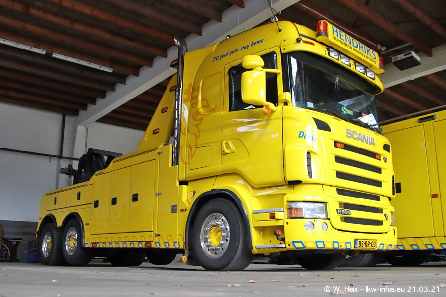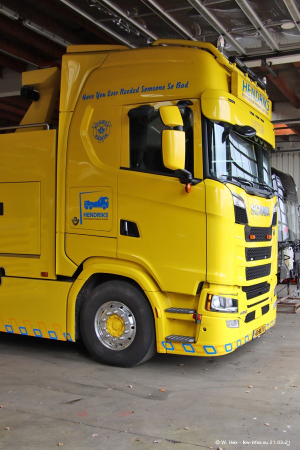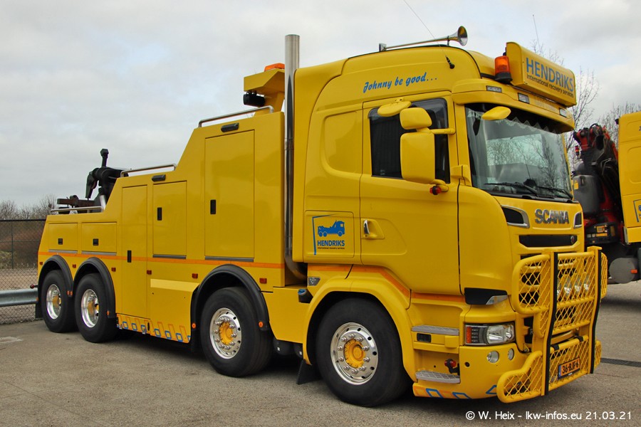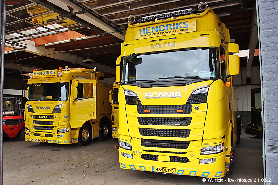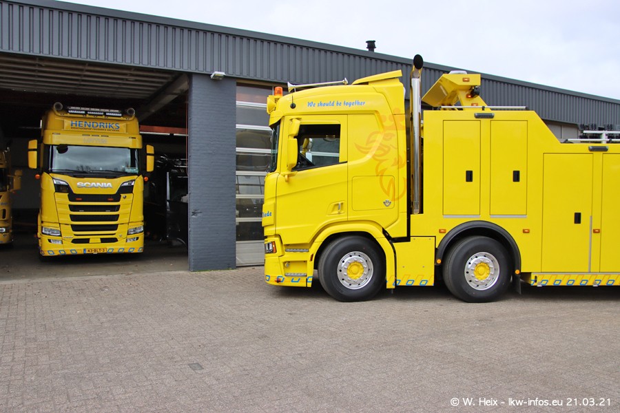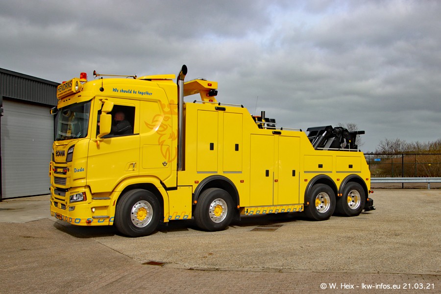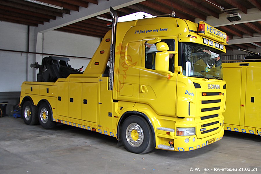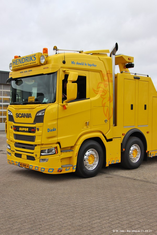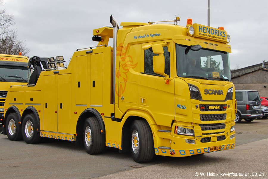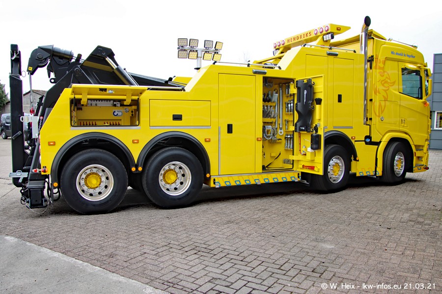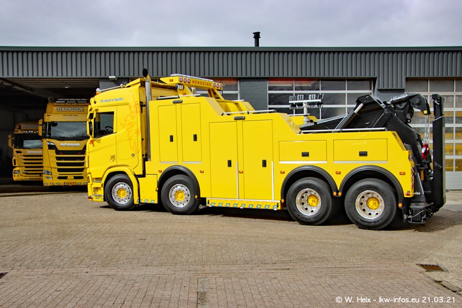 Am heutigen Sonntag war ich kurz bei Hendriks in Lottum. Am Donnerstag hat die Firma einen weiteren neuen Bergetruck bekommen, der heute morgen vom Fahrer getestet wurde und für Fotos bereit stand. Diesmal ist es ein SCANIA R 650 V8 NextGen, der von der Firma Brechtel in Deutschland aufgebaut wurde. Und es waren auch einige weitere LKW zuhause. Das ist an jedem Wochenende anders, da immer gearbeitet und gefahren wird, wie das in dieser Branche eben so ist.