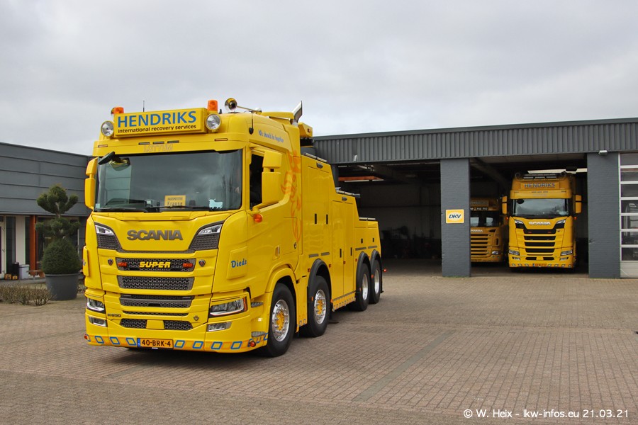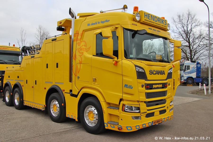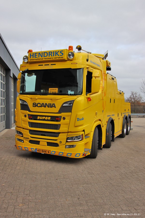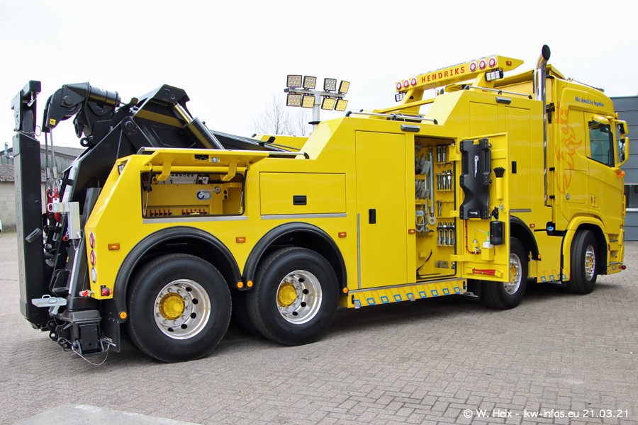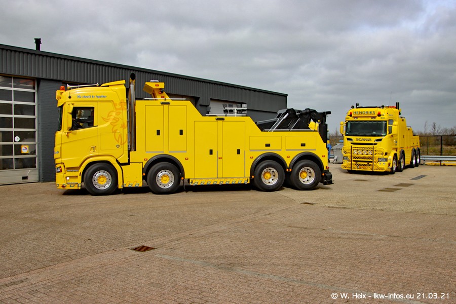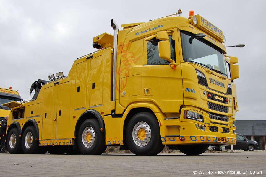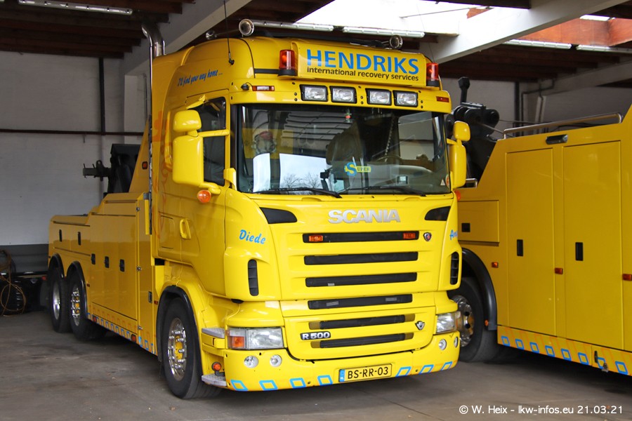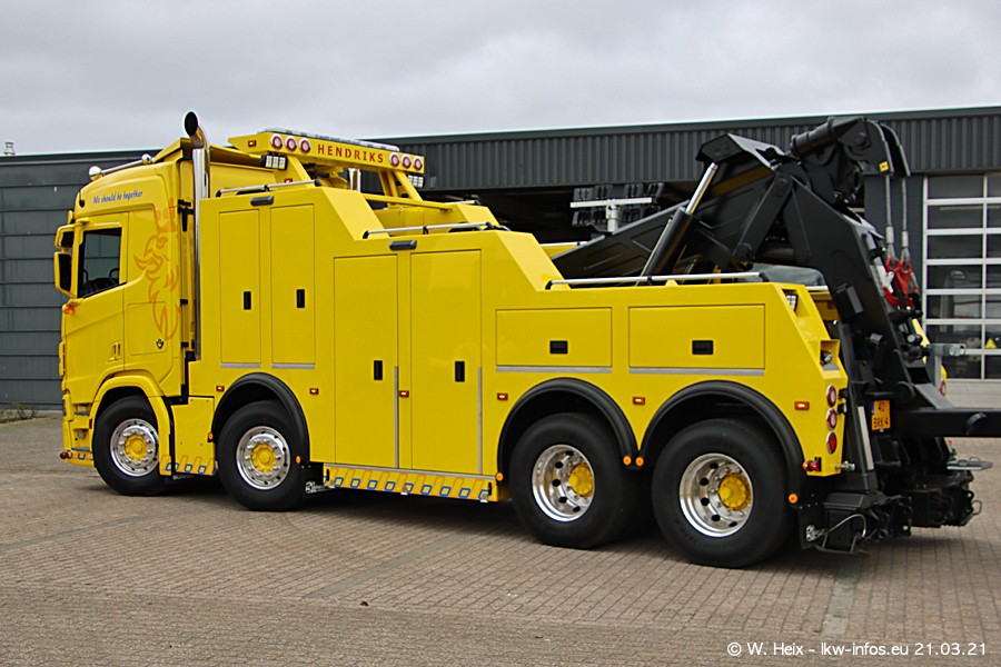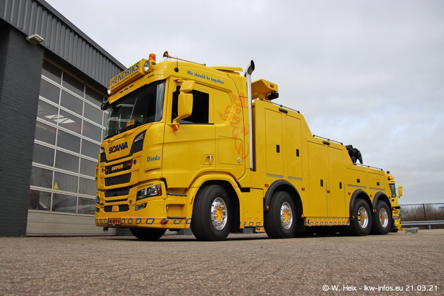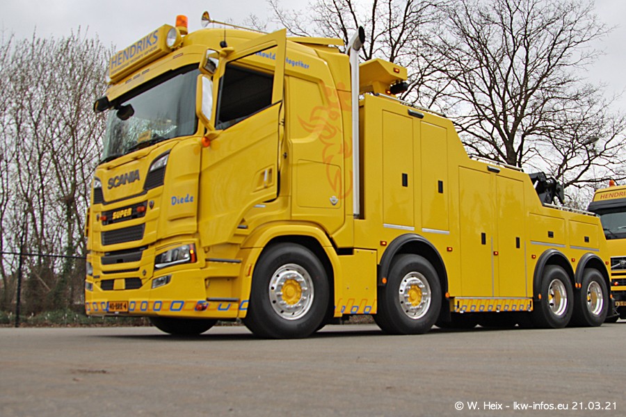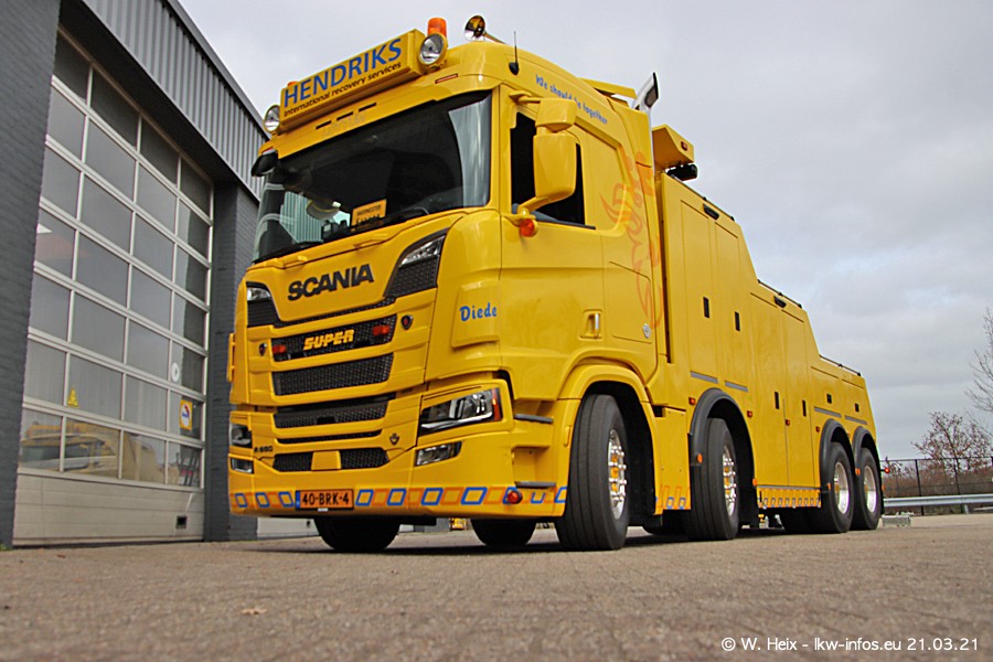 Am heutigen Sonntag war ich kurz bei Hendriks in Lottum. Am Donnerstag hat die Firma einen weiteren neuen Bergetruck bekommen, der heute morgen vom Fahrer getestet wurde und für Fotos bereit stand. Diesmal ist es ein SCANIA R 650 V8 NextGen, der von der Firma Brechtel in Deutschland aufgebaut wurde. Und es waren auch einige weitere LKW zuhause. Das ist an jedem Wochenende anders, da immer gearbeitet und gefahren wird, wie das in dieser Branche eben so ist.