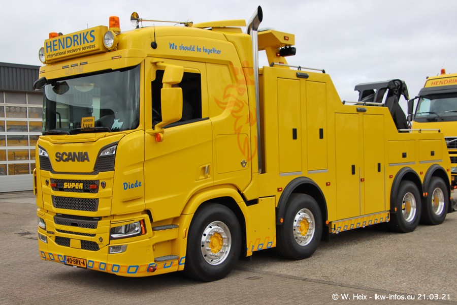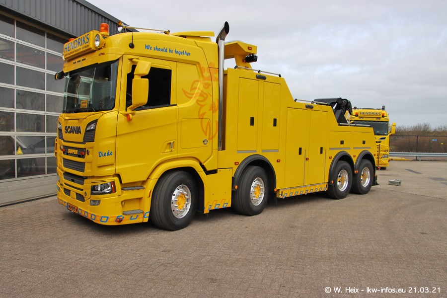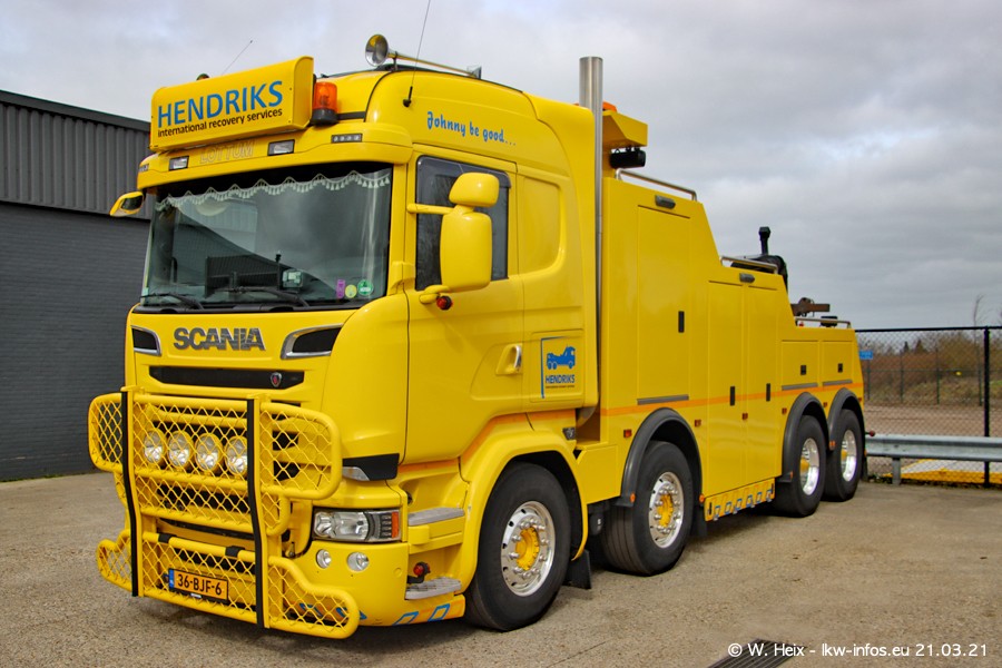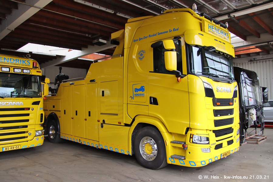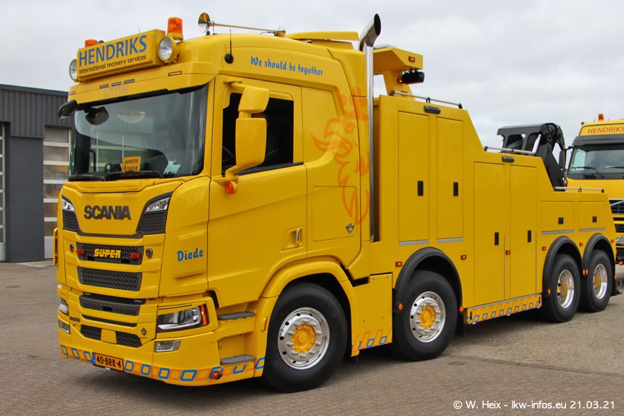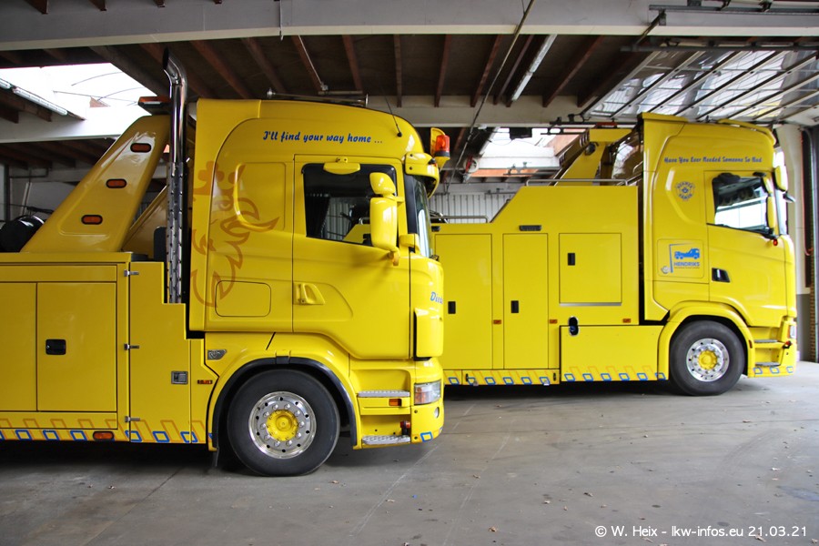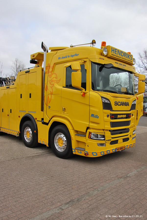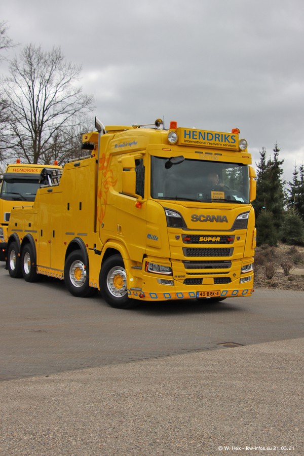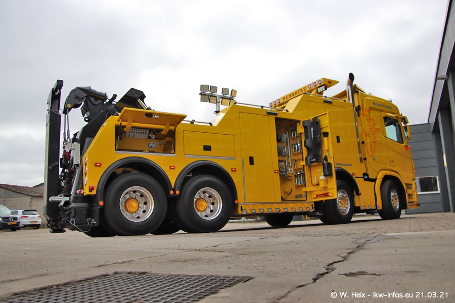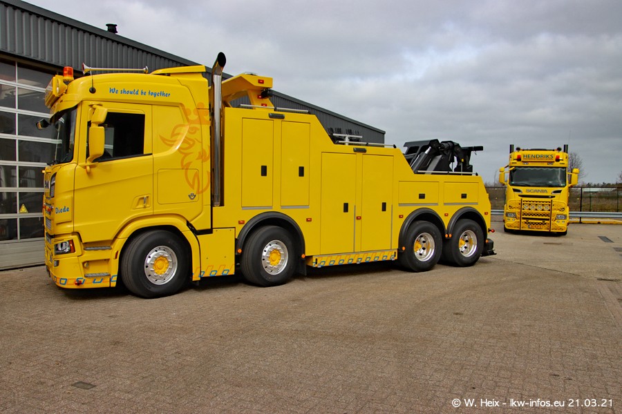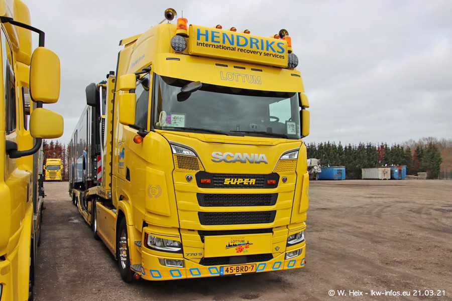 Am heutigen Sonntag war ich kurz bei Hendriks in Lottum. Am Donnerstag hat die Firma einen weiteren neuen Bergetruck bekommen, der heute morgen vom Fahrer getestet wurde und für Fotos bereit stand. Diesmal ist es ein SCANIA R 650 V8 NextGen, der von der Firma Brechtel in Deutschland aufgebaut wurde. Und es waren auch einige weitere LKW zuhause. Das ist an jedem Wochenende anders, da immer gearbeitet und gefahren wird, wie das in dieser Branche eben so ist.